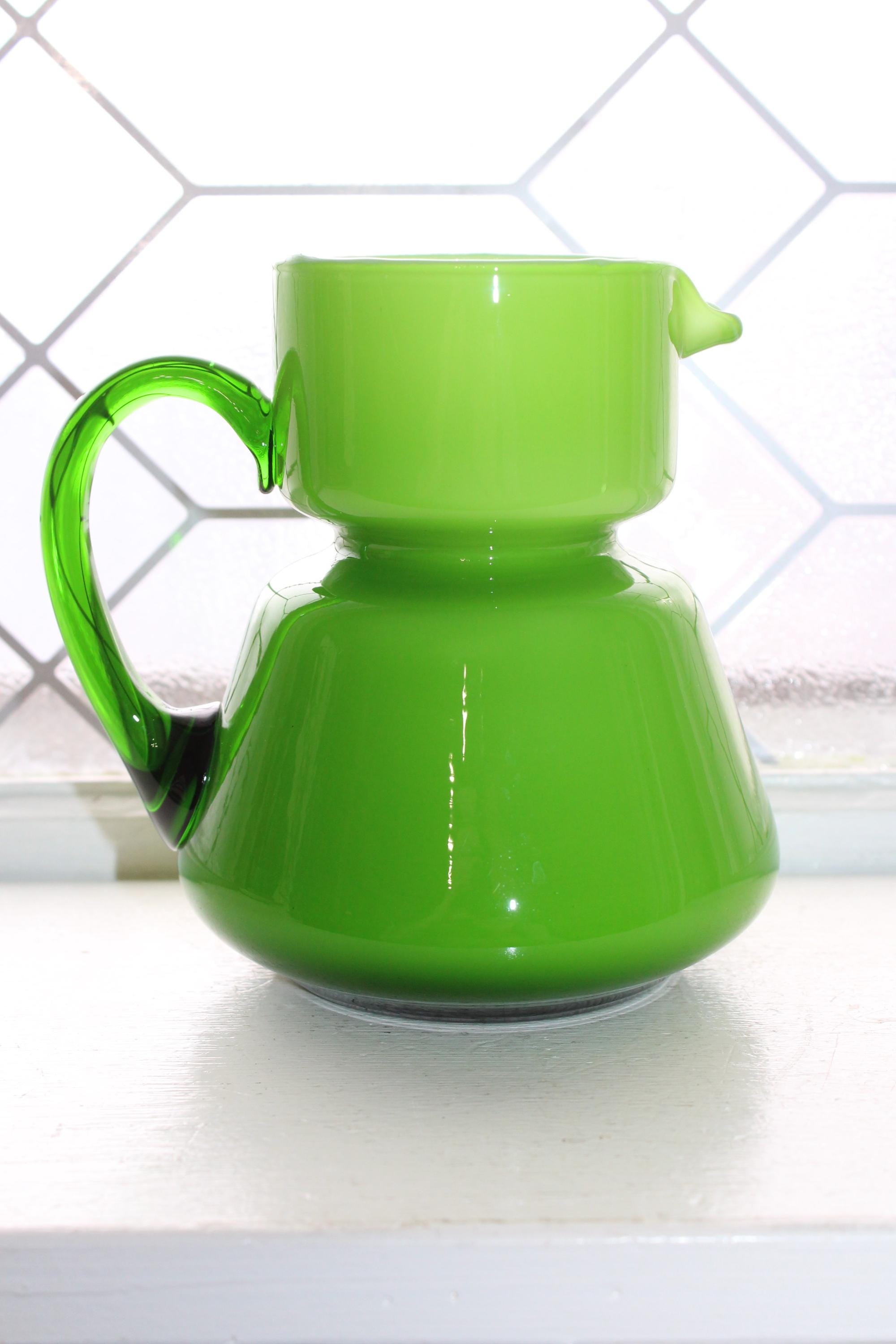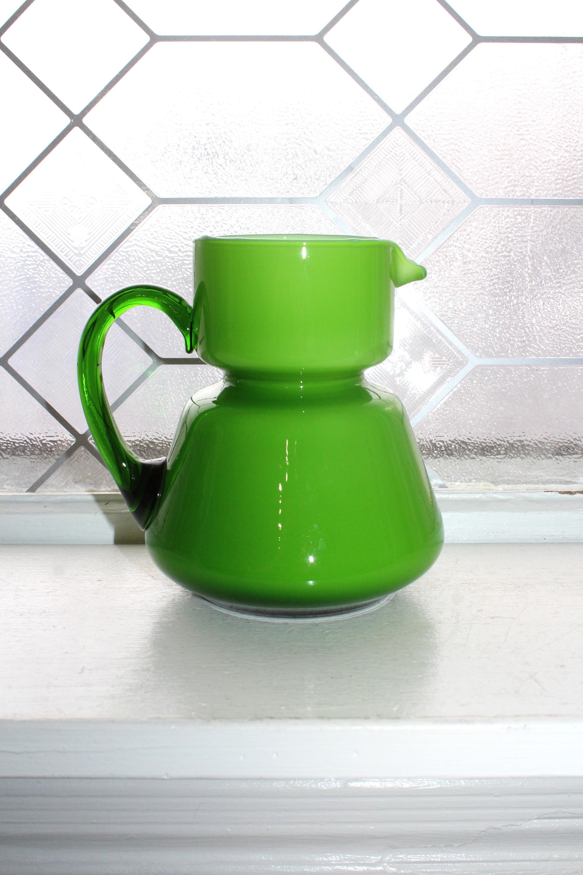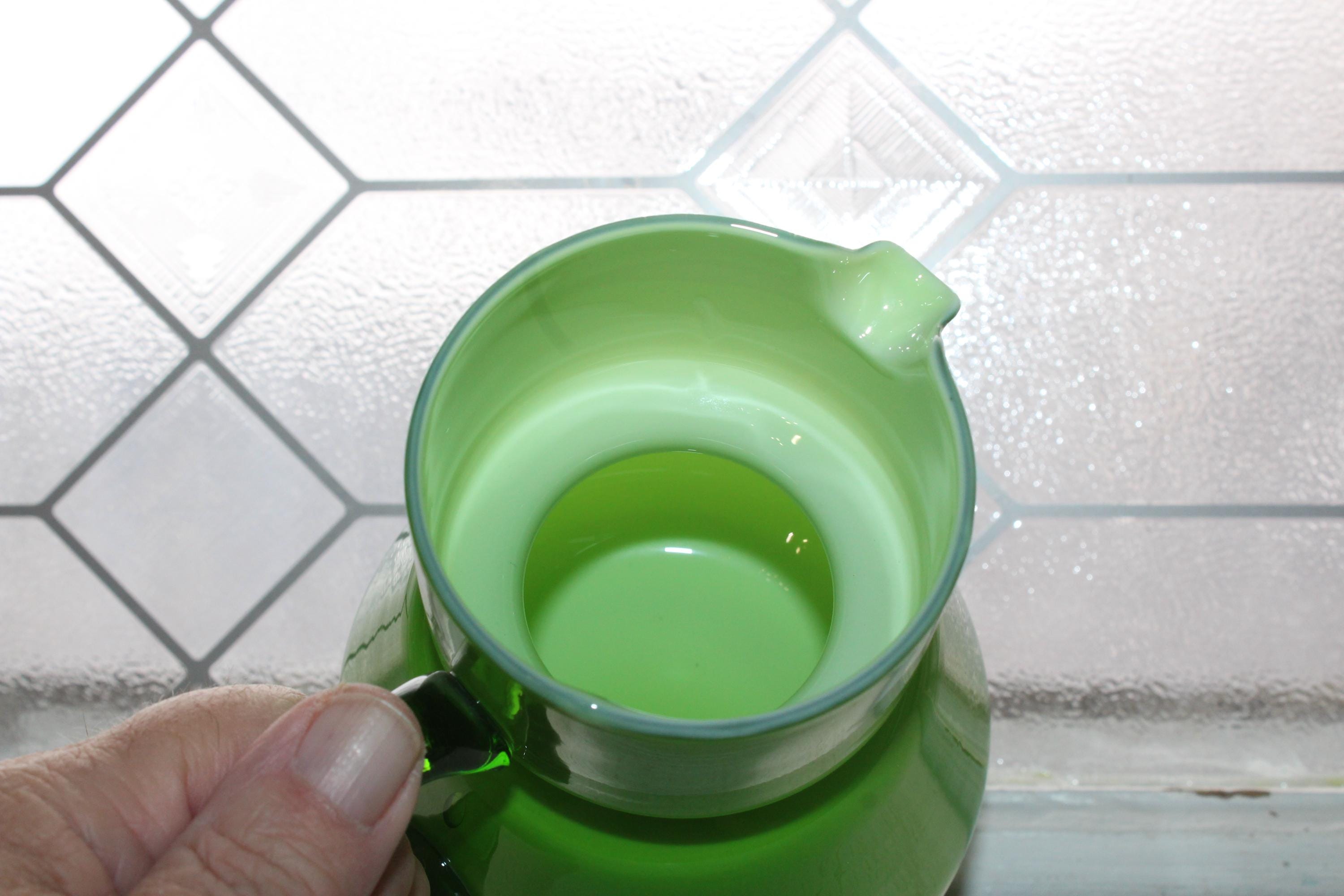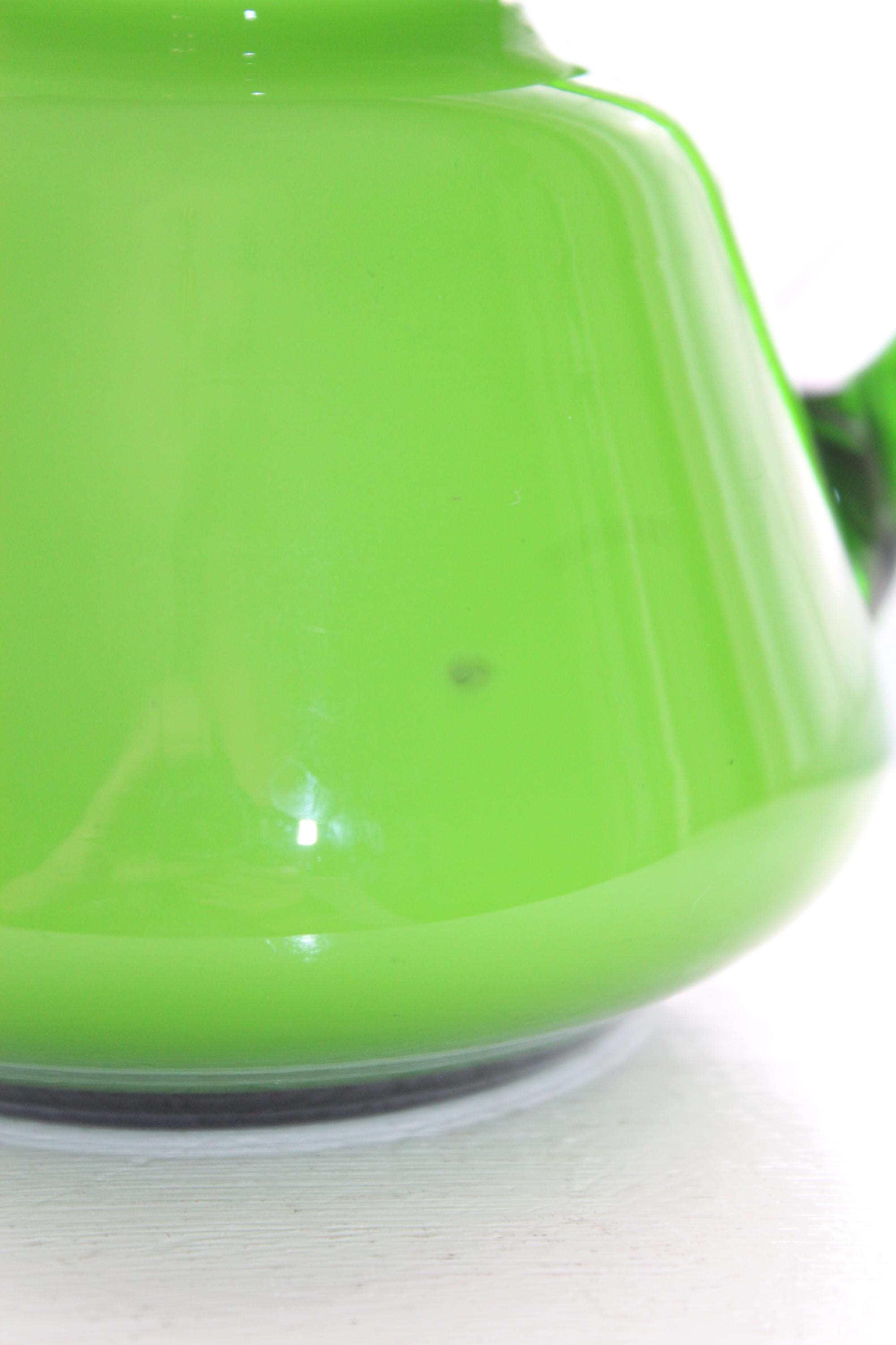 Vintage Mid Century Italian Carlo Moretti green glass overlay on white bedside carafe or pitcher, in excellent condition. It measures 5 1/4" high. No chips or cracks, displays very well. Enjoy!