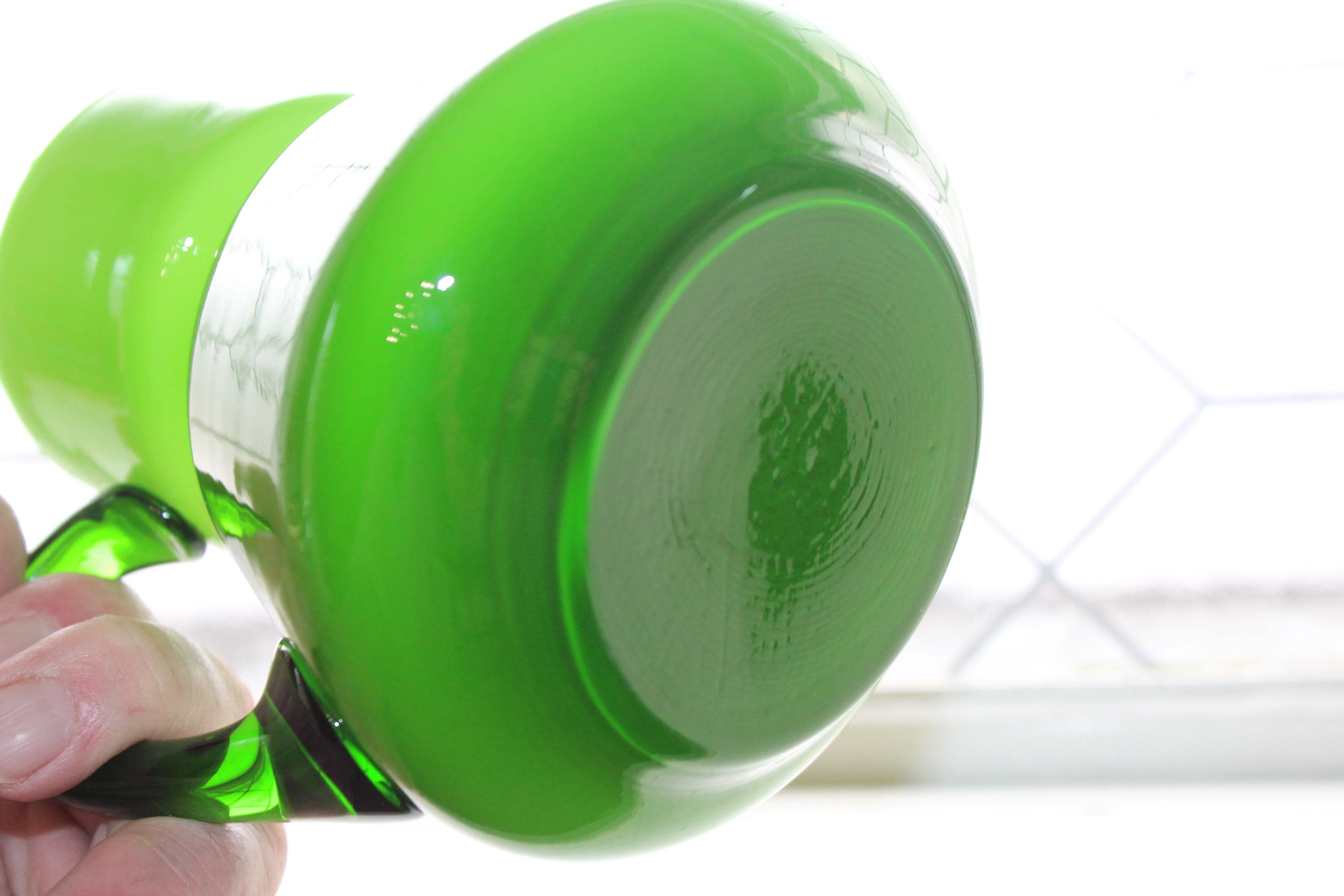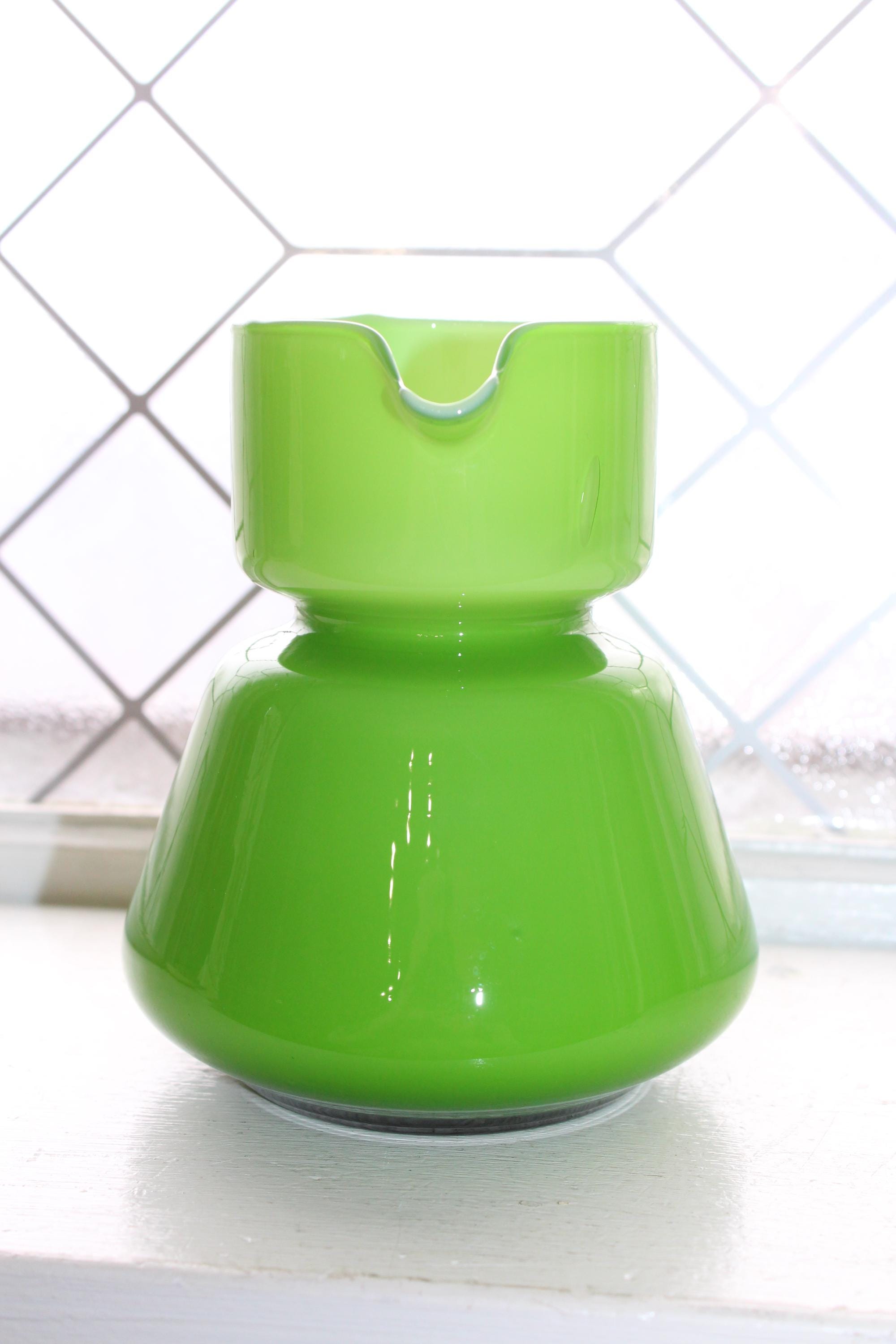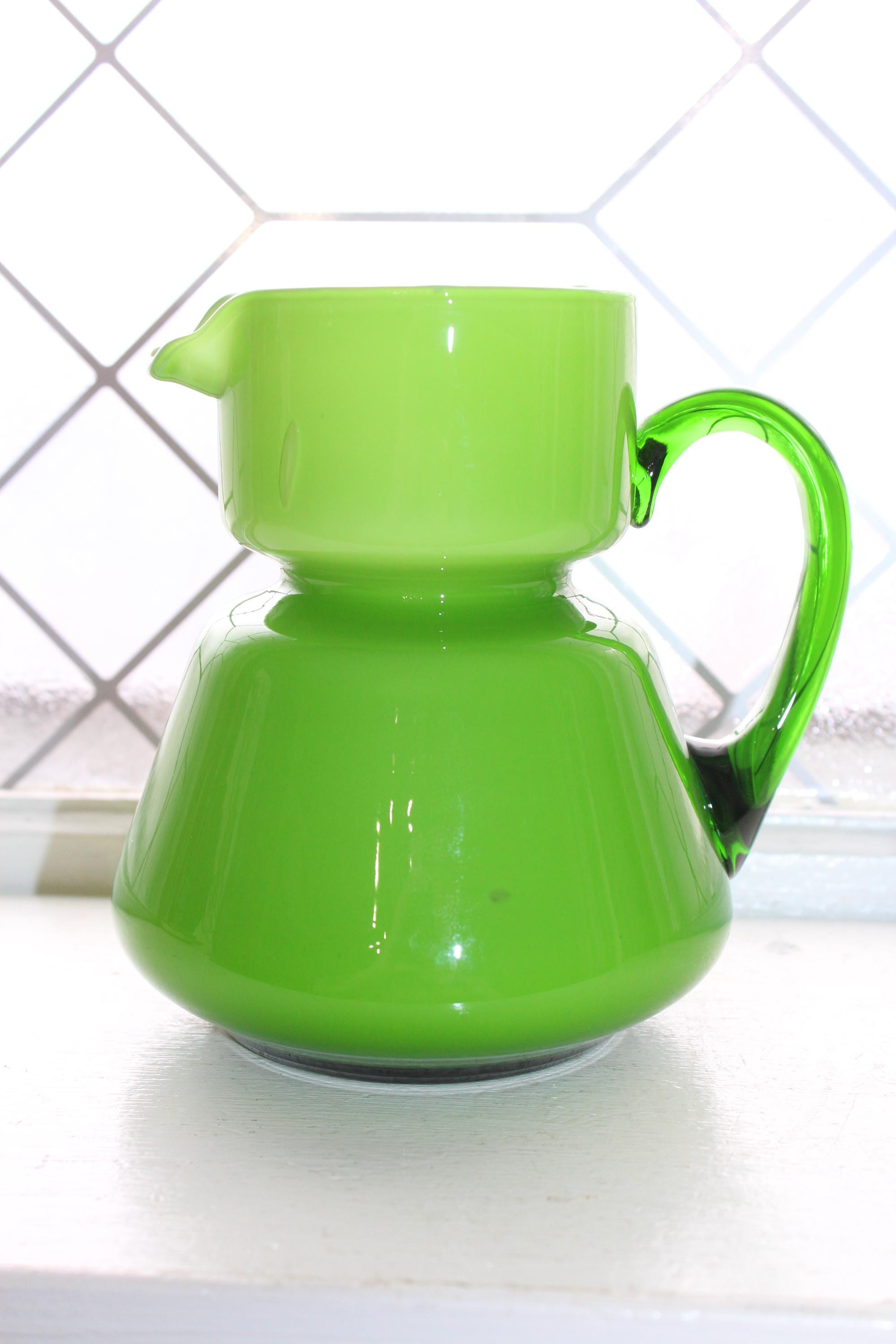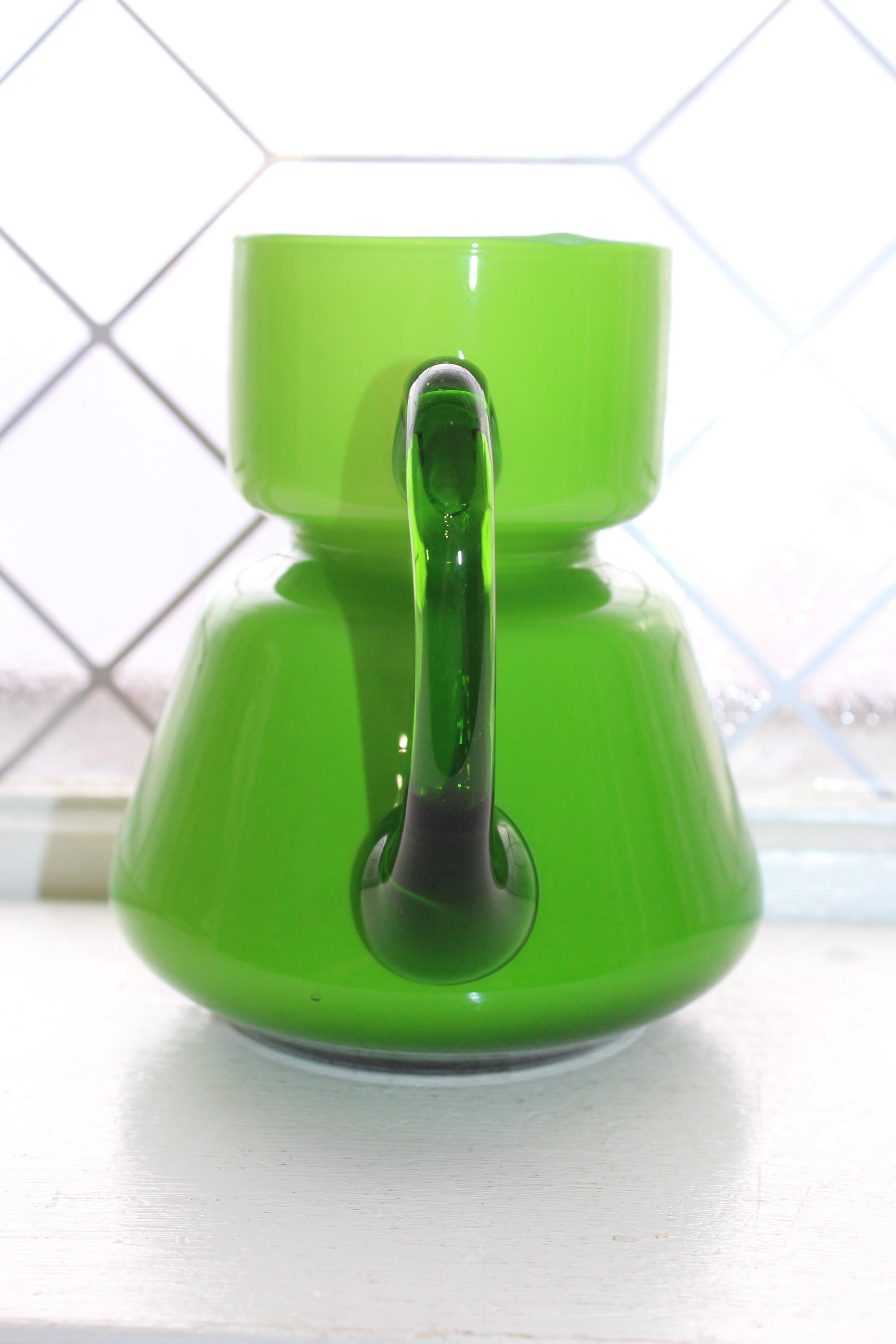 Vintage Mid Century Italian Carlo Moretti green glass overlay on white bedside carafe or pitcher, in excellent condition. It measures 5 1/4" high. No chips or cracks, displays very well. Enjoy!