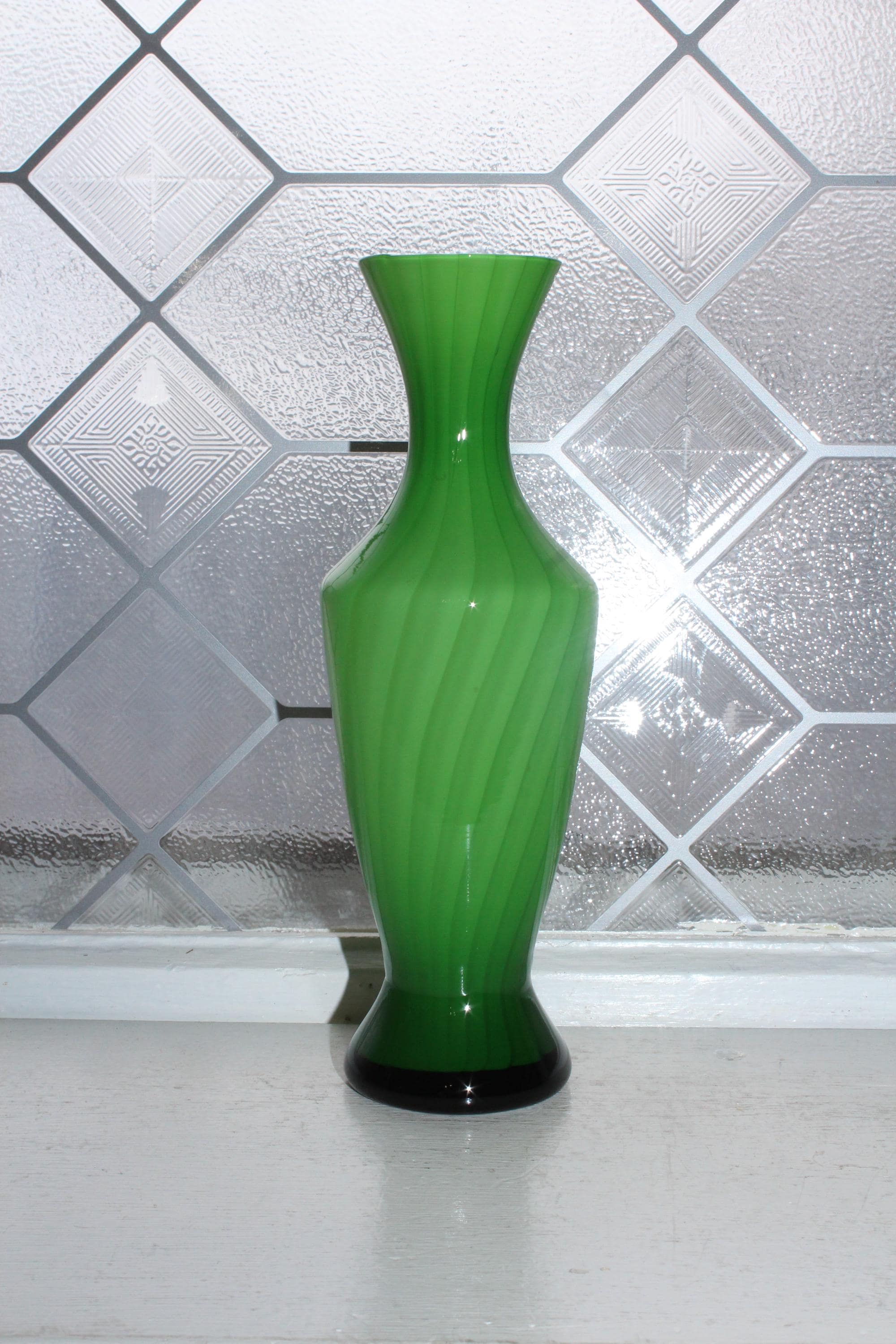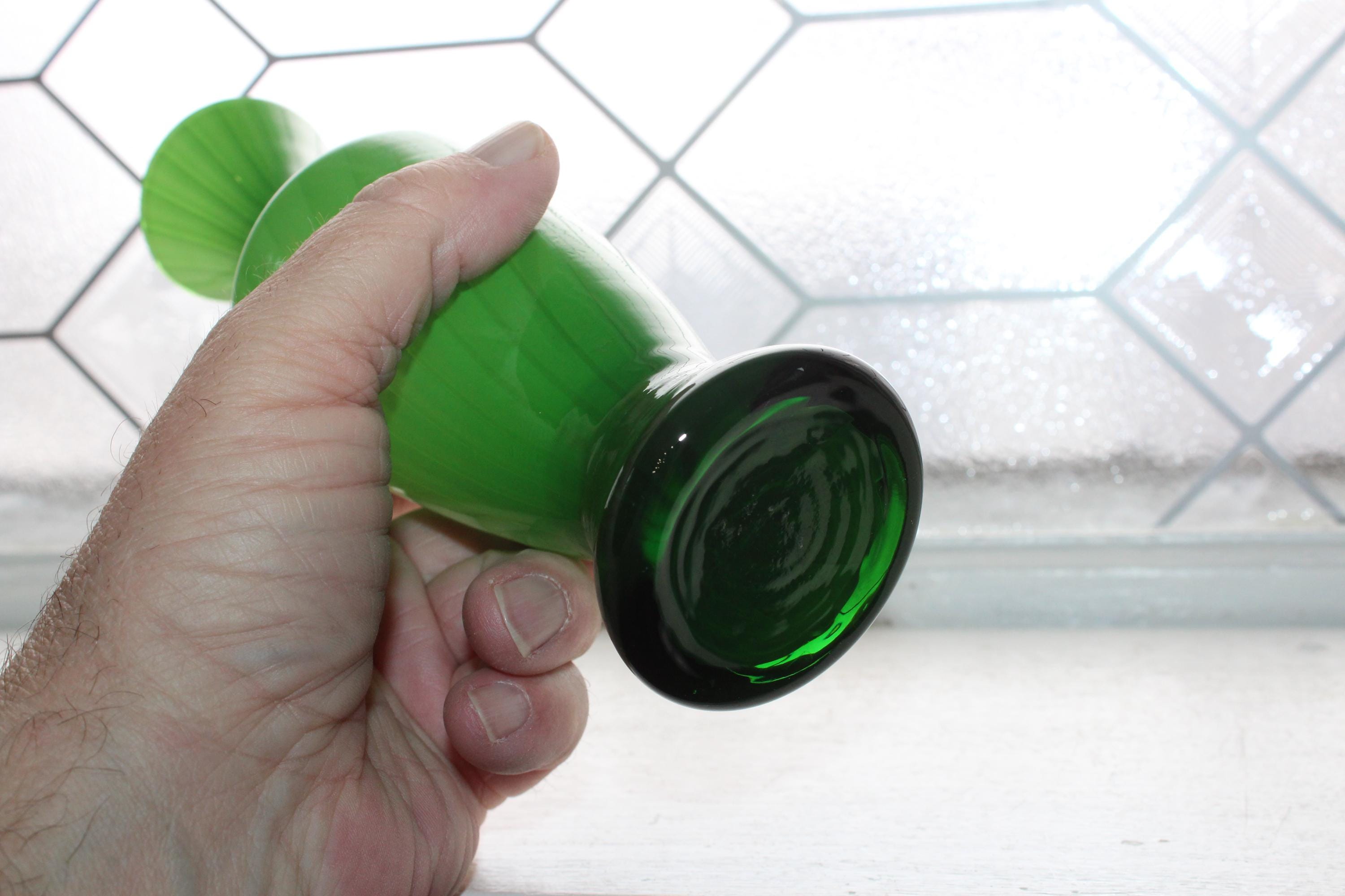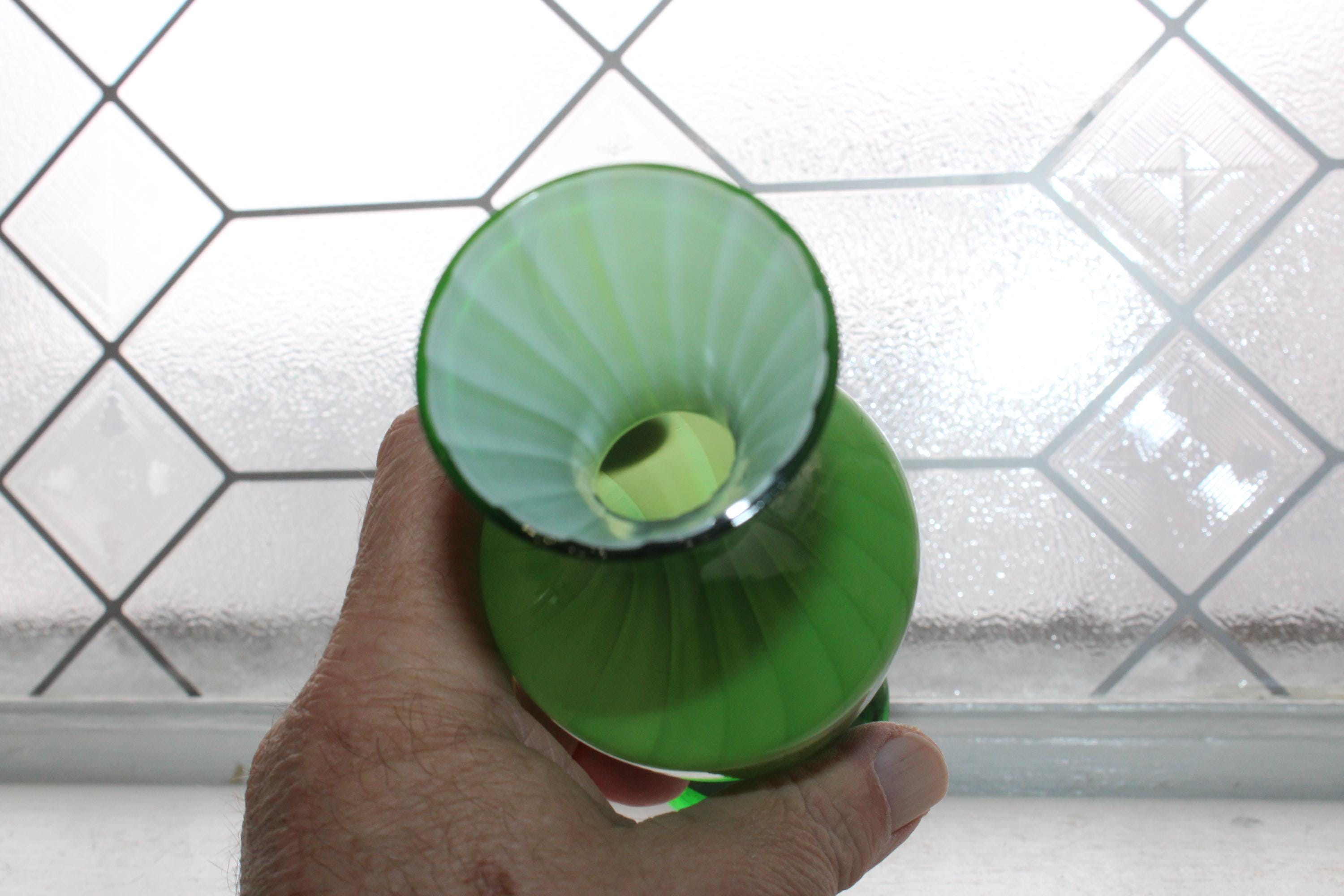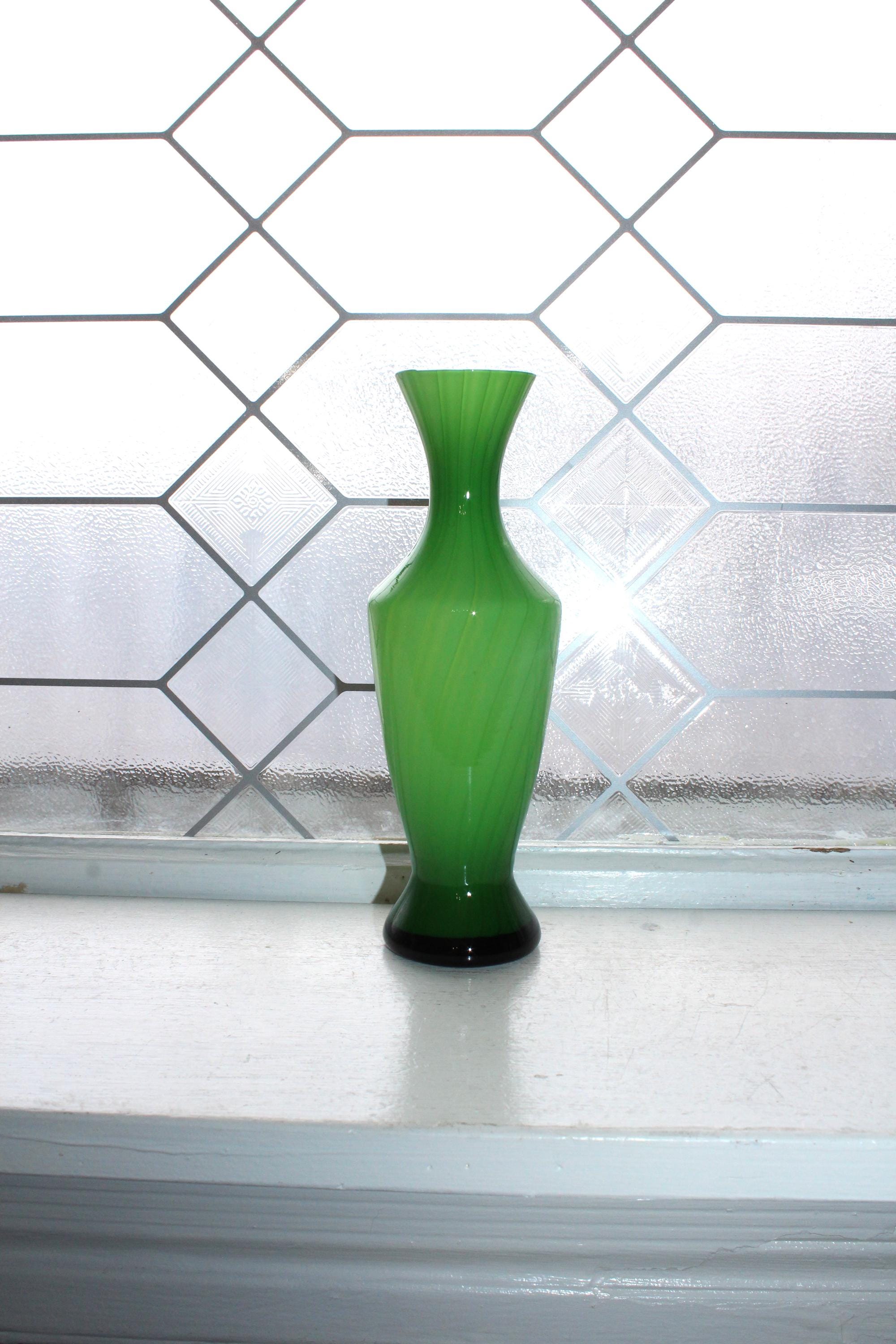 Vintage Italian Empoli spiral striped green cased glass bud vase, in excellent condition. The vase measures 7 7/8" high. No chips or cracks. Displays very well. Enjoy!