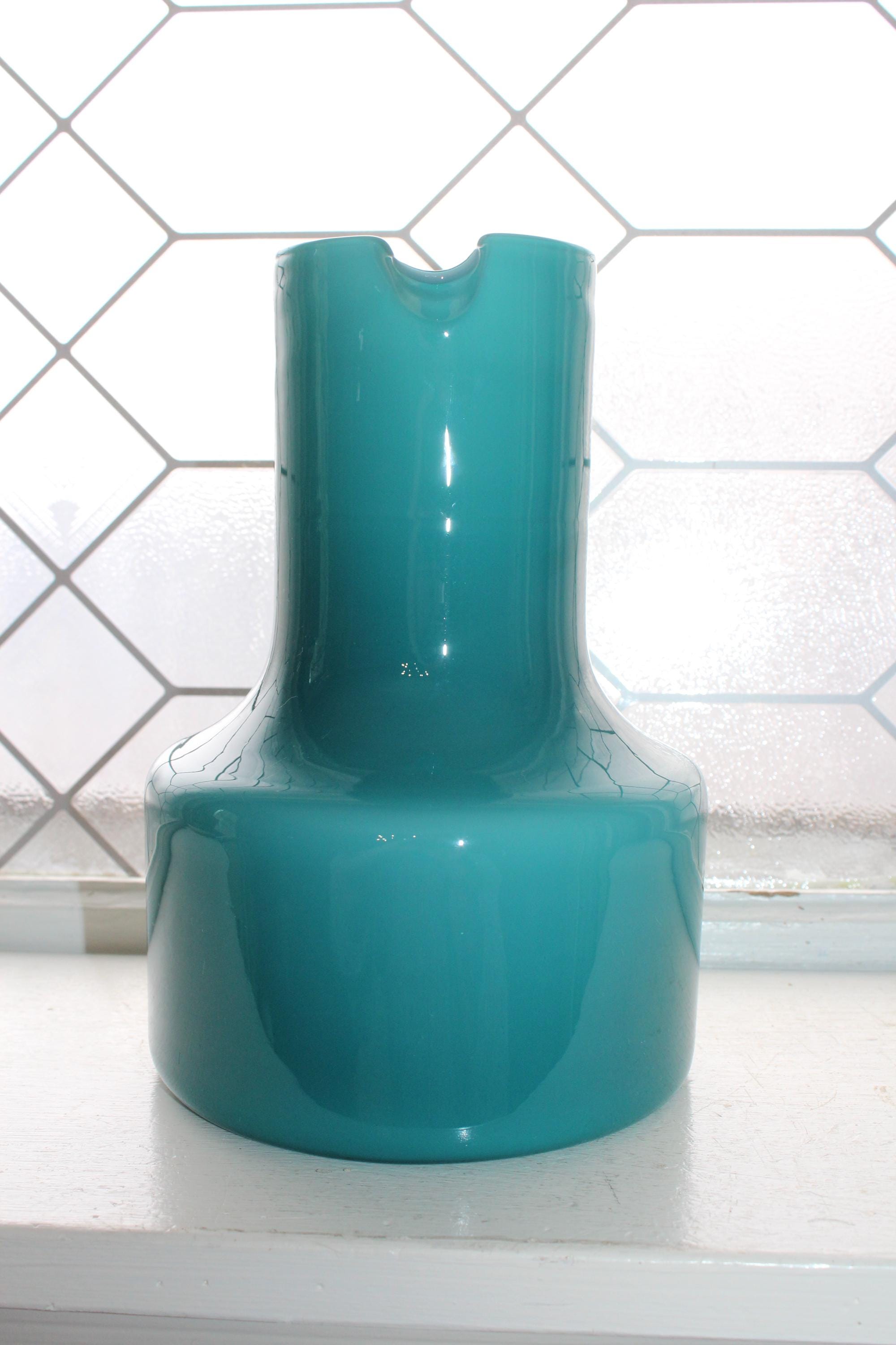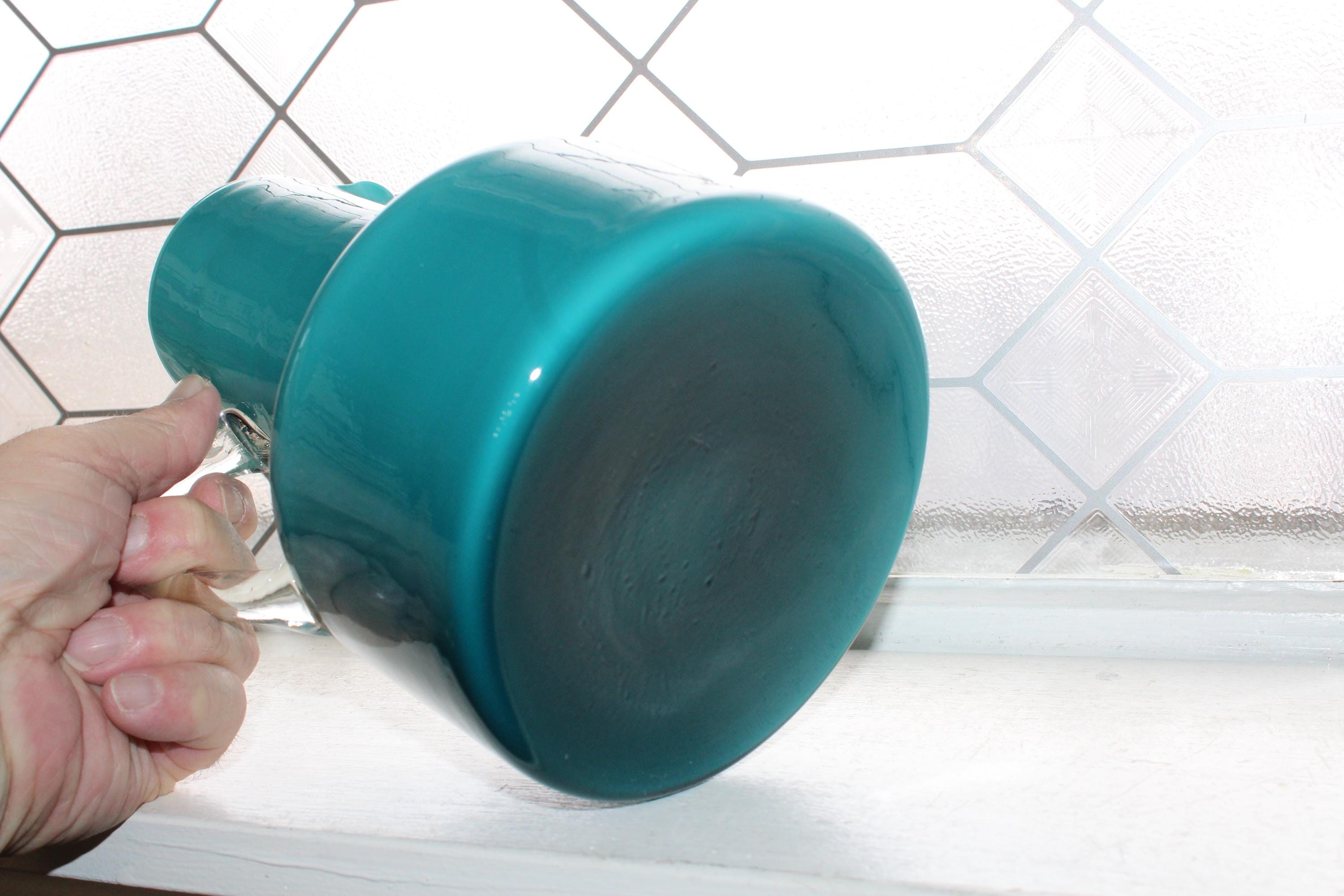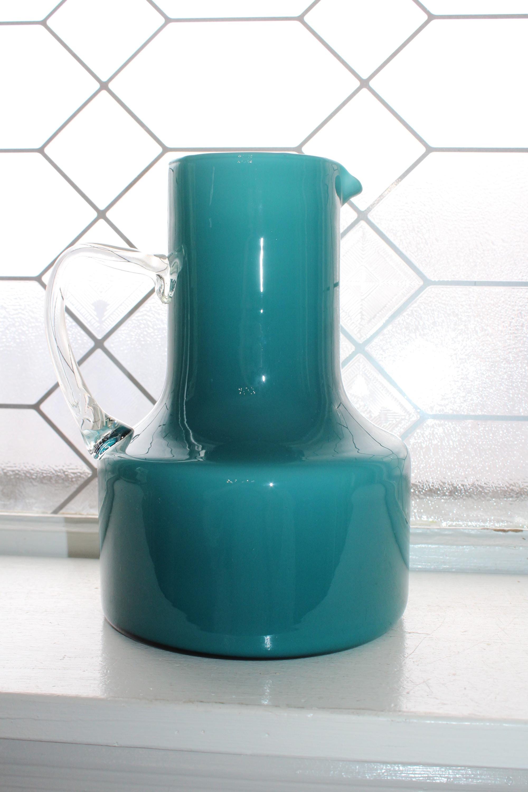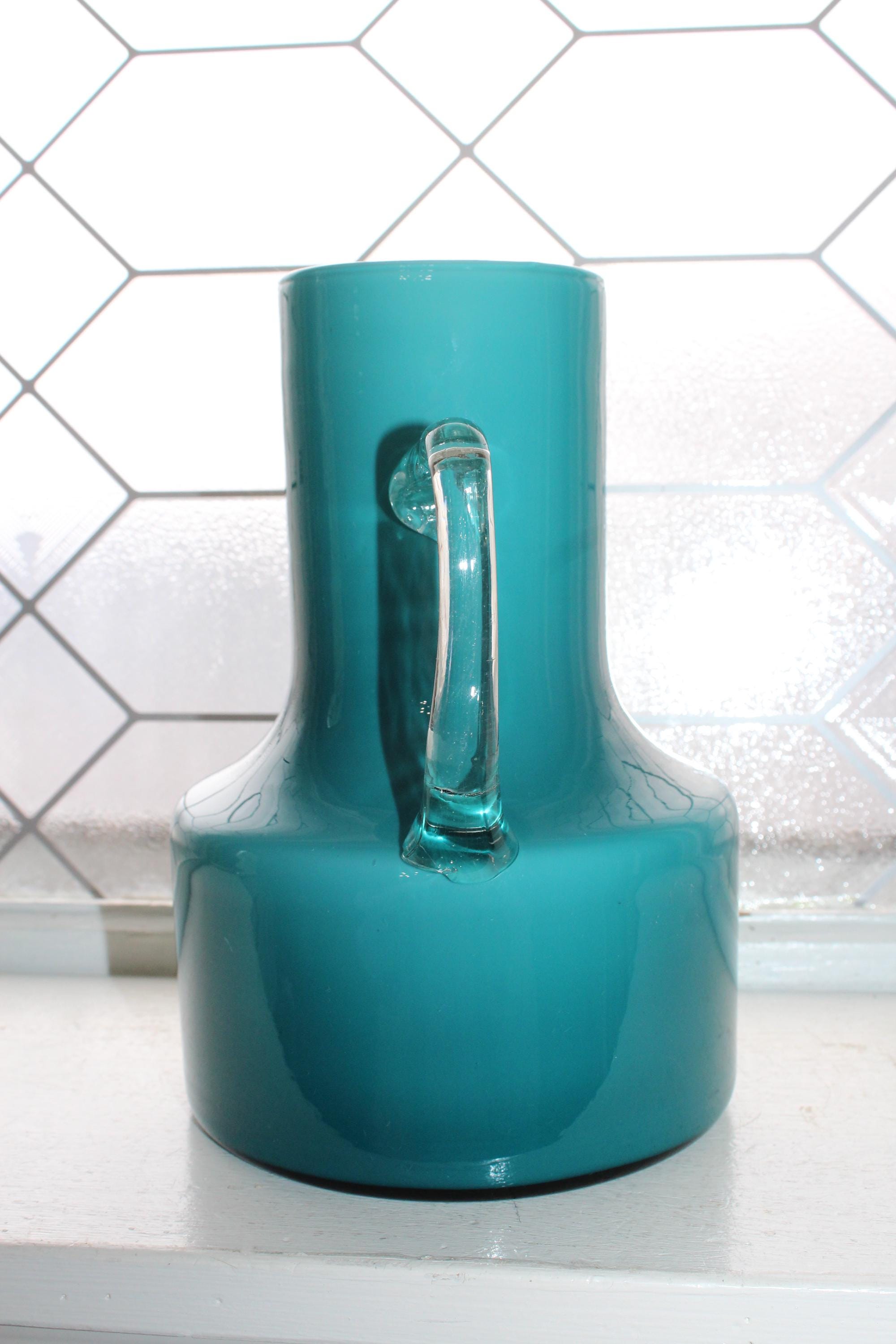 This is a fabulous Mid Century Italian Empoli teal cased glass pitcher with clear handle, in excellent condition. It measures 8" high and displays very well. No damage. Enjoy!