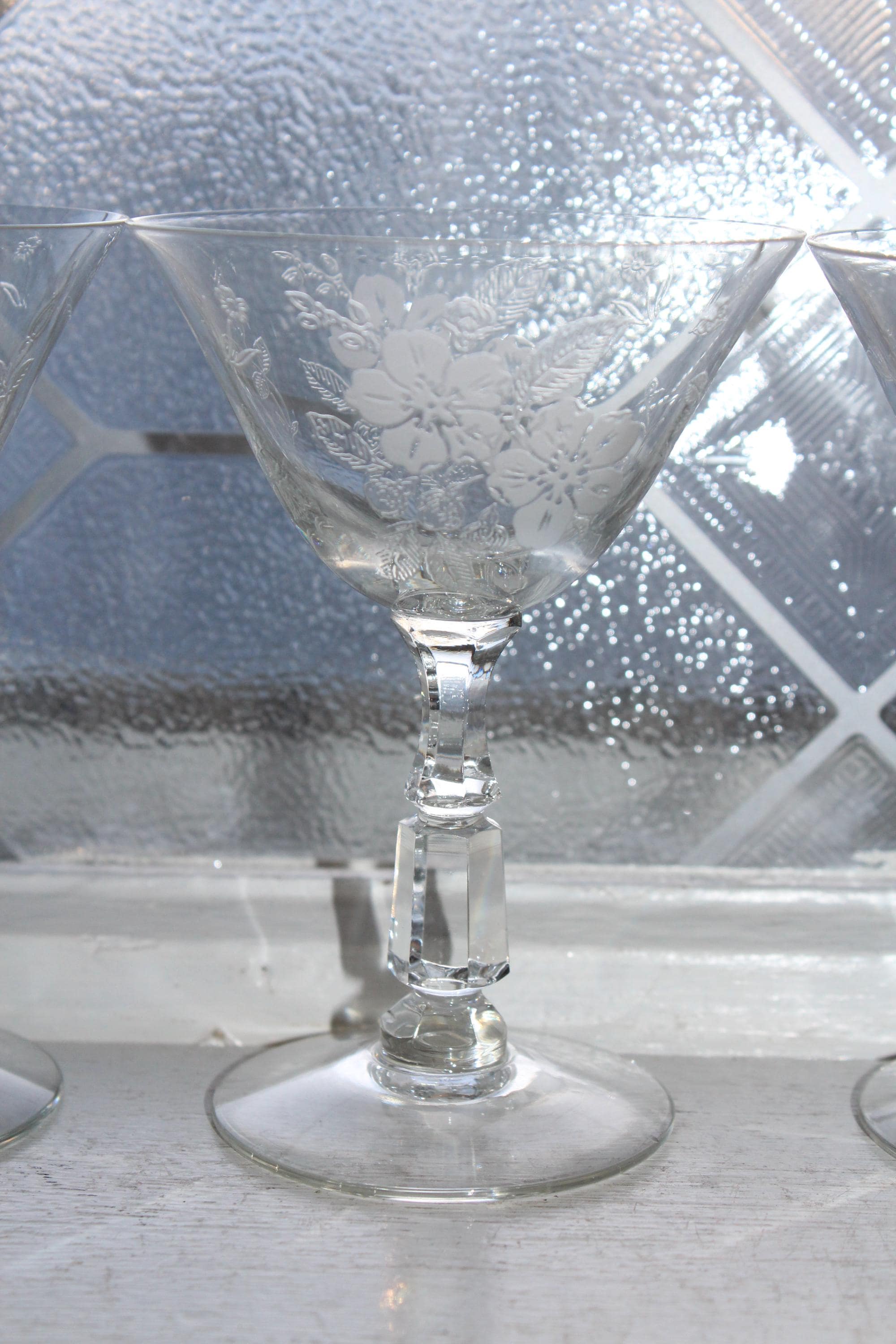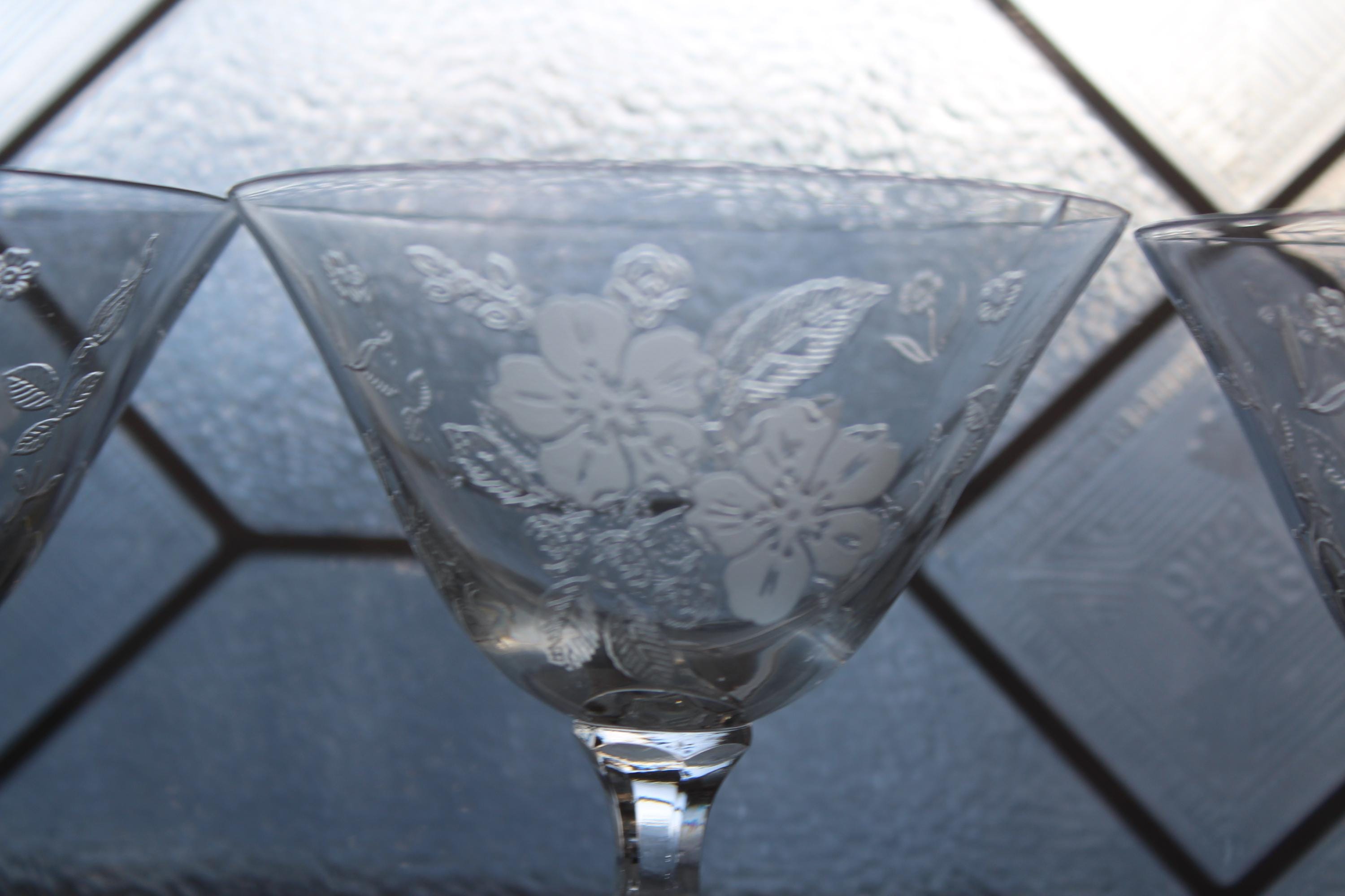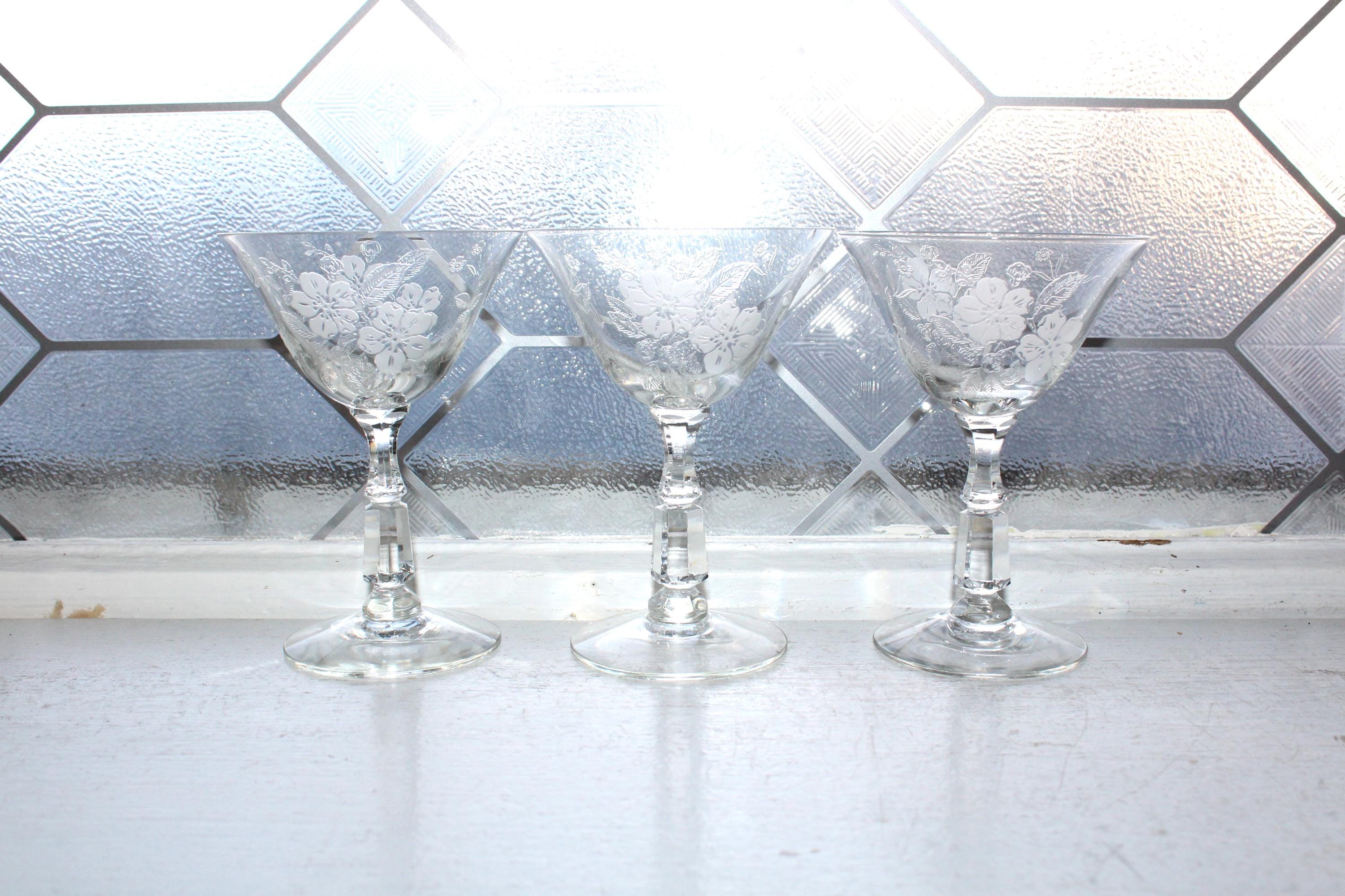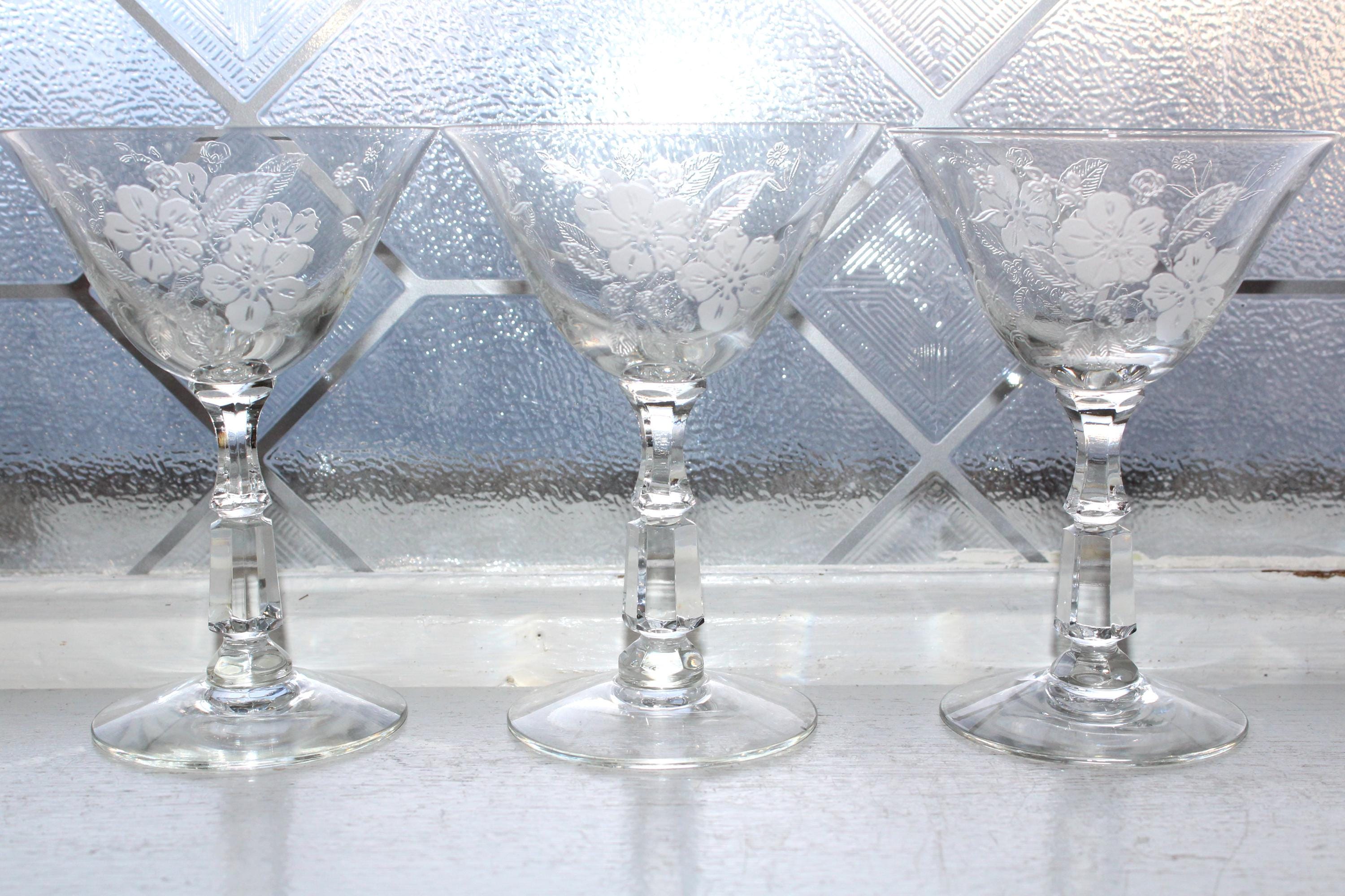 This is a gorgeous set of 3 vintage 1940s Duncan & Miller Language of Flowers etched crystal liqueur or cocktail glasses, in excellent condition. Each one measures 4 1/2" high. No chips or cracks. This is a beautiful set and perfect for use or display. I also have other pieces of this pattern available in my shop. Enjoy!