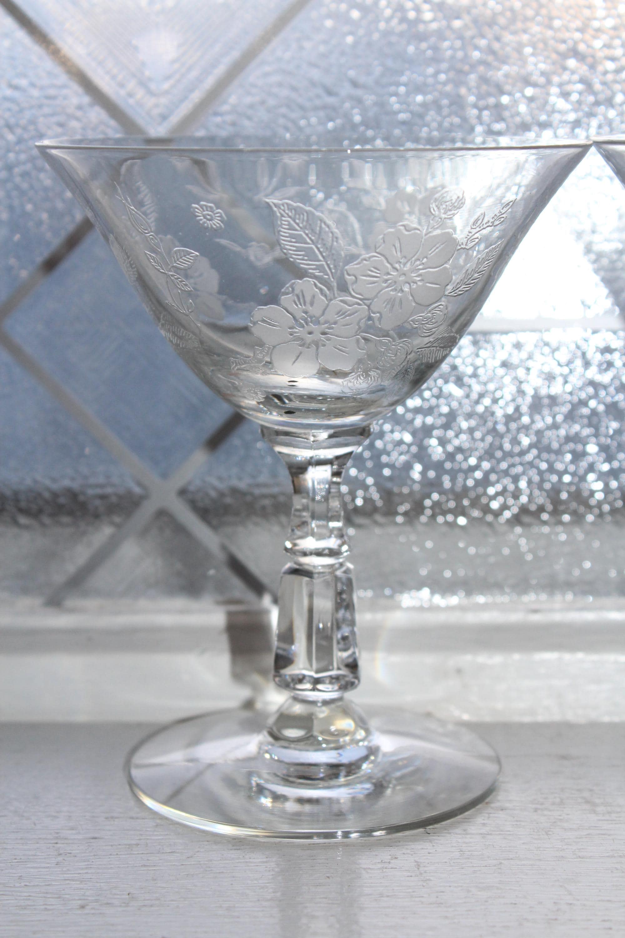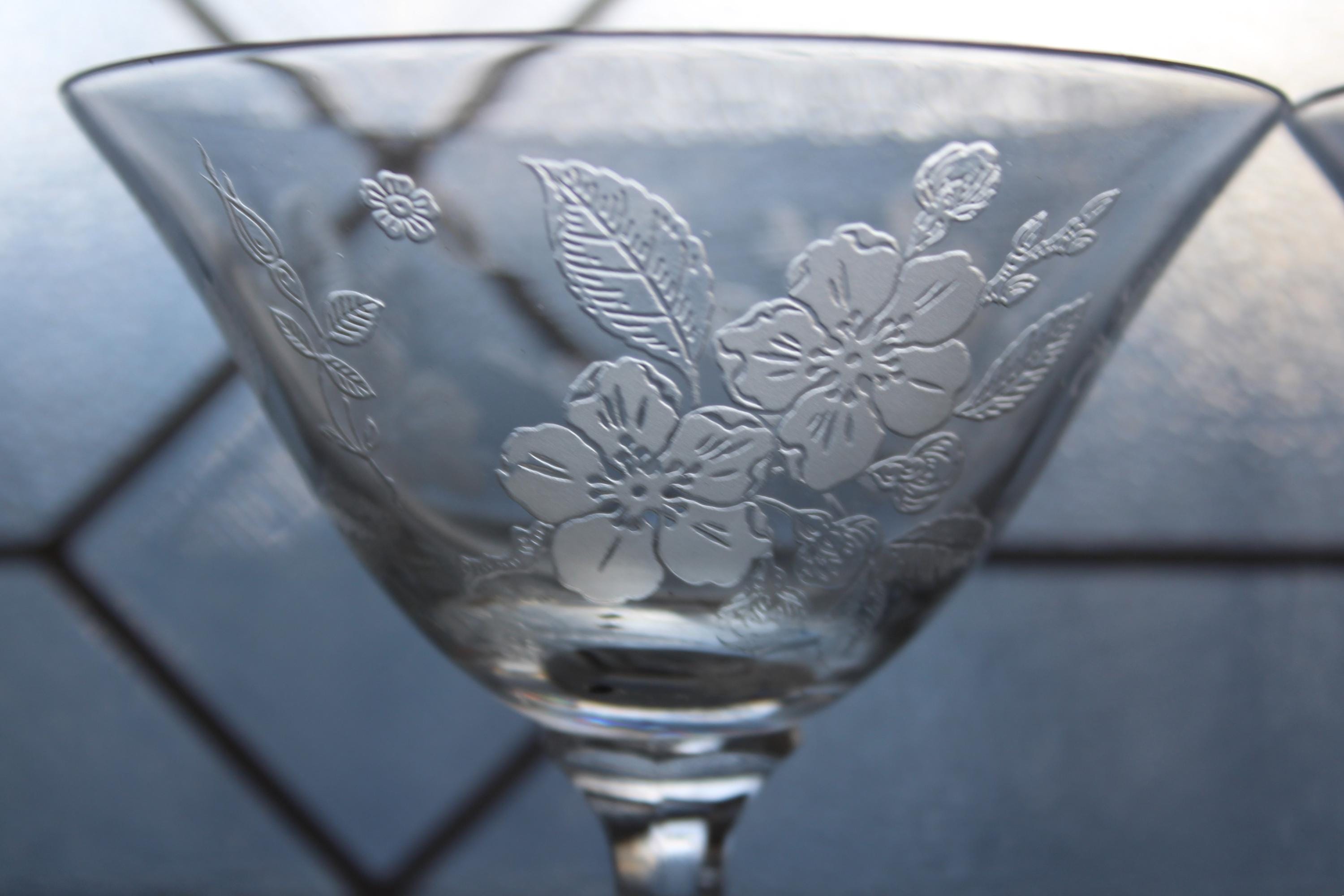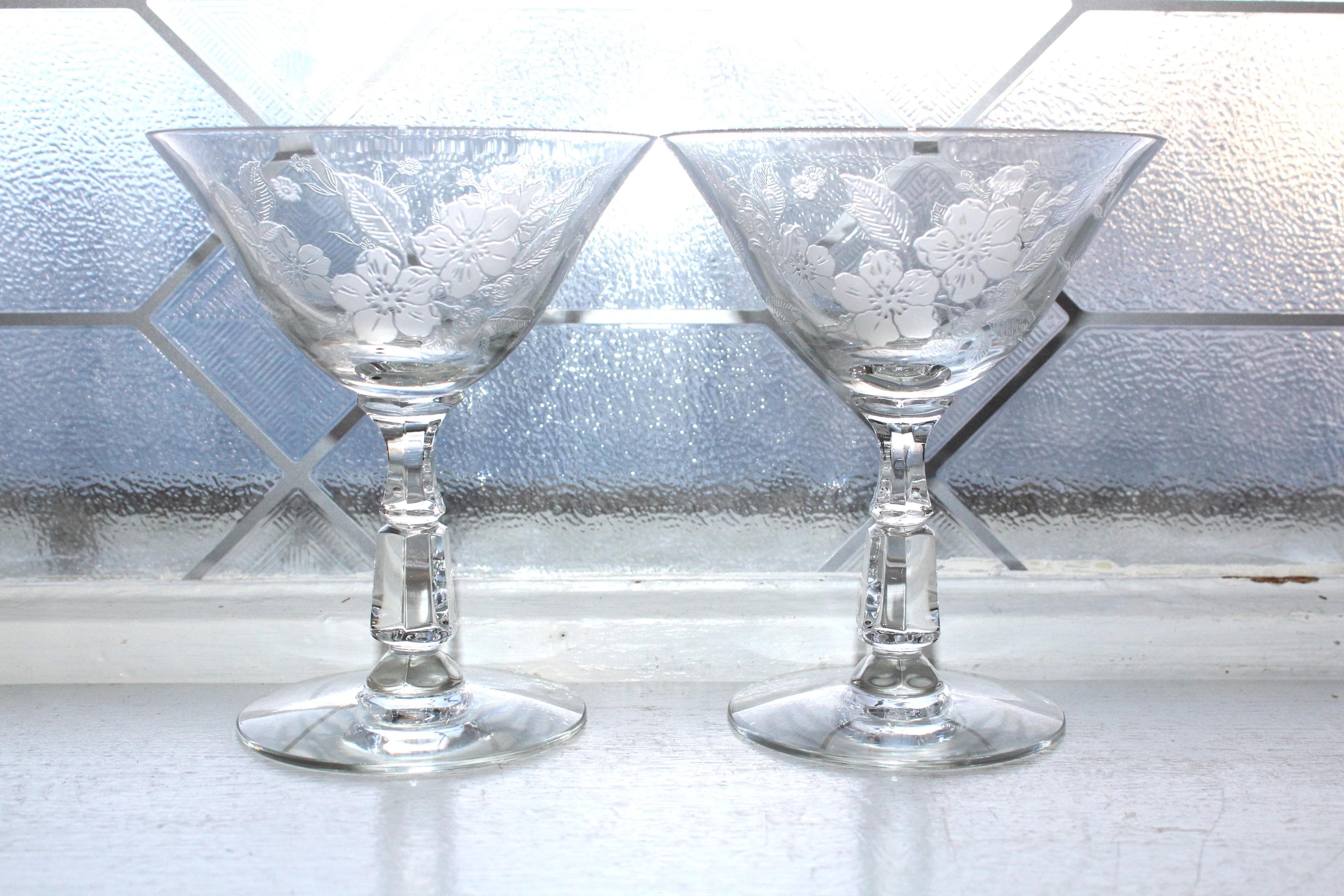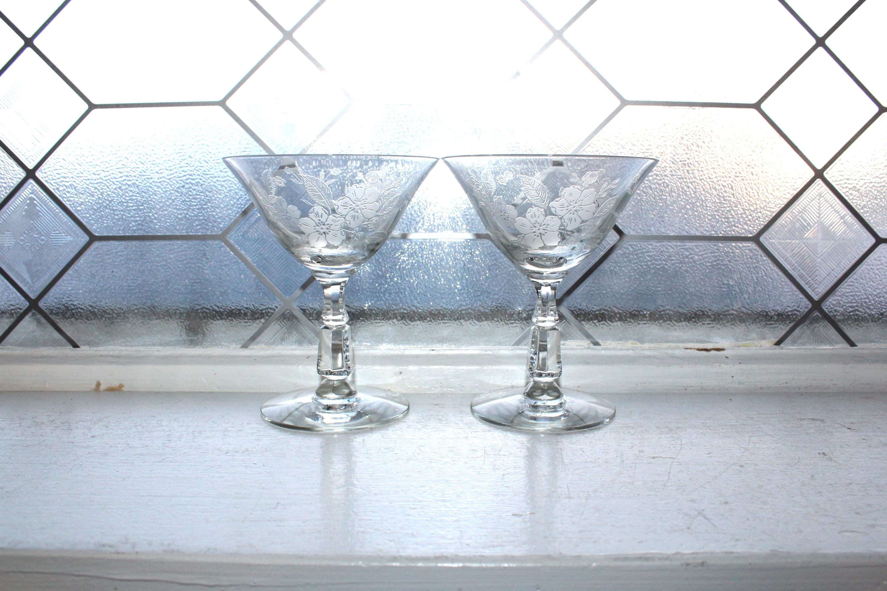 This is a gorgeous set of 2 vintage 1940s Duncan & Miller Language of Flowers etched crystal champagne glasses, in excellent condition. Each one measures 4 3/4" high. No chips or cracks. This is a beautiful set and perfect for use or display. I also have other pieces of this pattern available in my shop. Enjoy!