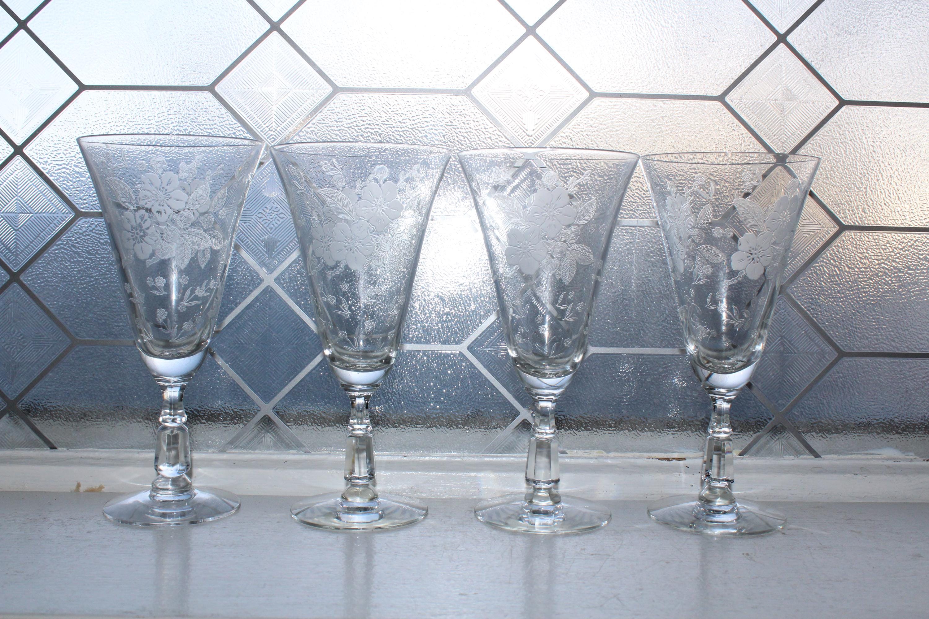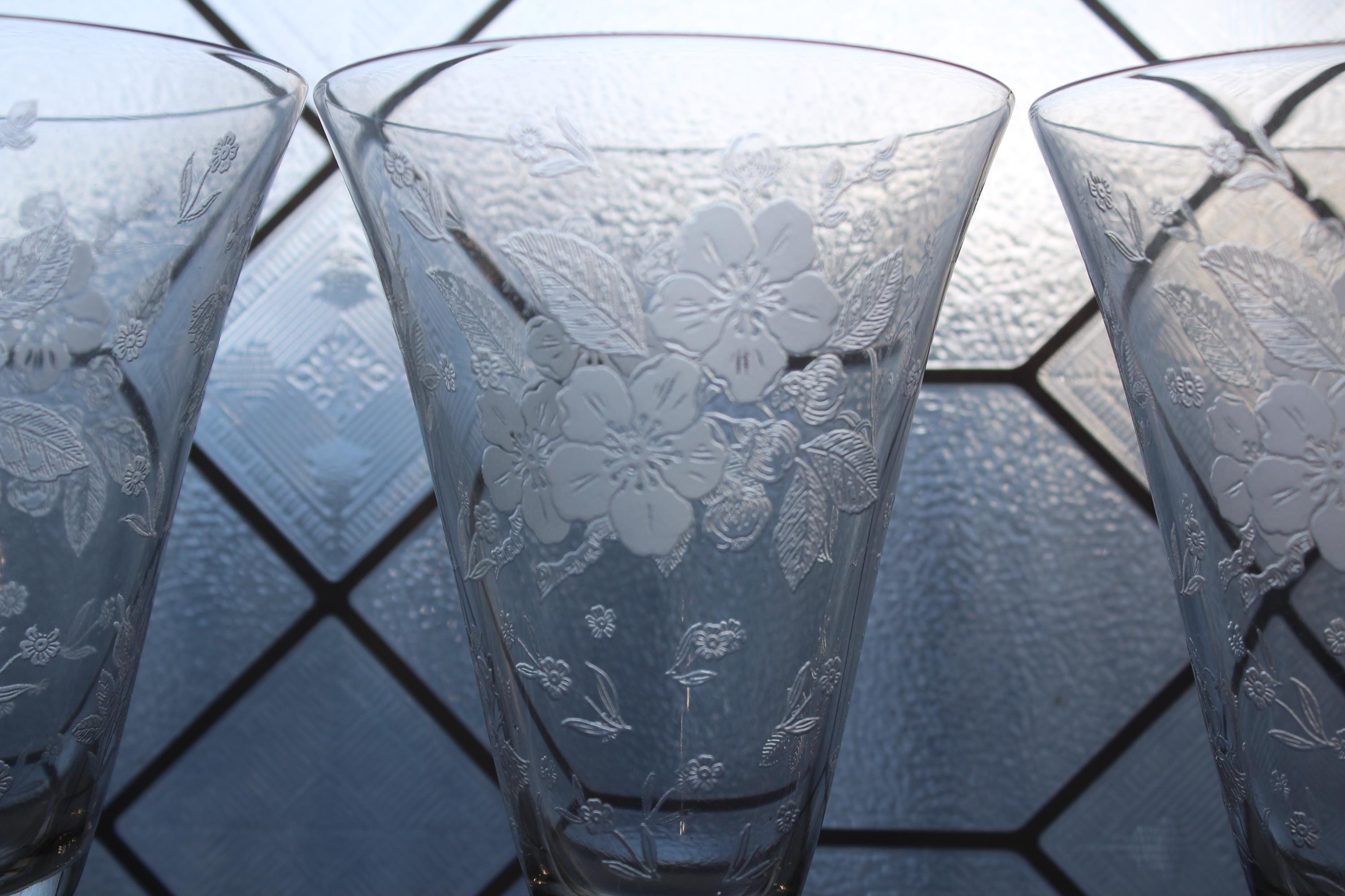 This is a gorgeous set of 3 vintage 1940s Duncan & Miller Language of Flowers etched crystal water goblets, in excellent condition. Each one measures 7 1/2" high. No chips or cracks. This is a beautiful set and perfect for use or display. I also have other pieces of this pattern available in my shop. Enjoy!