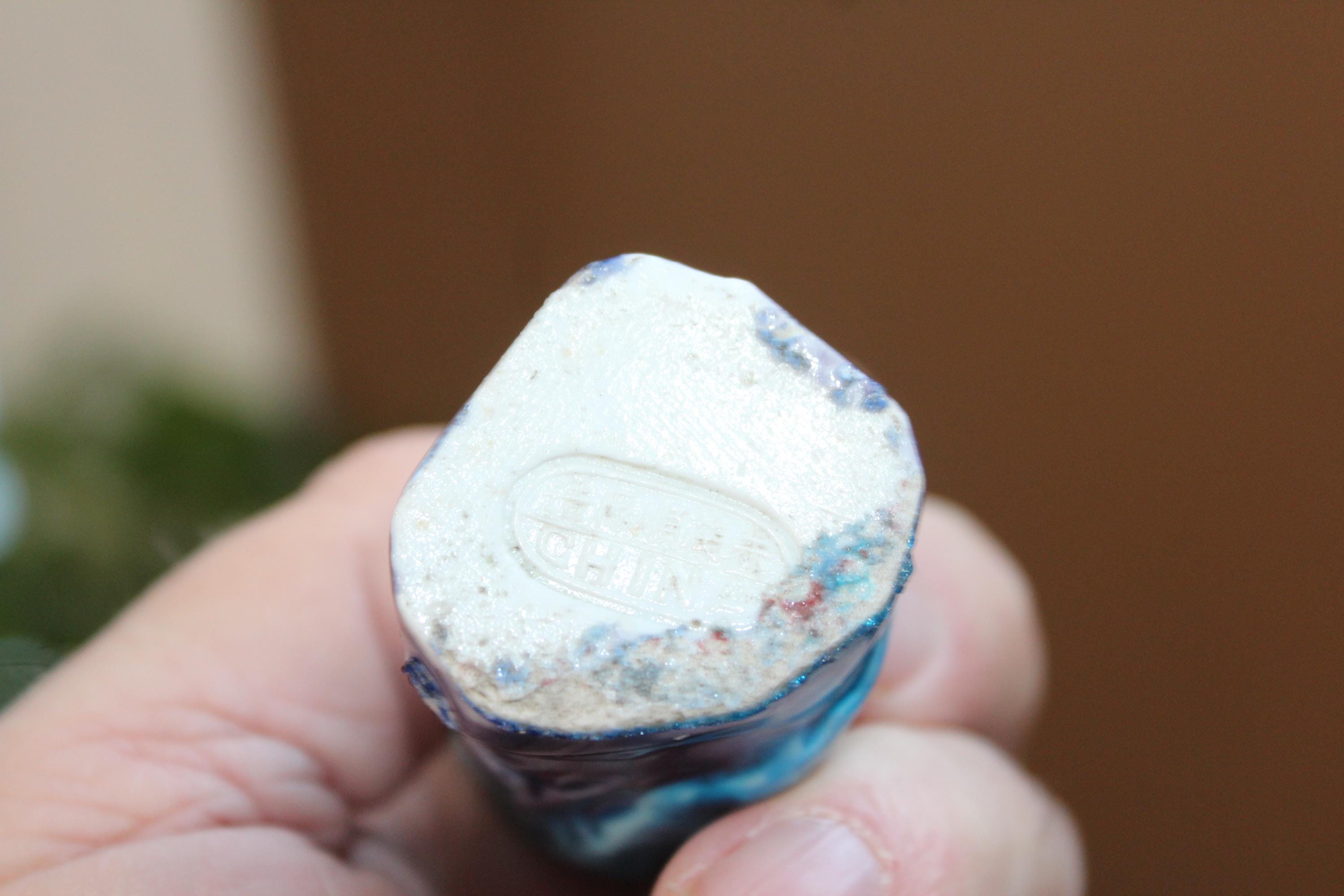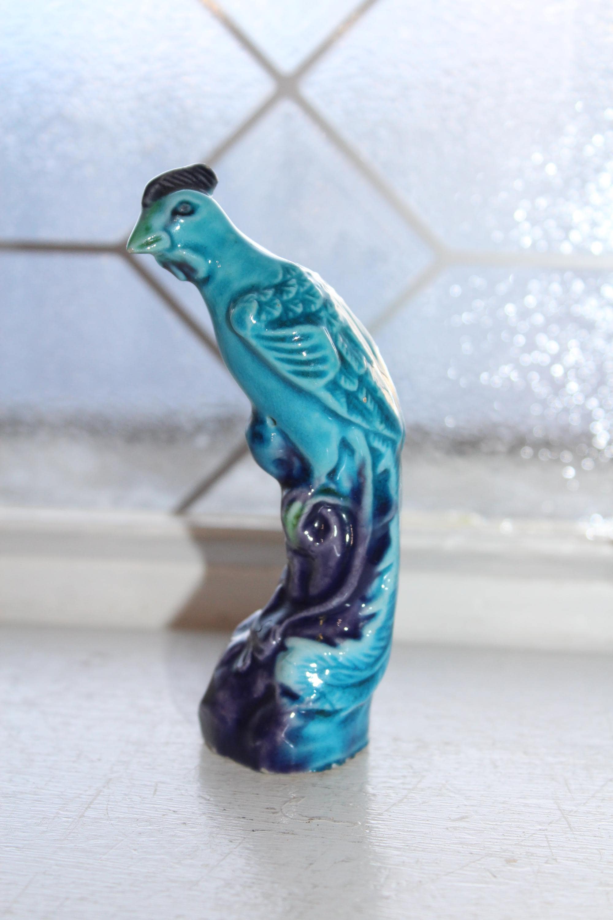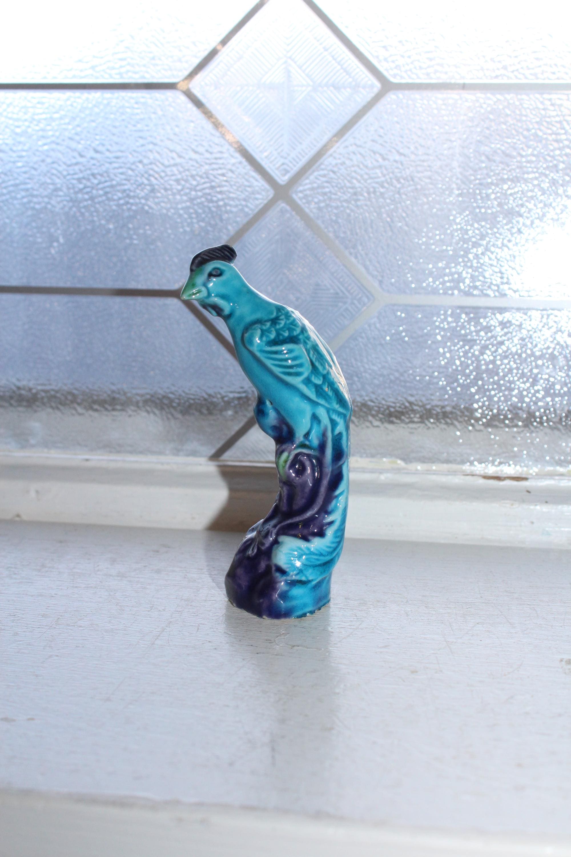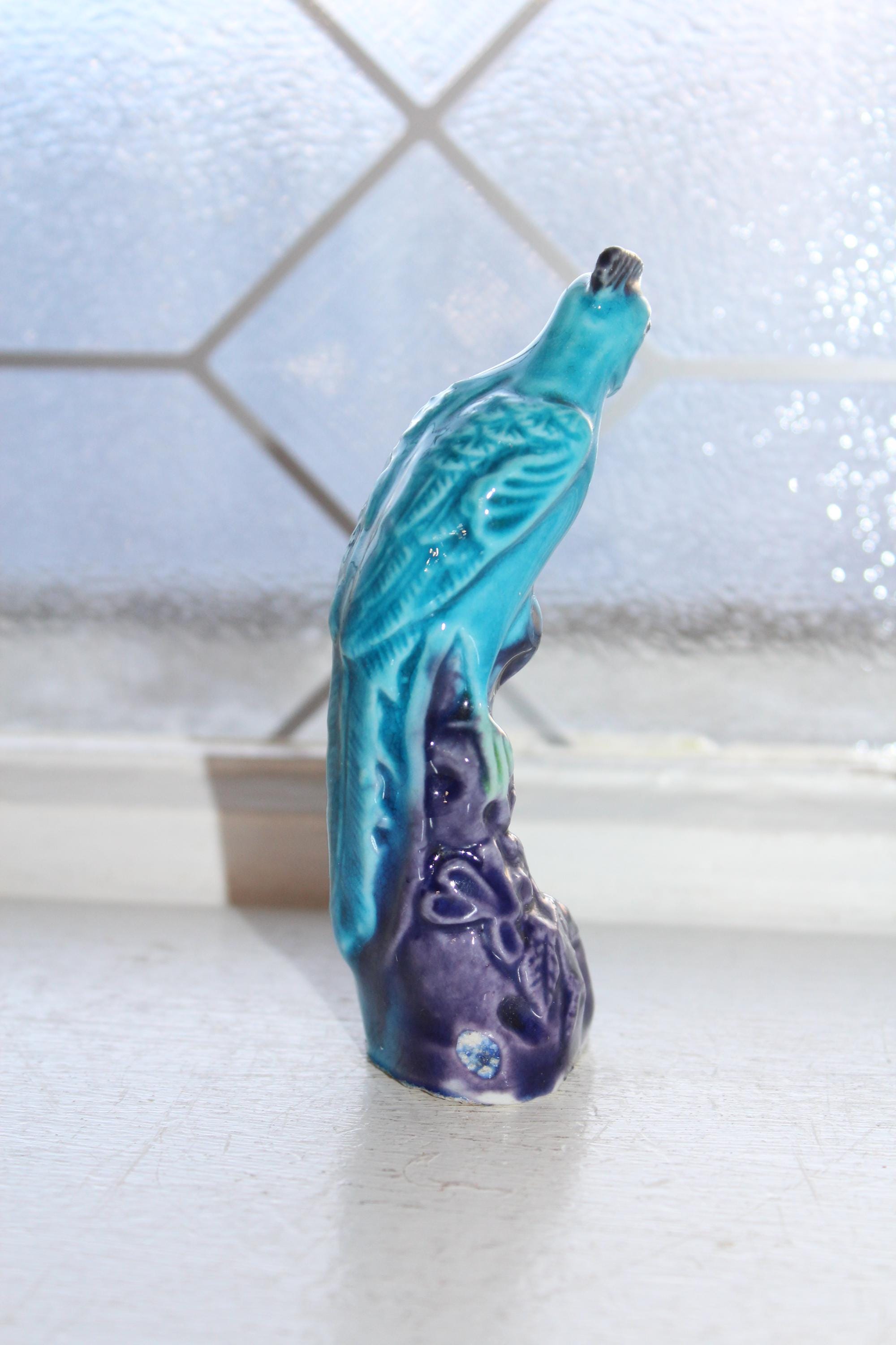 Antique Chinese export porcelain turquoise and purple mud bird figurine, in excellent condition. It measures 4 1/4" high. Artist stamp on the underside. No chips or cracks. Enjoy!