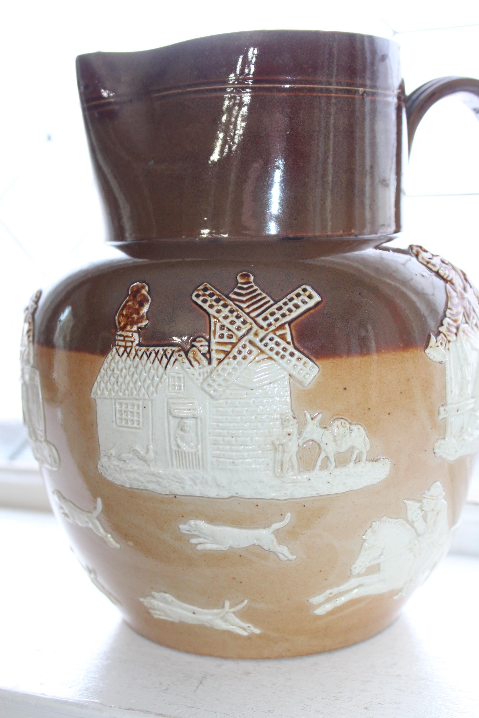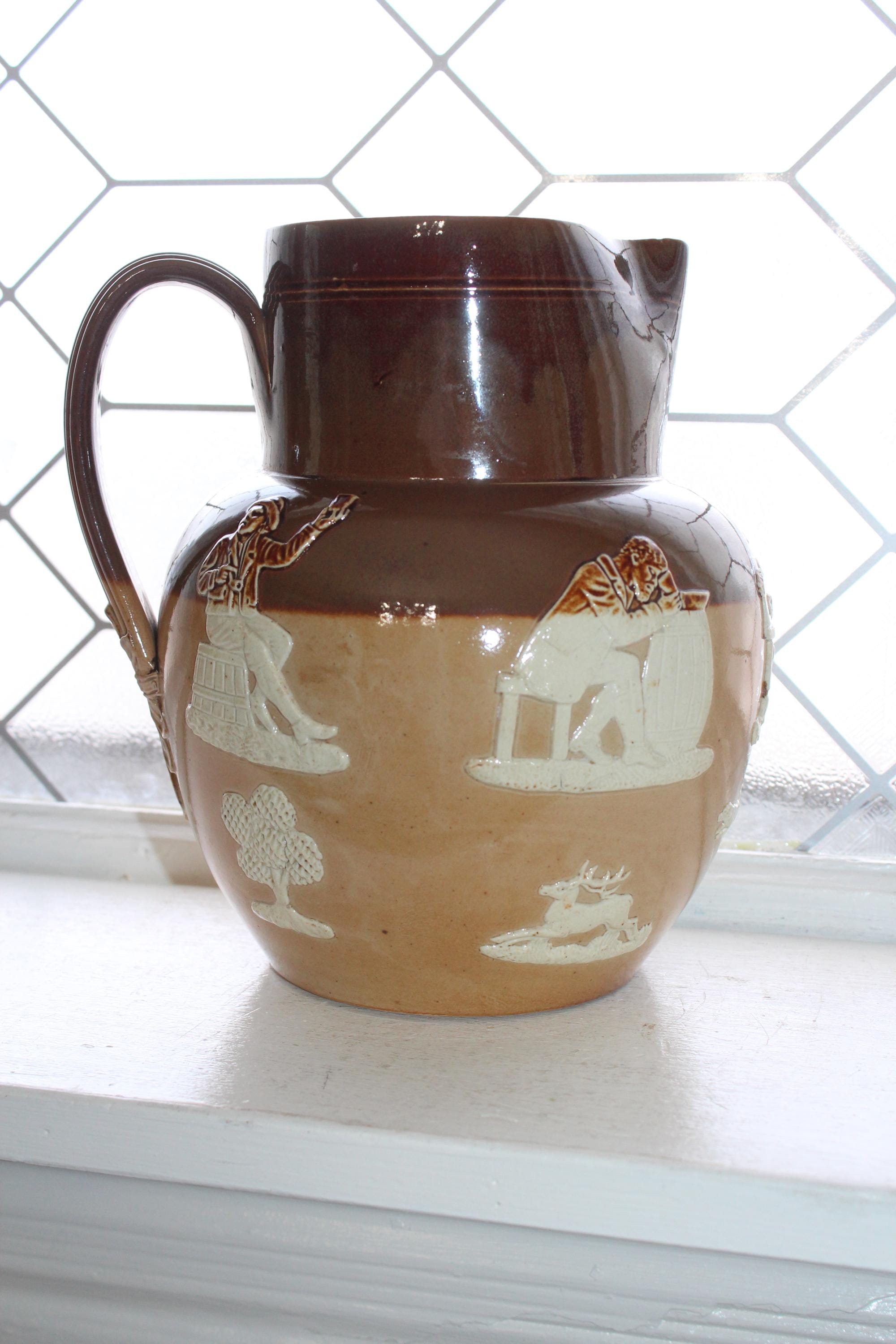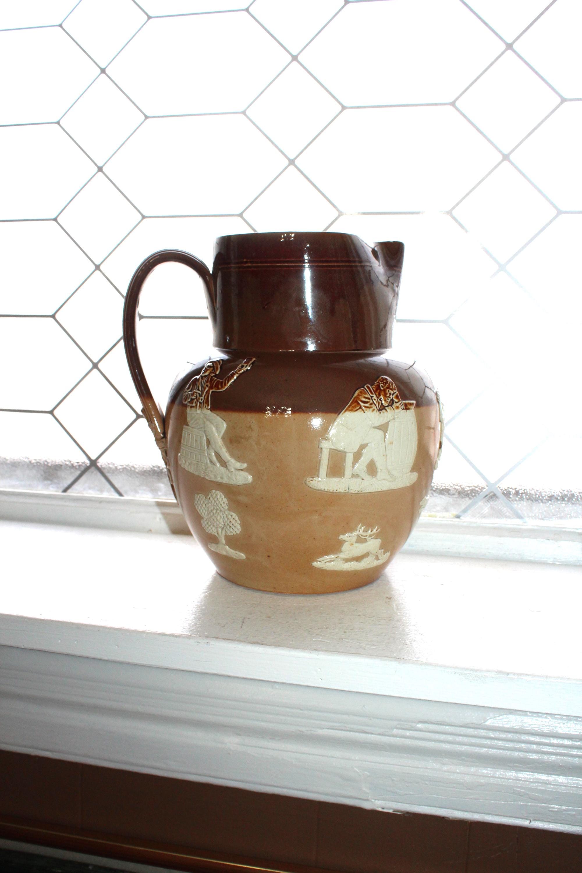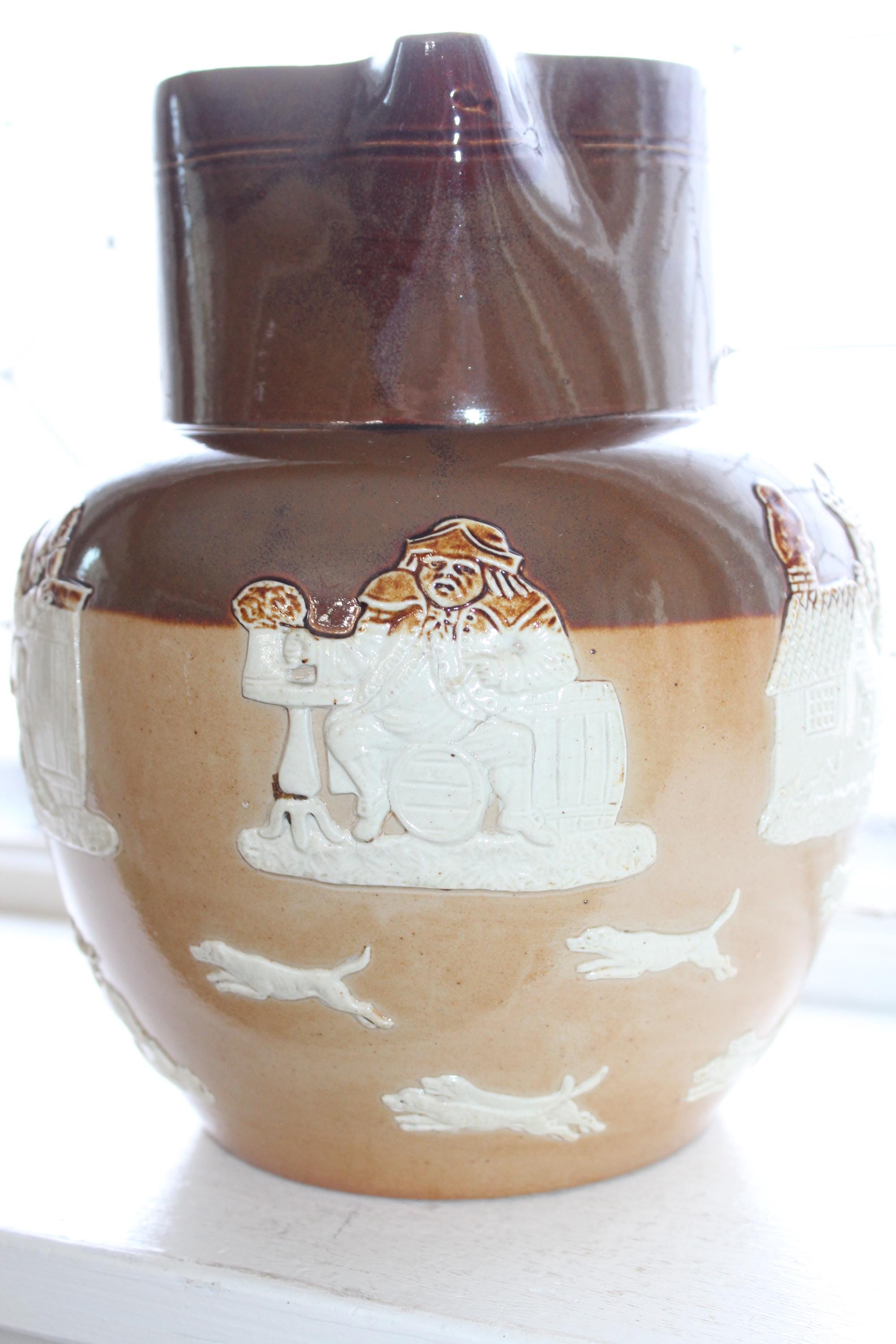 Antique Doulton Lambeth brown stoneware large ale jug pitcher with relief molded tavern and hunting scenes, in excellent condition. It measures 8 1/4" high and has no chips or cracks, perfect for display. Enjoy!