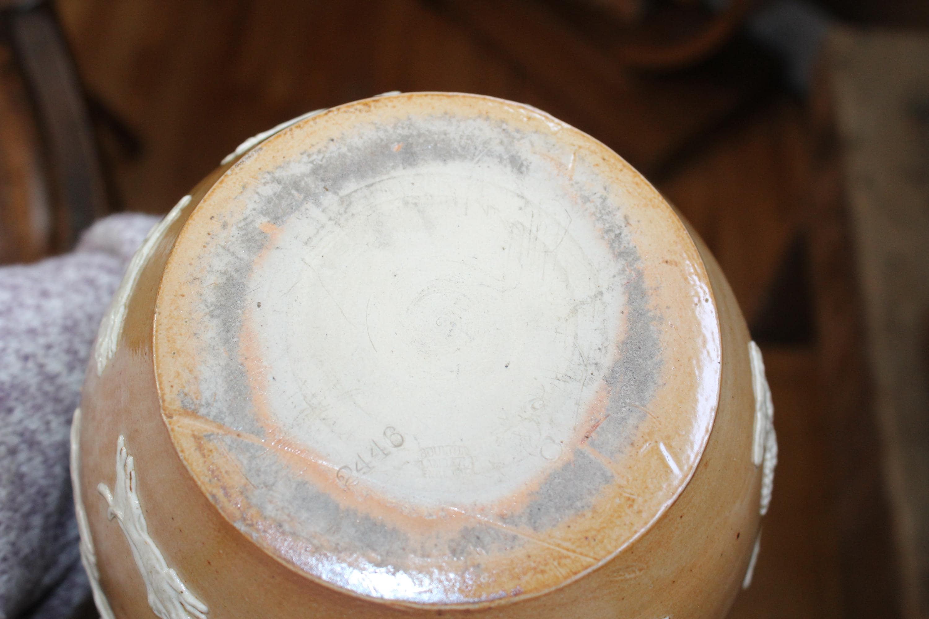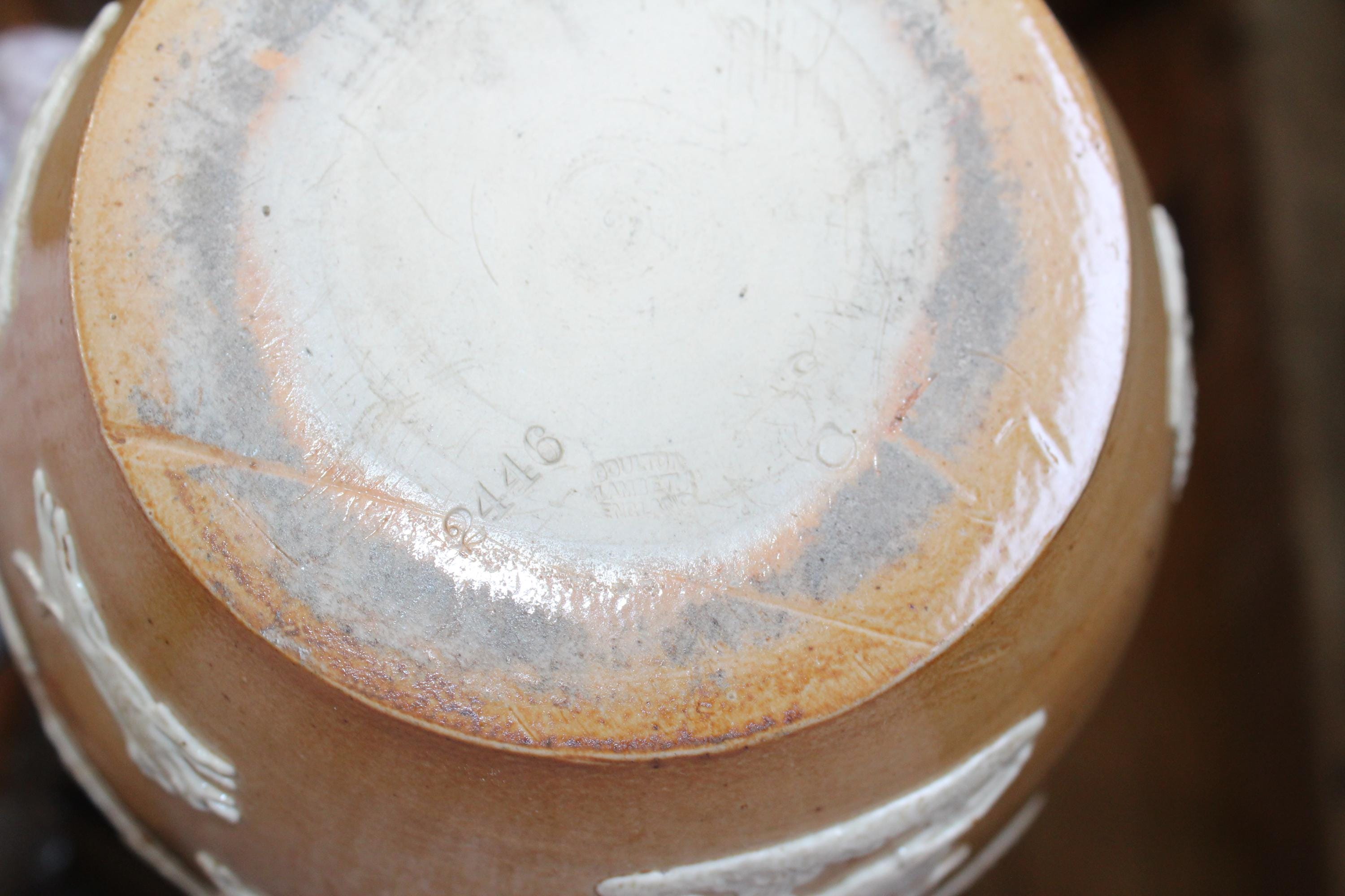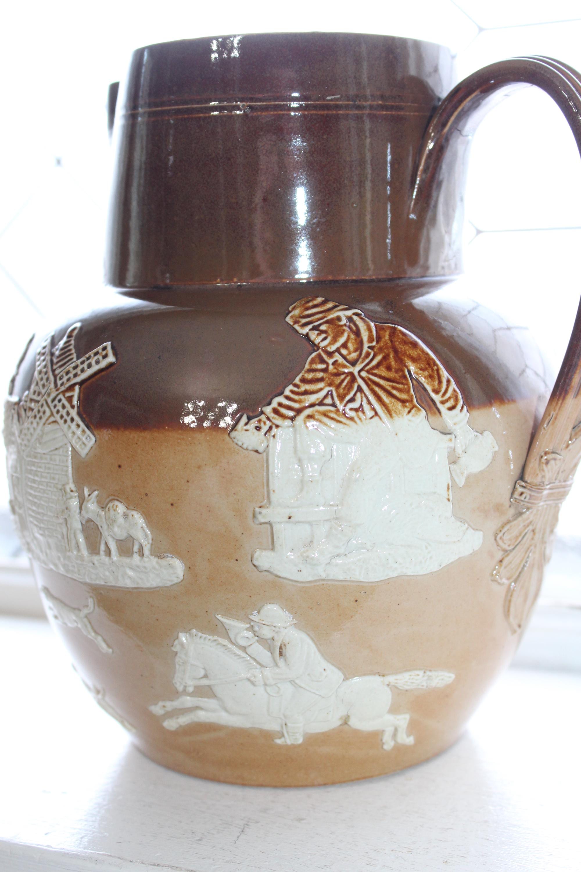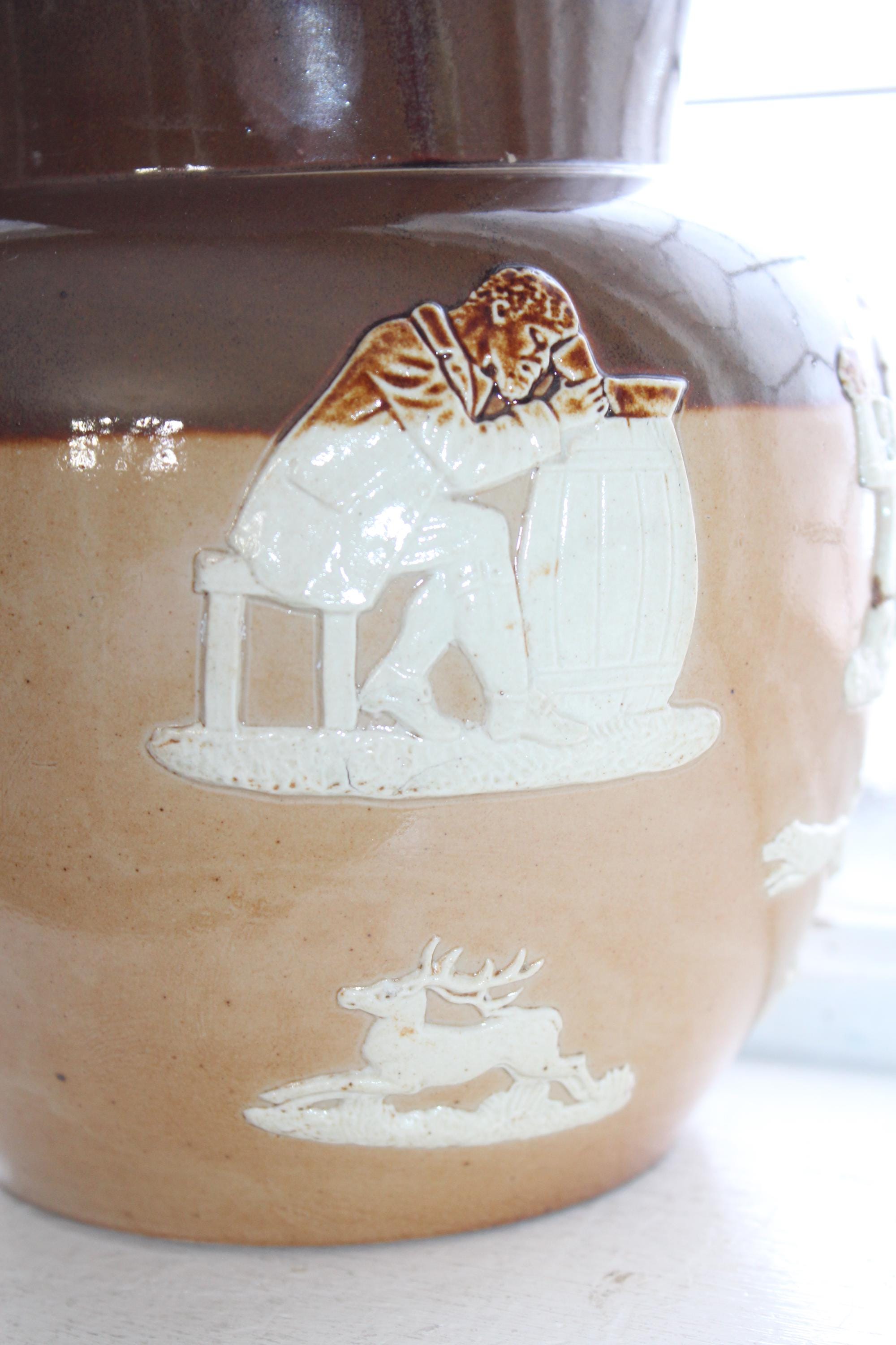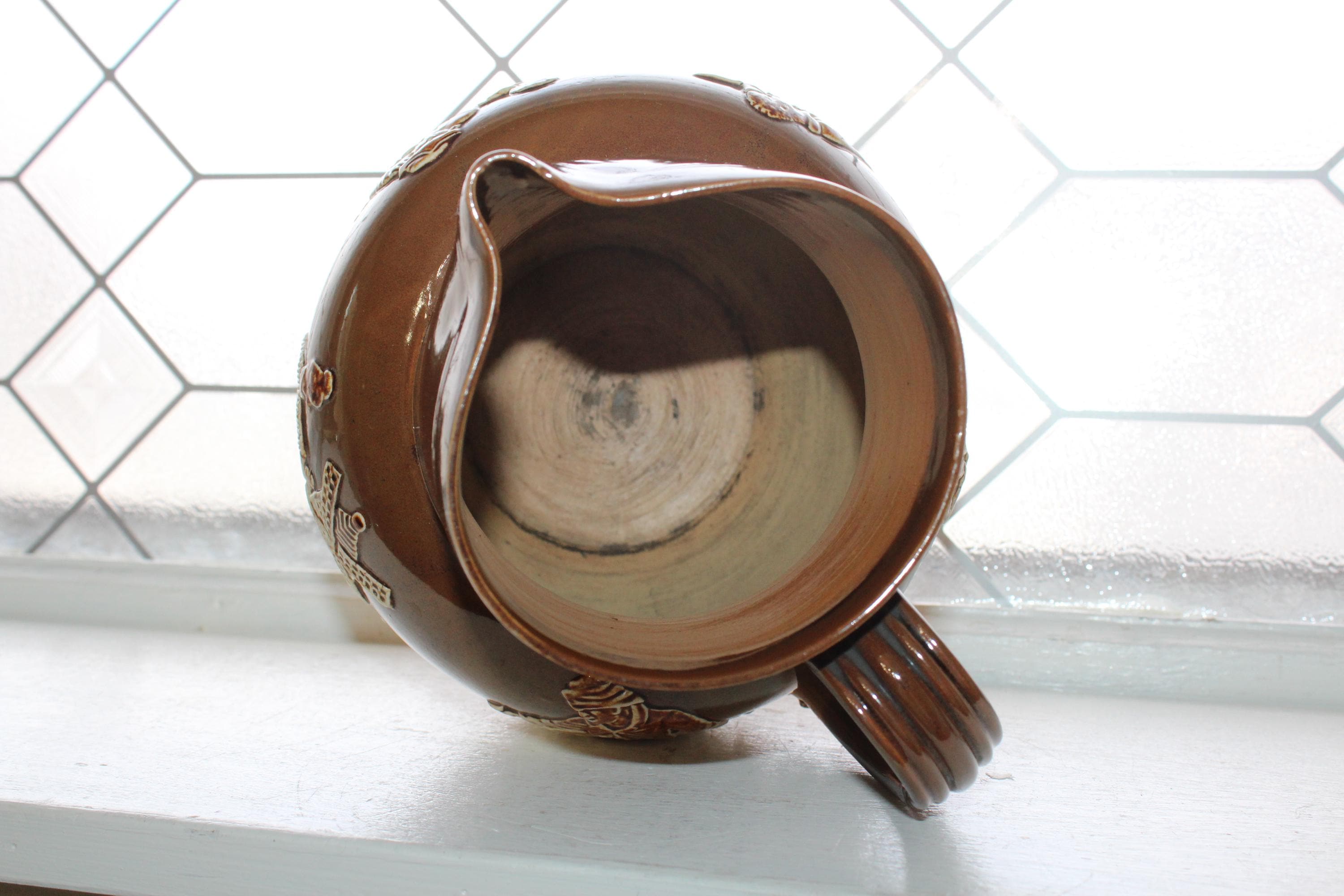 Antique Doulton Lambeth brown stoneware large ale jug pitcher with relief molded tavern and hunting scenes, in excellent condition. It measures 8 1/4" high and has no chips or cracks, perfect for display. Enjoy!