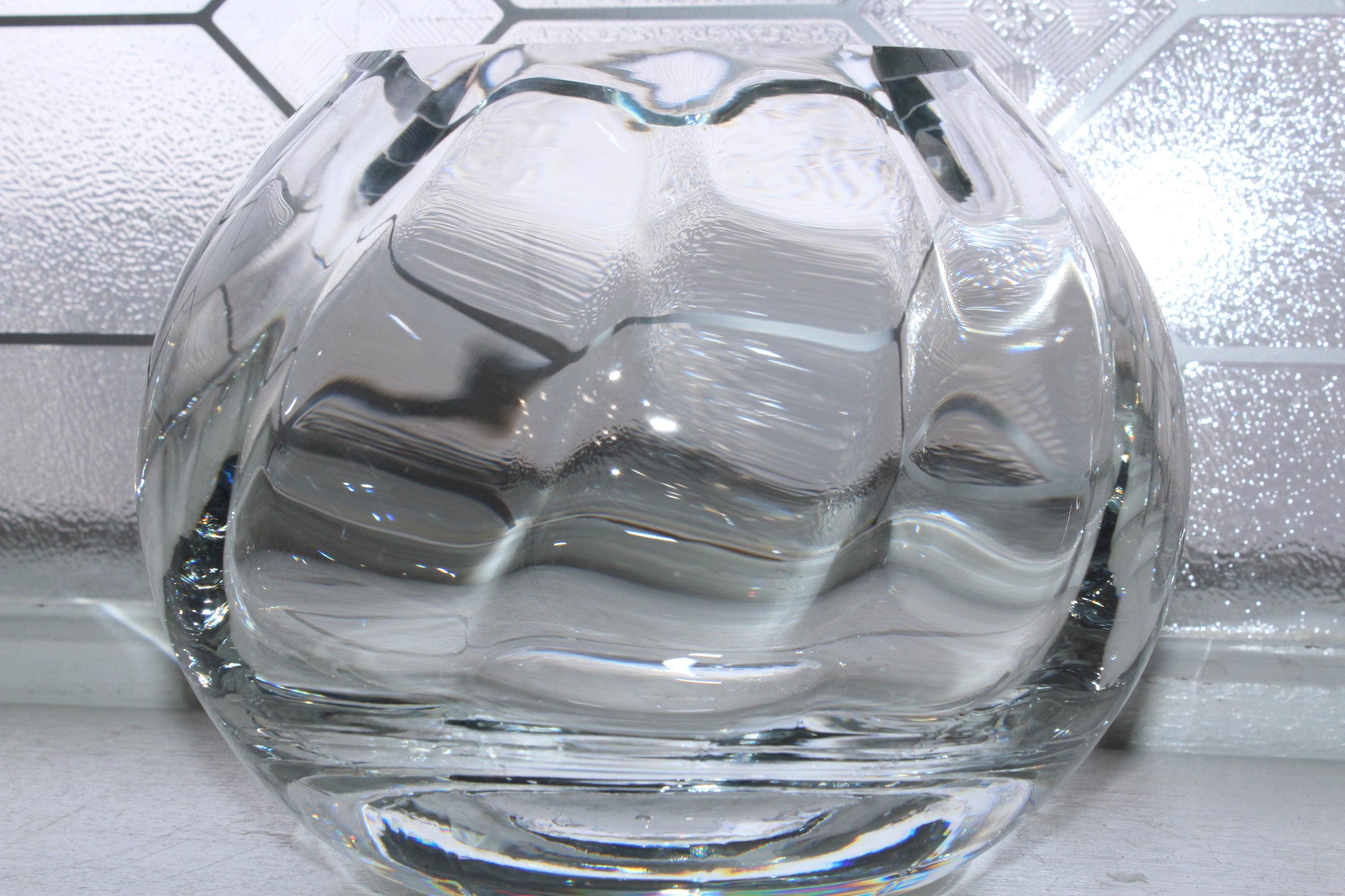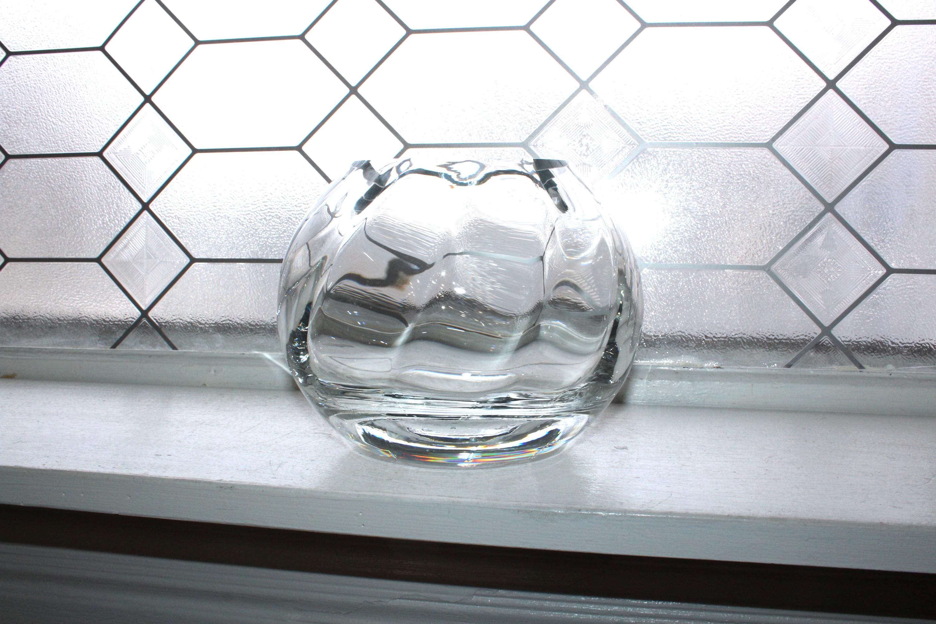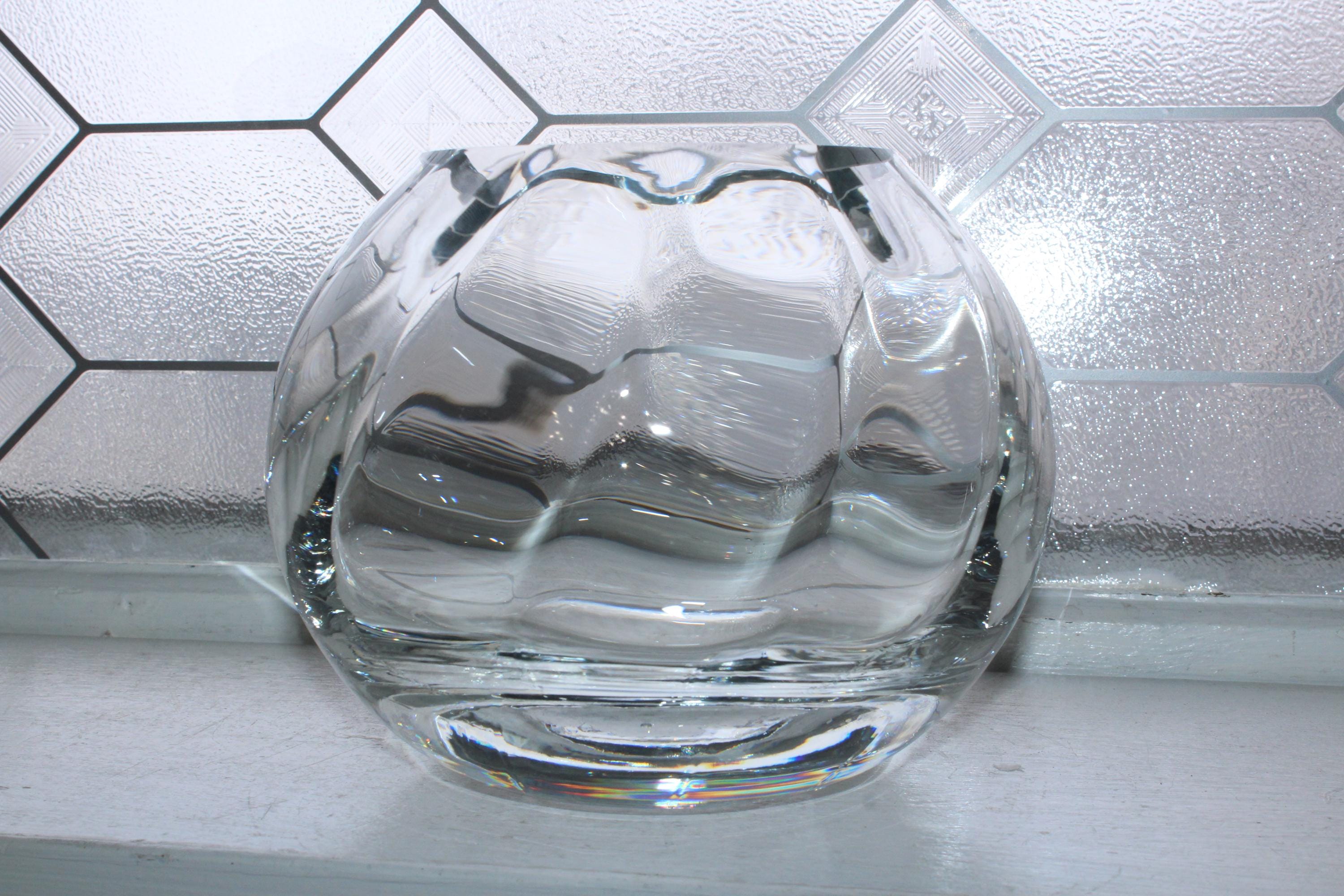Vintage heavy crystal spiral optic ball vase, in excellent condition. It measures 5 1/2" high, weighs 4 1/4 lbs. and has no chips or cracks, perfect for use or display. Enjoy!