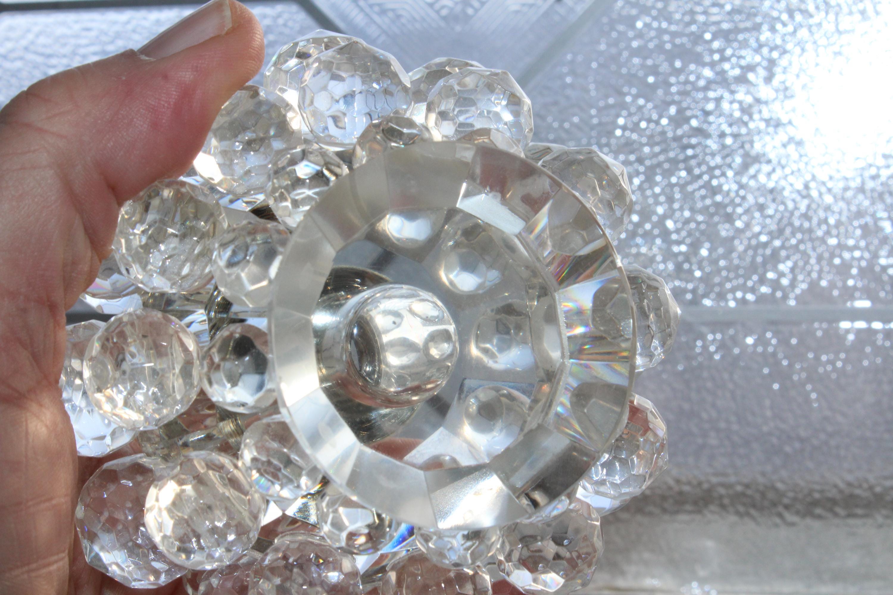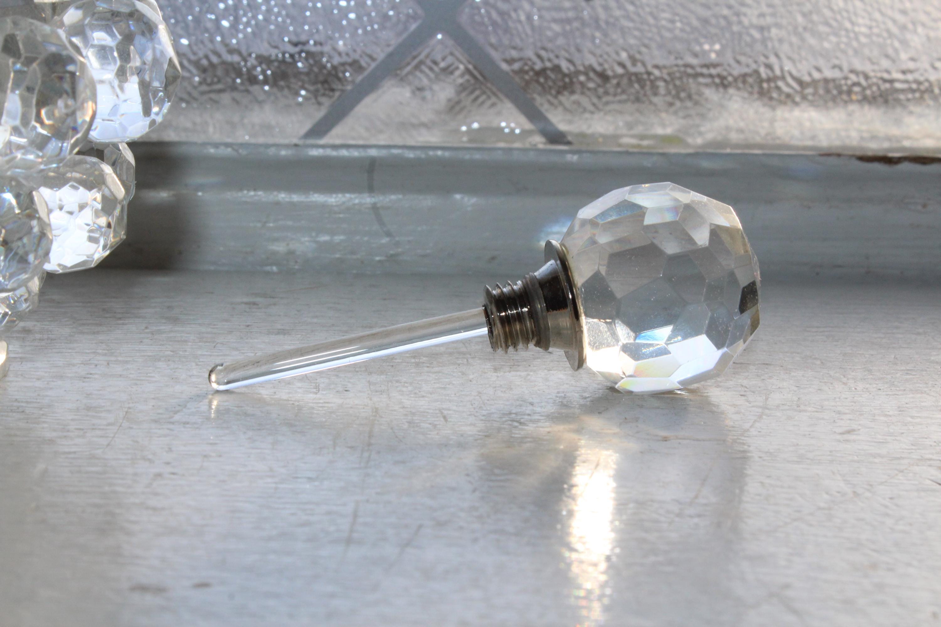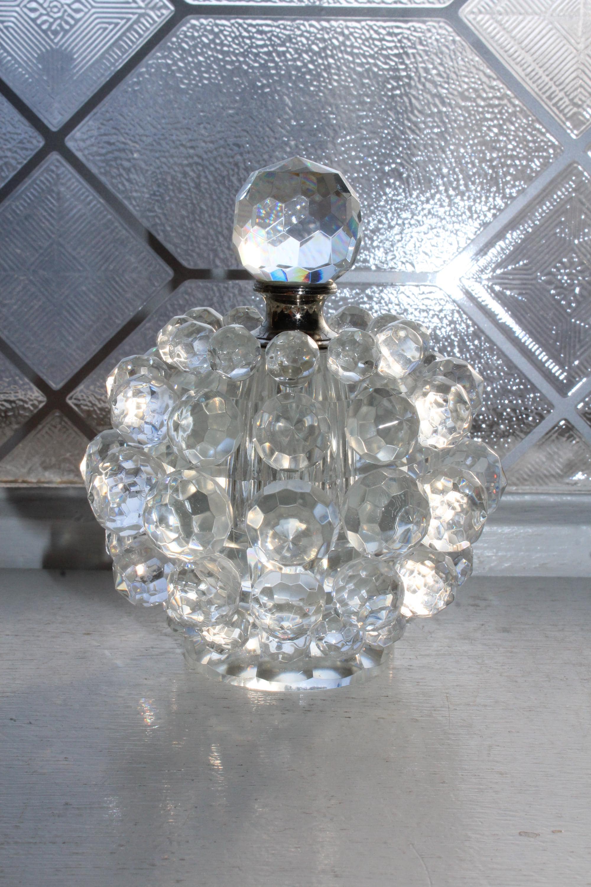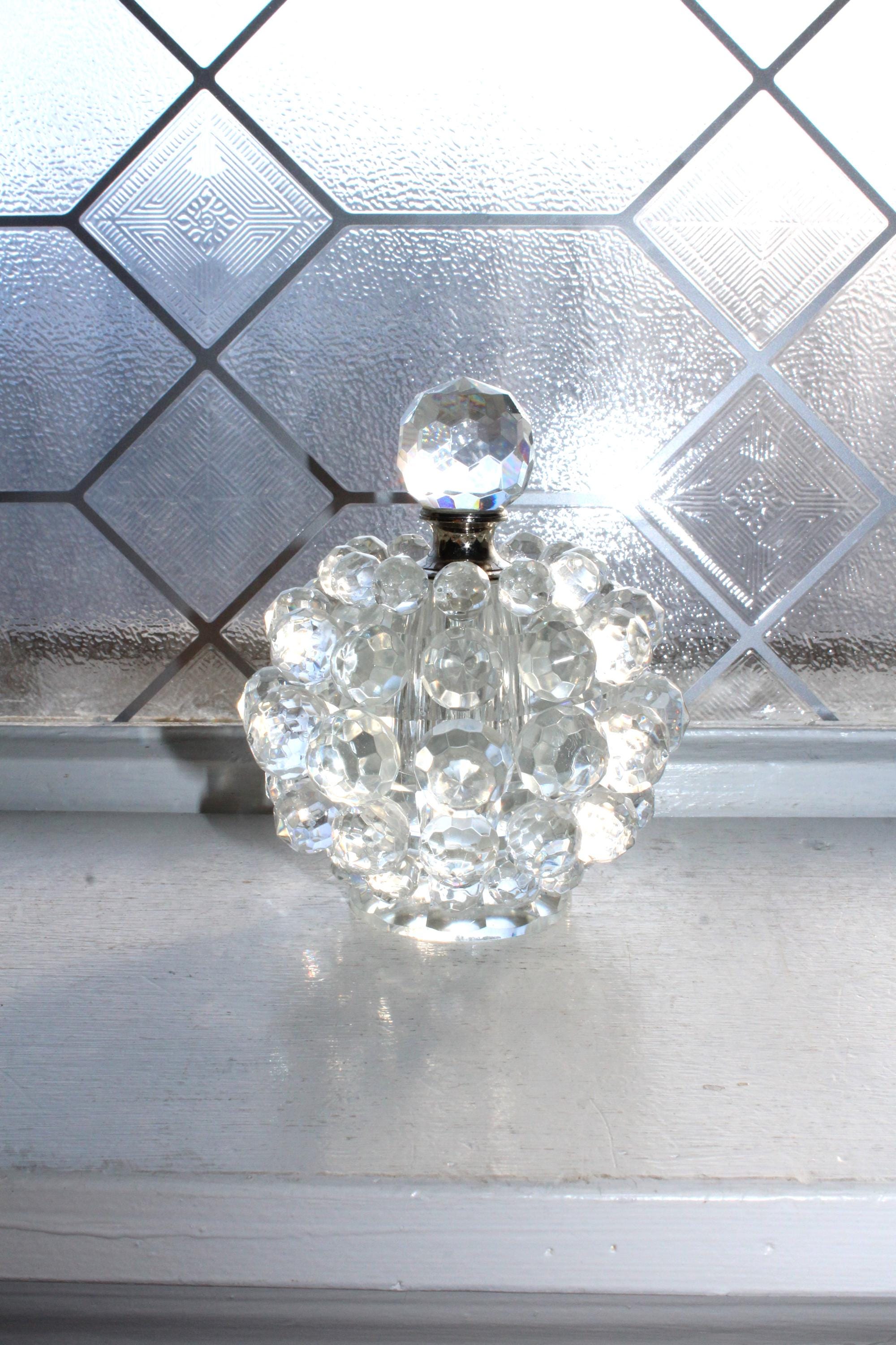 Vintage clear crystal ball shaped perfume bottle with multiple faceted crystals and dauber, in excellent condition. The bottle measures 4 1/2" high to the top of the stopper, weighs 1 1/2 lbs. and has no chips or cracks. Enjoy!
