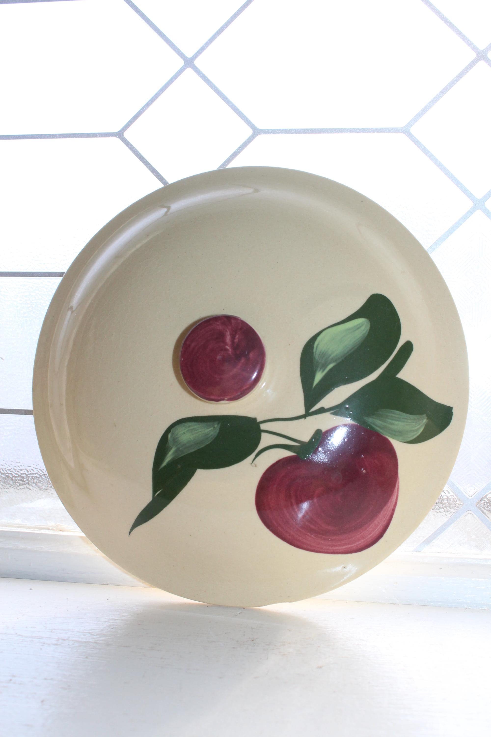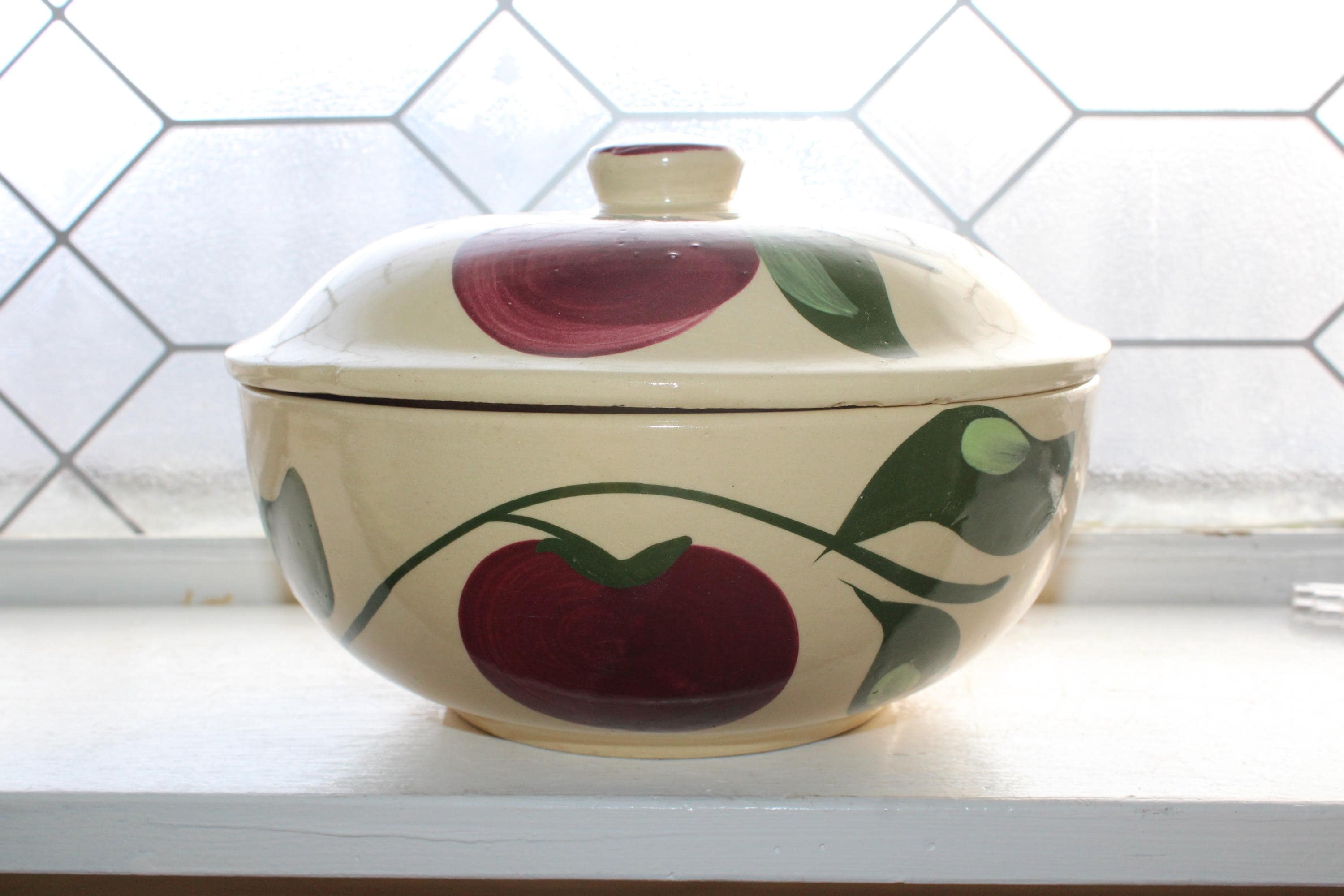 Vintage 1960s Watt pottery ovenware apple pattern baker with lid, #54 shape. The baker measures 8 5/8" wide. Minor lid rim chips and one minor bowl base chip. Great for use or display in a country kitchen. Enjoy!