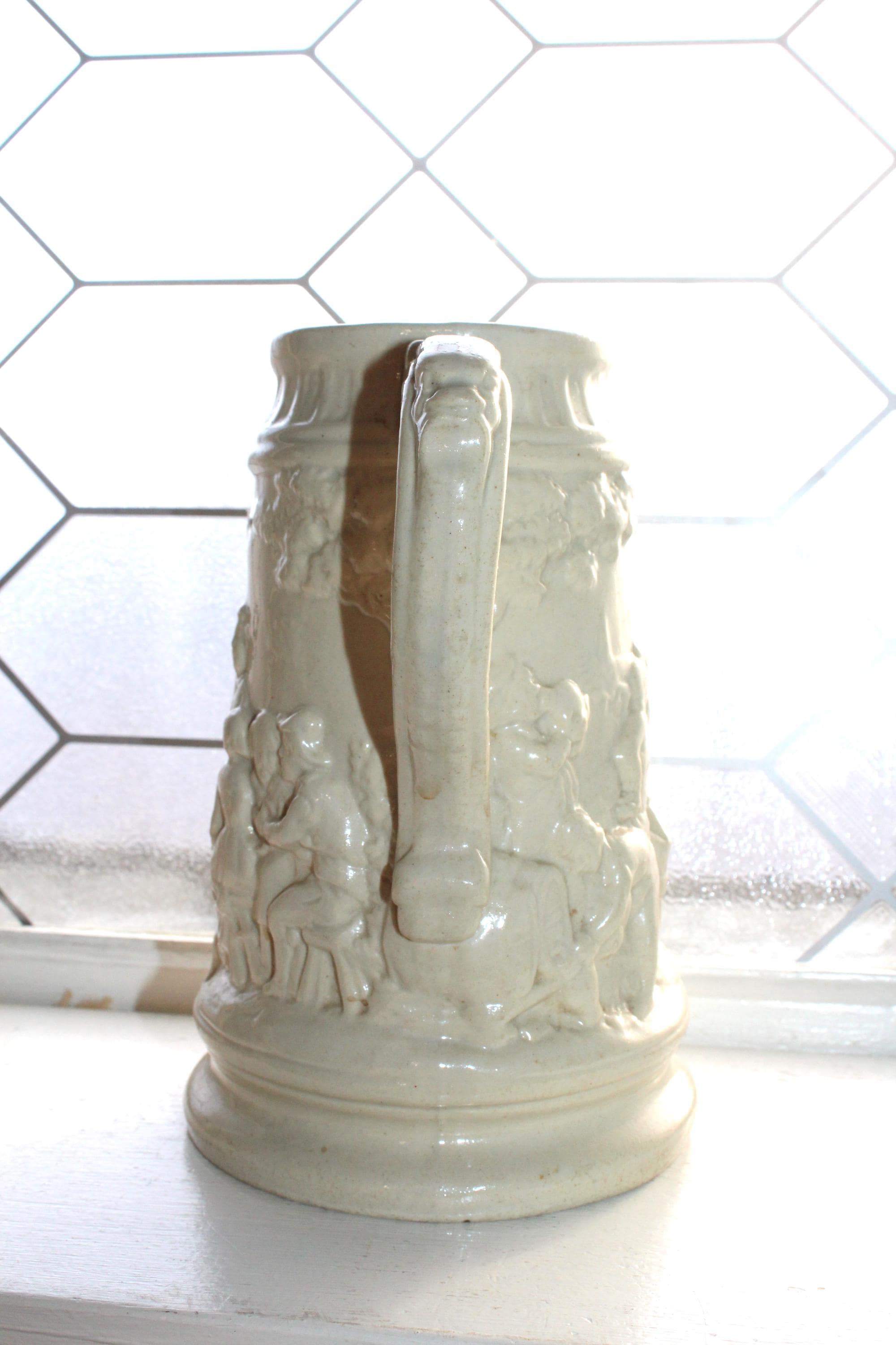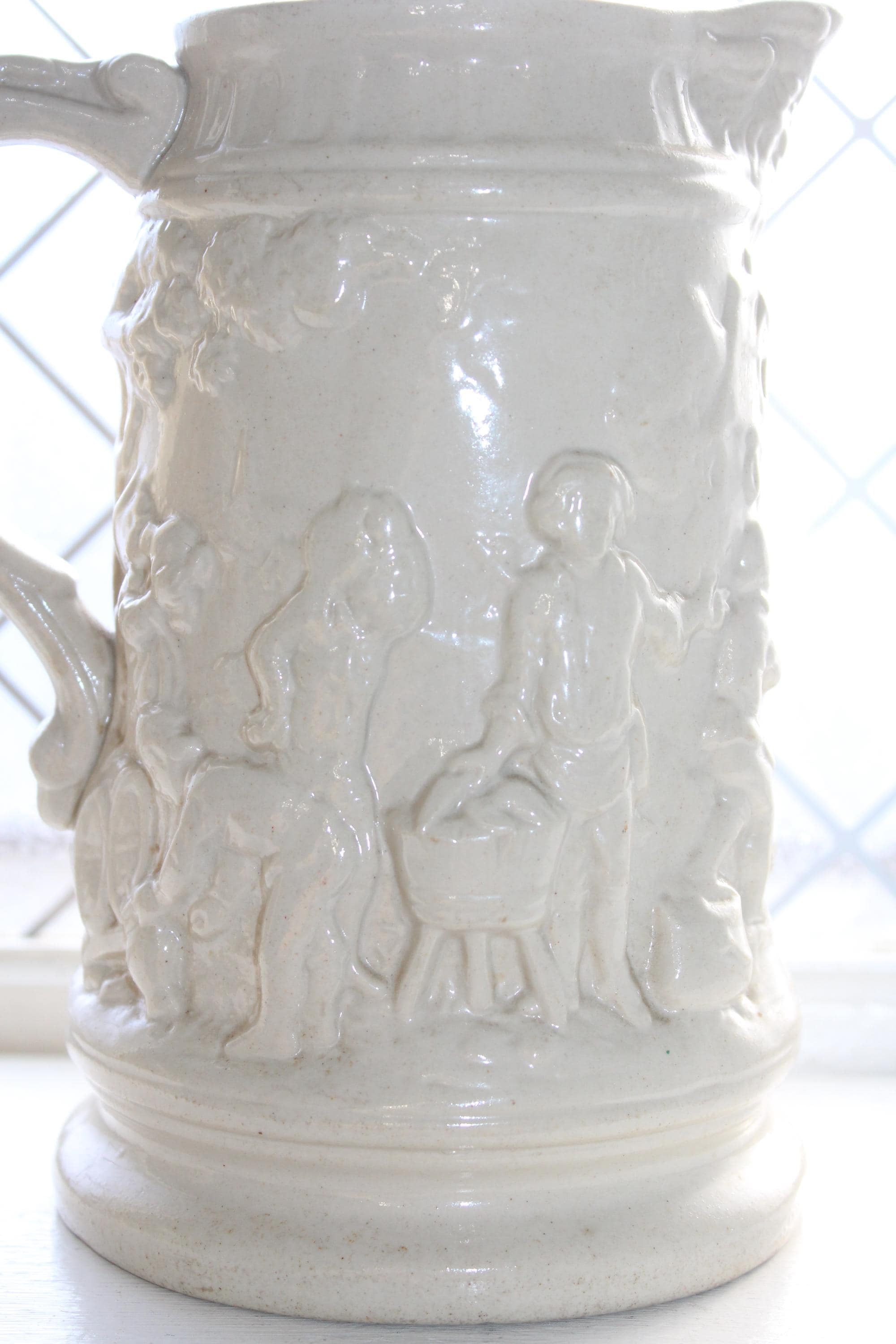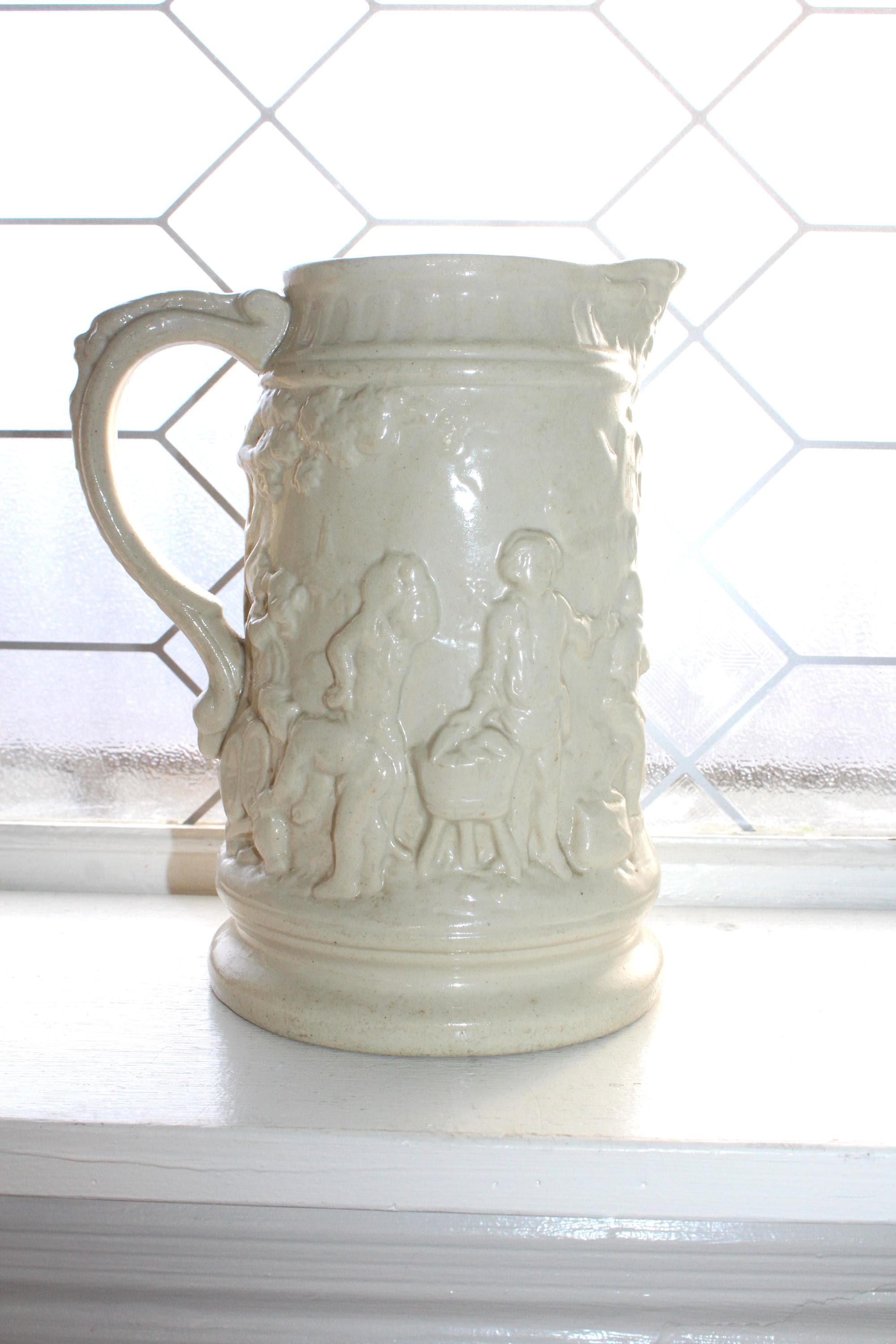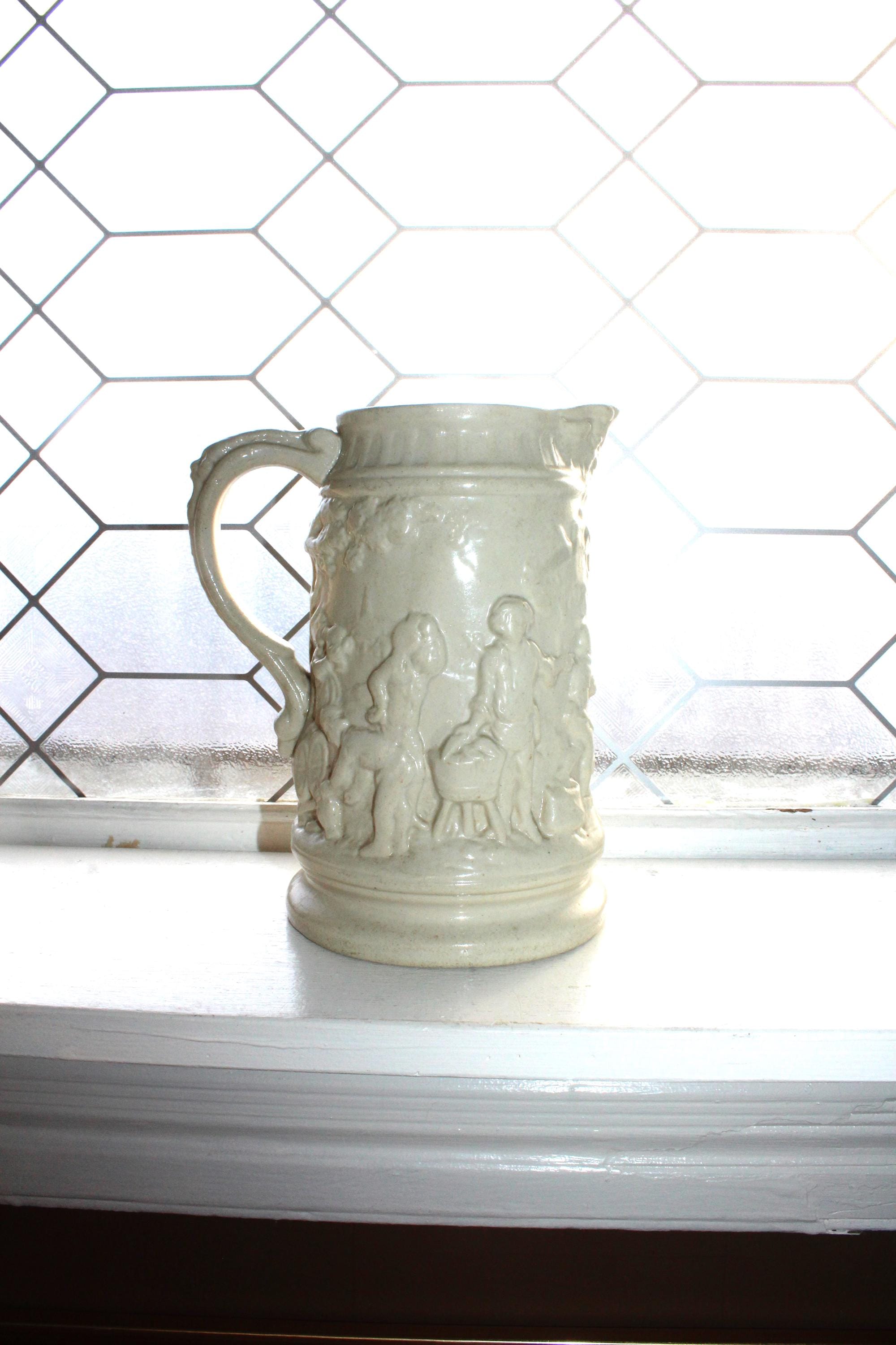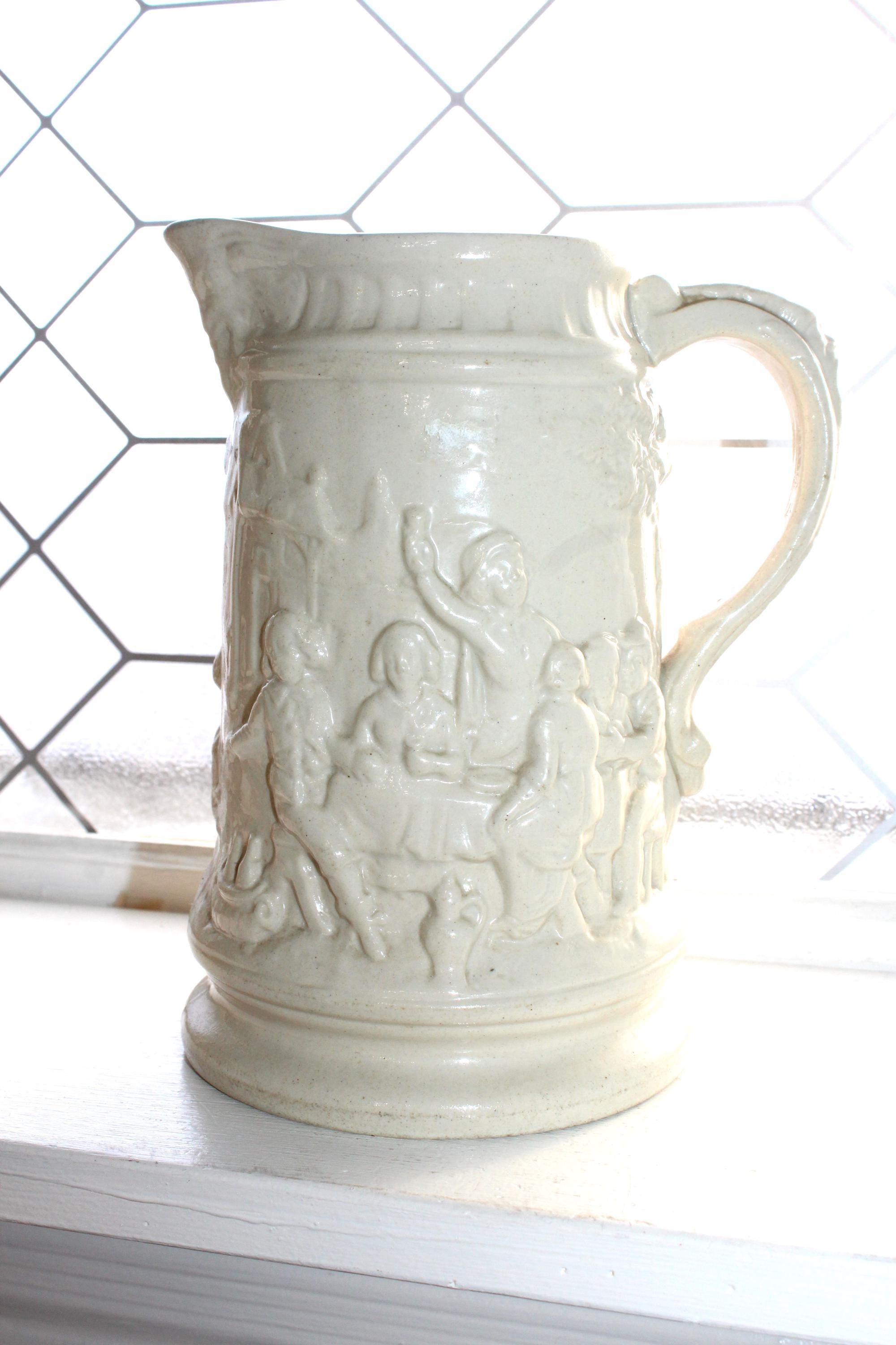 Antique 19th century white stoneware ale jug / pitcher featuring relief molded tavern scenes and grotesque face at the pour spout and handle. The pitcher measures 8 1/4" high and is marked on the underside X 3. No chips or cracks, displays very well. Enjoy!