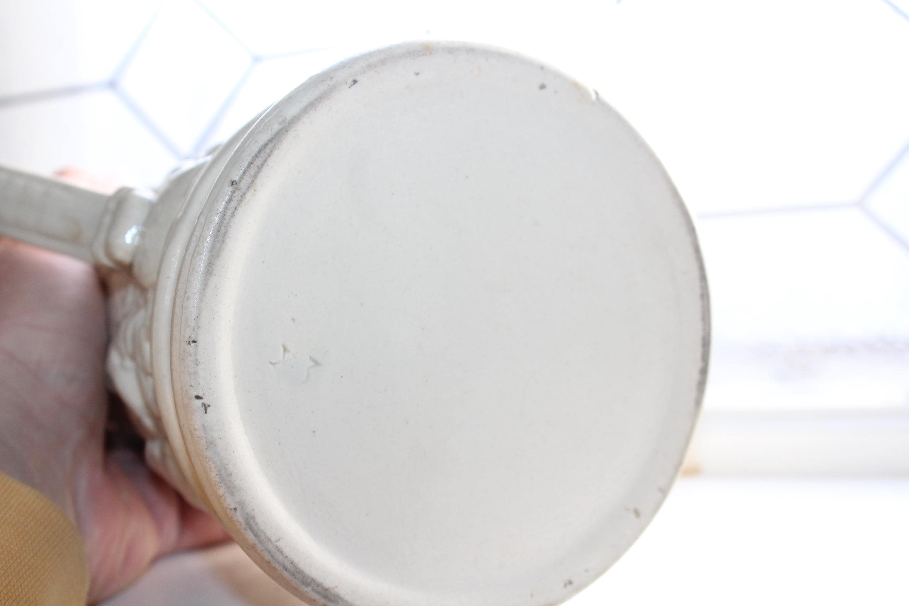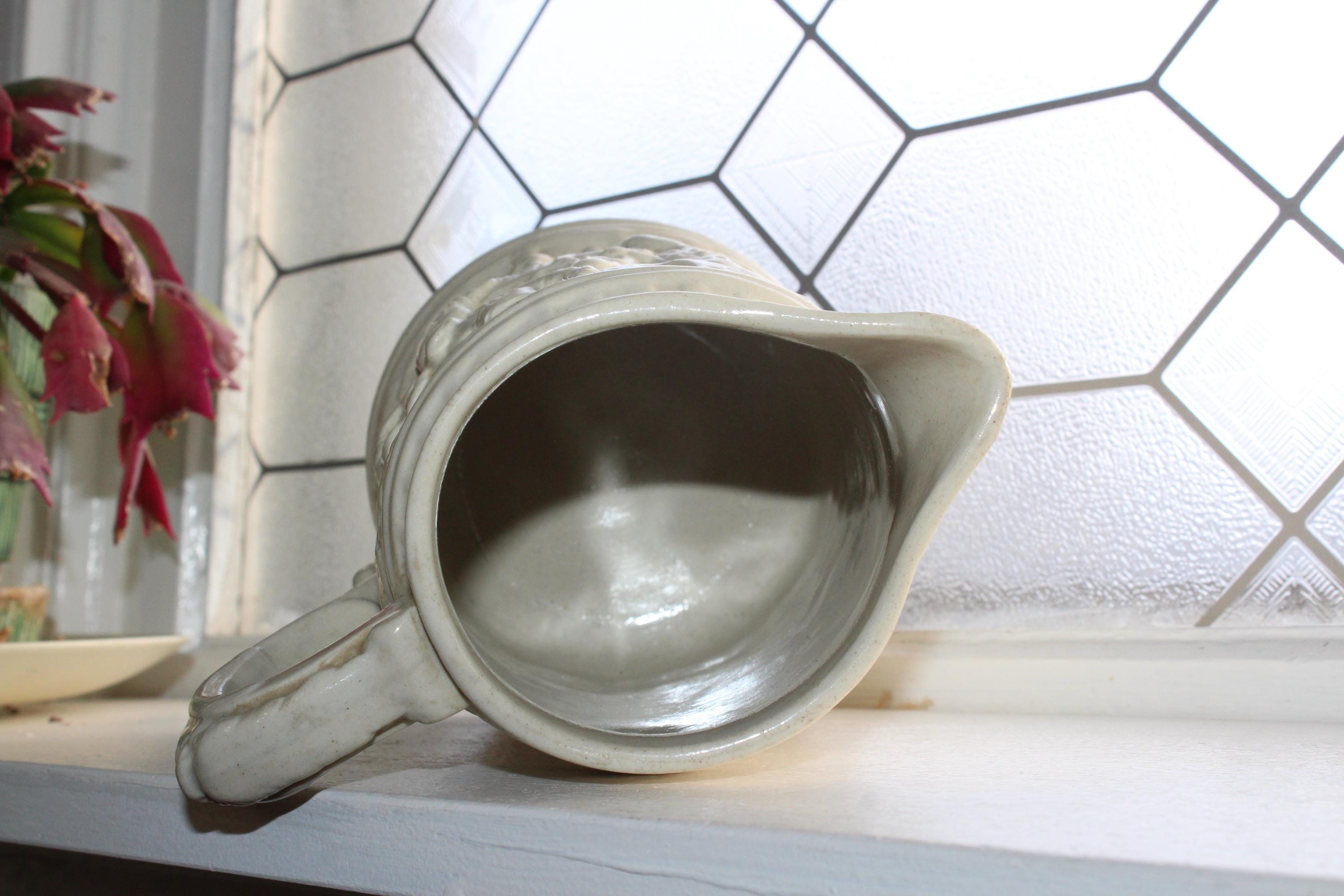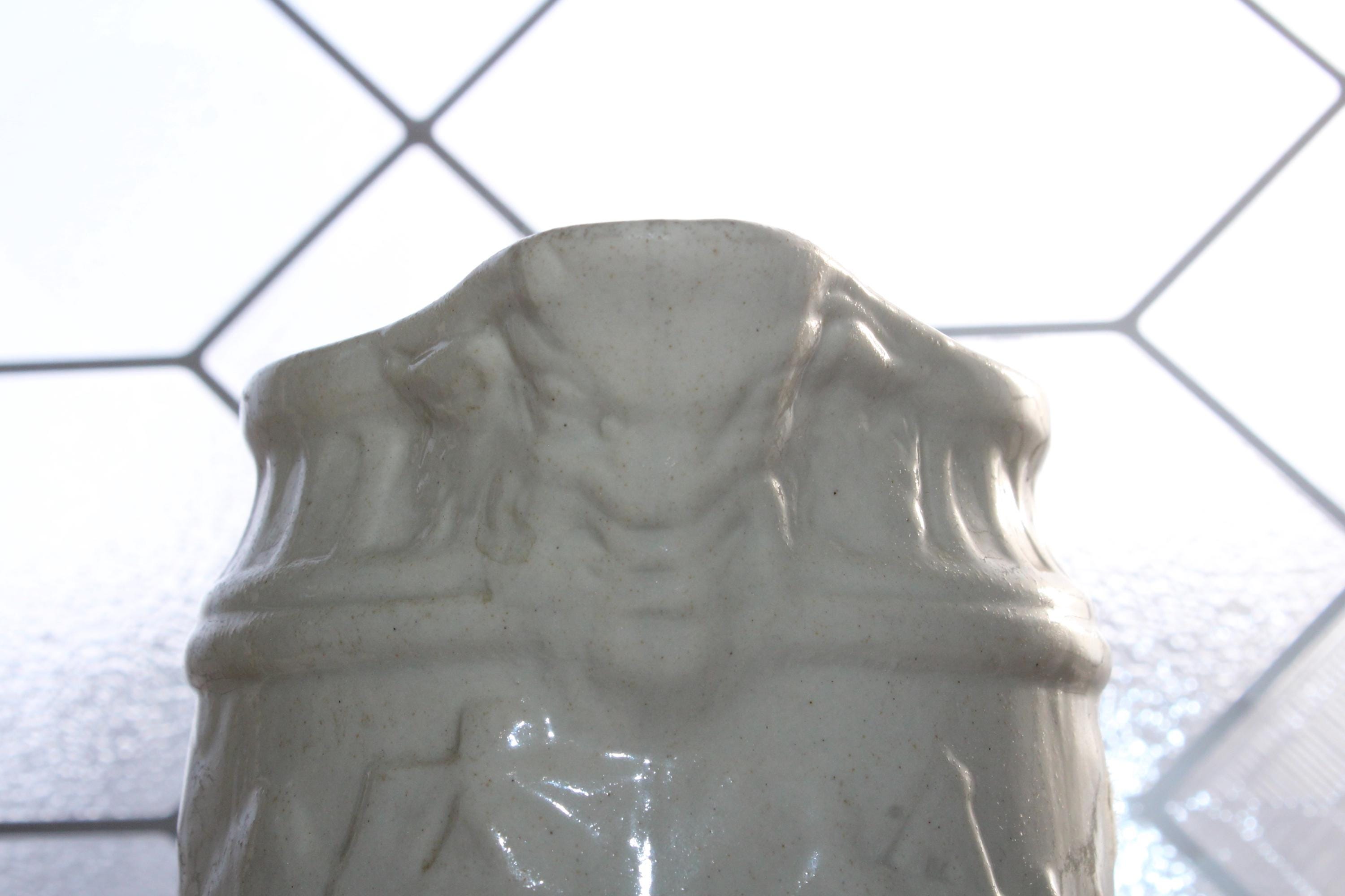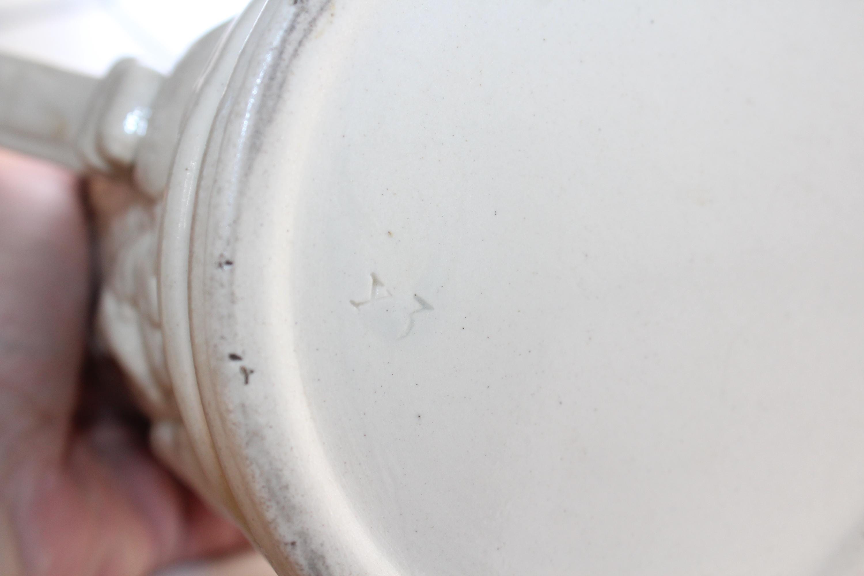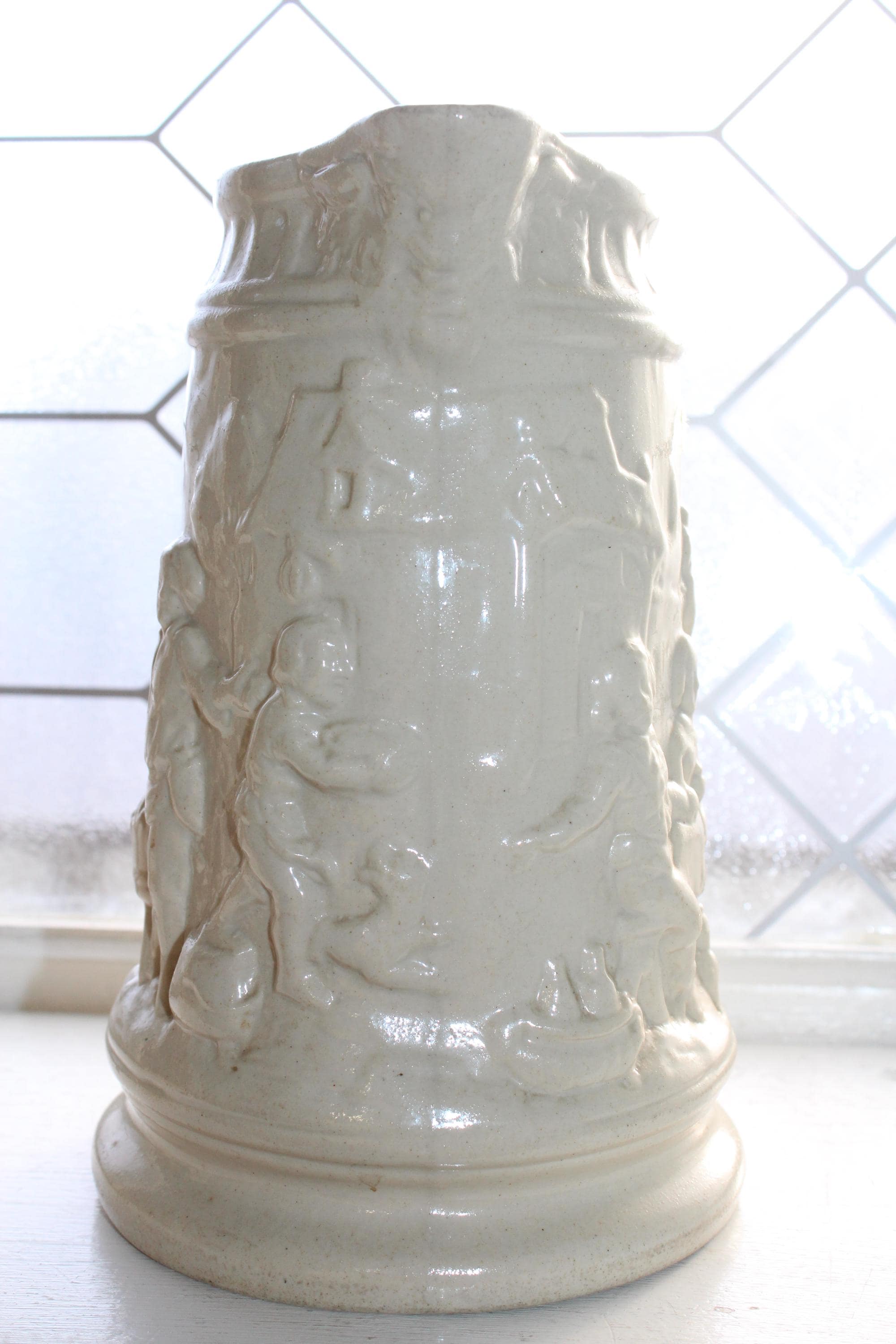 Antique 19th century white stoneware ale jug / pitcher featuring relief molded tavern scenes and grotesque face at the pour spout and handle. The pitcher measures 8 1/4" high and is marked on the underside X 3. No chips or cracks, displays very well. Enjoy!