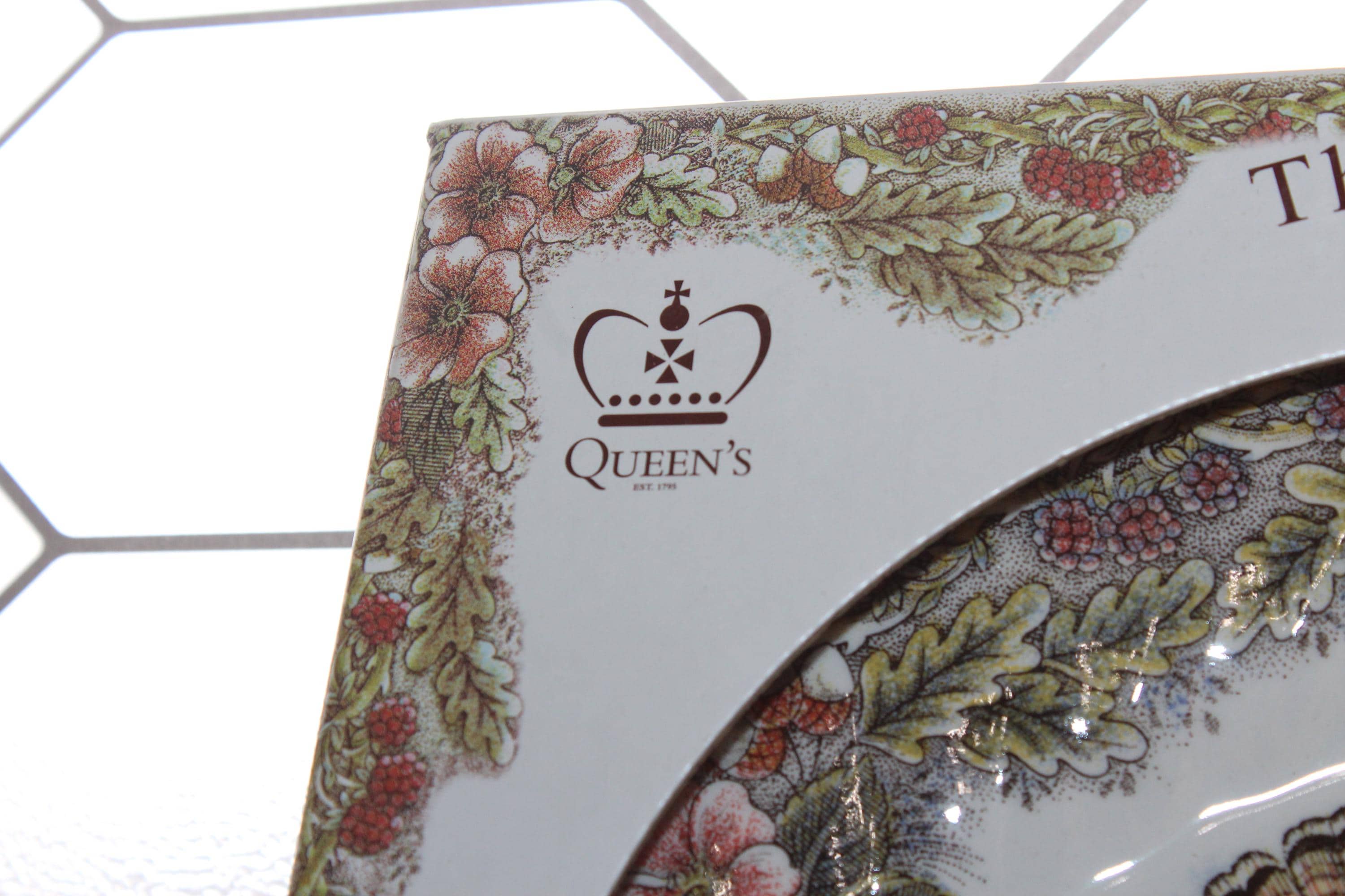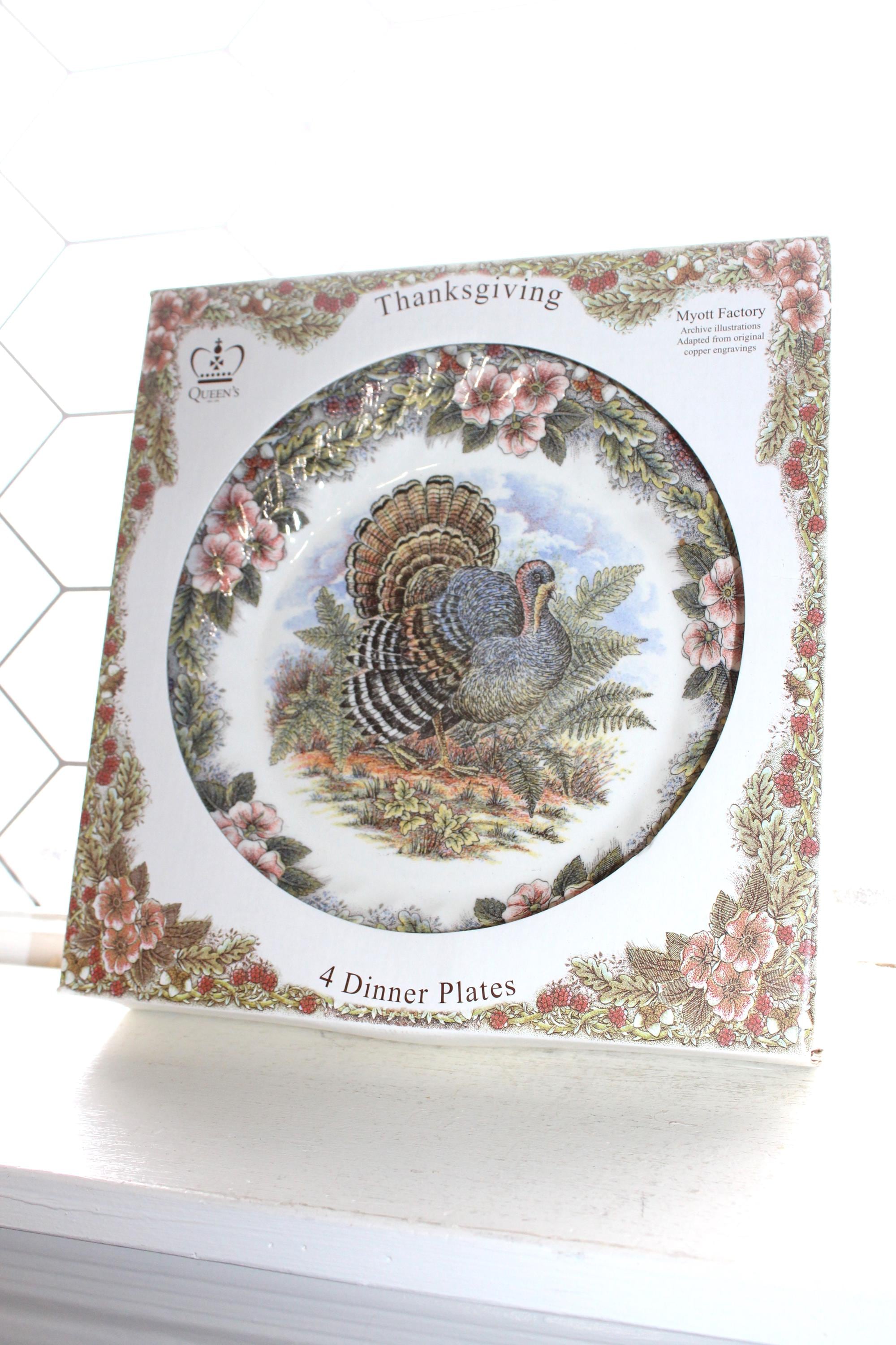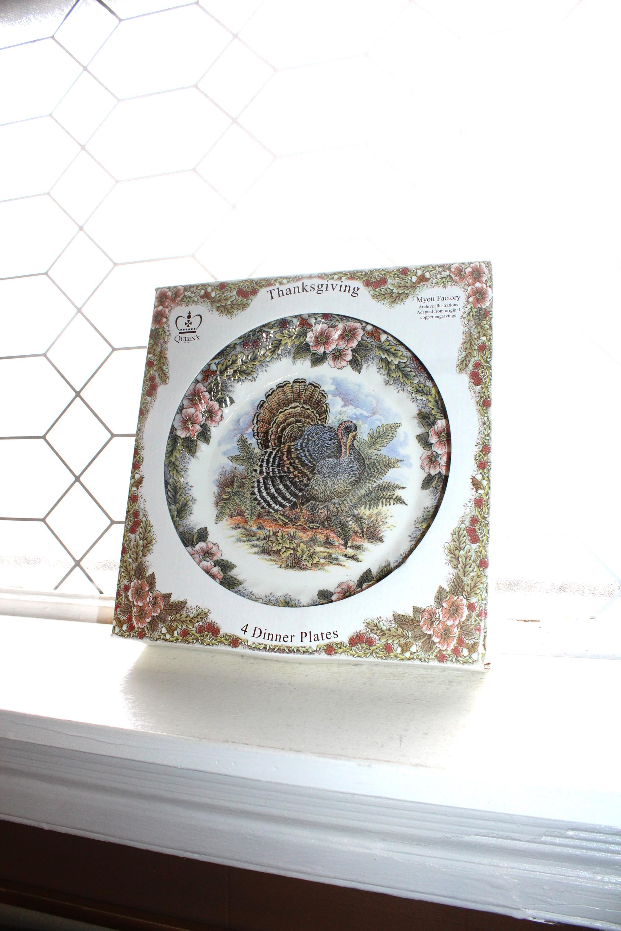 4 Queen's Myott Factory Thanksgiving dinner plates featuring detailed turkeys which are archive illustrations adapted from original copper engravings, in original box and in excellent unused condition. They measure 10" wide. THERE ARE 4 BOXED SETS OF 4 AVAILABLE VIA THE DROP DOWN BOX. I also have other pieces of this pattern available in my shop. Enjoy!