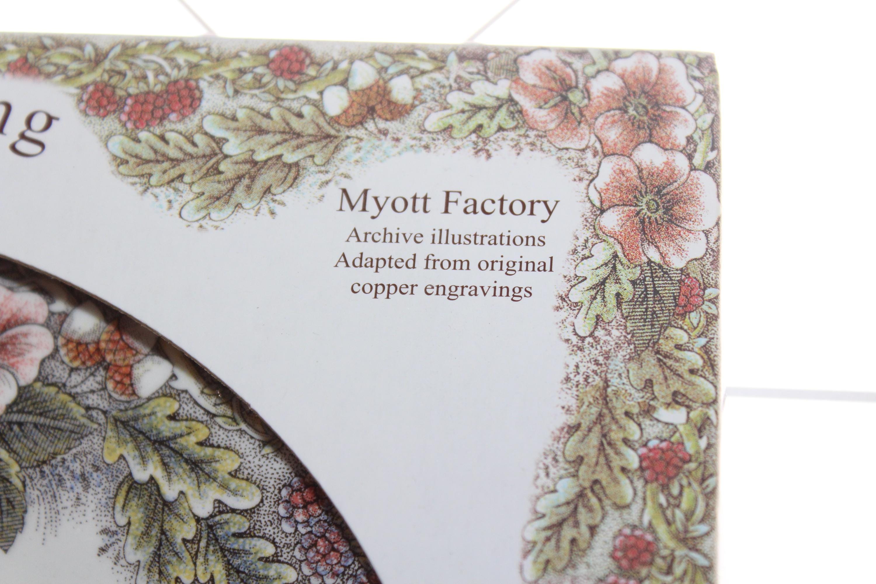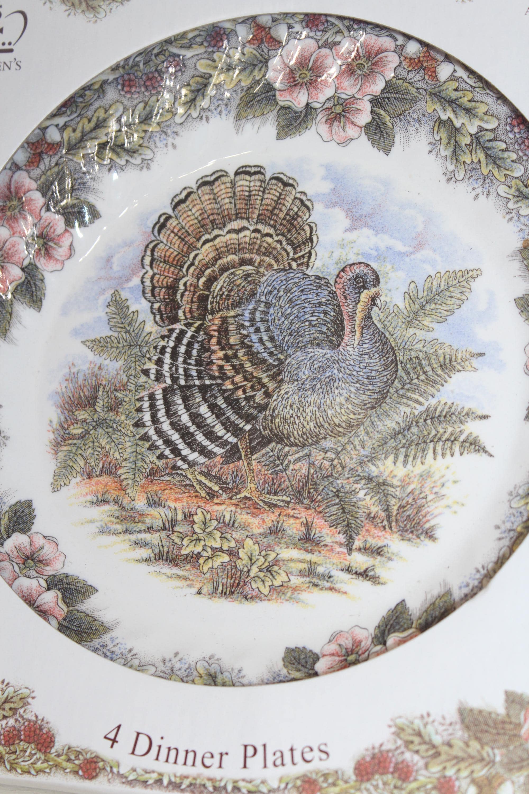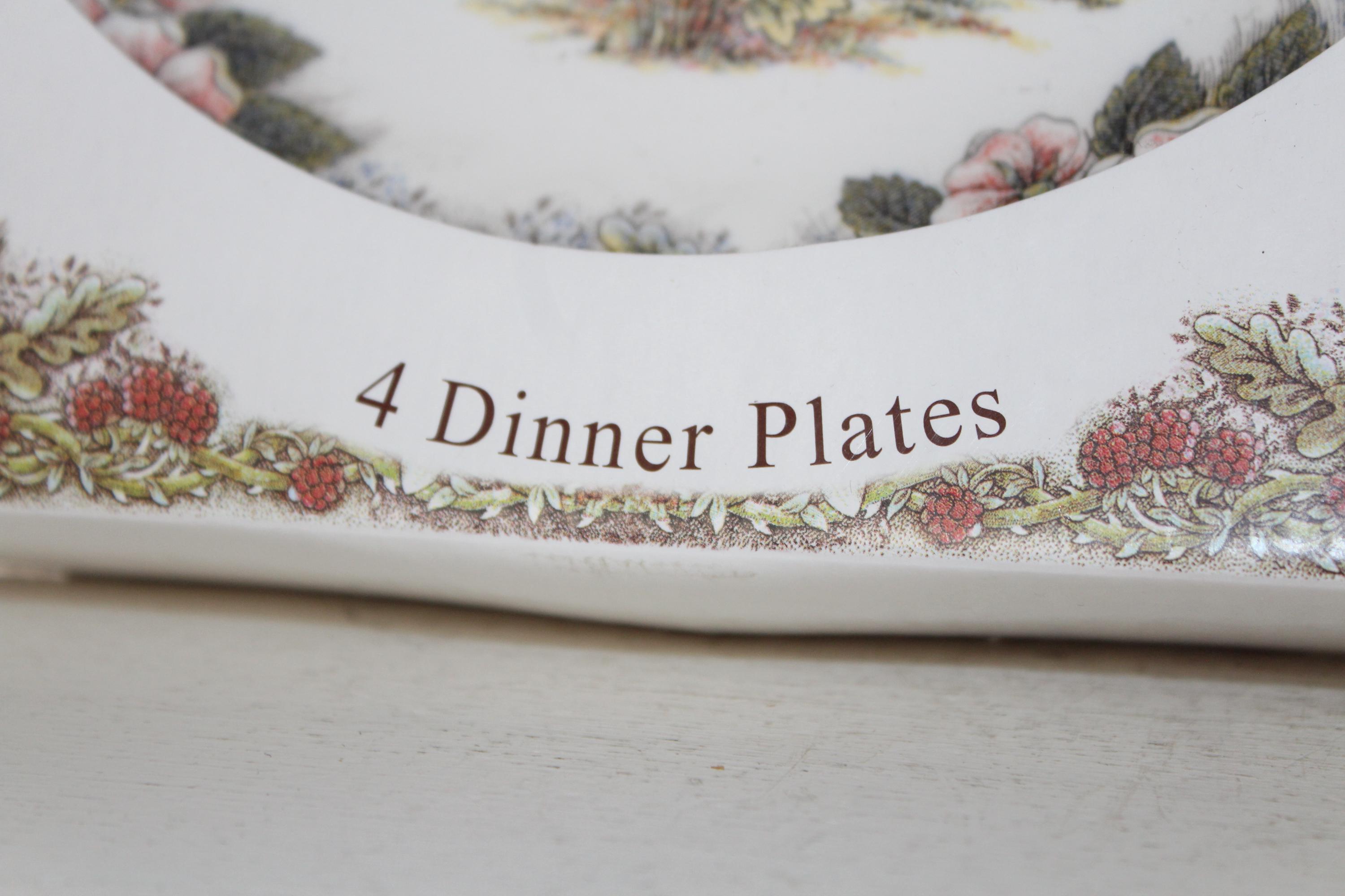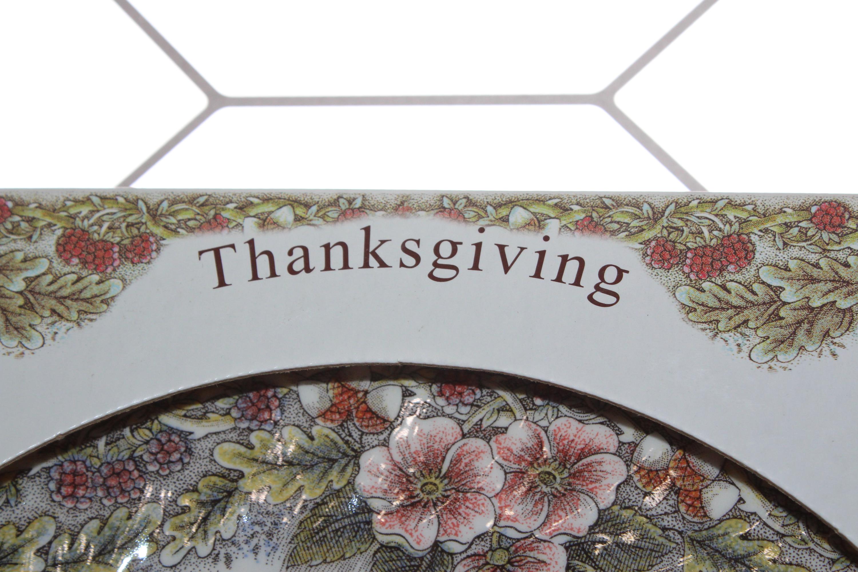 4 Queen's Myott Factory Thanksgiving dinner plates featuring detailed turkeys which are archive illustrations adapted from original copper engravings, in original box and in excellent unused condition. They measure 10" wide. THERE ARE 4 BOXED SETS OF 4 AVAILABLE VIA THE DROP DOWN BOX. I also have other pieces of this pattern available in my shop. Enjoy!