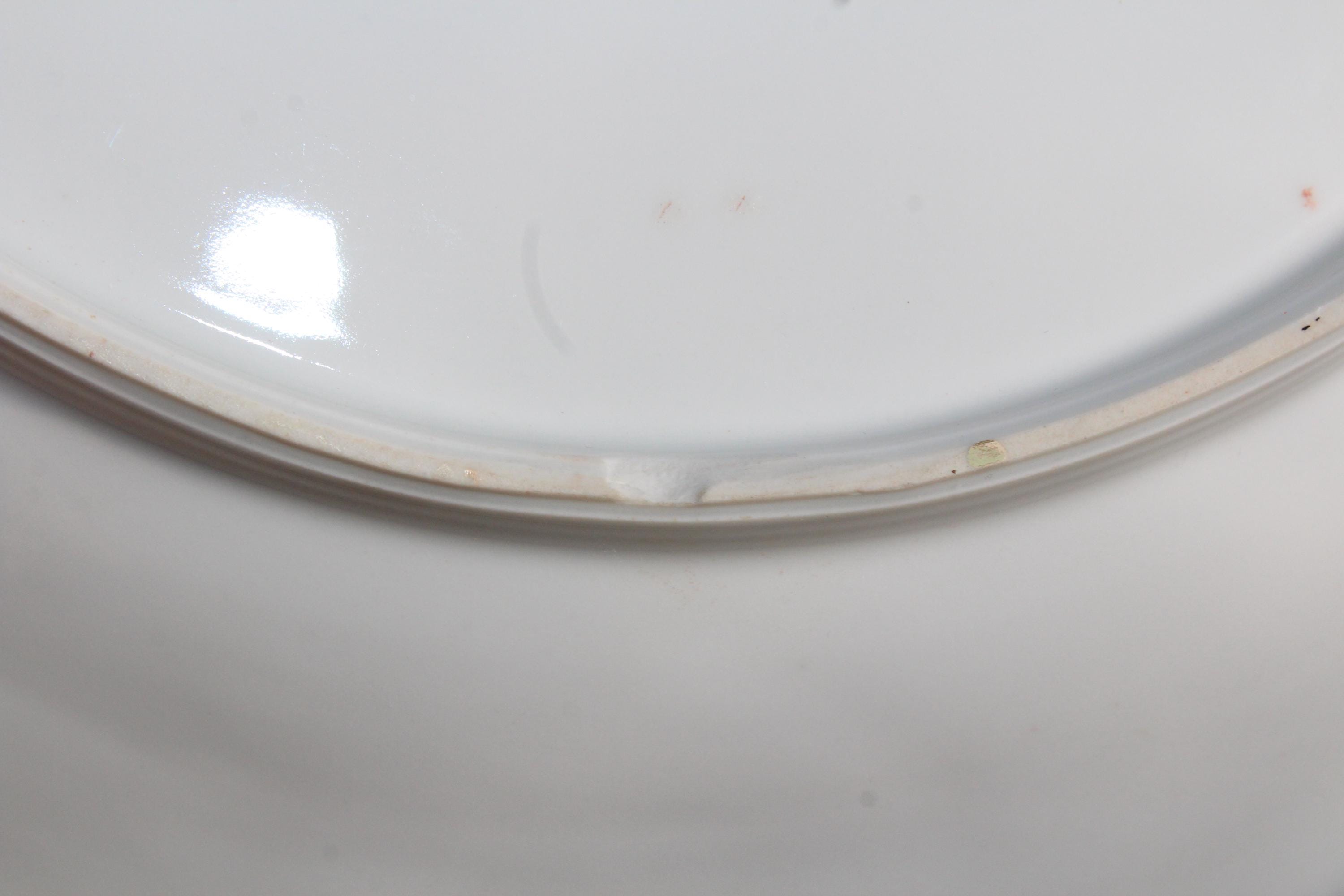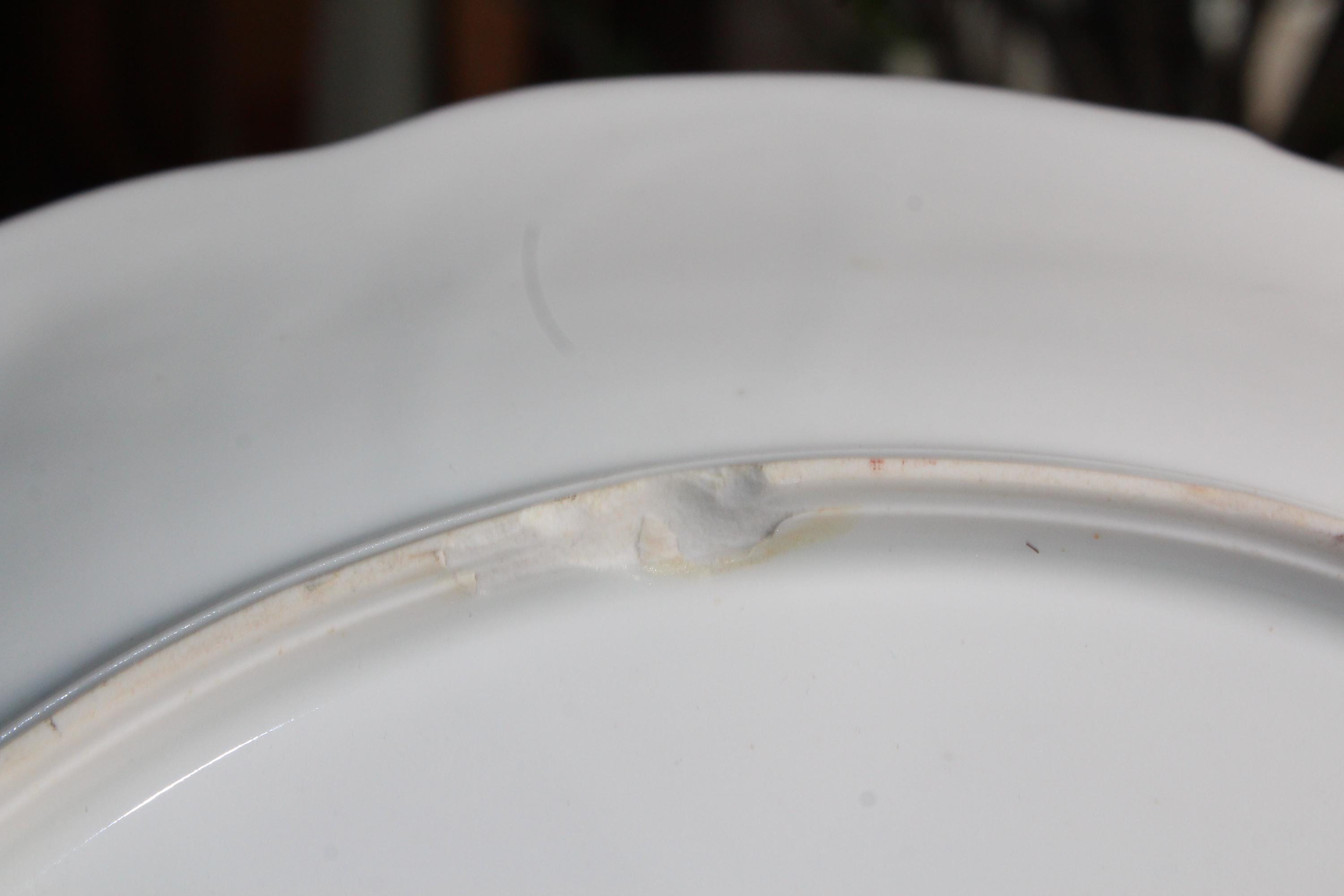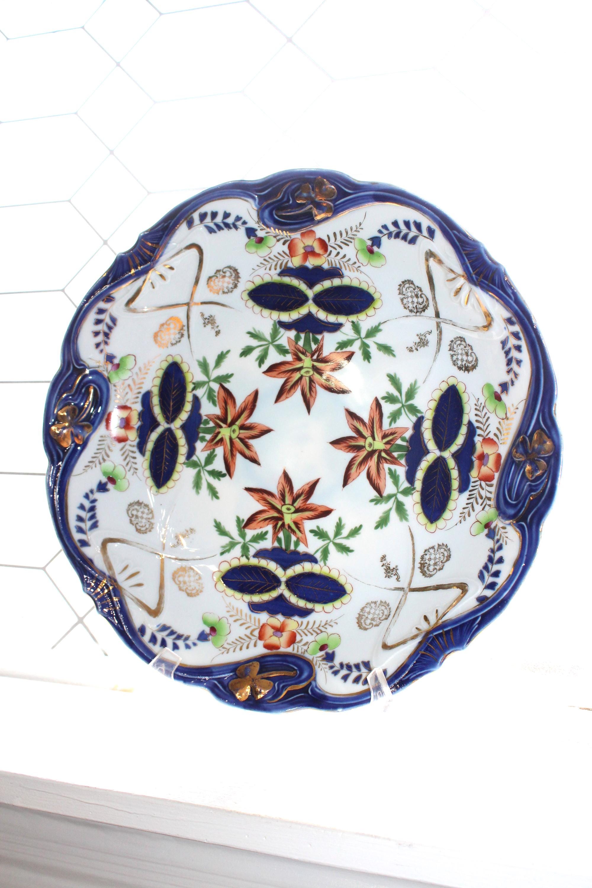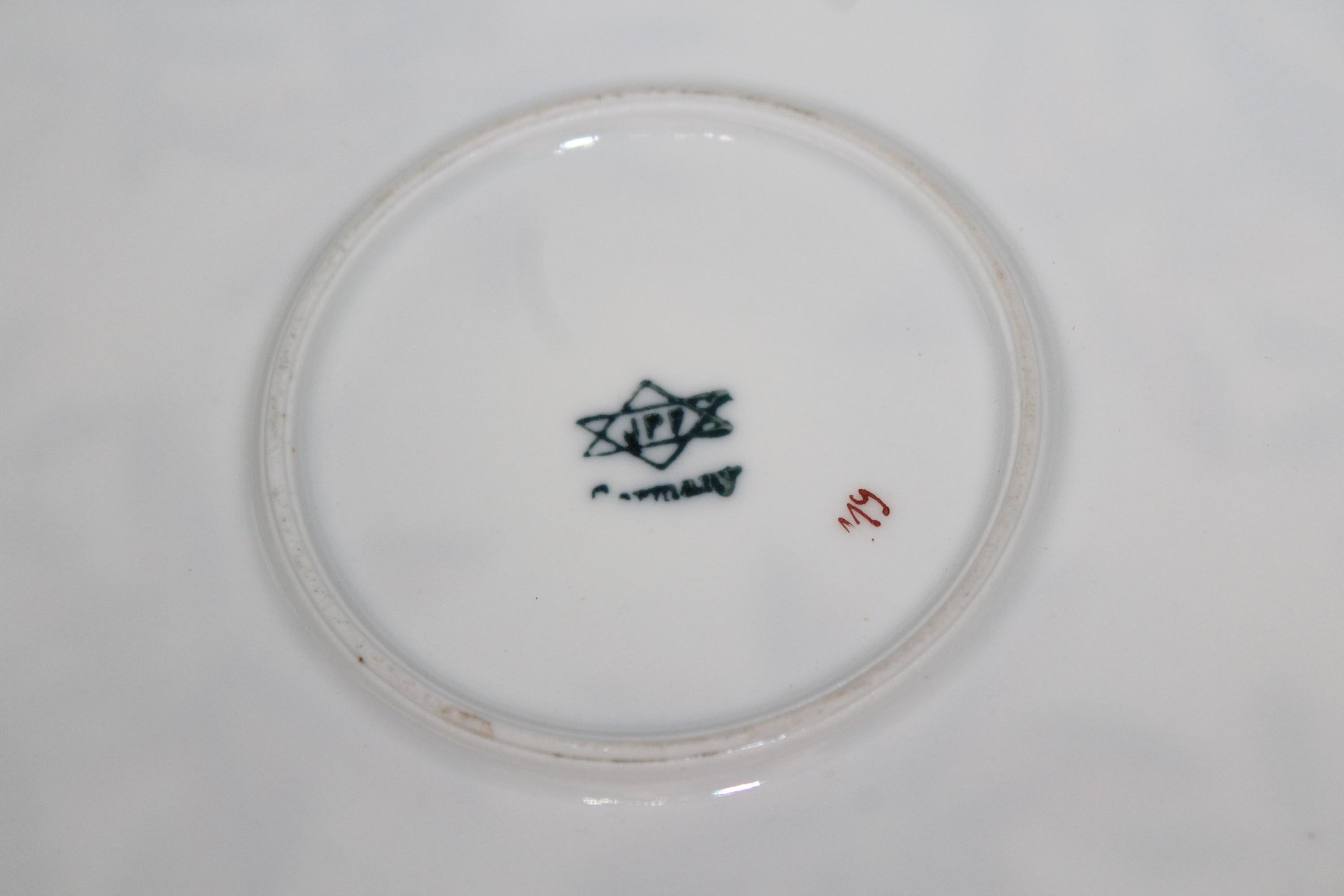 Gorgeous antique JPF (Ilmenau Porcelain Factory) Germany porcelain dish / charger plate. It measures 13 1/4" wide. There are 2 chips to the underside as shown in the photos, displays very well. Enjoy!