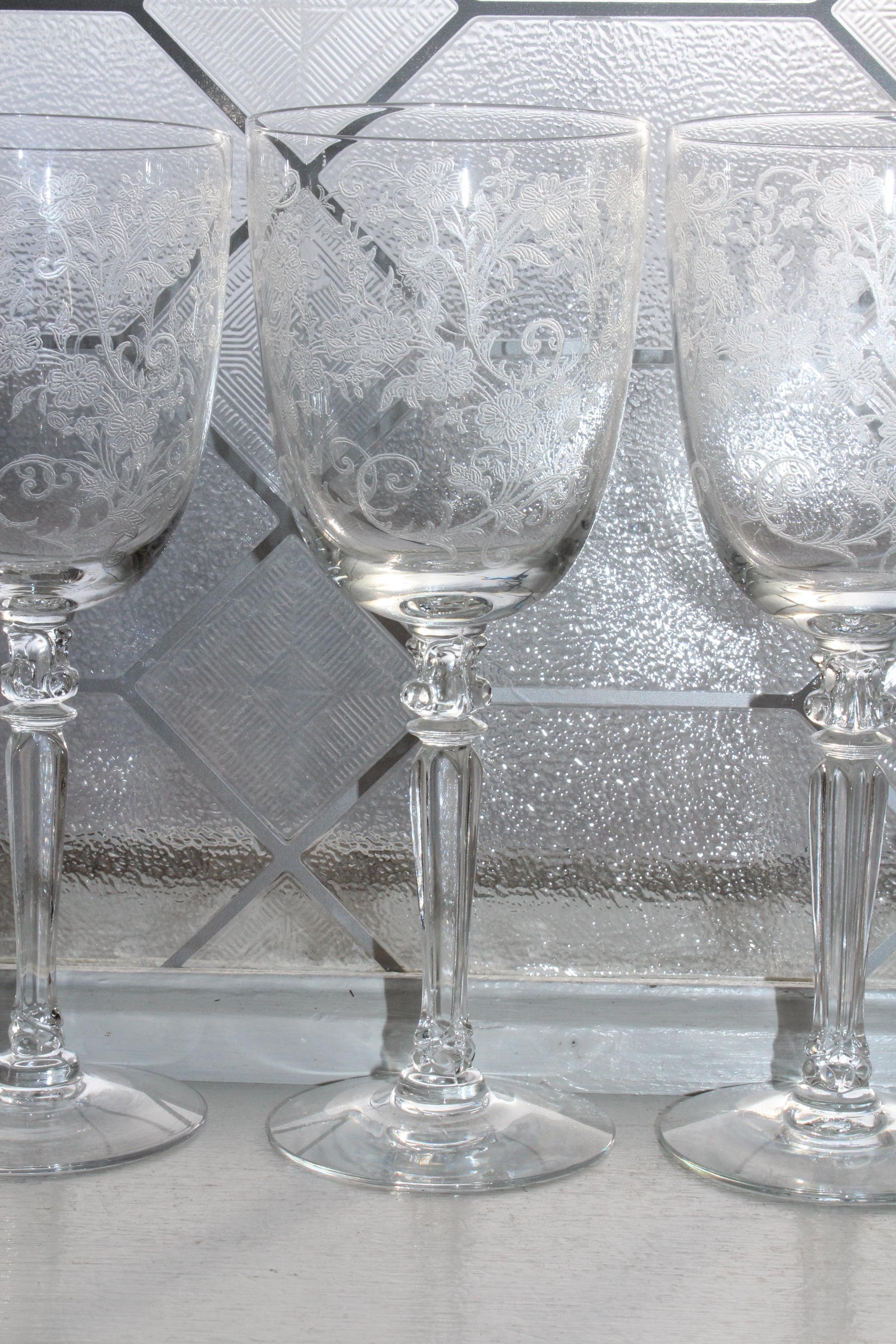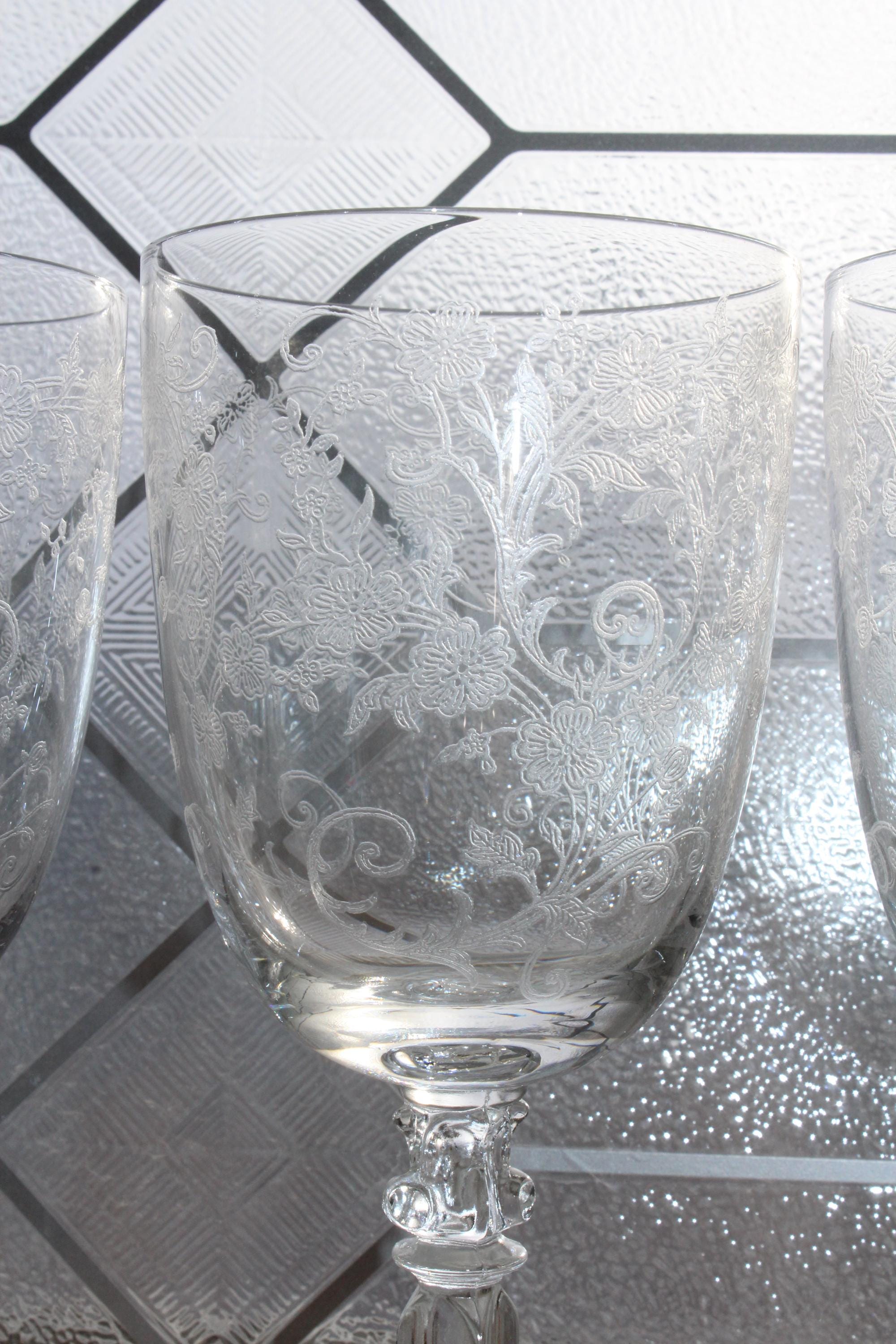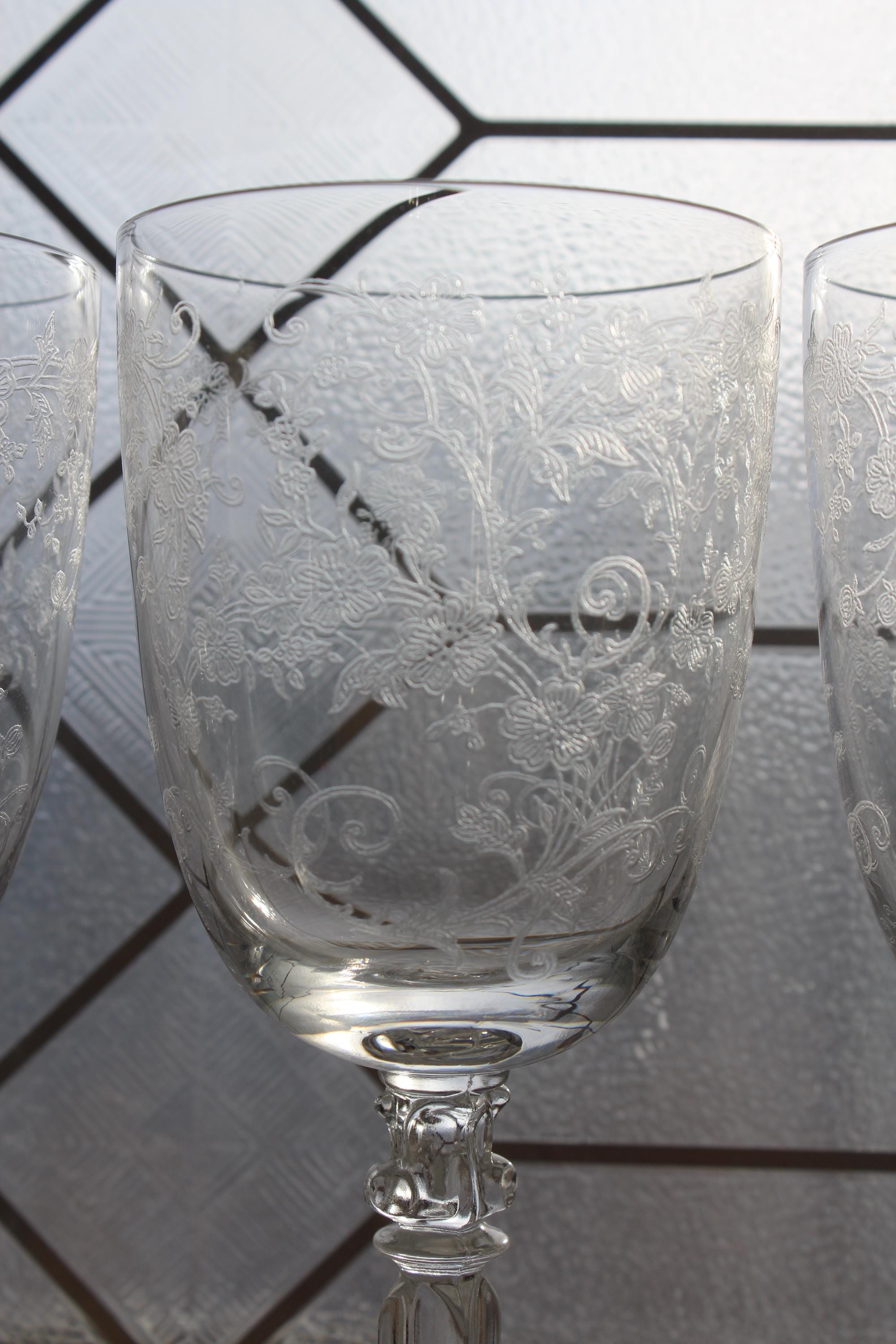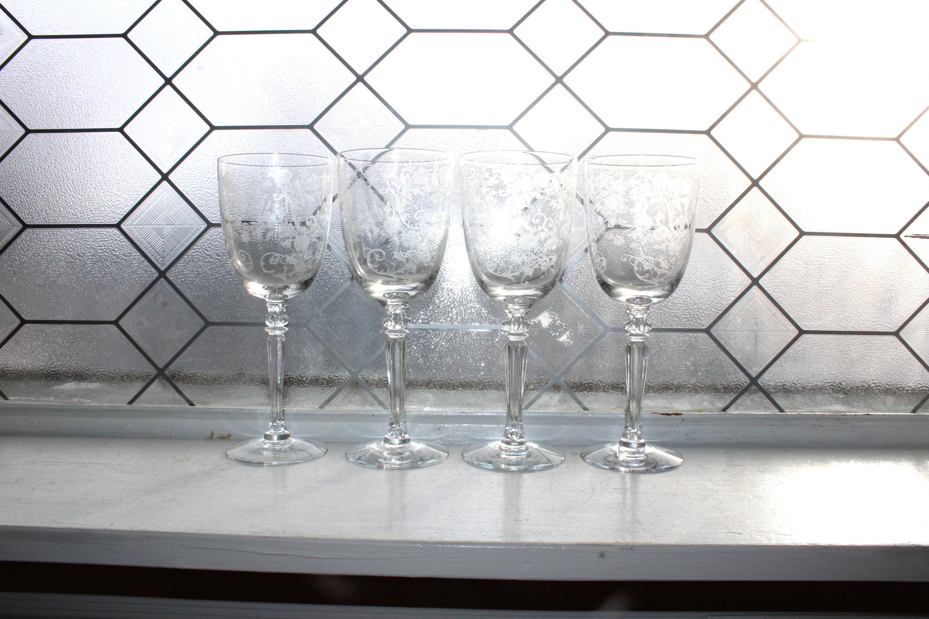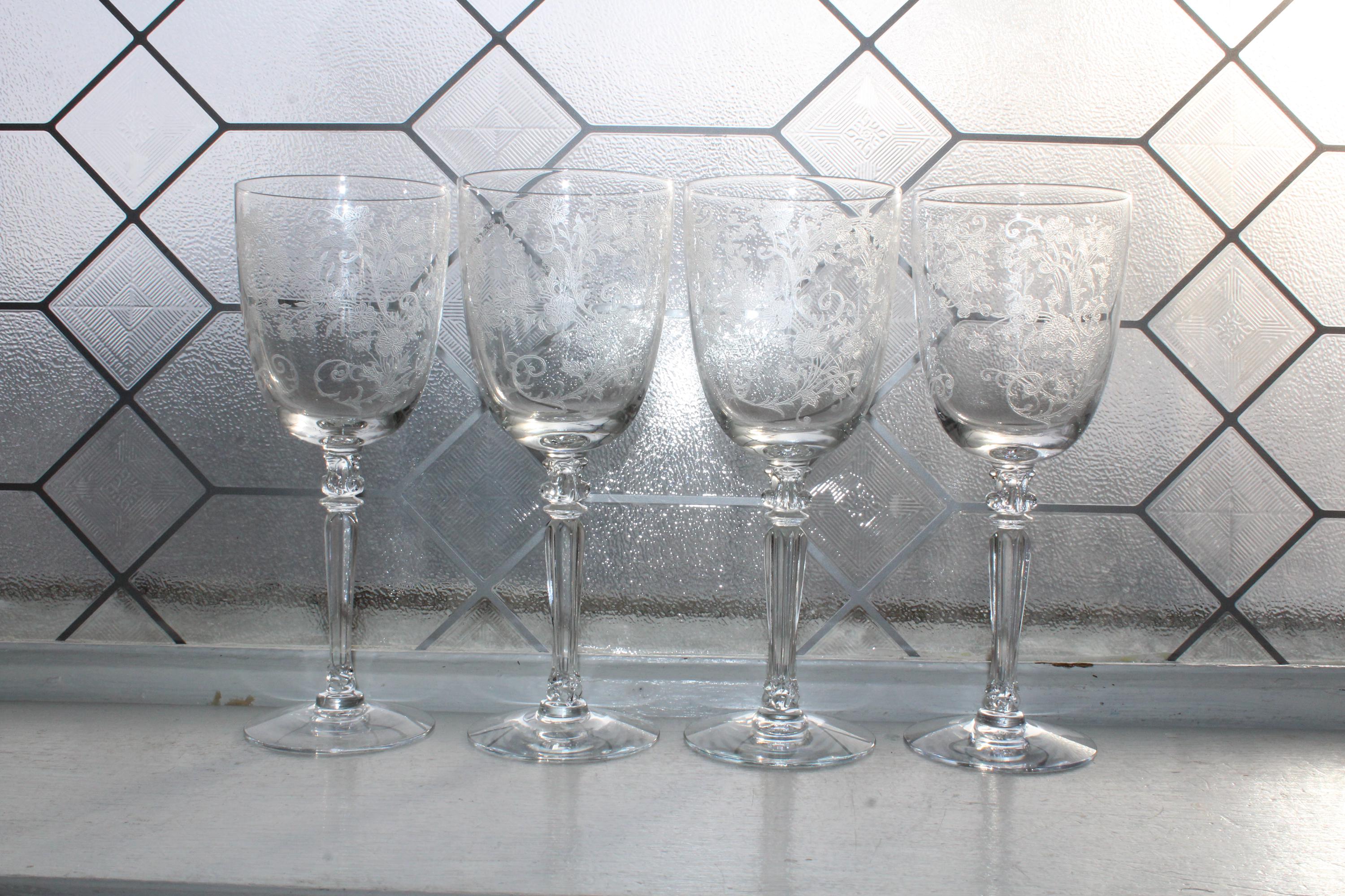 4 vintage 1940s Fostoria glass Buttercup wine or water glasses, in excellent condition. They measure 7 7/8" high. No wear, chips or cracks, perfect for use or display. THERE ARE 2 SETS OF 4 AVAILABLE VIA THE DROP DOWN BOX. Enjoy!