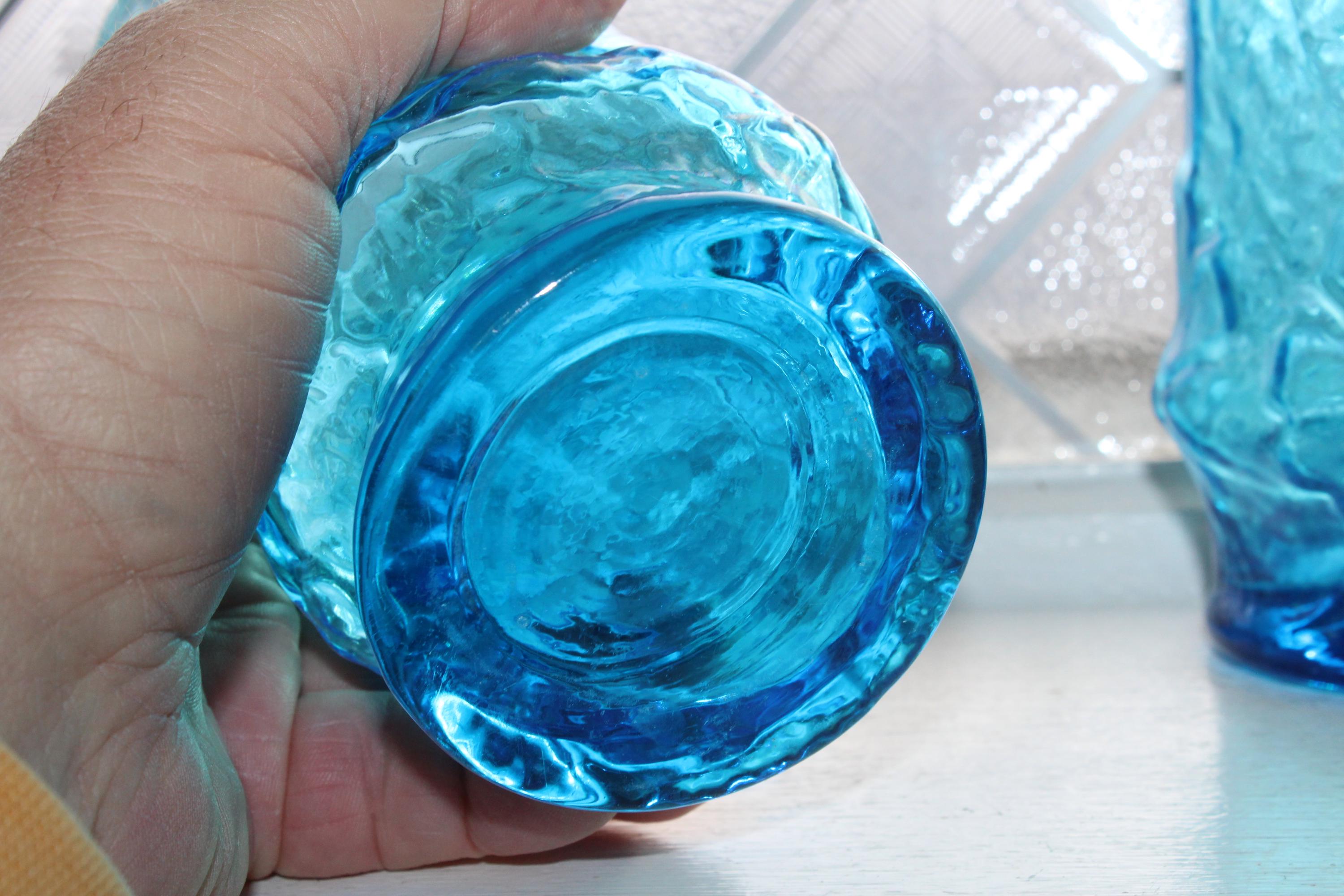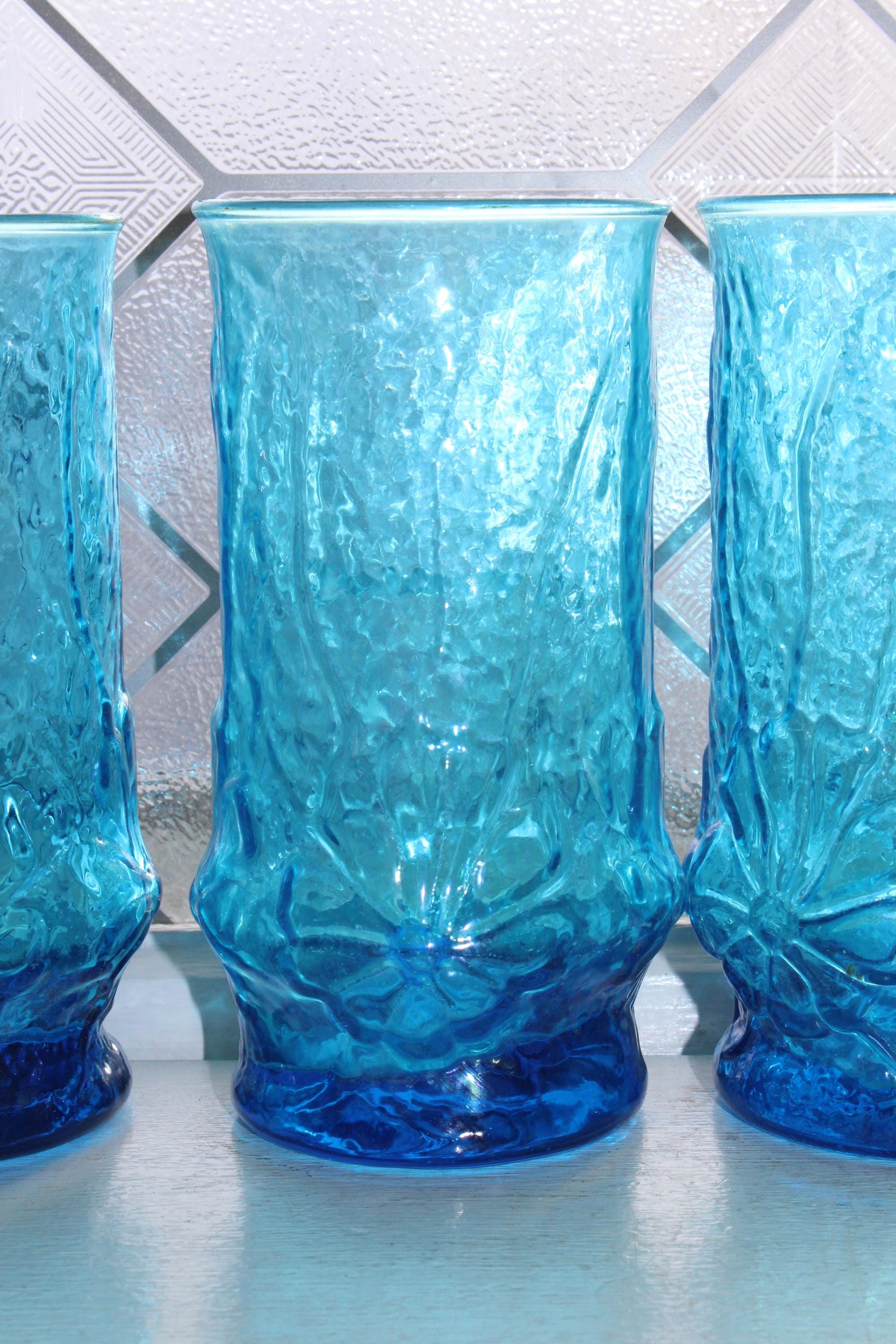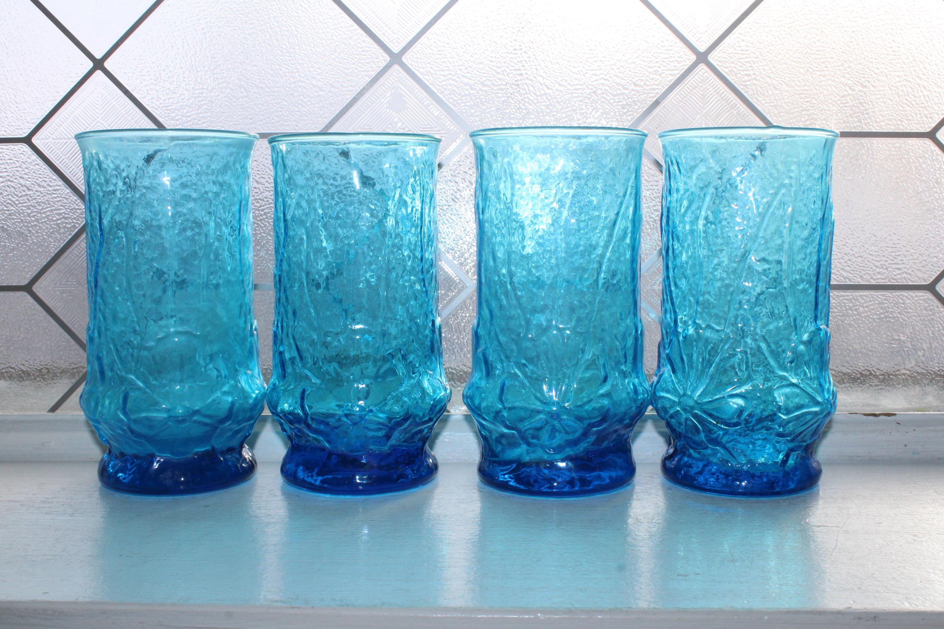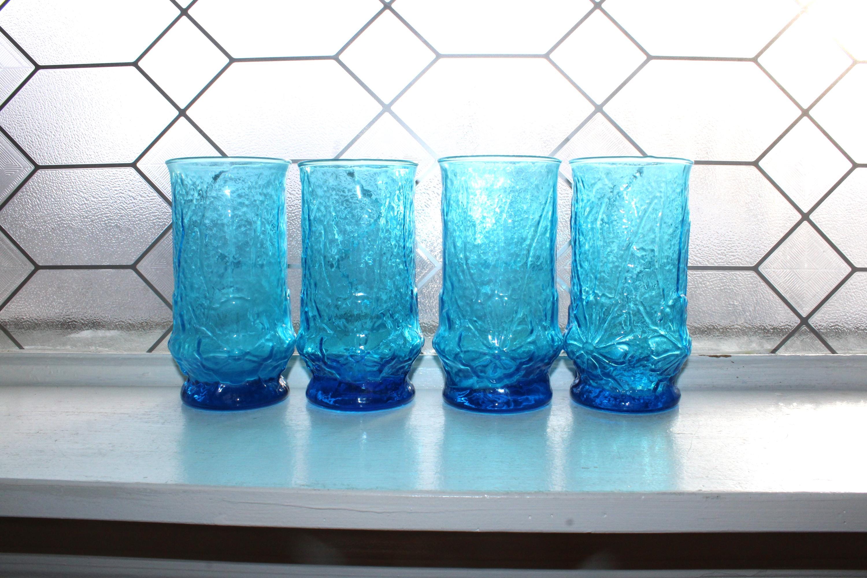 4 vintage laser blue/colonial blue glass iced tea or water tumblers with embossed flower Rainflower pattern by Anchor Hocking, in excellent condition. The glasses measure 6" high and have no chips or cracks, perfect for use or display. Enjoy!