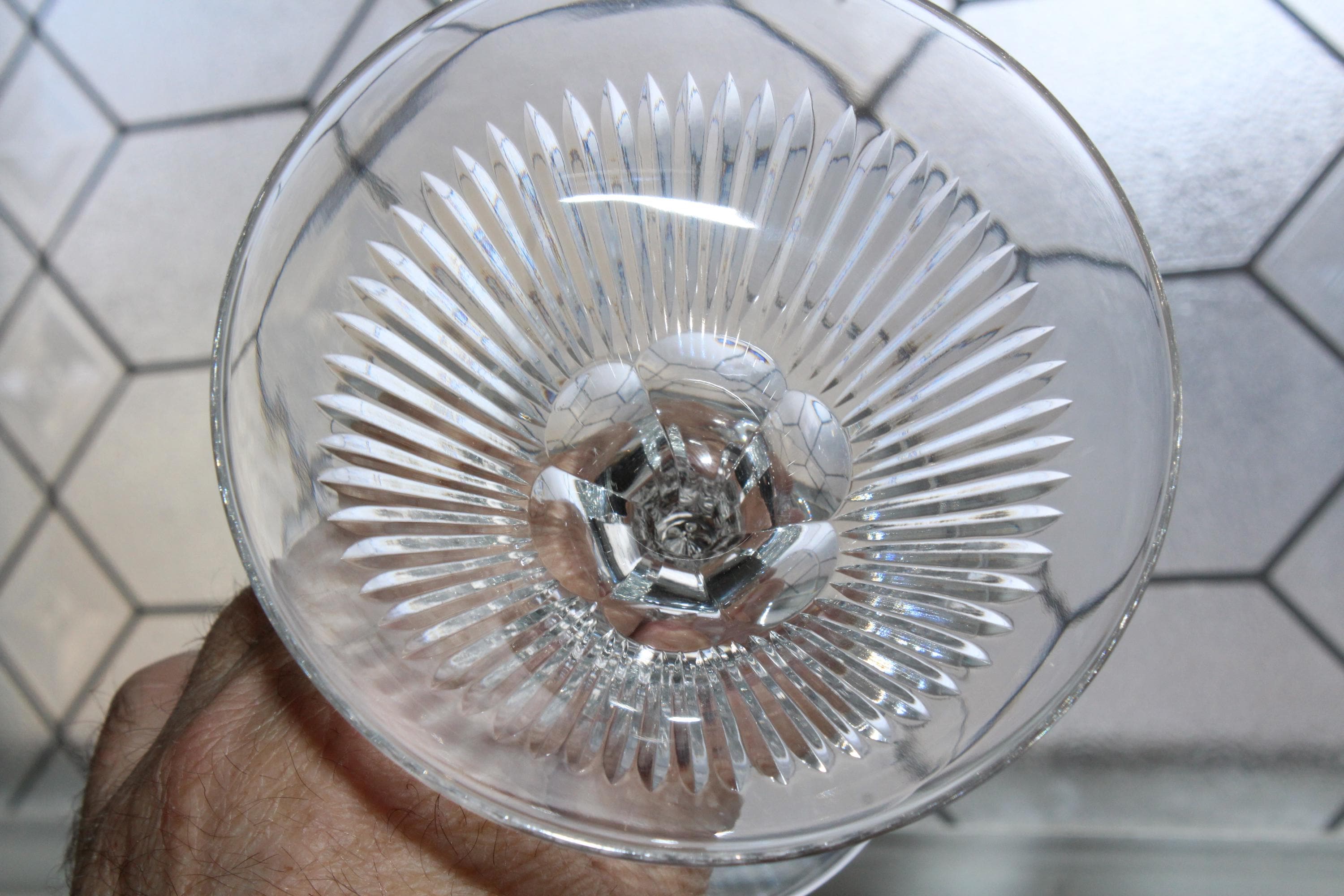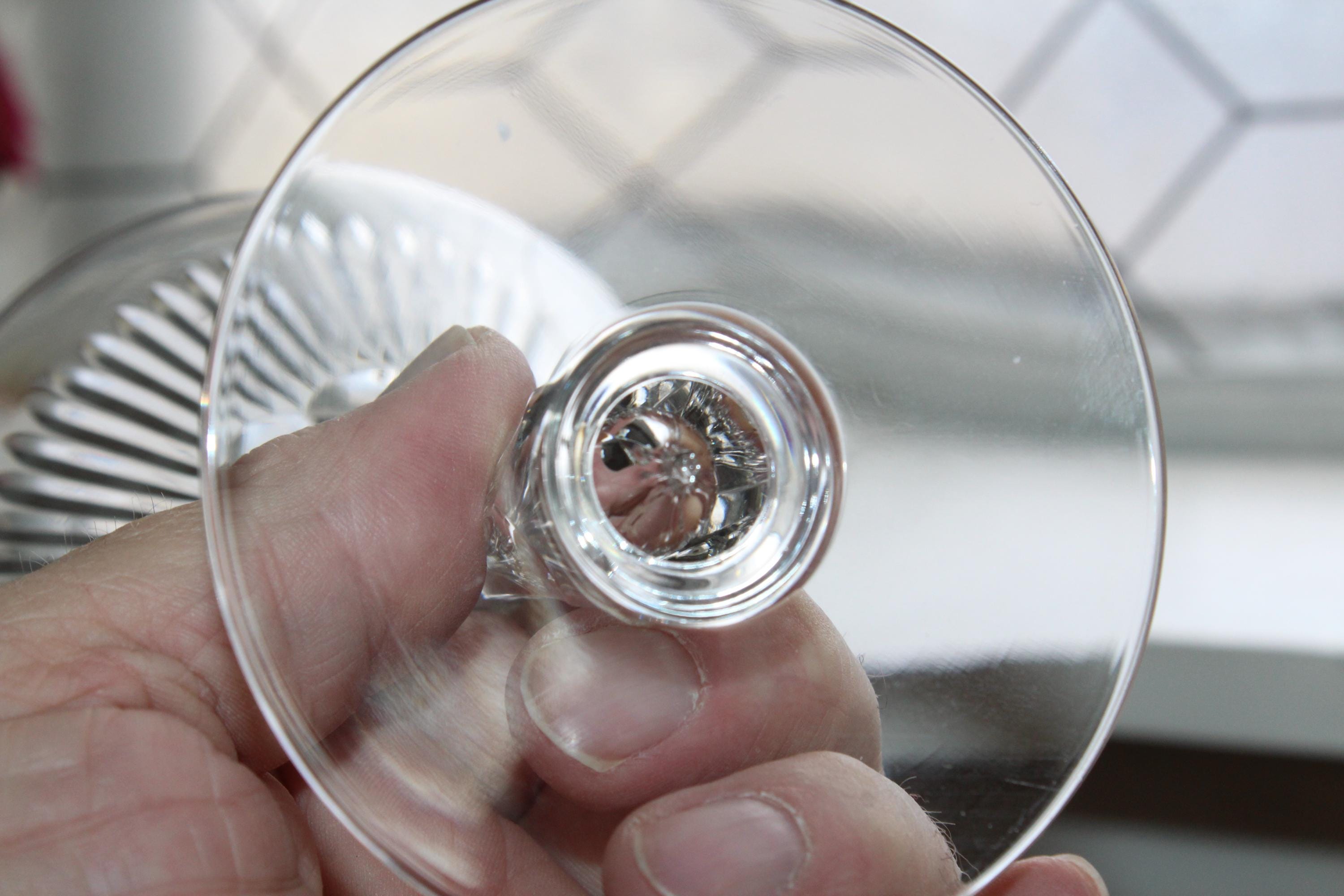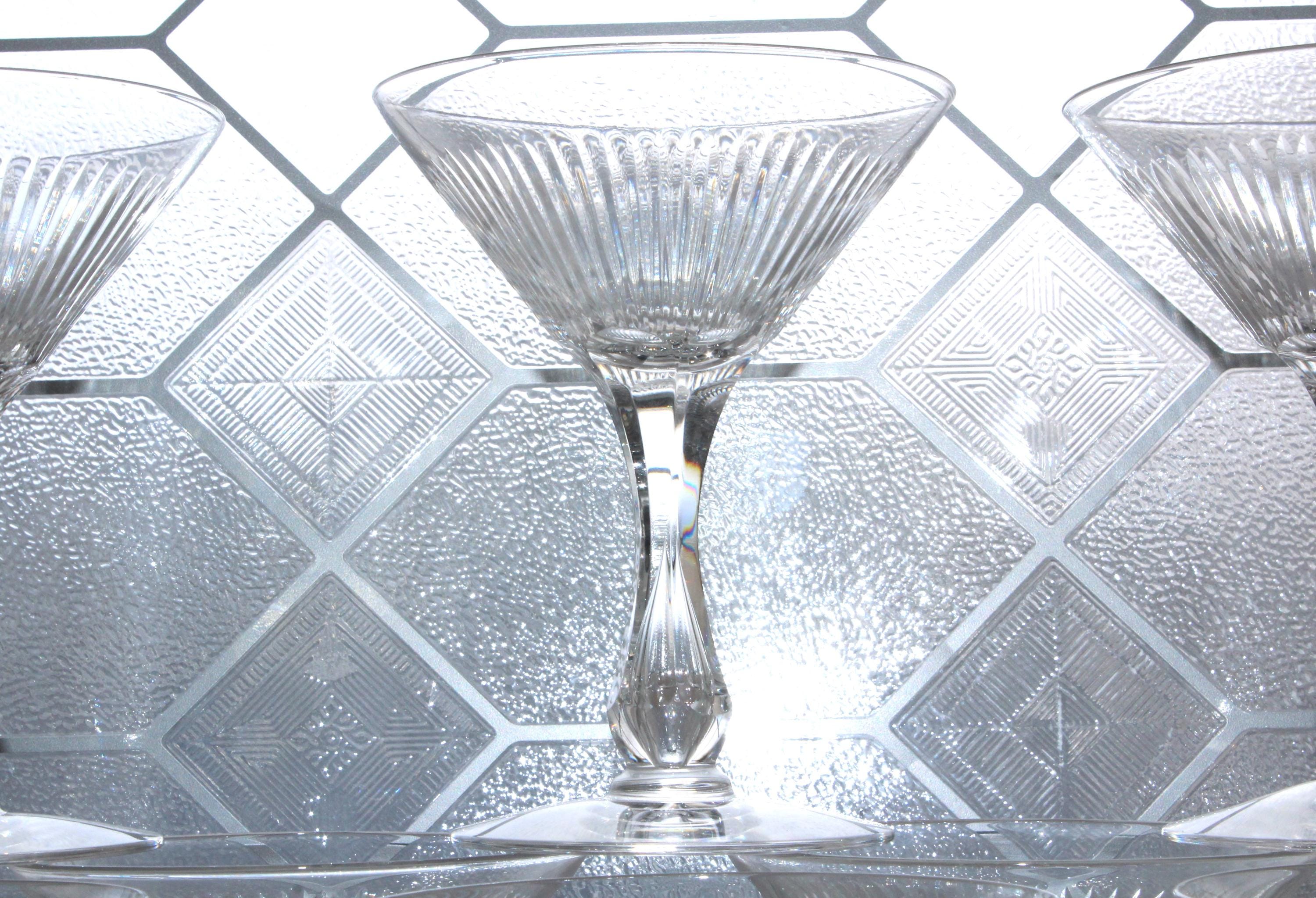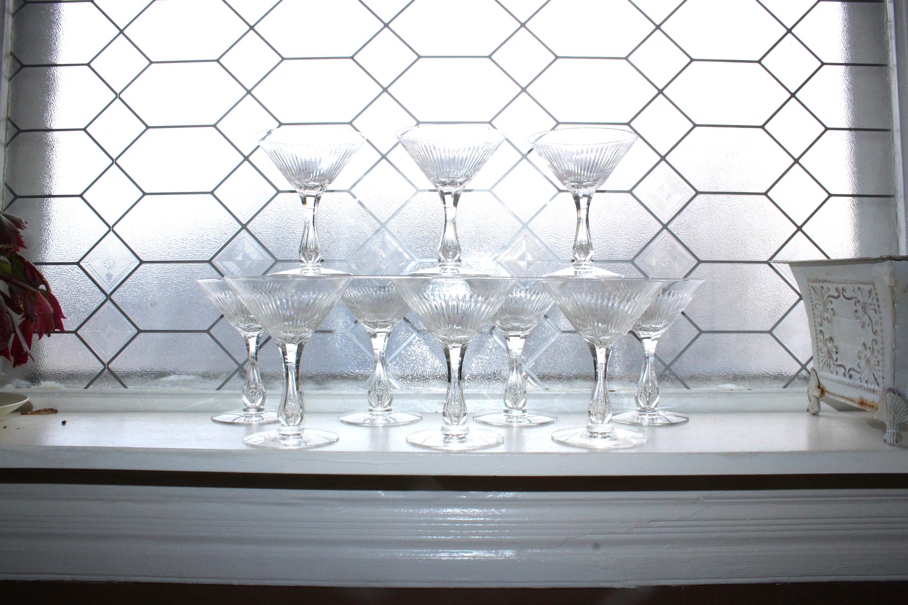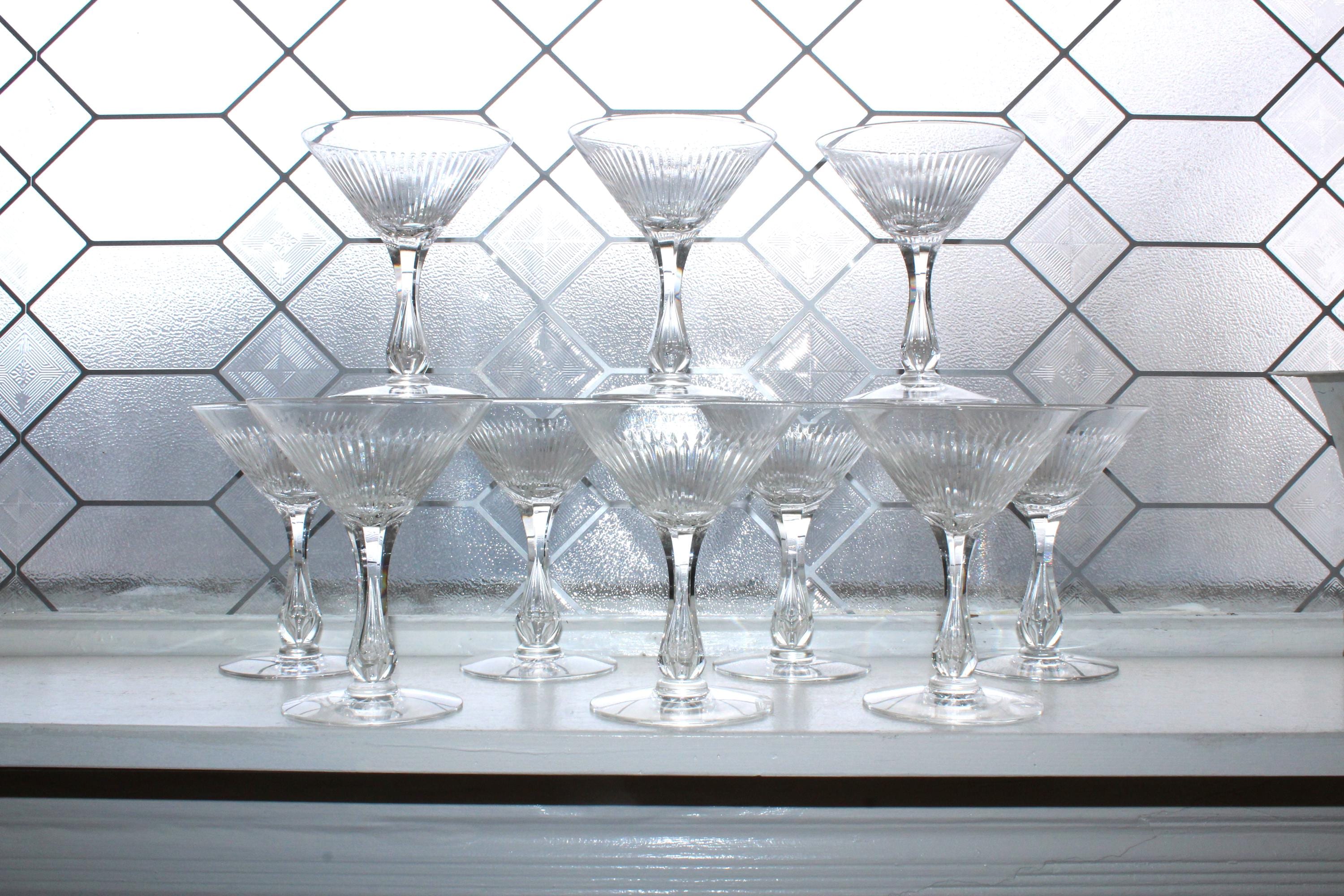 10 vintage Art Deco Seneca 164-1 pattern cut rays crystal champagne glasses with bubble stem/encased teardrop, in excellent condition. These also make fabulous cocktail glasses. Each one measures 5 3/8" high. No chips or cracks, perfect for use or display. Enjoy!