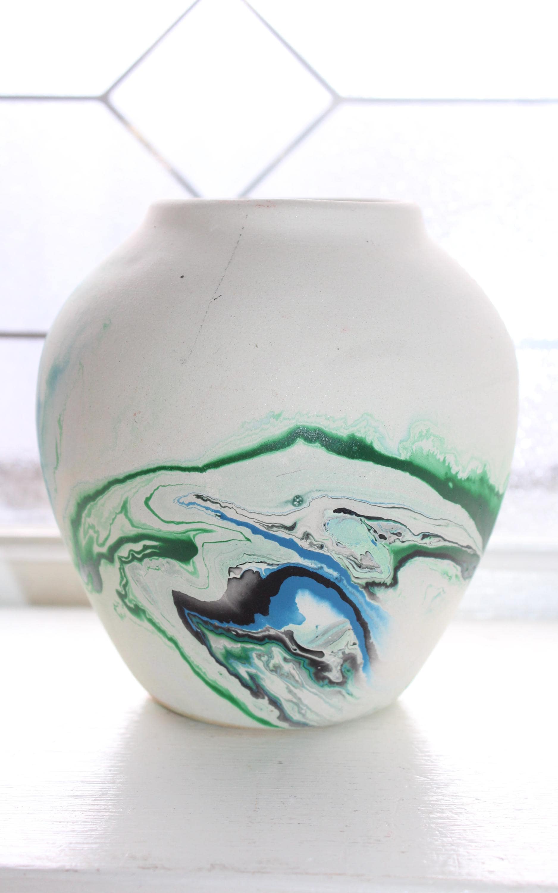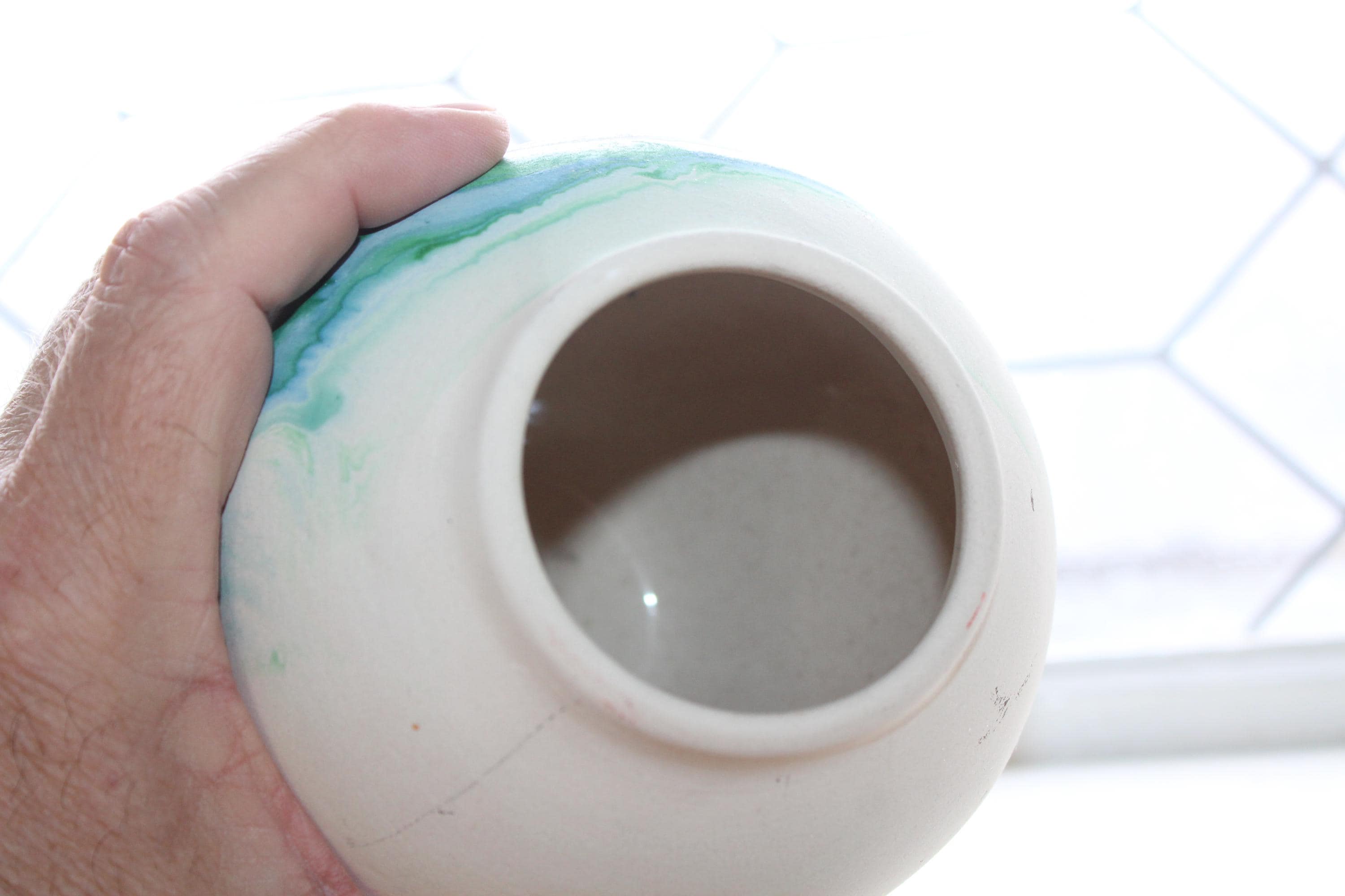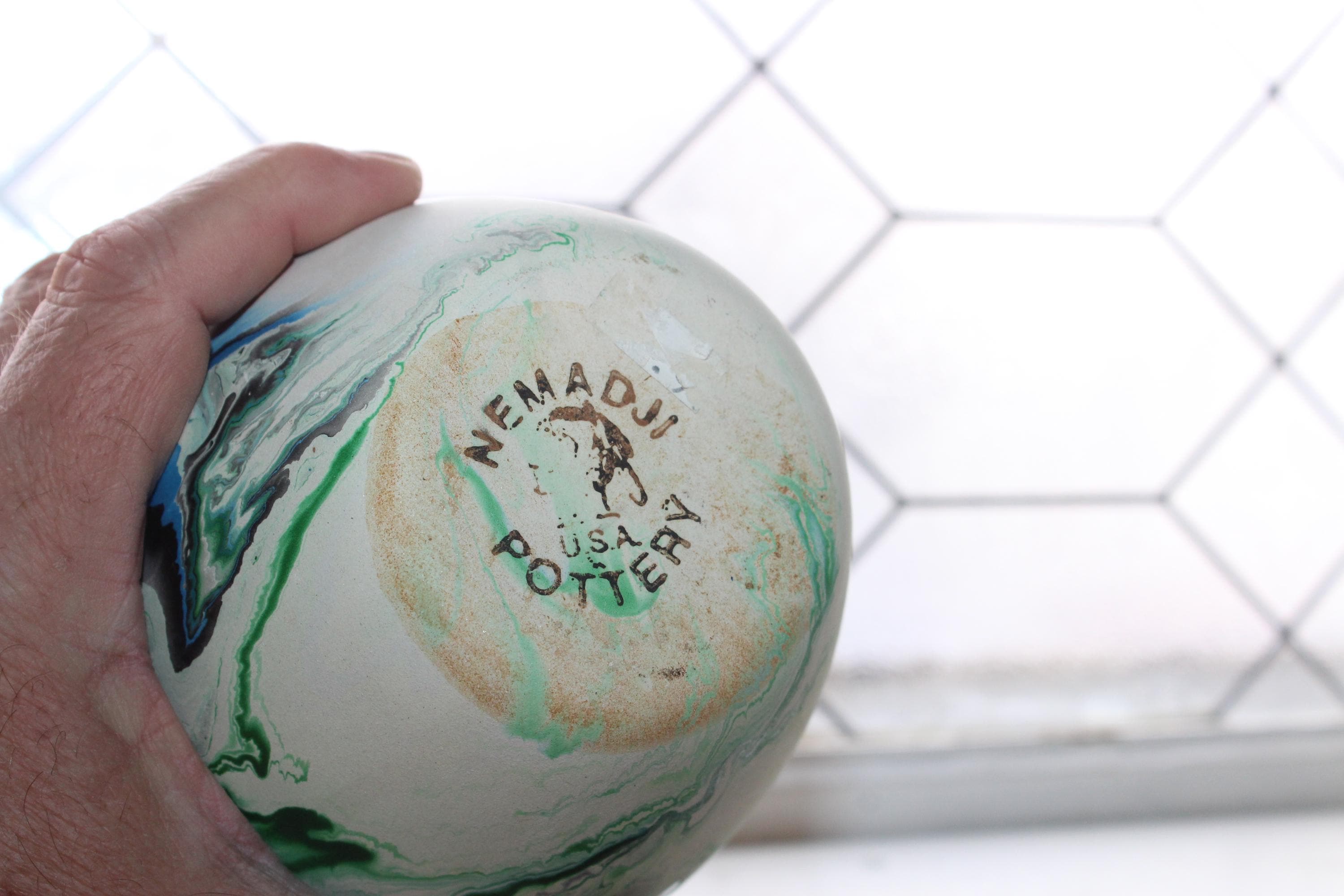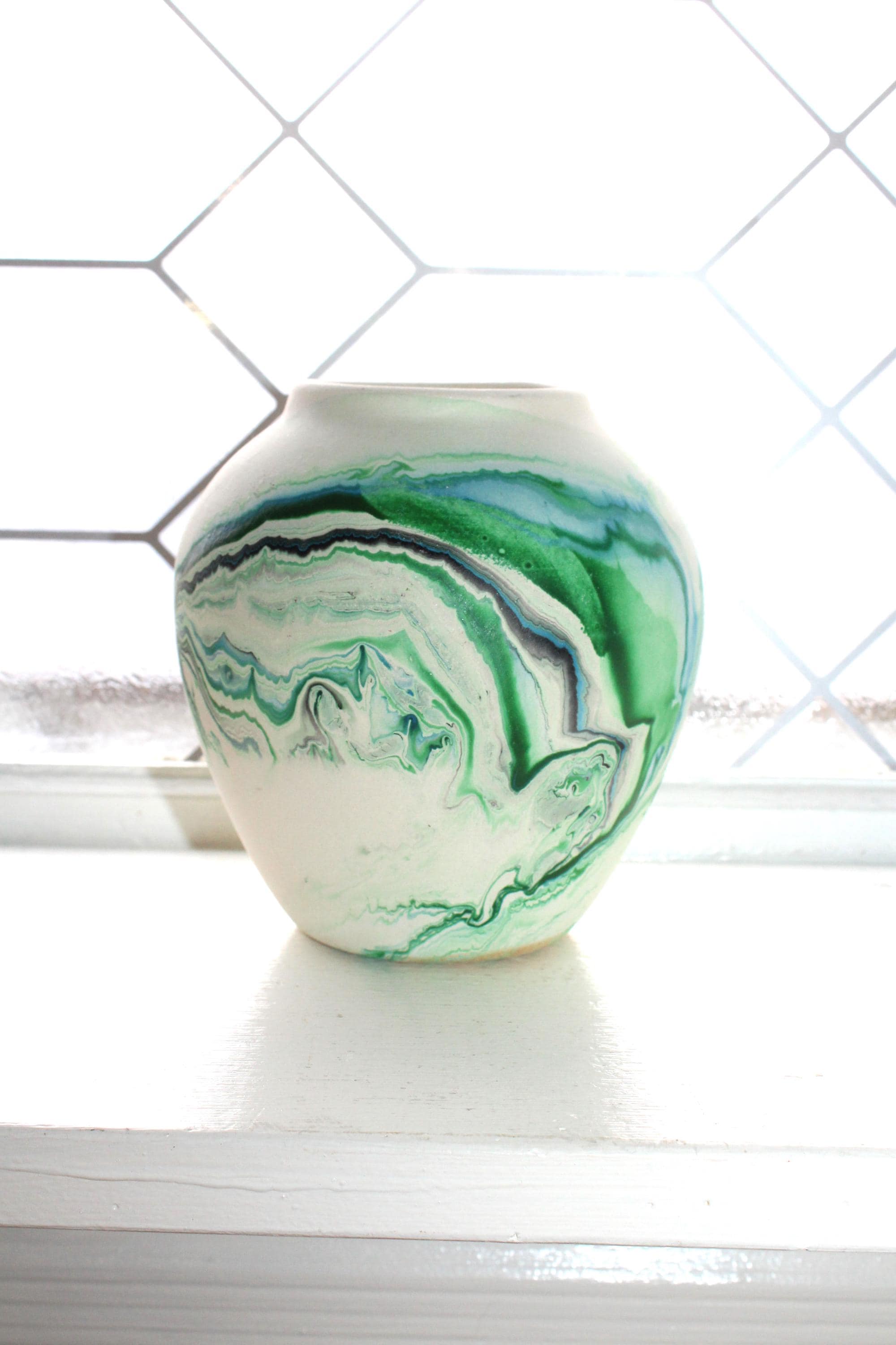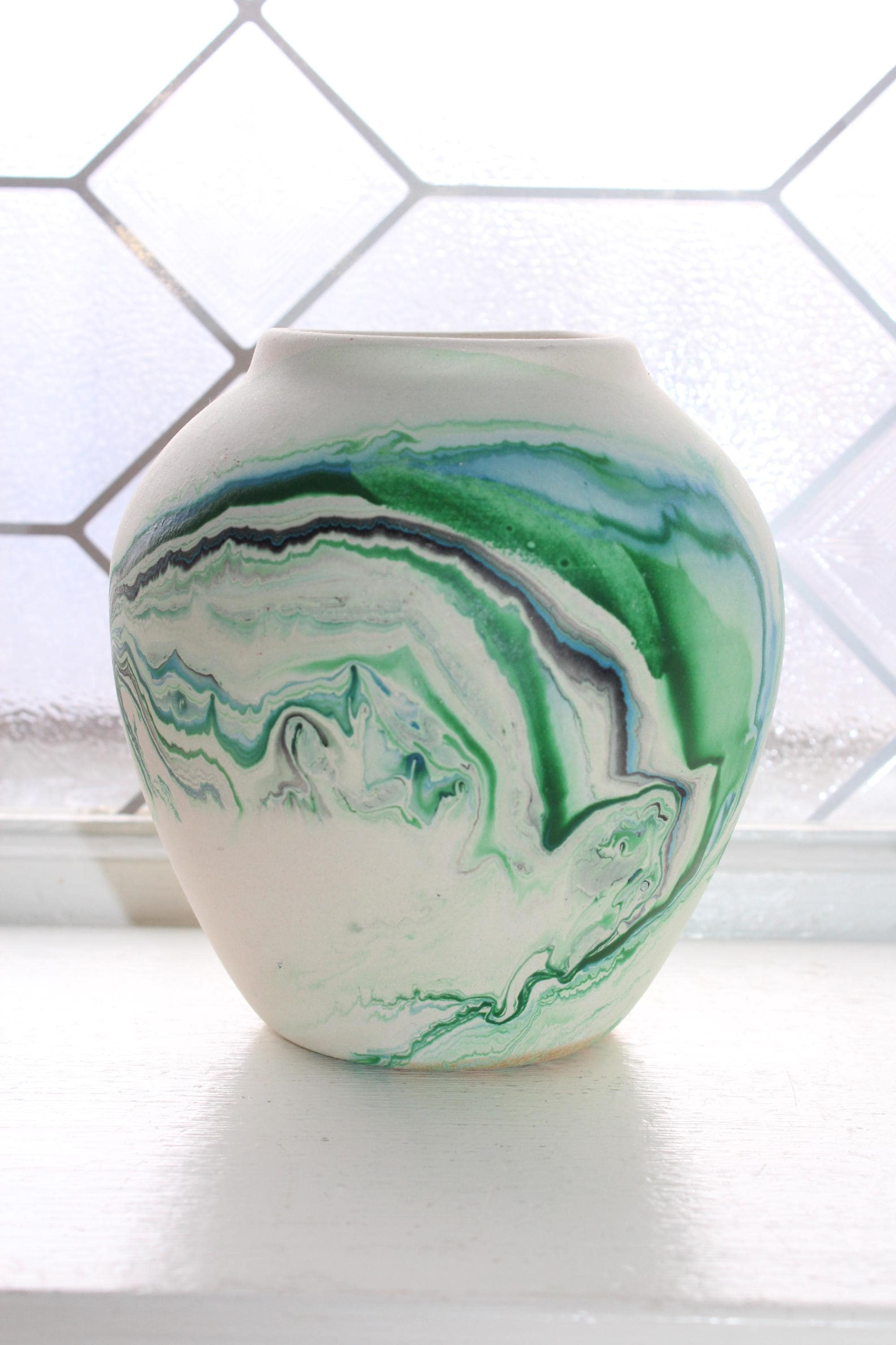 This is a gorgeous Nemadji Pottery vase with green and blue swirl decoration, in good condition with no chips or cracks. It measures 5" high and the opening is 2 1/2" wide. It's great for use or display. Enjoy!
