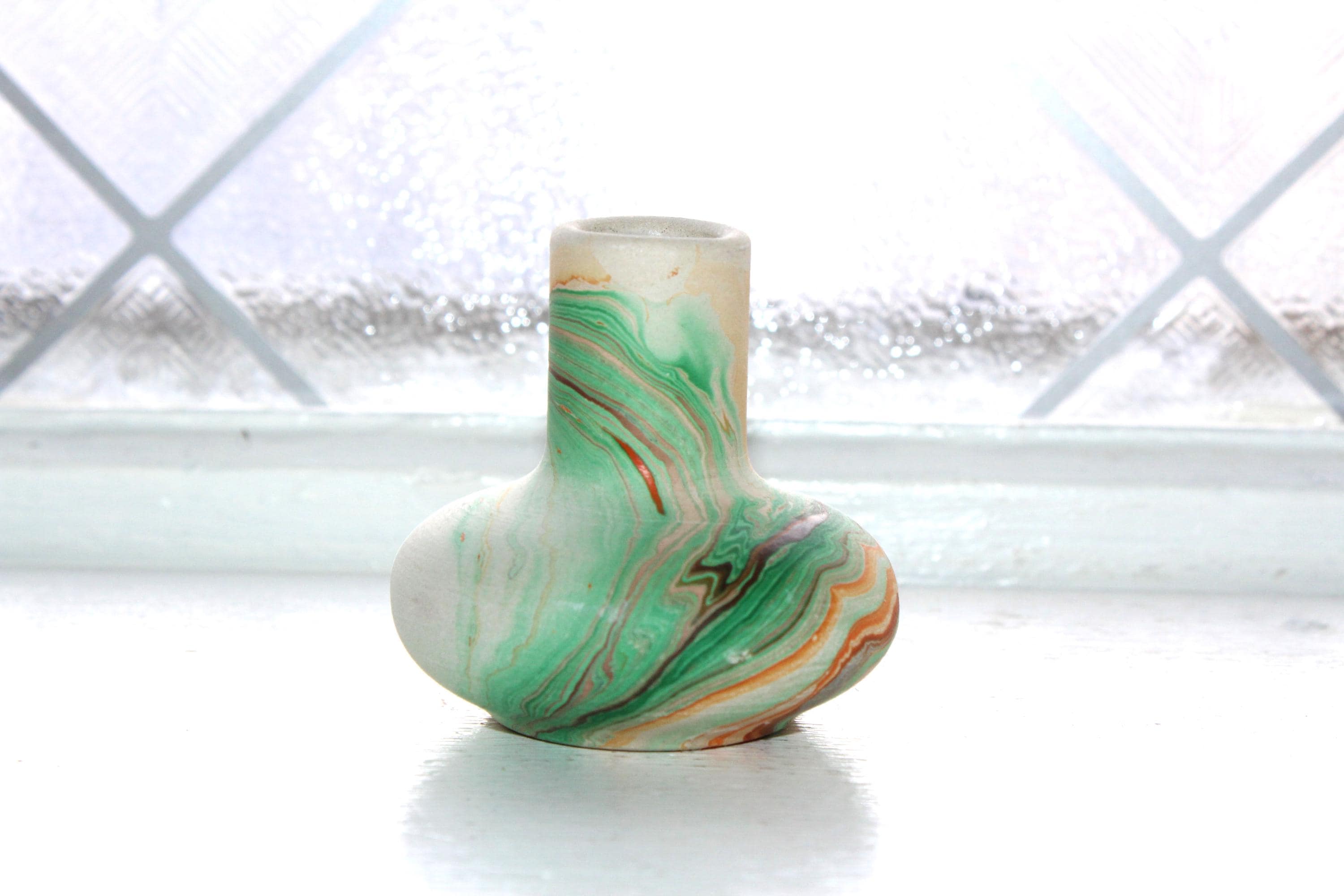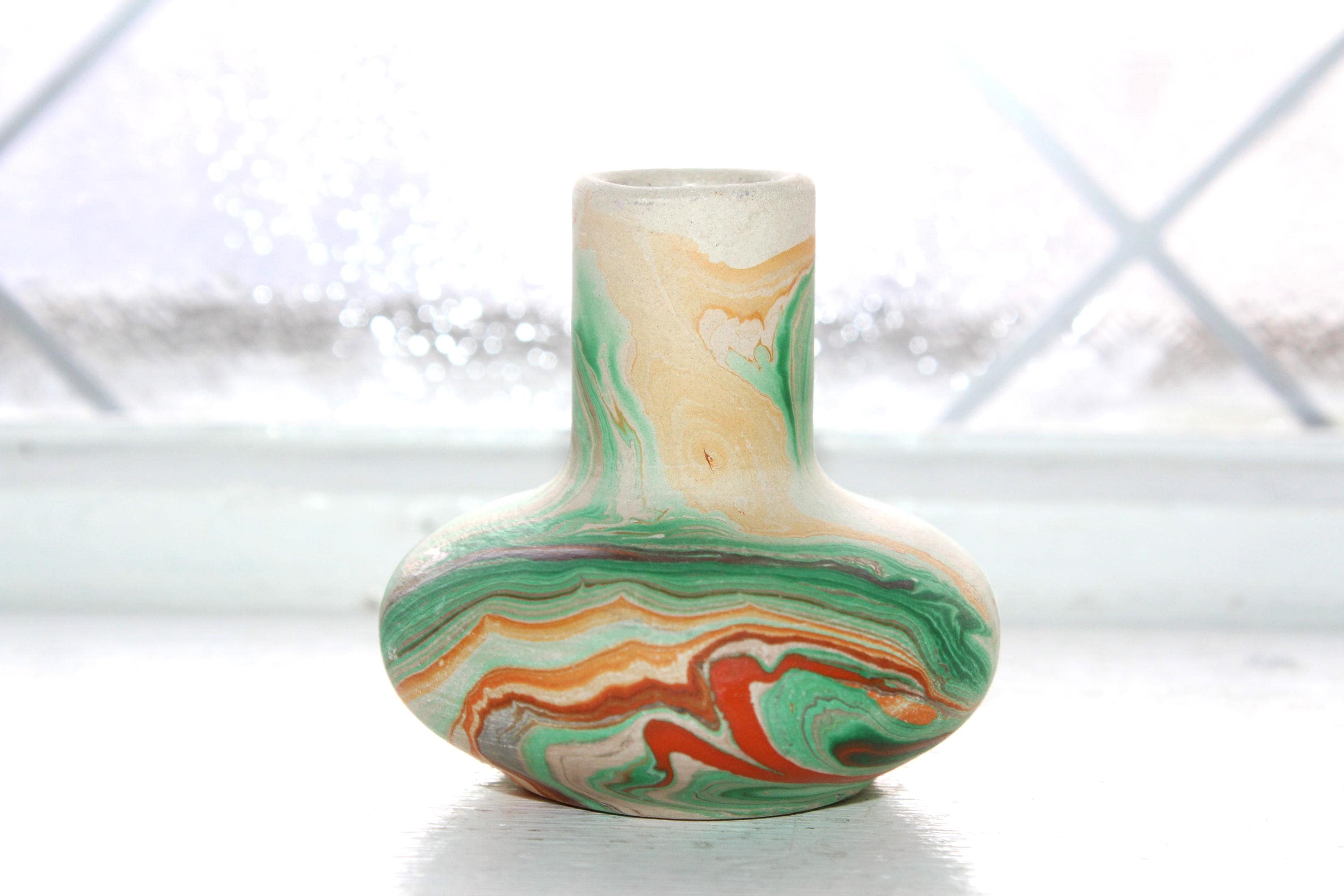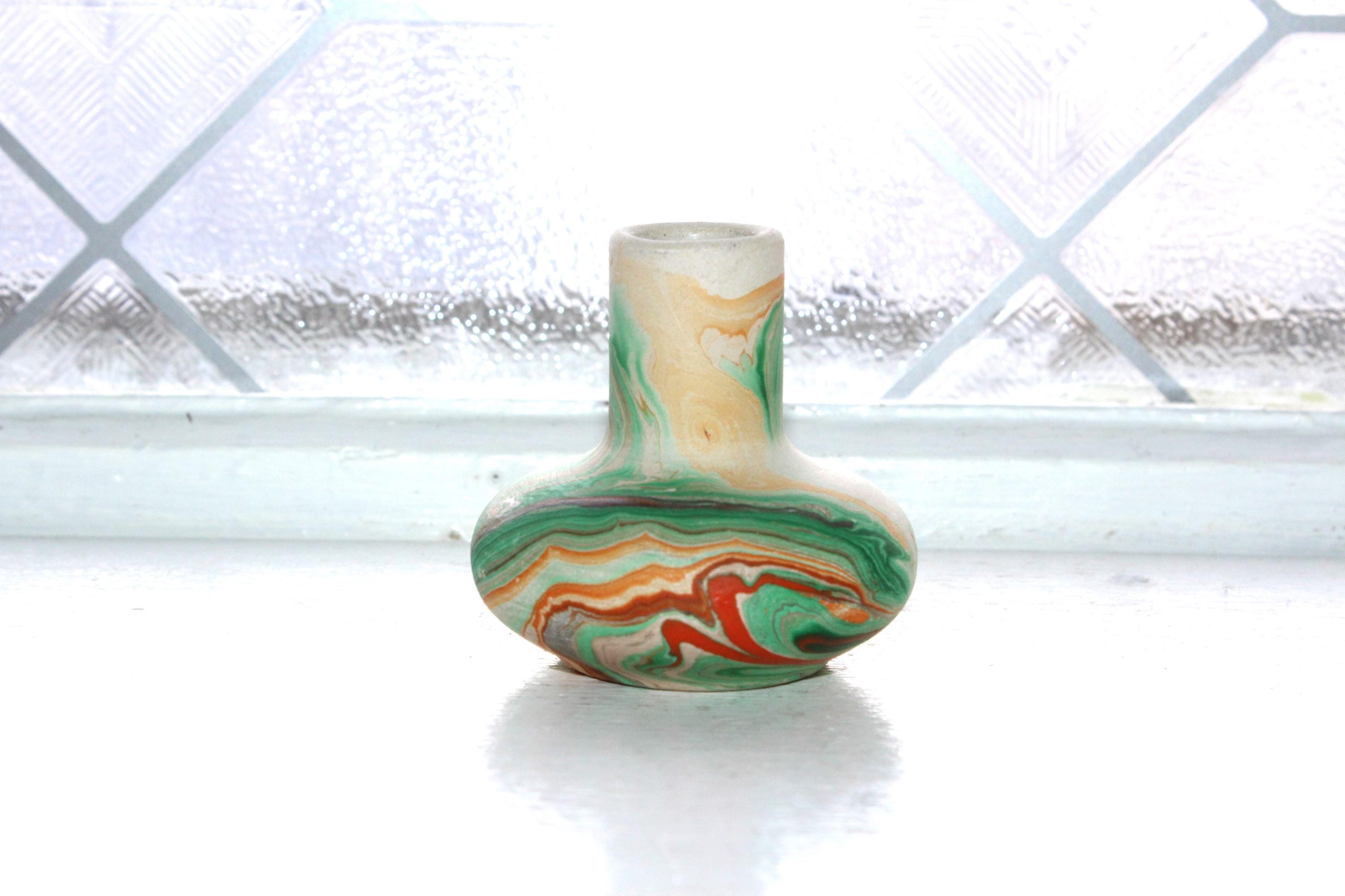 Vintage Nemadji Pottery miniature vase with green and orange swirls on a cream base, in excellent condition. This is a very hard to find small size. The vase measures just over 2" high. The bottom is marked Nemadji Pottery. No chips or cracks, perfect for use or display. Enjoy!