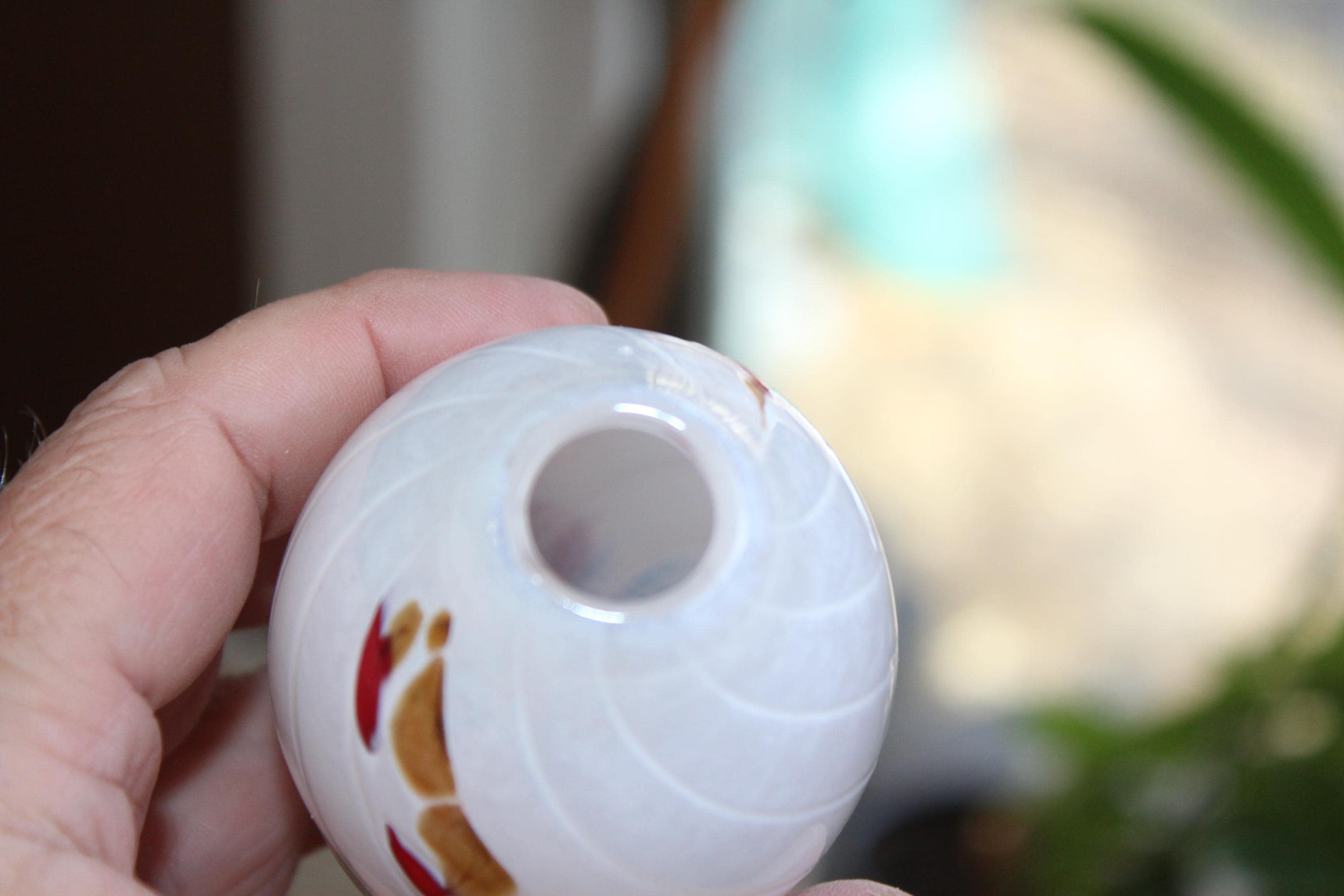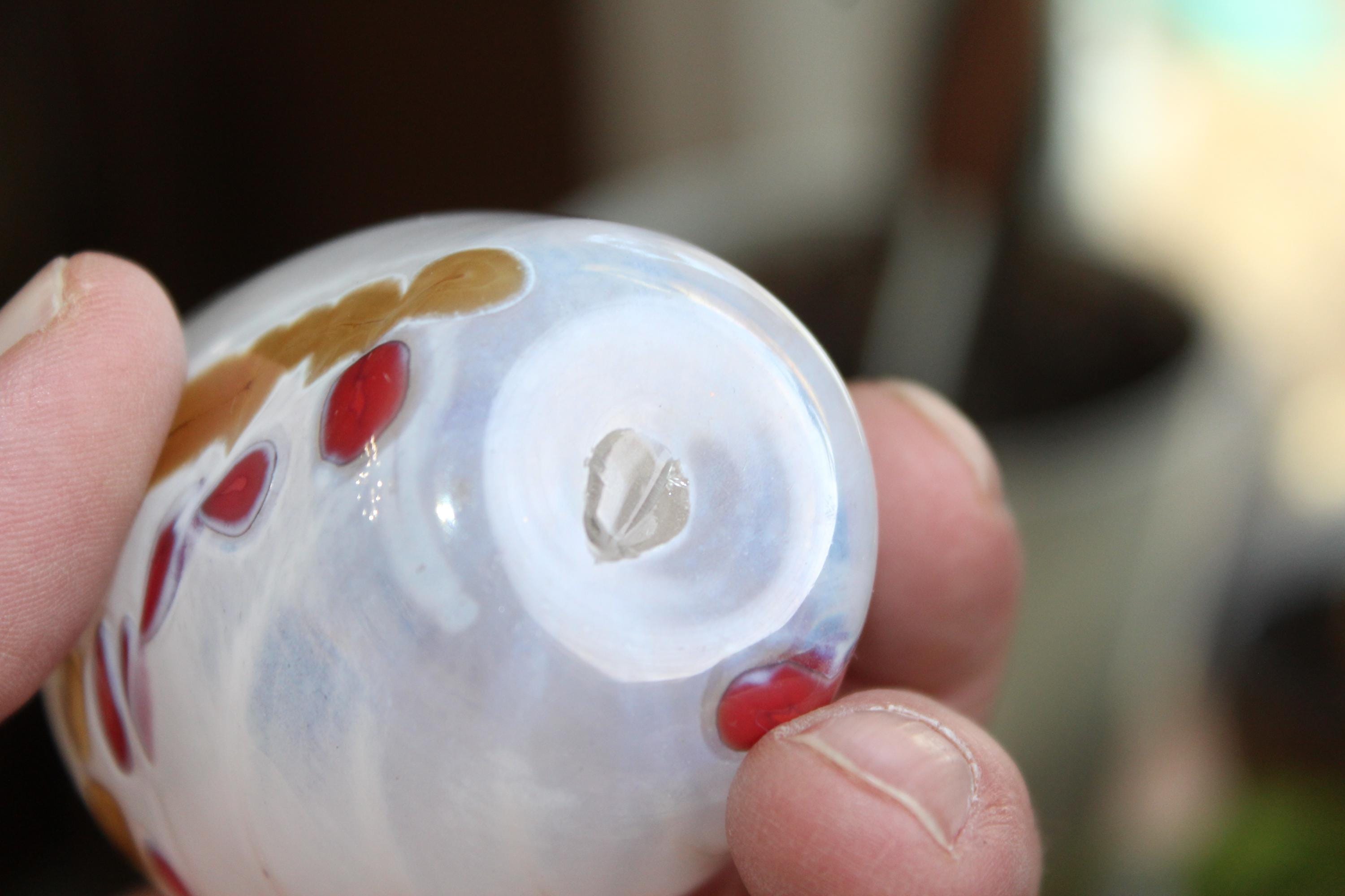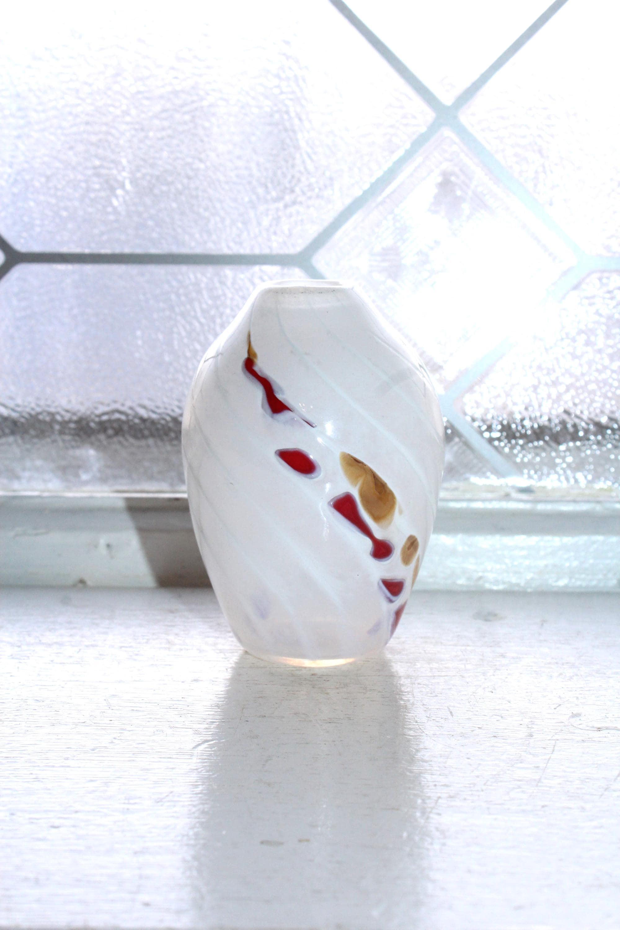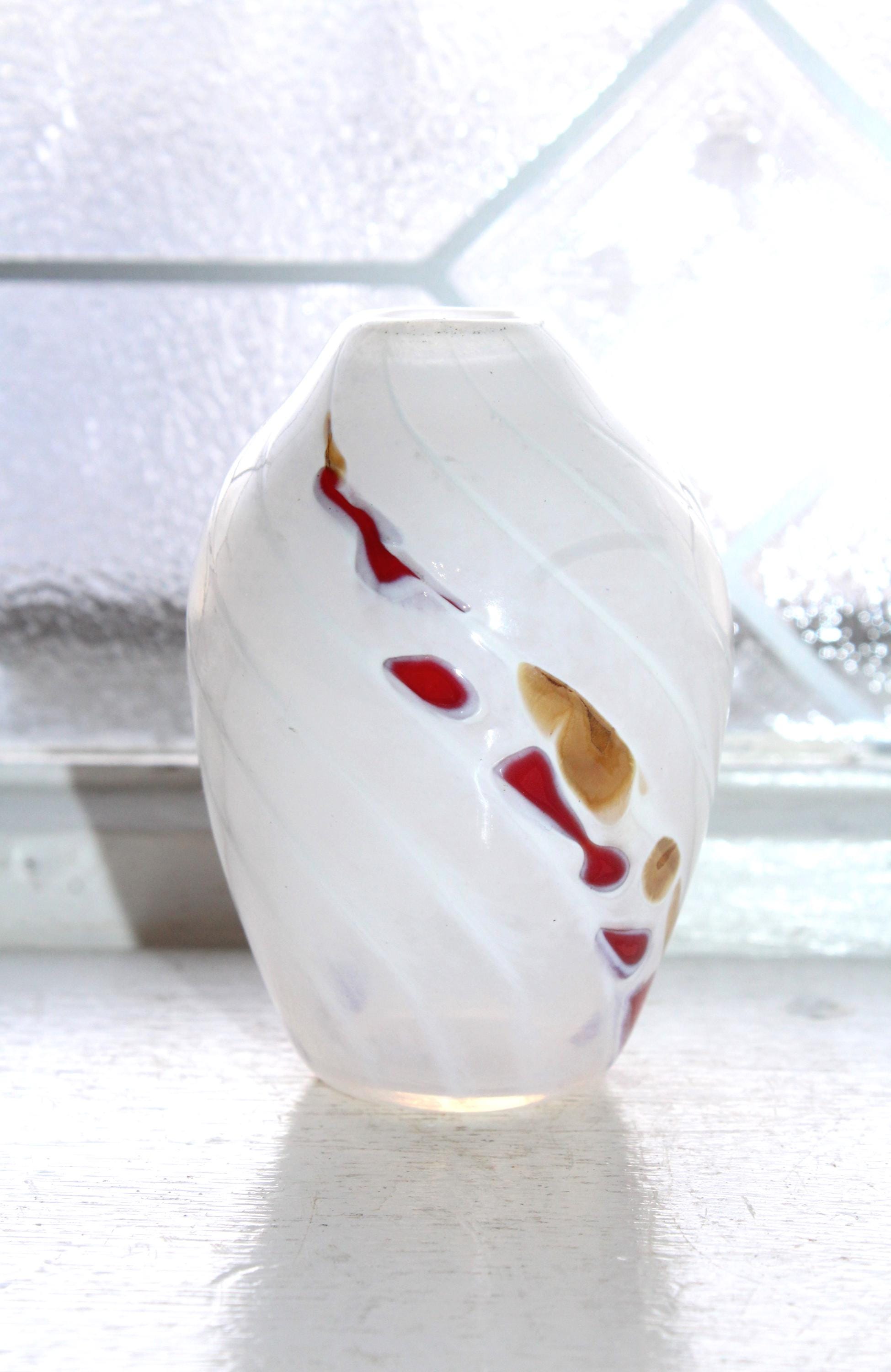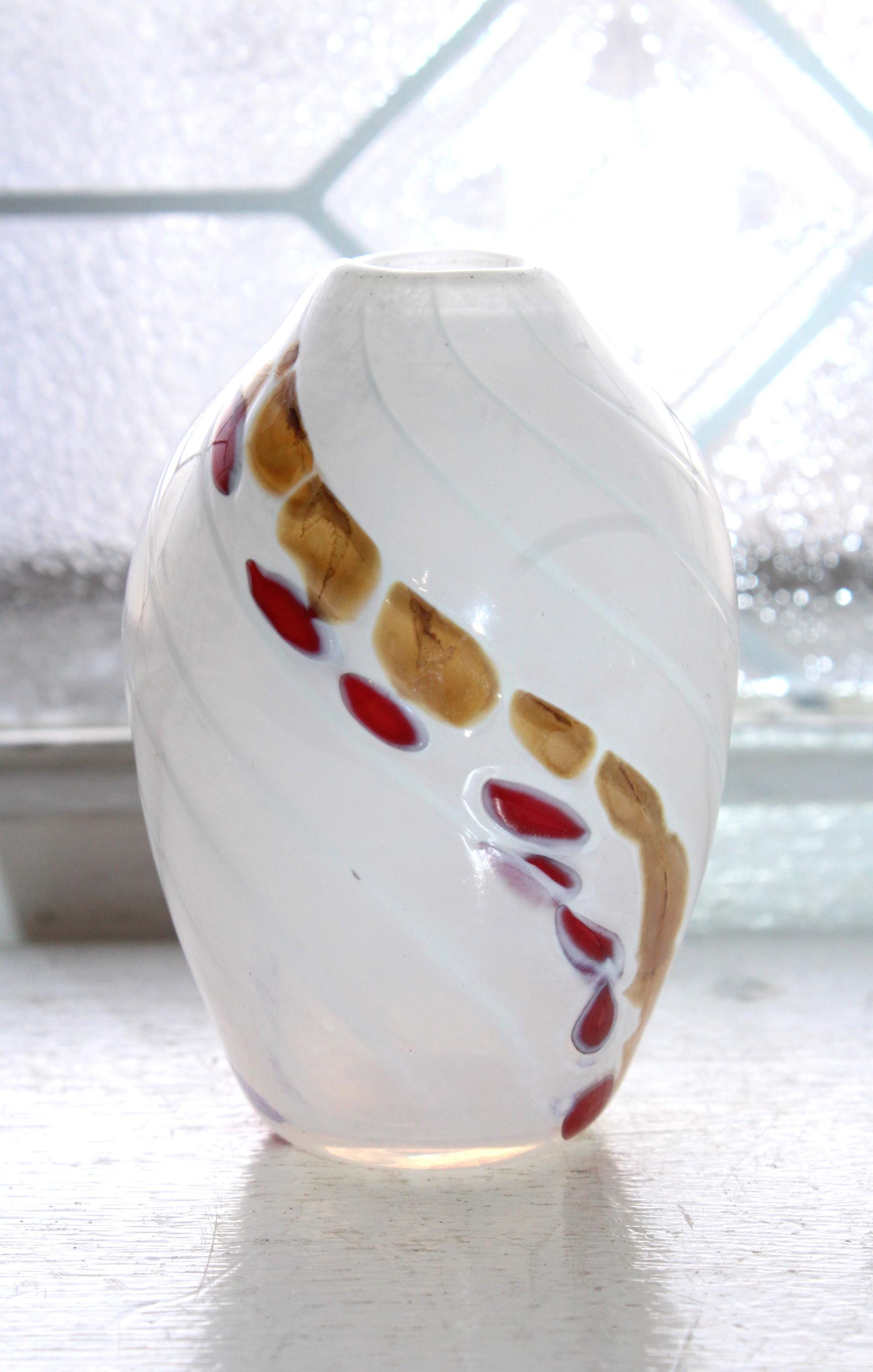 This is a gorgeous art glass vase, white with gold and red spirals, made by Jon Offutt, a well known North Dakota artist, in excellent condition. The vase measures 3 1/4" high, has no chips or cracks. Enjoy!