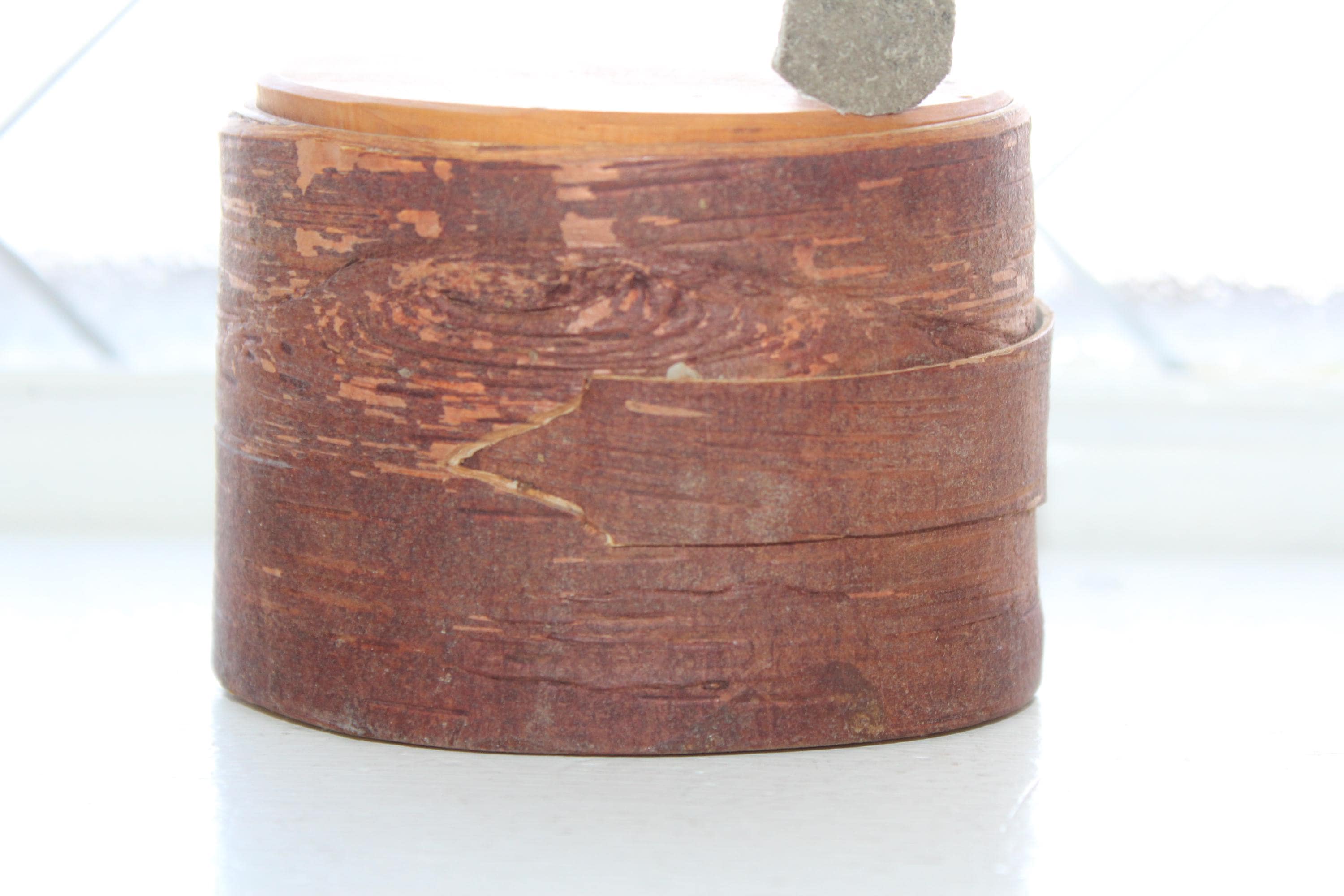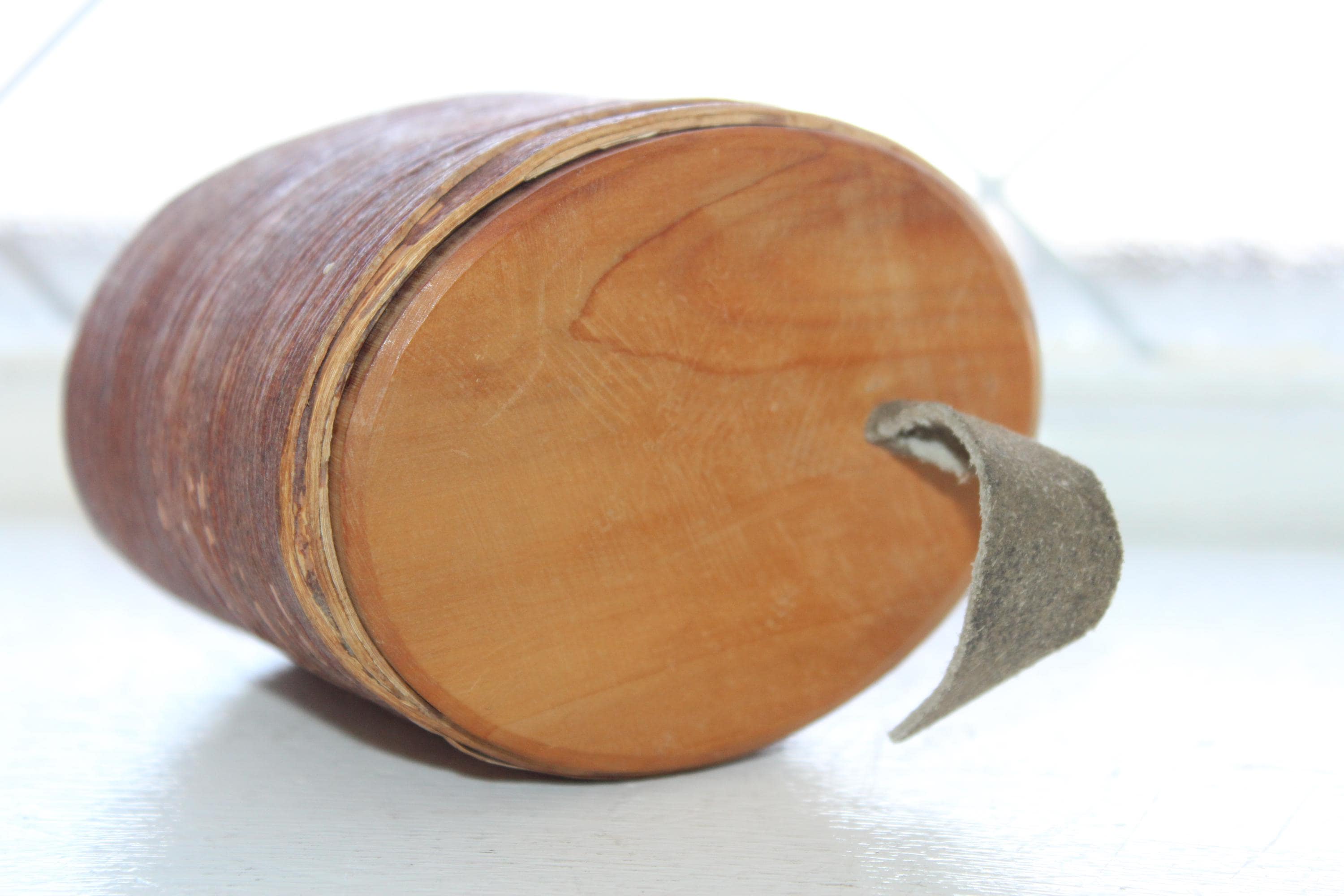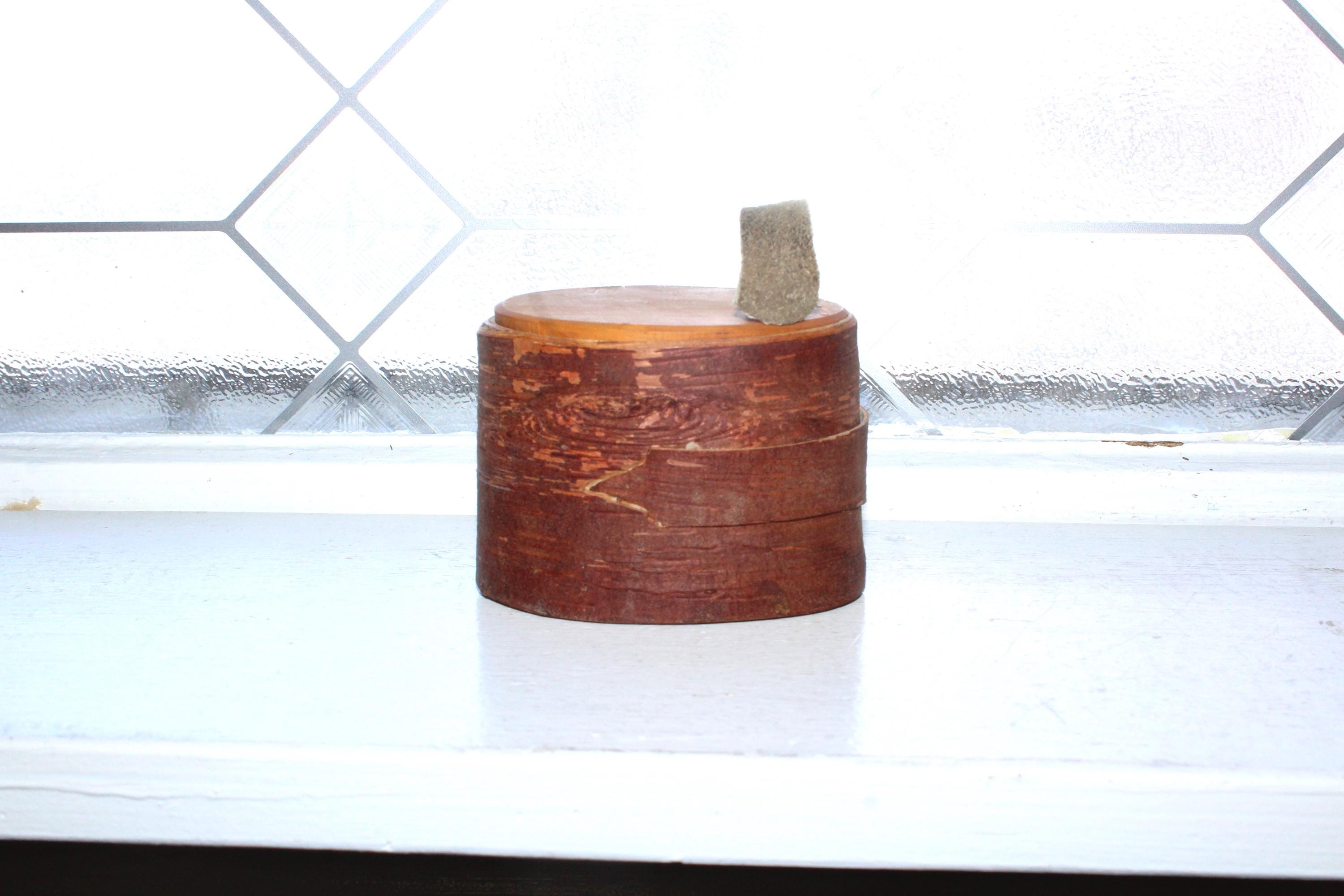 Vintage Norwegian hand carved birch bark bentwood tine box with leather pull tab, in excellent condition. These have gotten so hard to find, and this one is a beauty! The box came from a Scandinavian sale in southern Minnesota. It measures 3 1/2" x 2 3/4" wide and is 2 1/2" high. Enjoy!