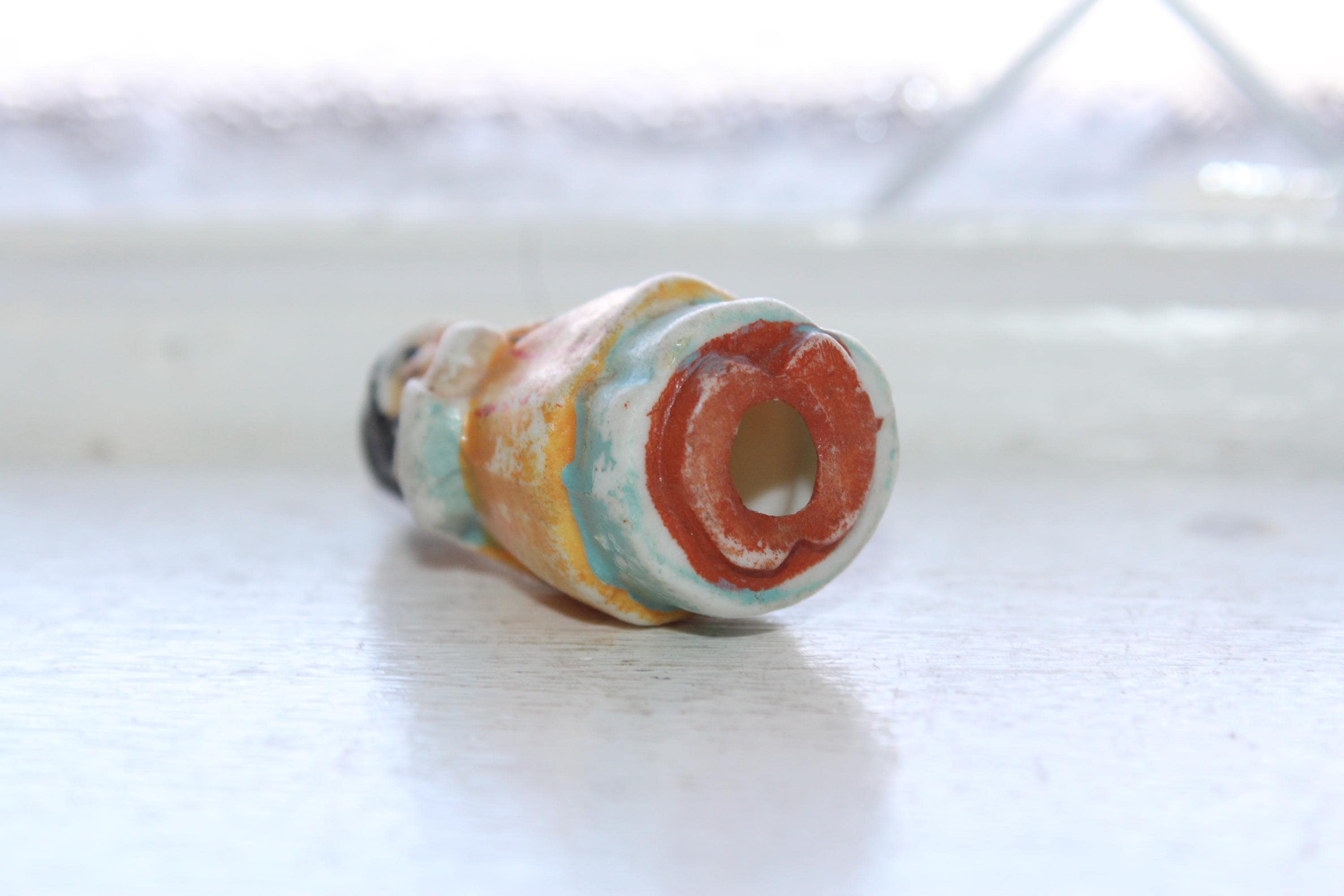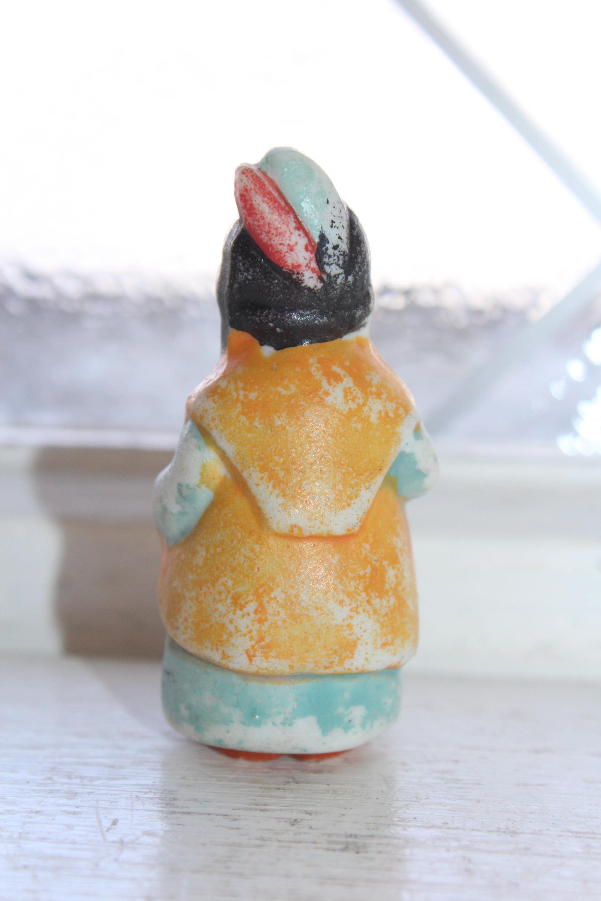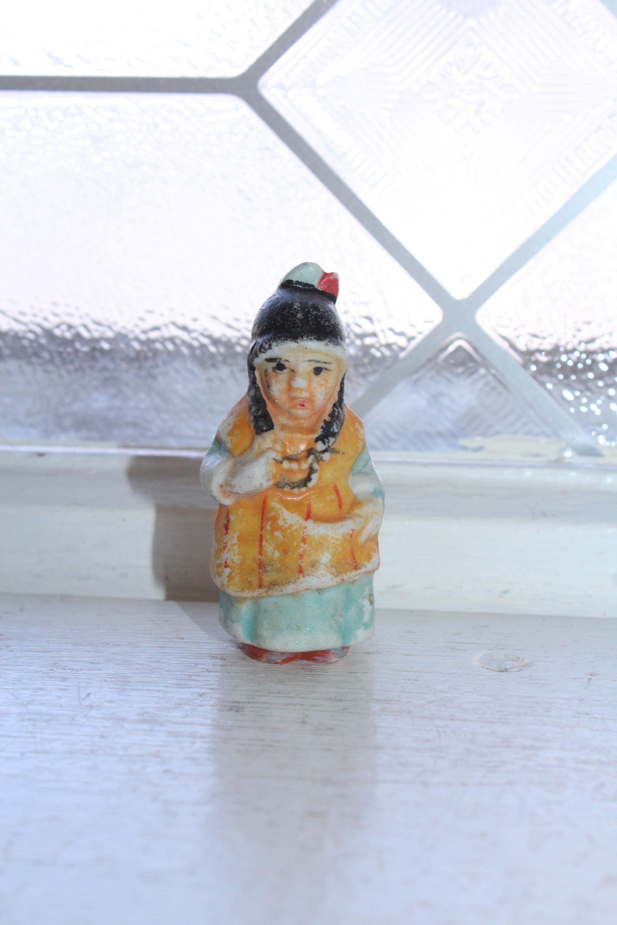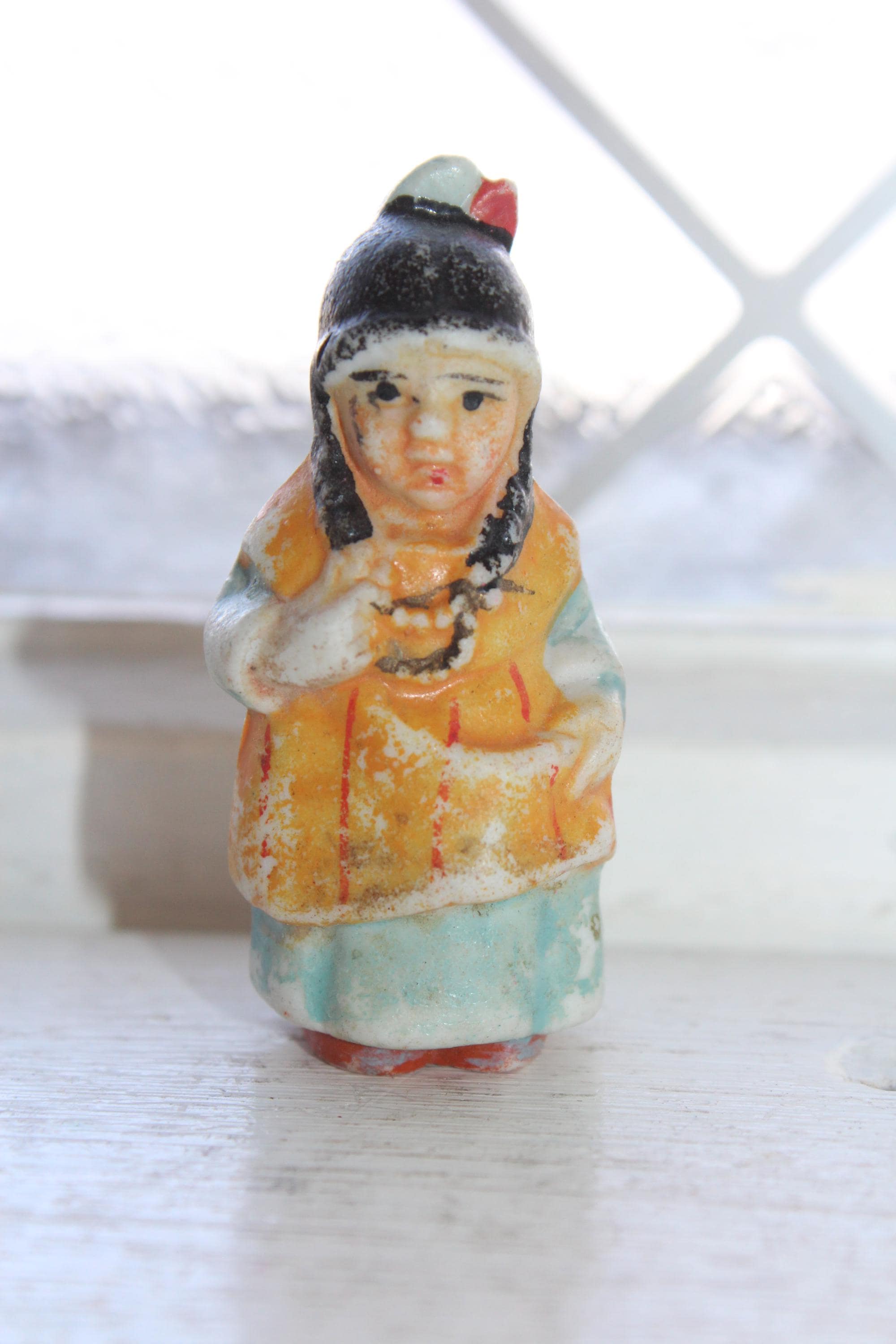 This little cutie is a 1920s Frozen Charlotte penny doll featuring a Native American Indian, made in Japan. It measures 2 1/8" high and is in good condition. No chips or cracks, minor paint wear. Enjoy!