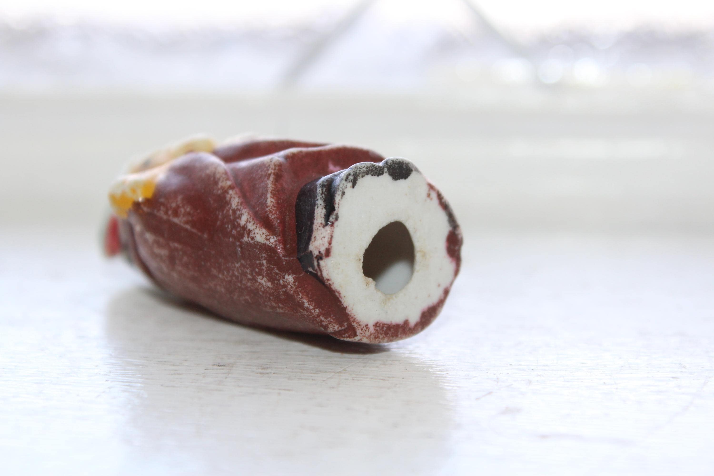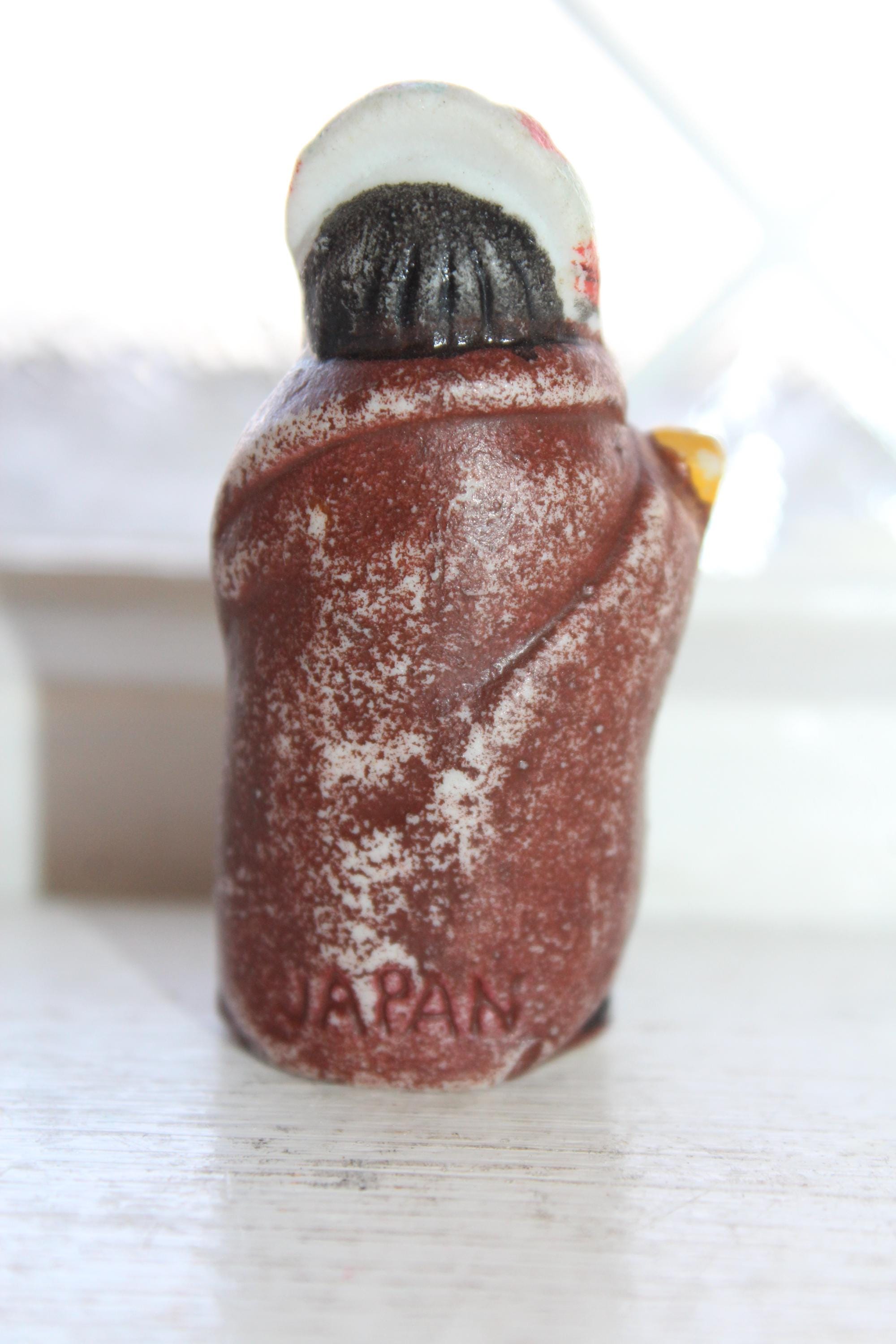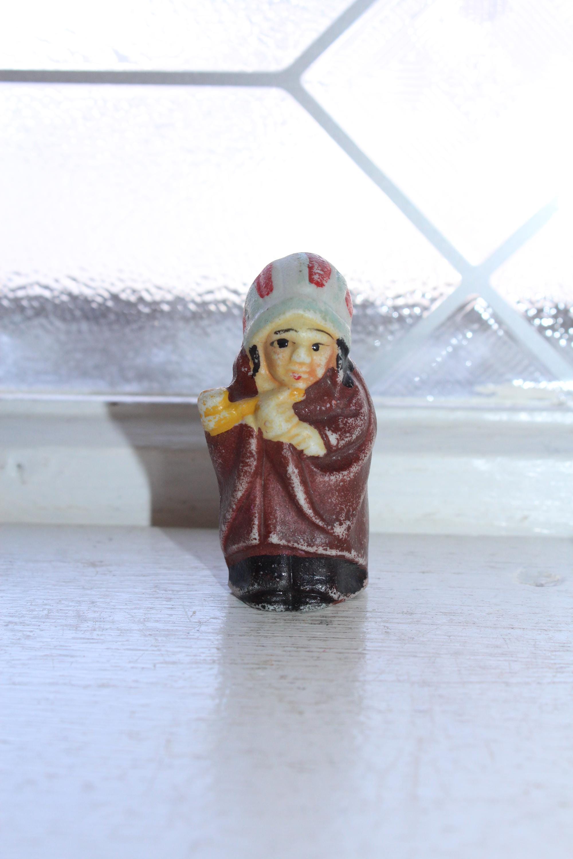 This little cutie is a 1920s Frozen Charlotte penny doll featuring a Native American Indian, made in Japan. It measures 2 1/4" high and is in good condition. No chips or cracks, minor paint wear. Enjoy!