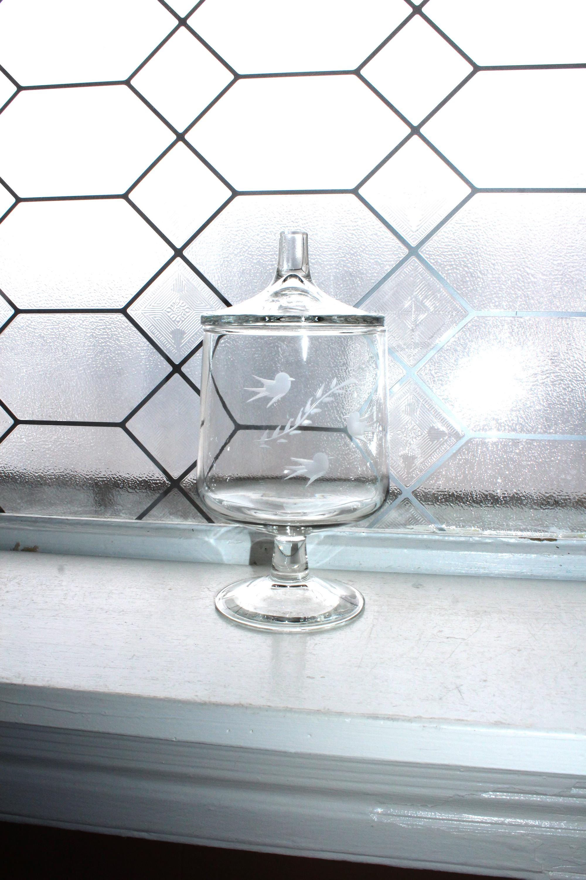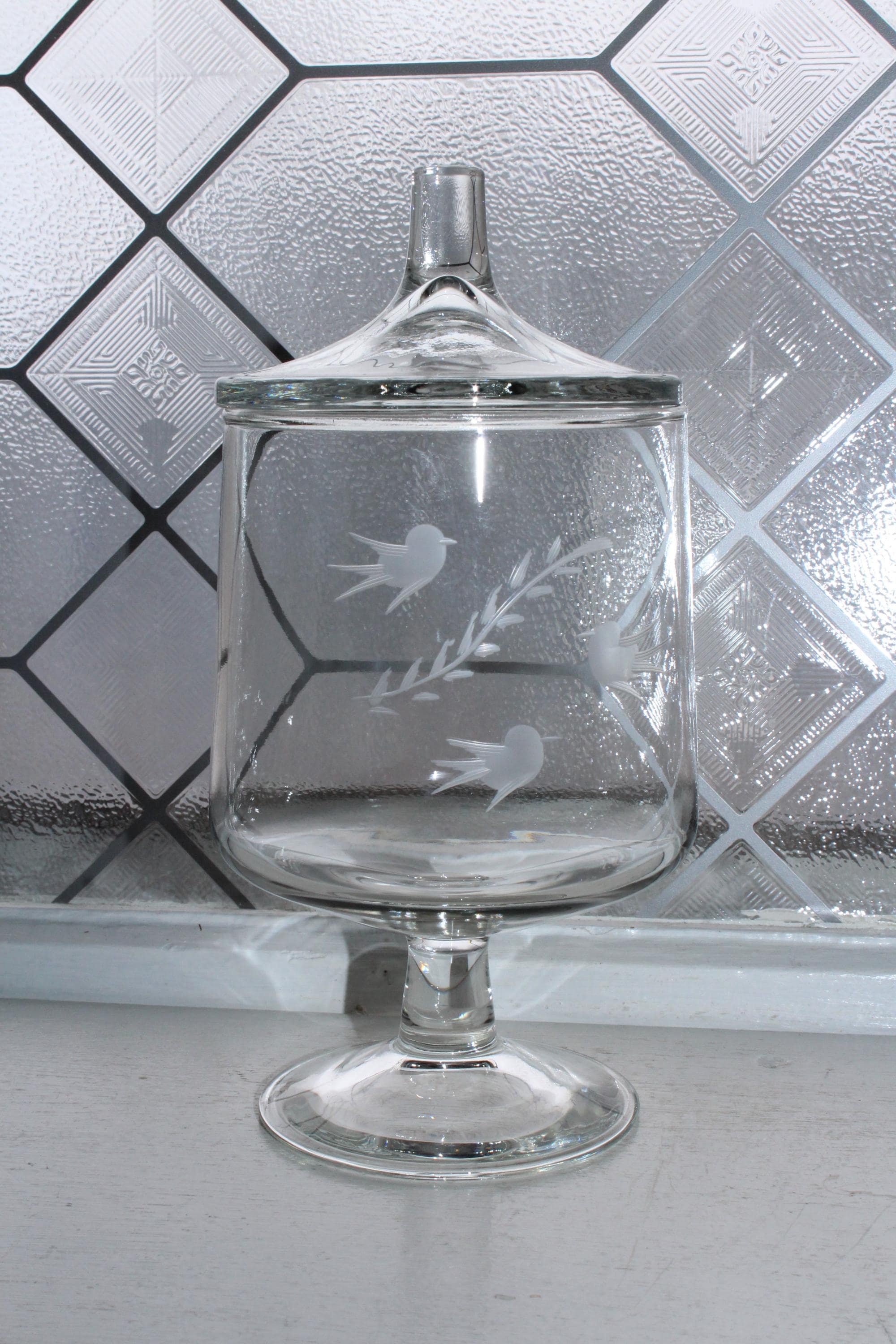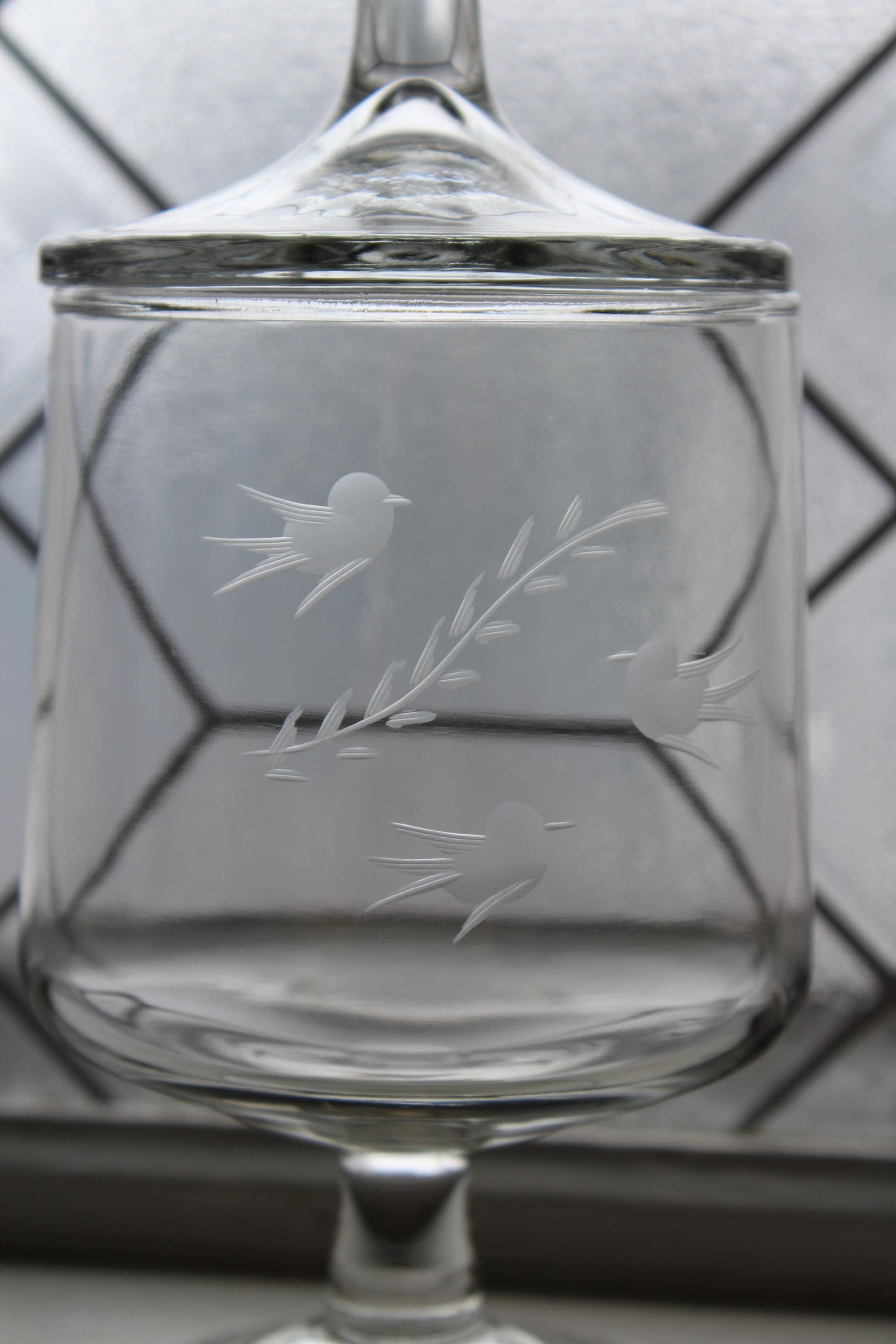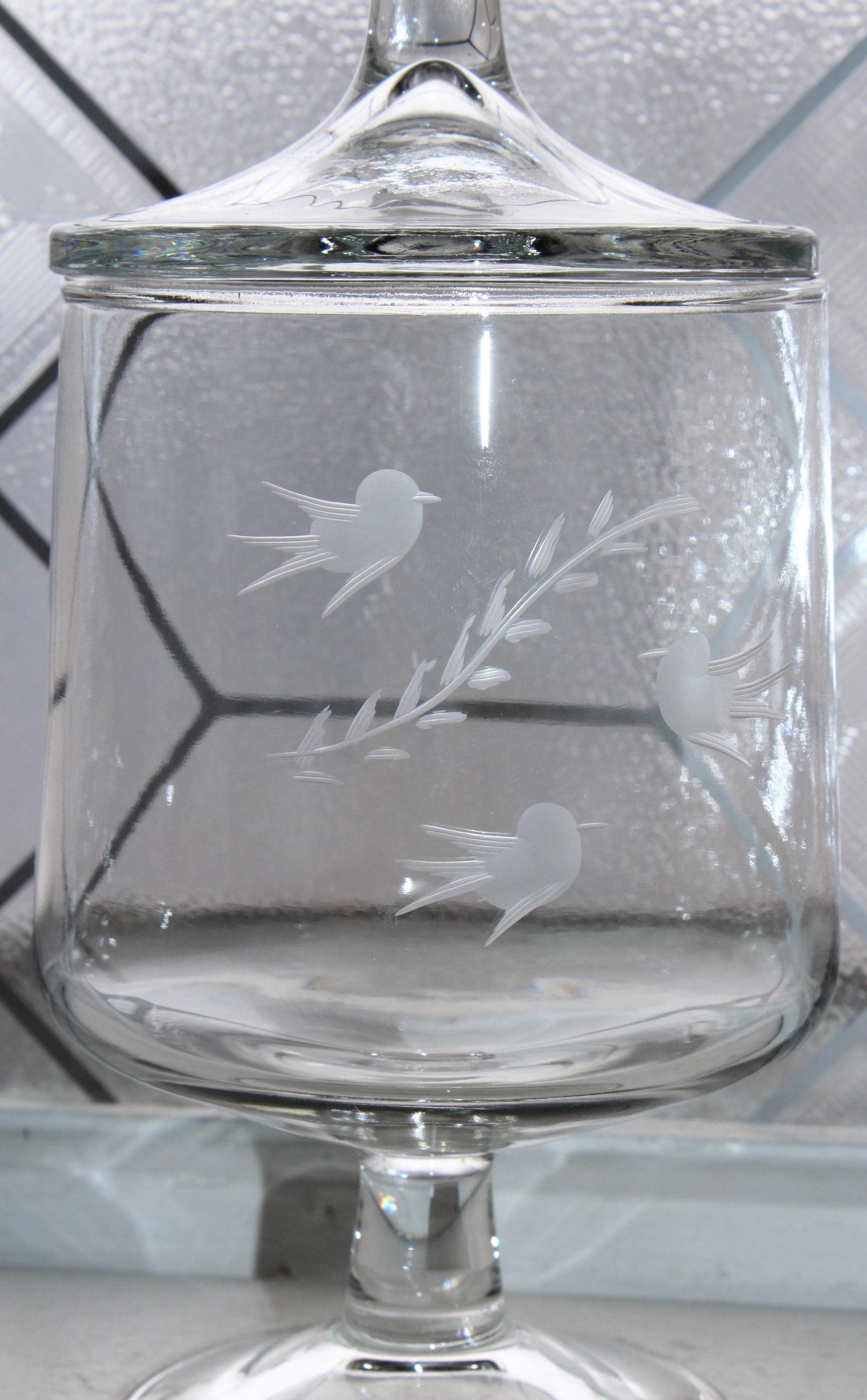 Vintage West Virginia Glass Co. candy jar with cut love birds design and pointed finial lid, in excellent condition with no chips or cracks. It measures 7 3/4" high. Enjoy!
