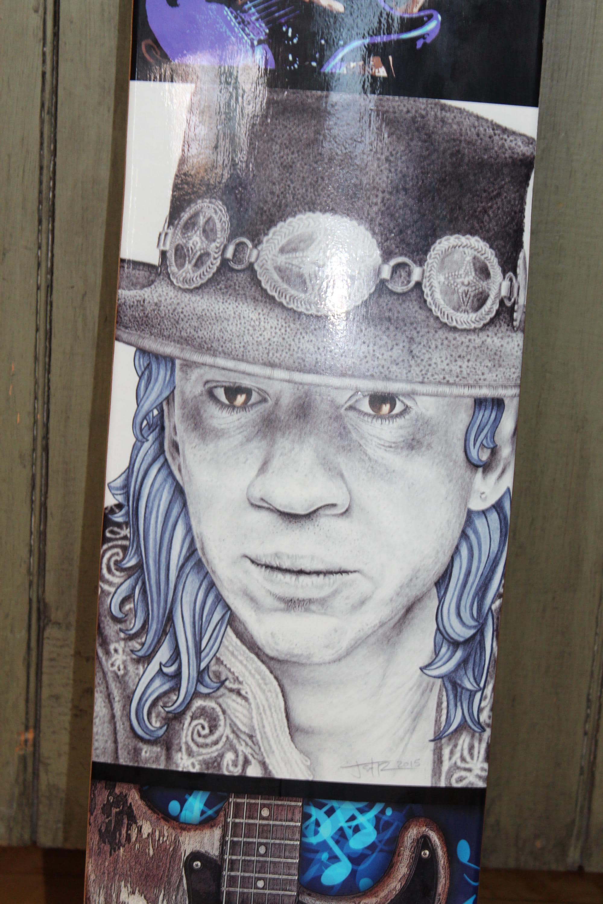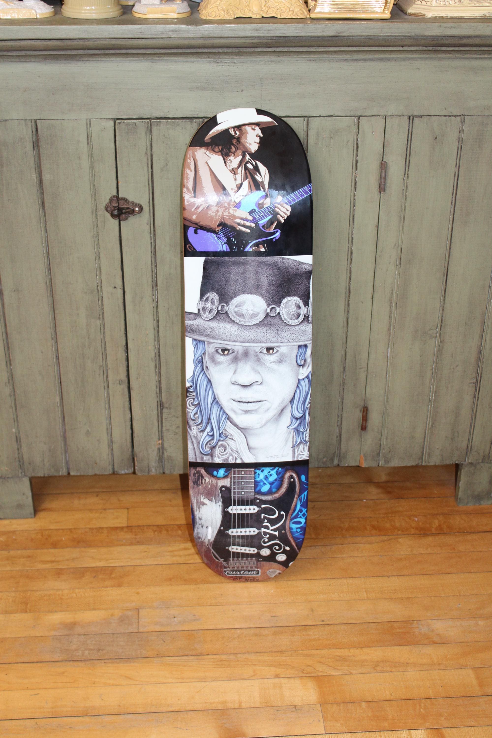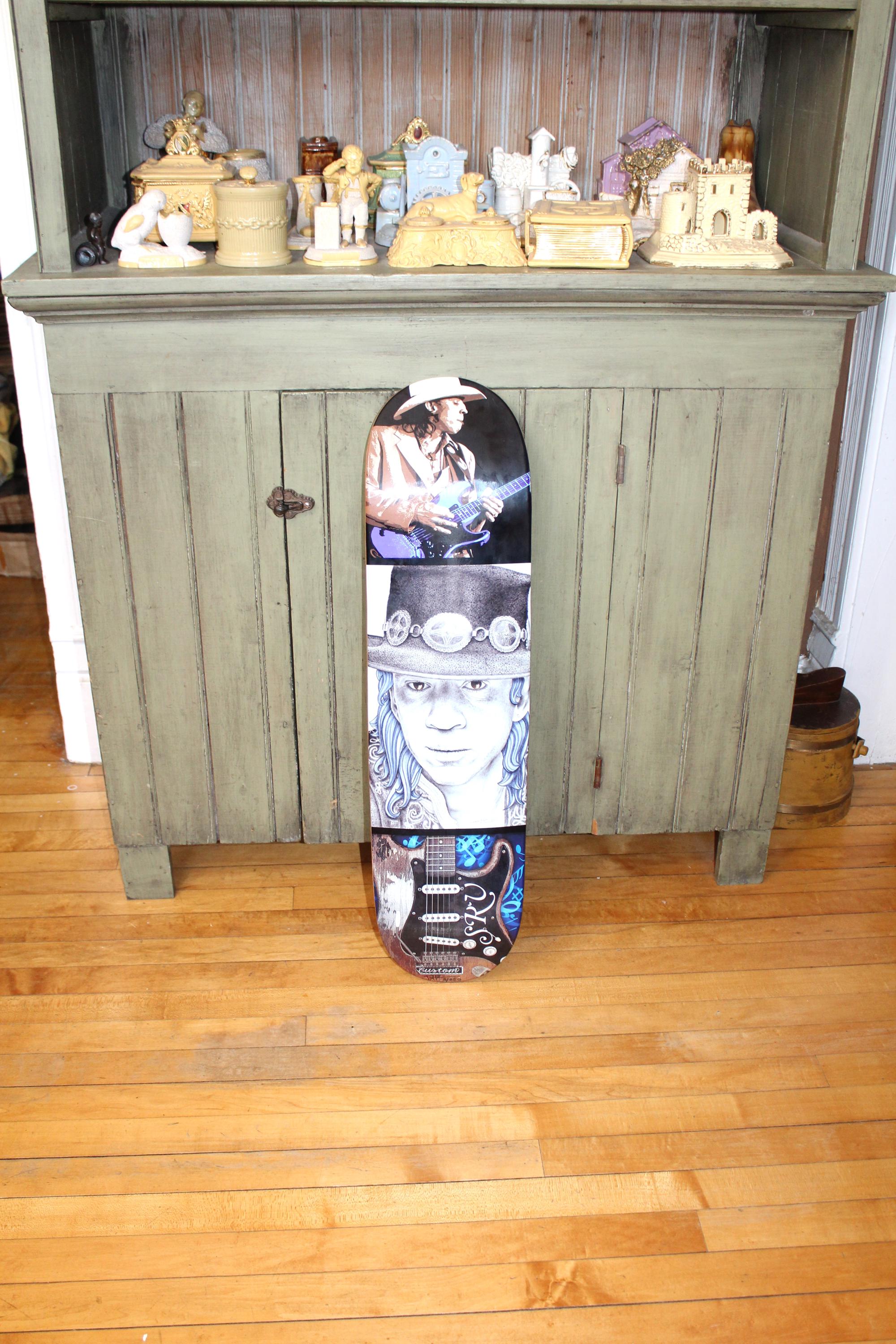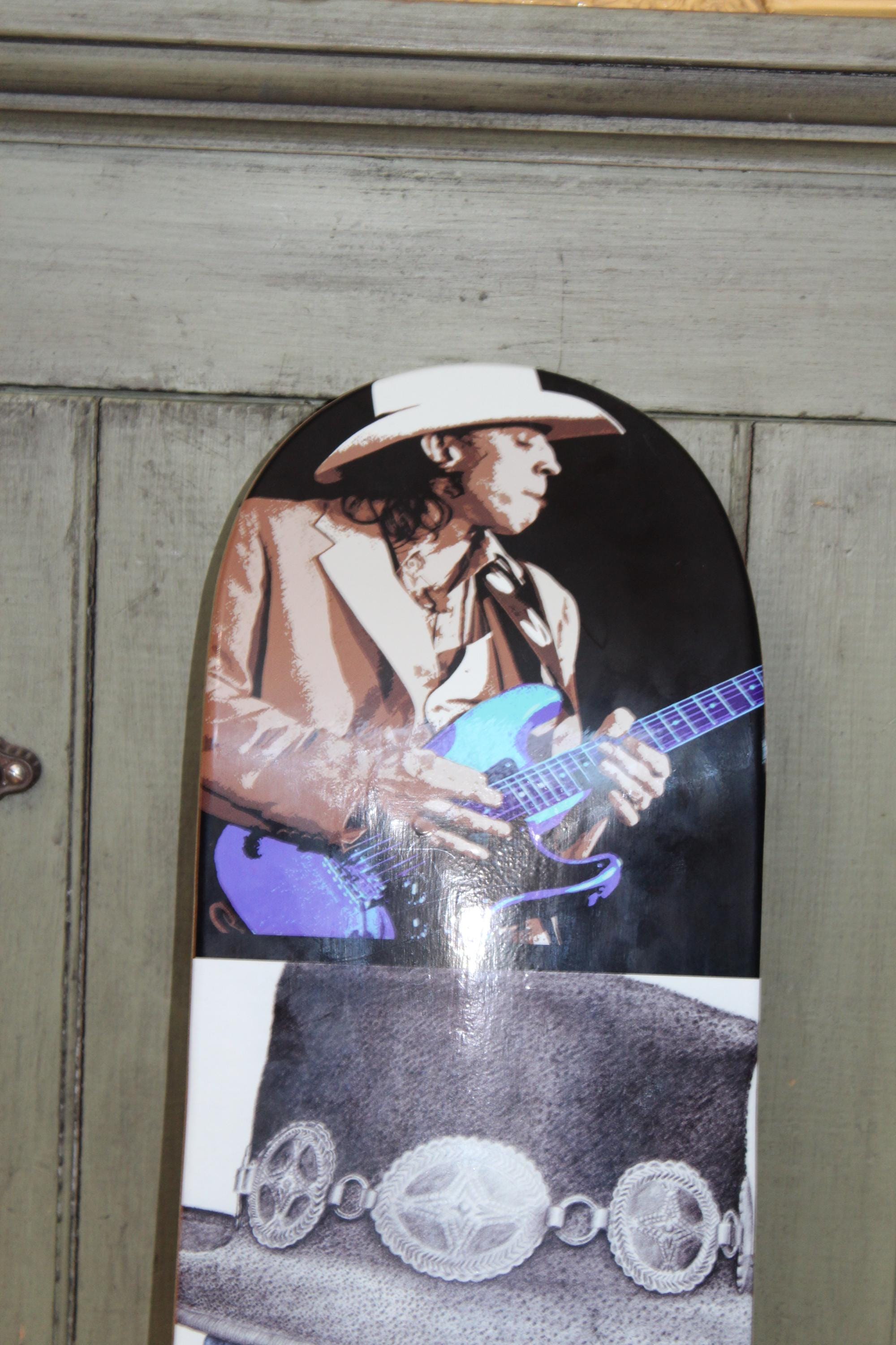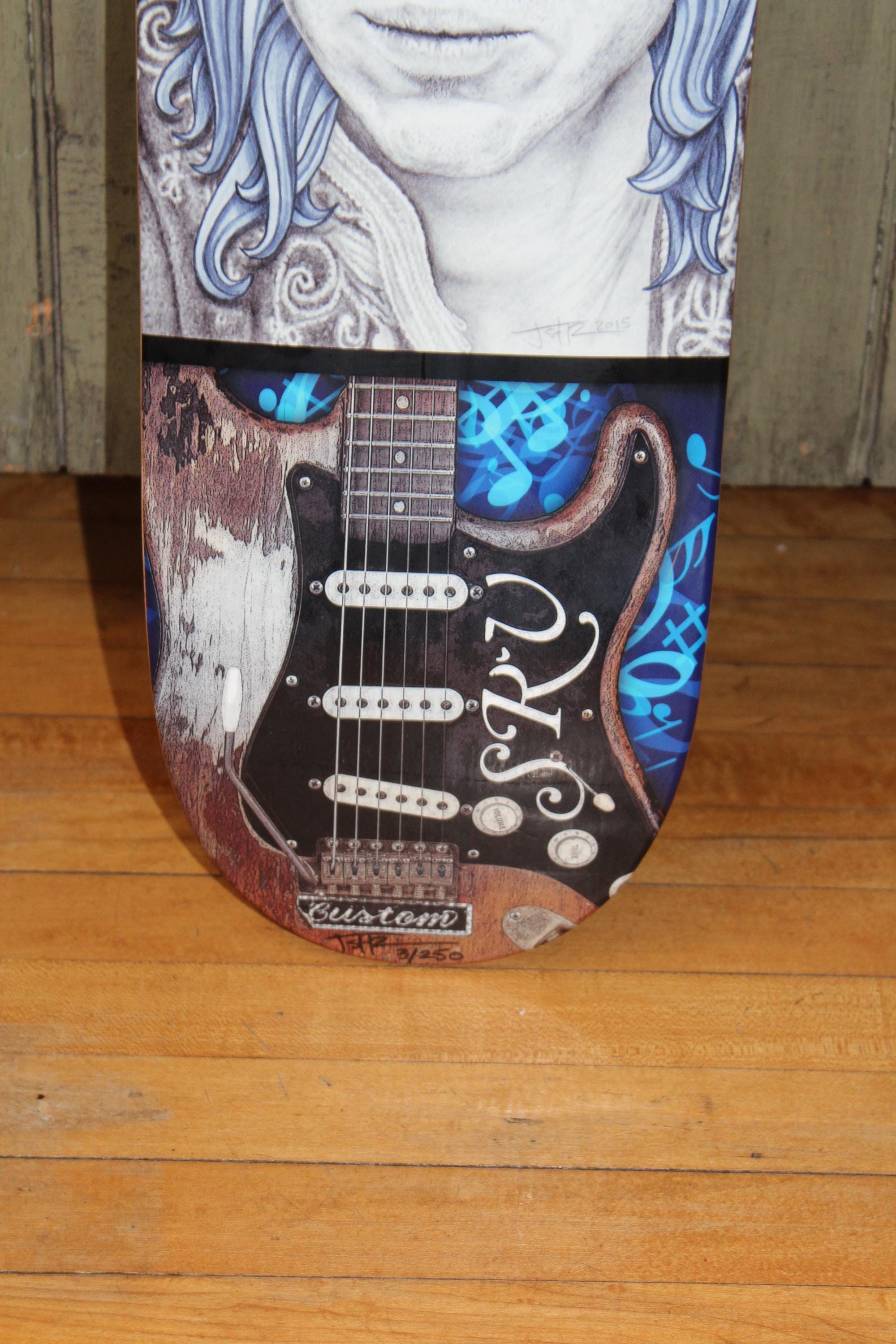 This is a limited edition, ready to hang fine art Stevie Ray Vaughn skateboard deck by the artist Jeffrey St. Romain, #3/250, in excellent condition and ready to display and enjoy. It measures 31 1/2" long x 8 1/4" wide. Here is your chance to purchase a hard to find early edition of this beauty. Enjoy!