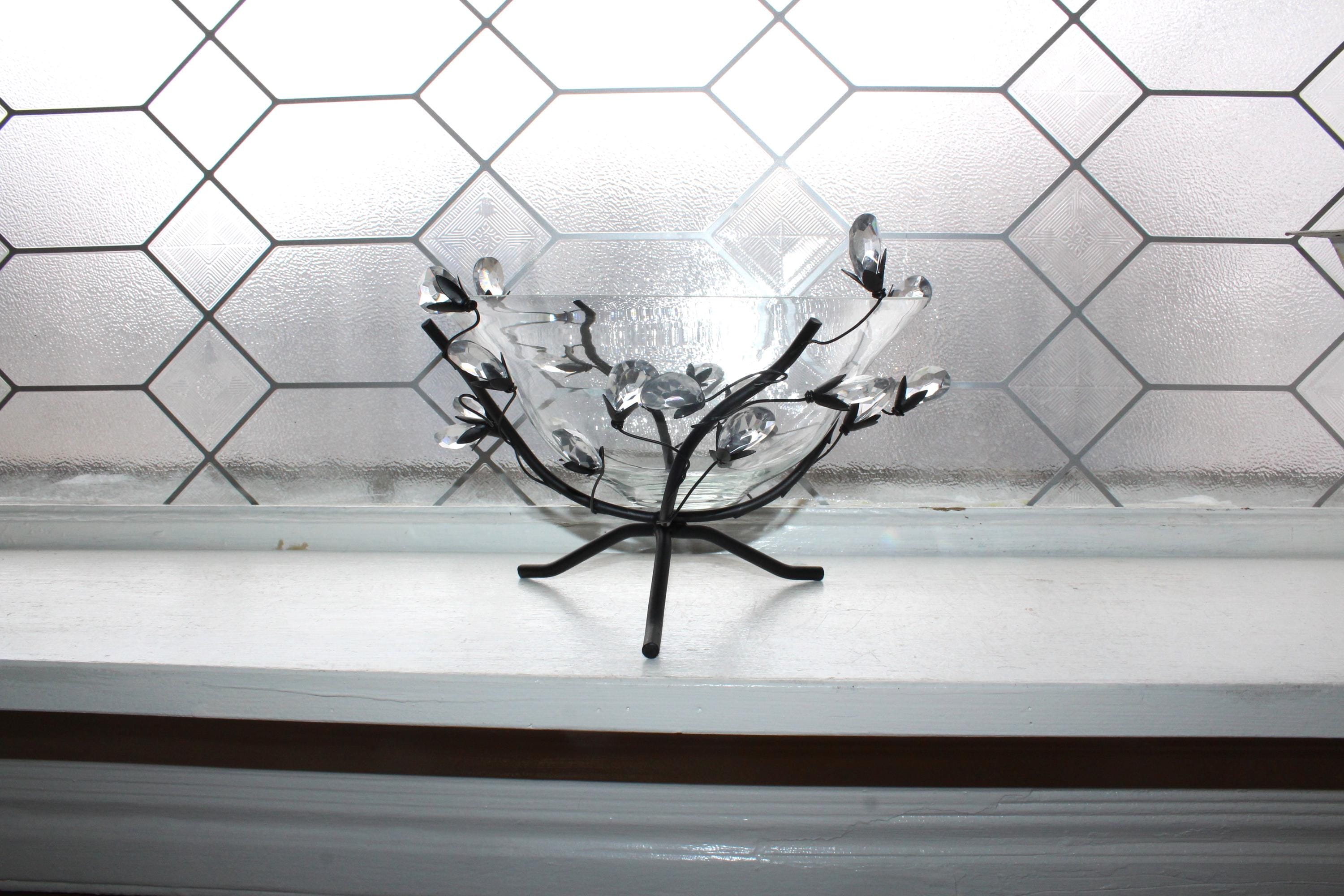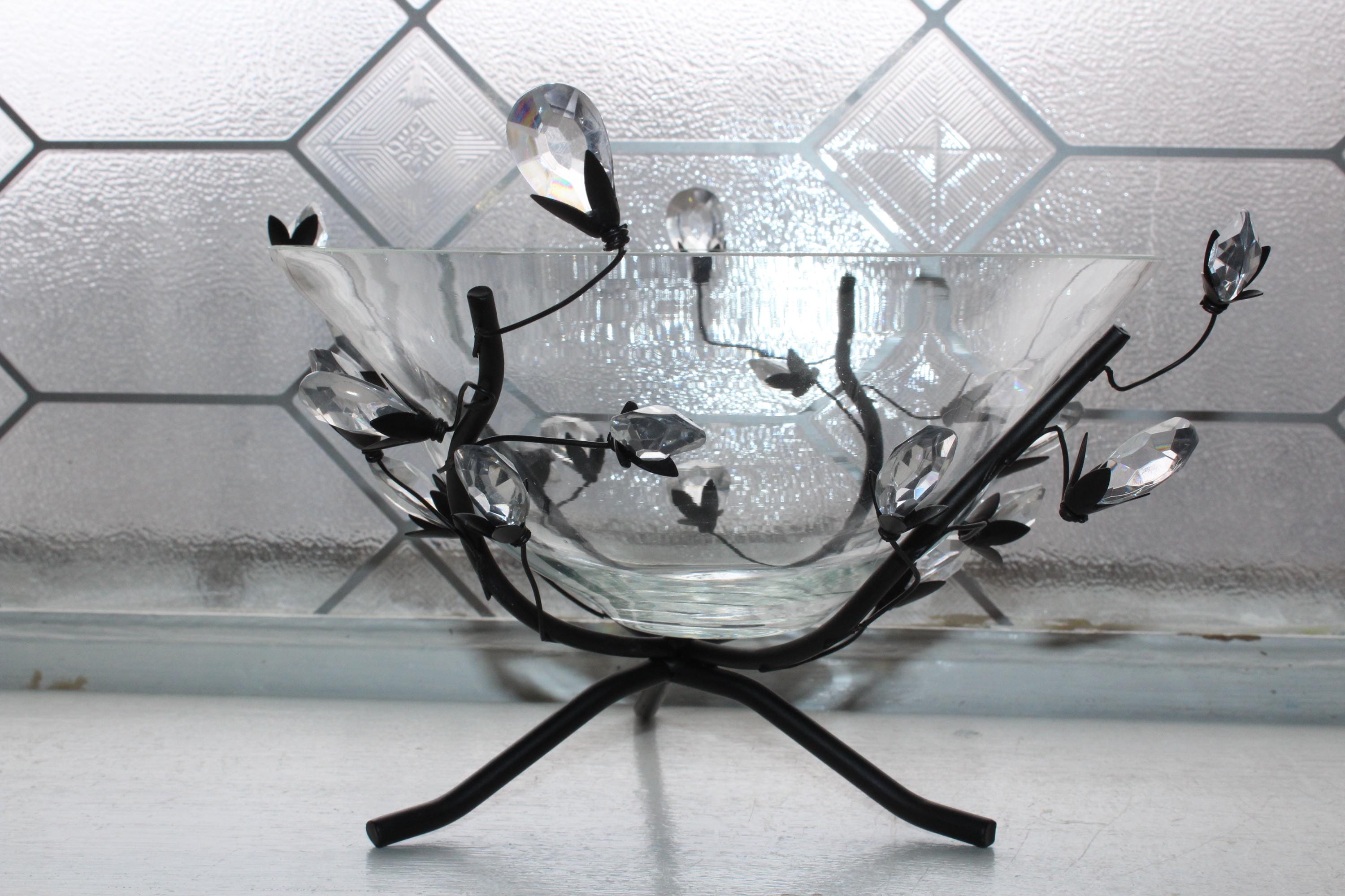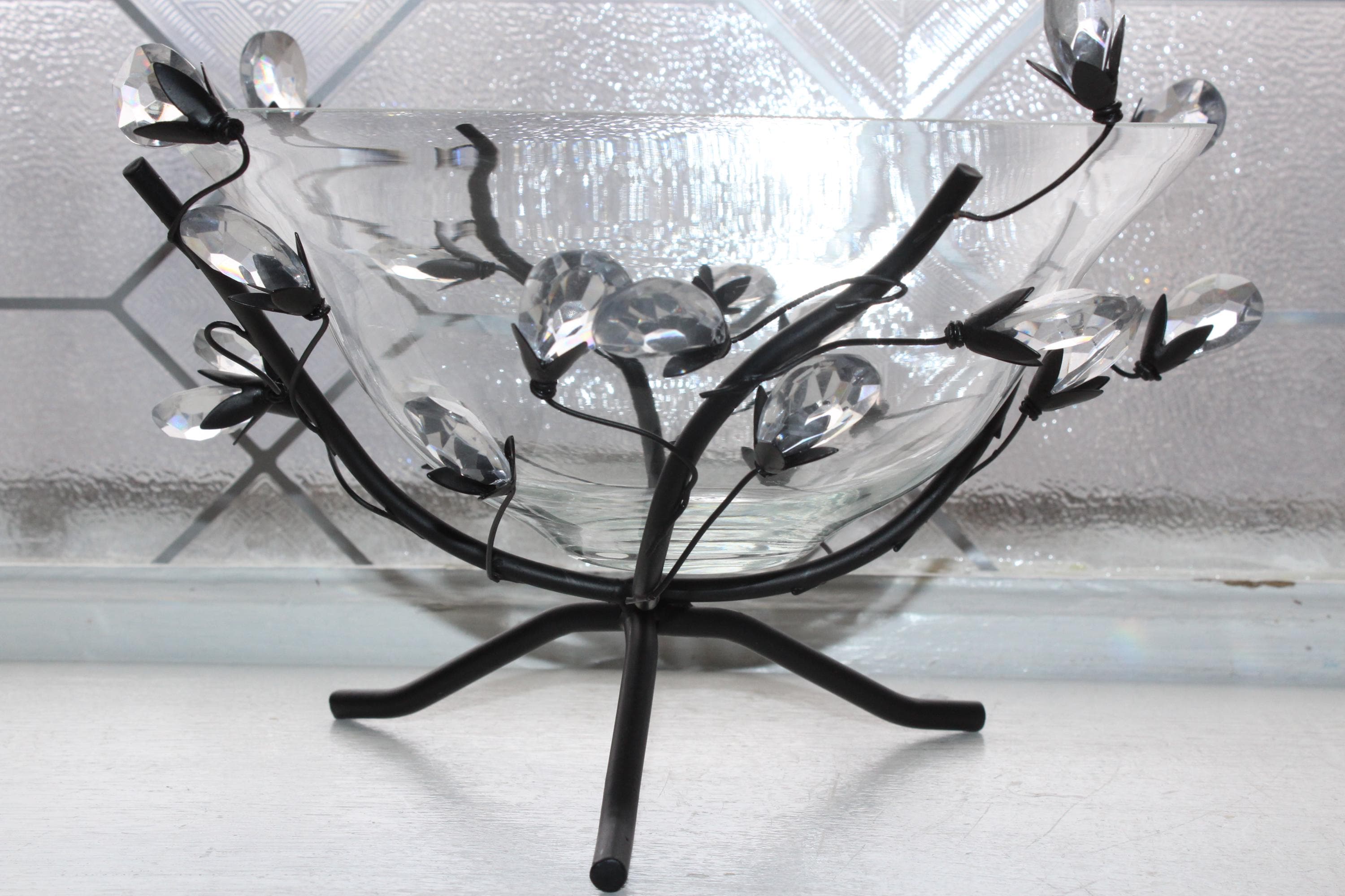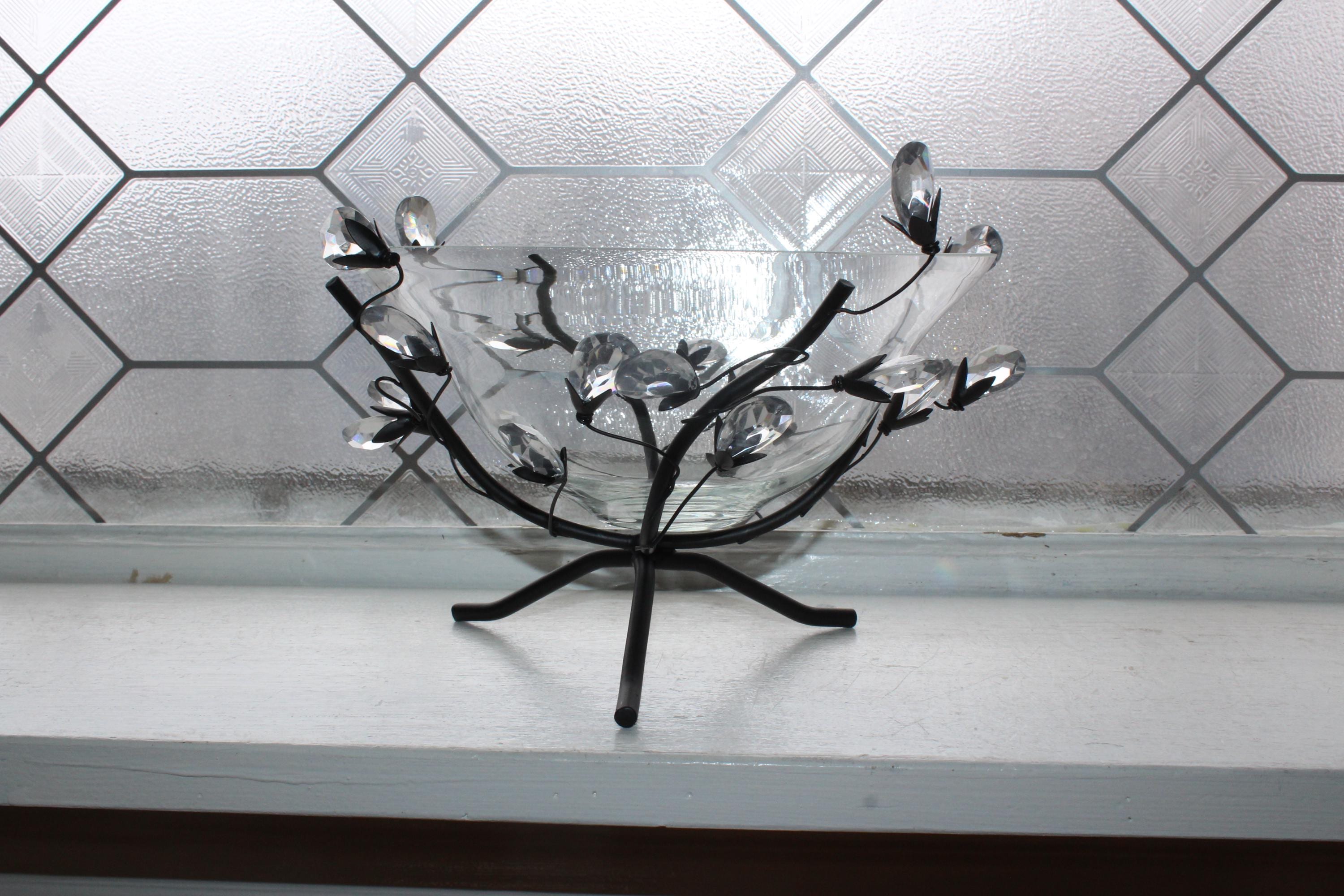 This is a gorgeous glass bowl in a metal branch stand with faceted crystal leaves, in excellent condition with no damage. It measures 8" wide x 5" high. Enjoy!