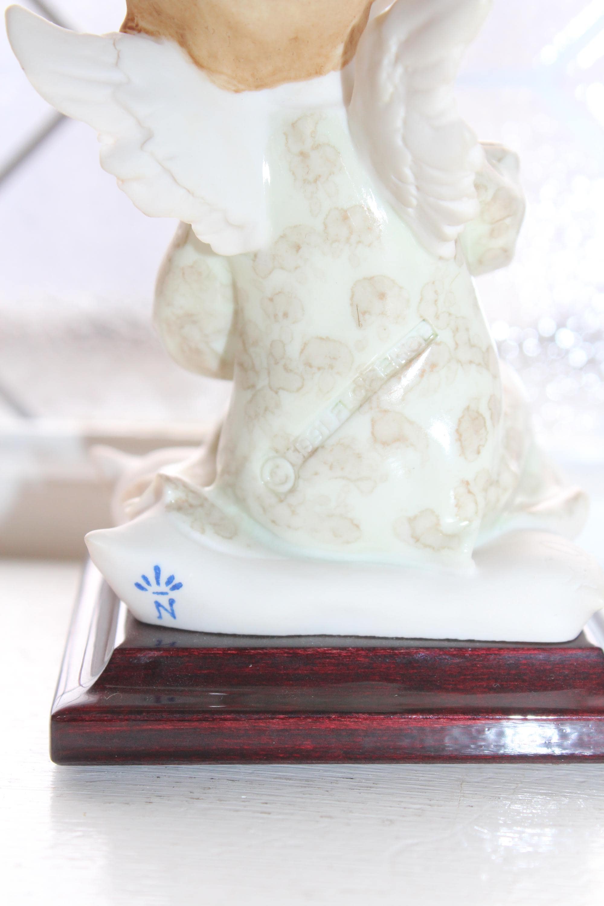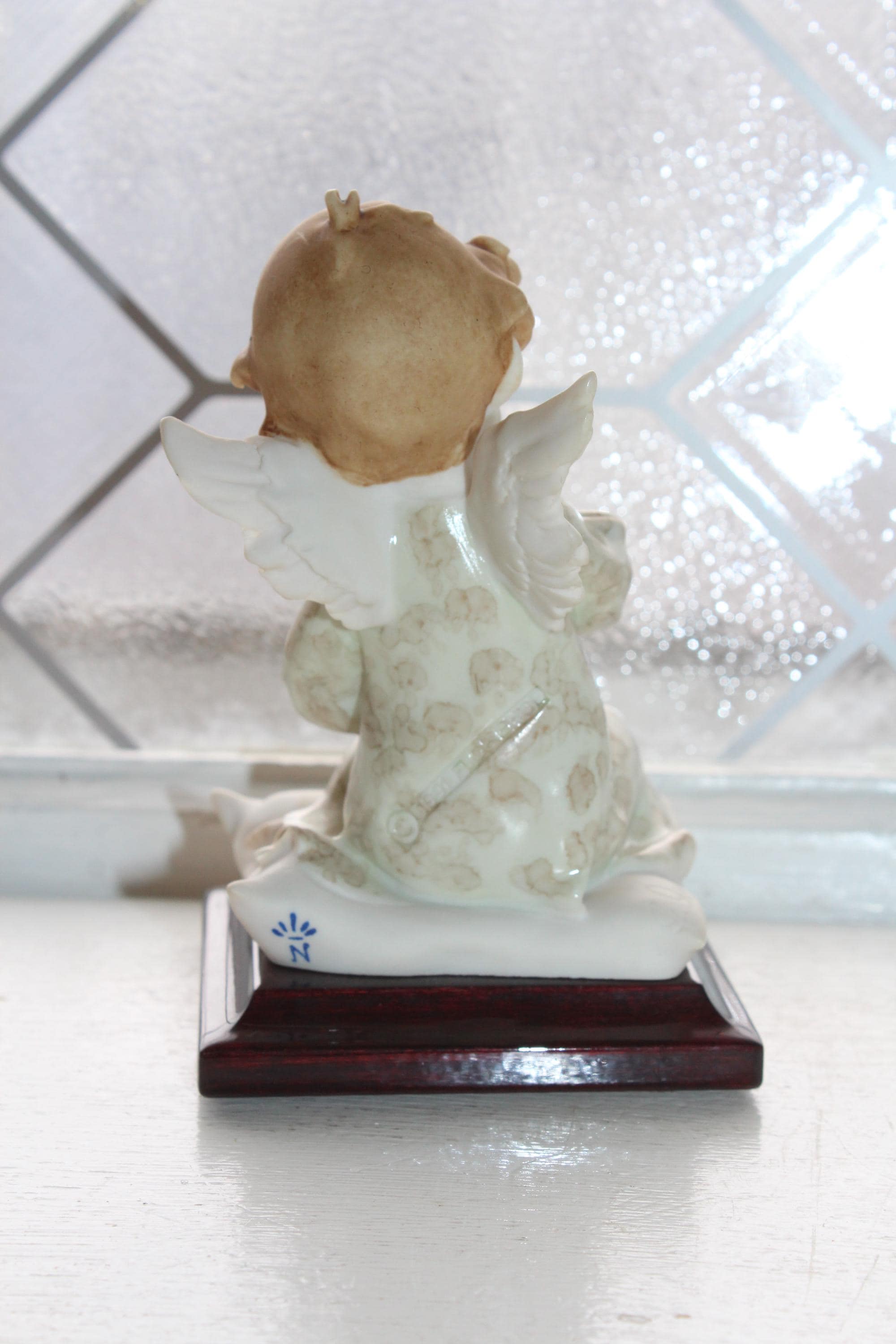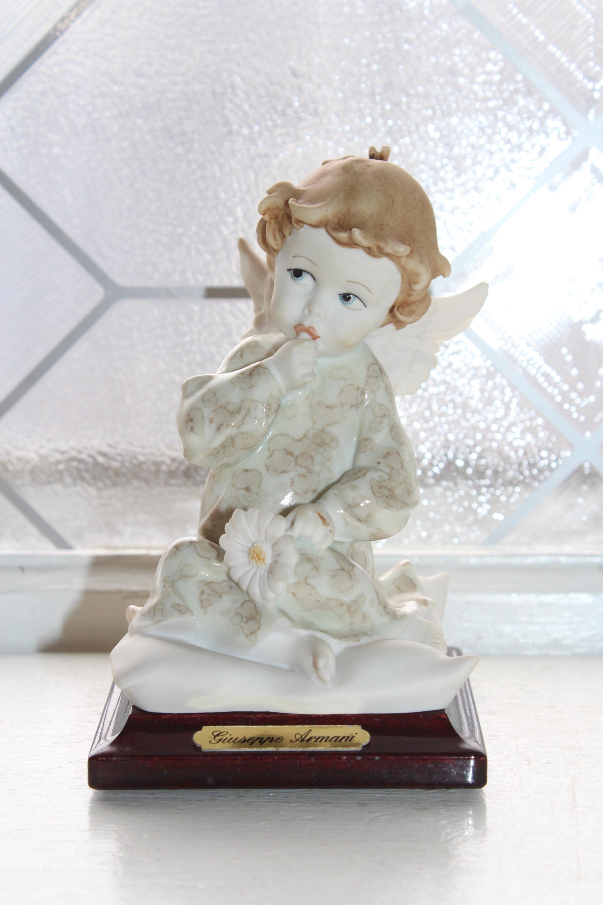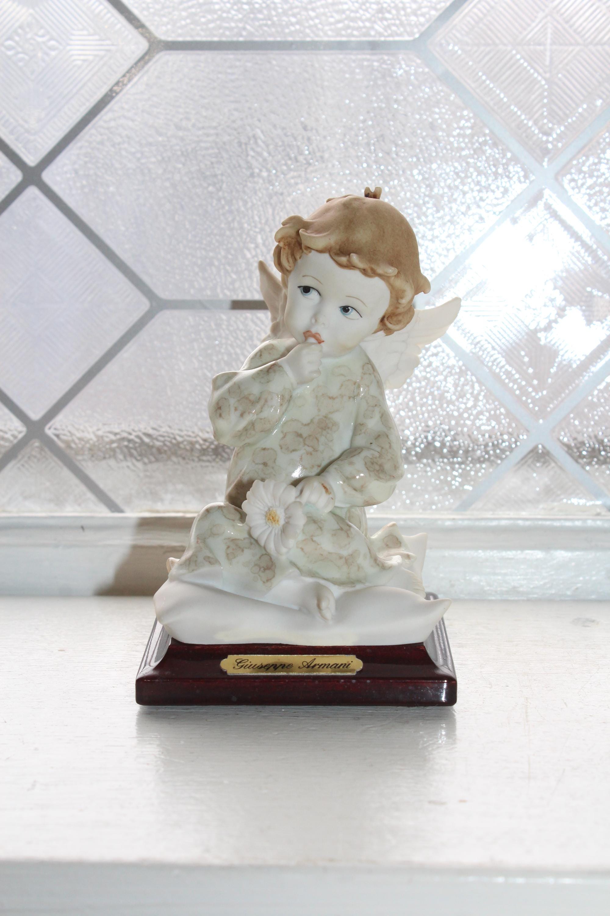 Vintage Giuseppe Armani figurine titled Angel with Daisy. It measures 4 1/2" high and has no chips or cracks. Marked with G Armani signature, 1991 Florence and with the cobalt blue capodimonte N. Enjoy!