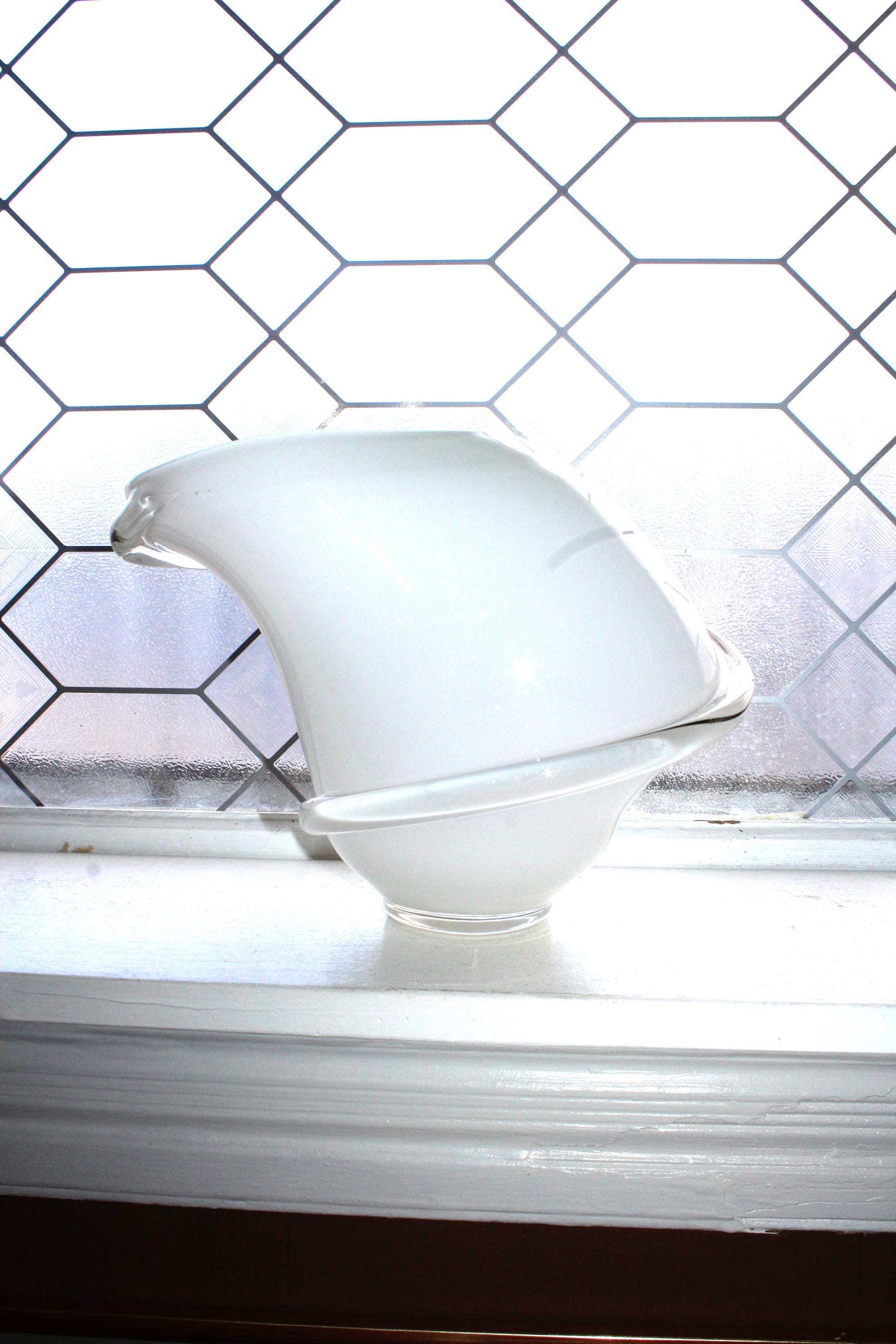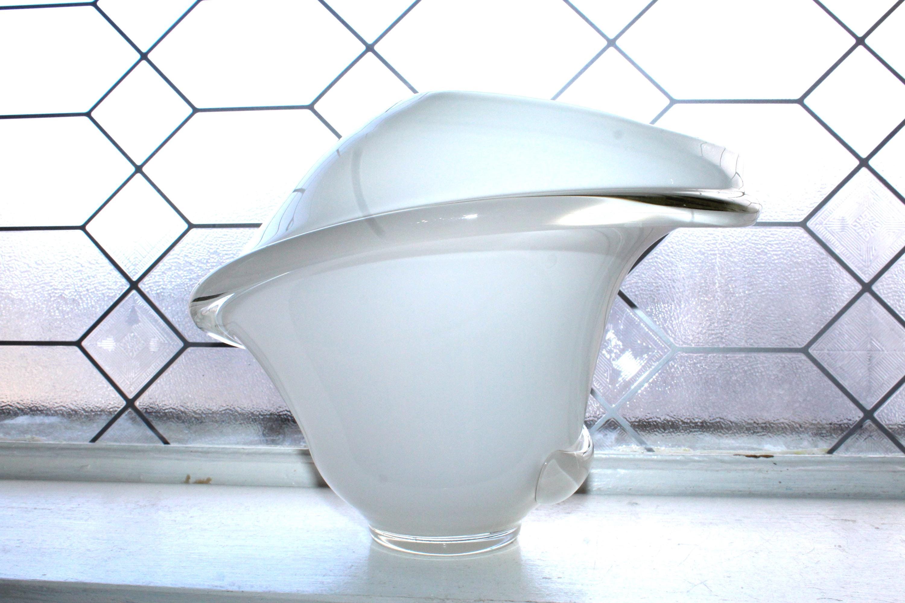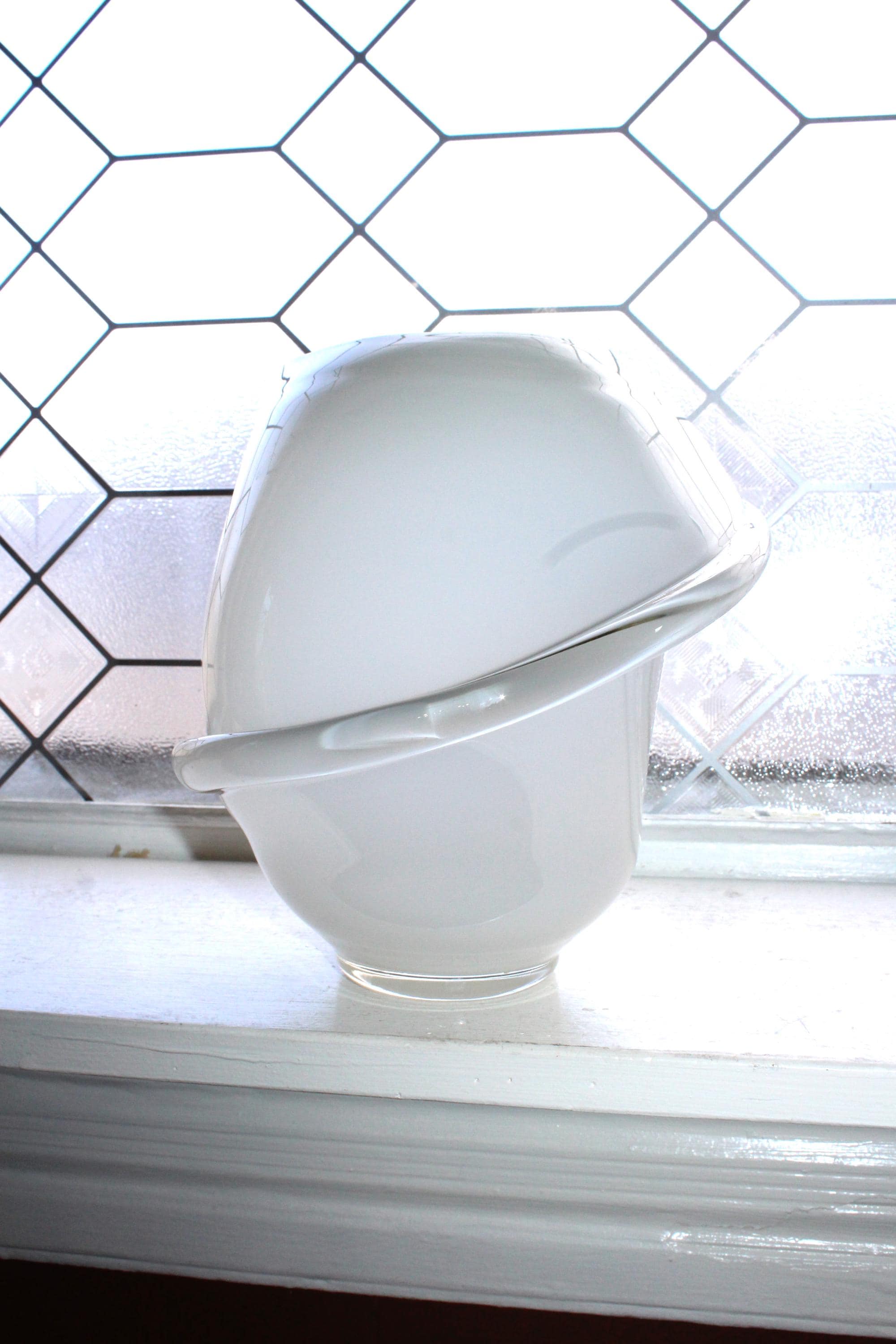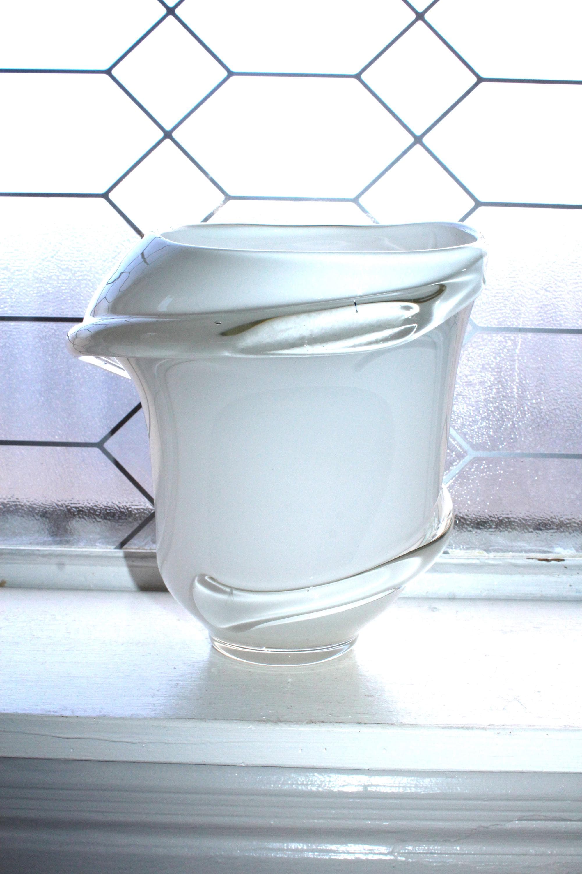 Large vintage white Italian Murano art glass tornado vase with clear wrapped thick thread/rope. It measures 8" high, weighs 2 3/4 lbs. and has no chips, great for display. THE CURVED GRAY LINES YOU SEE IN THE PHOTOS ARE FROM MY CAMERA LENS. Enjoy!