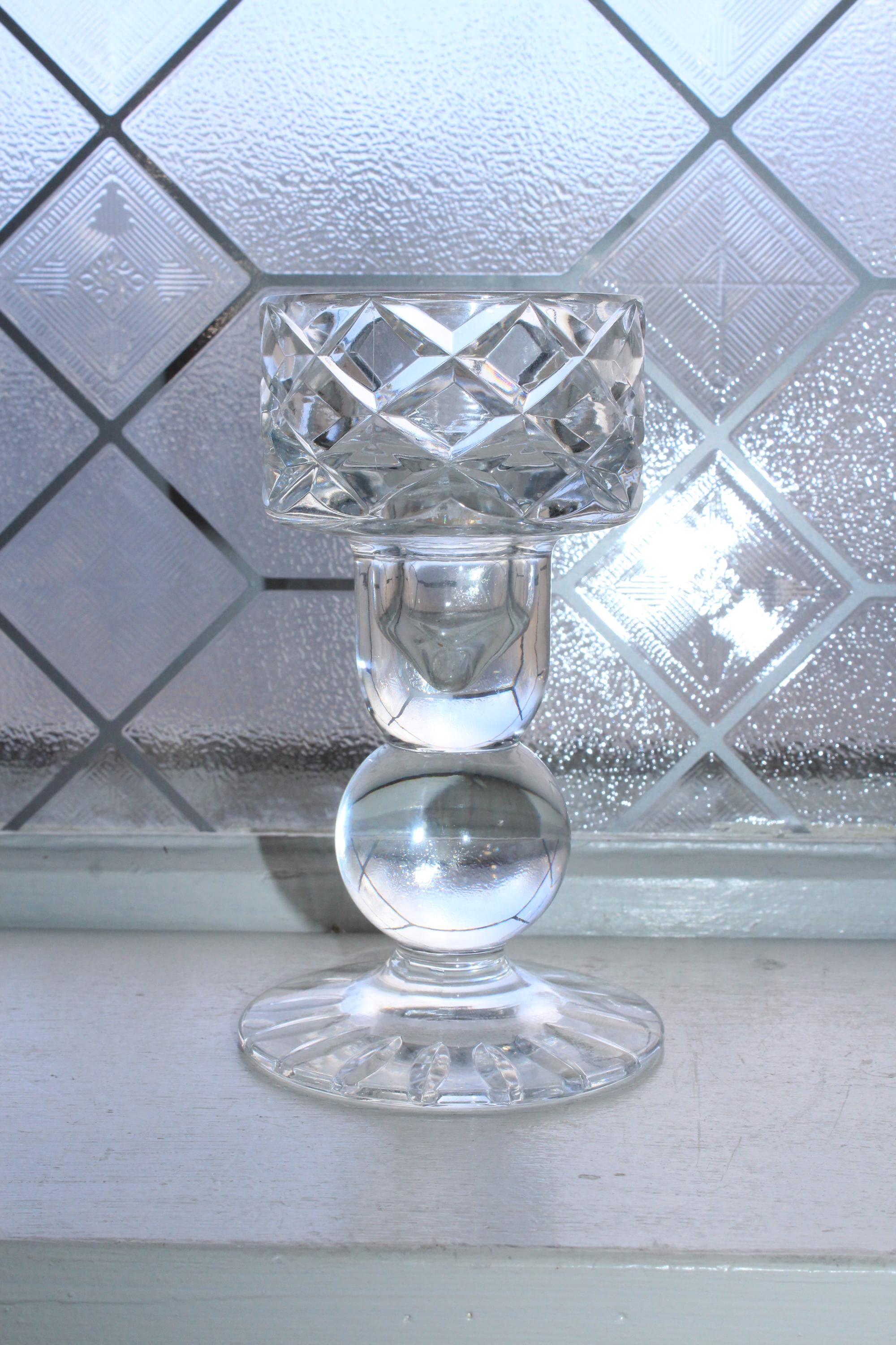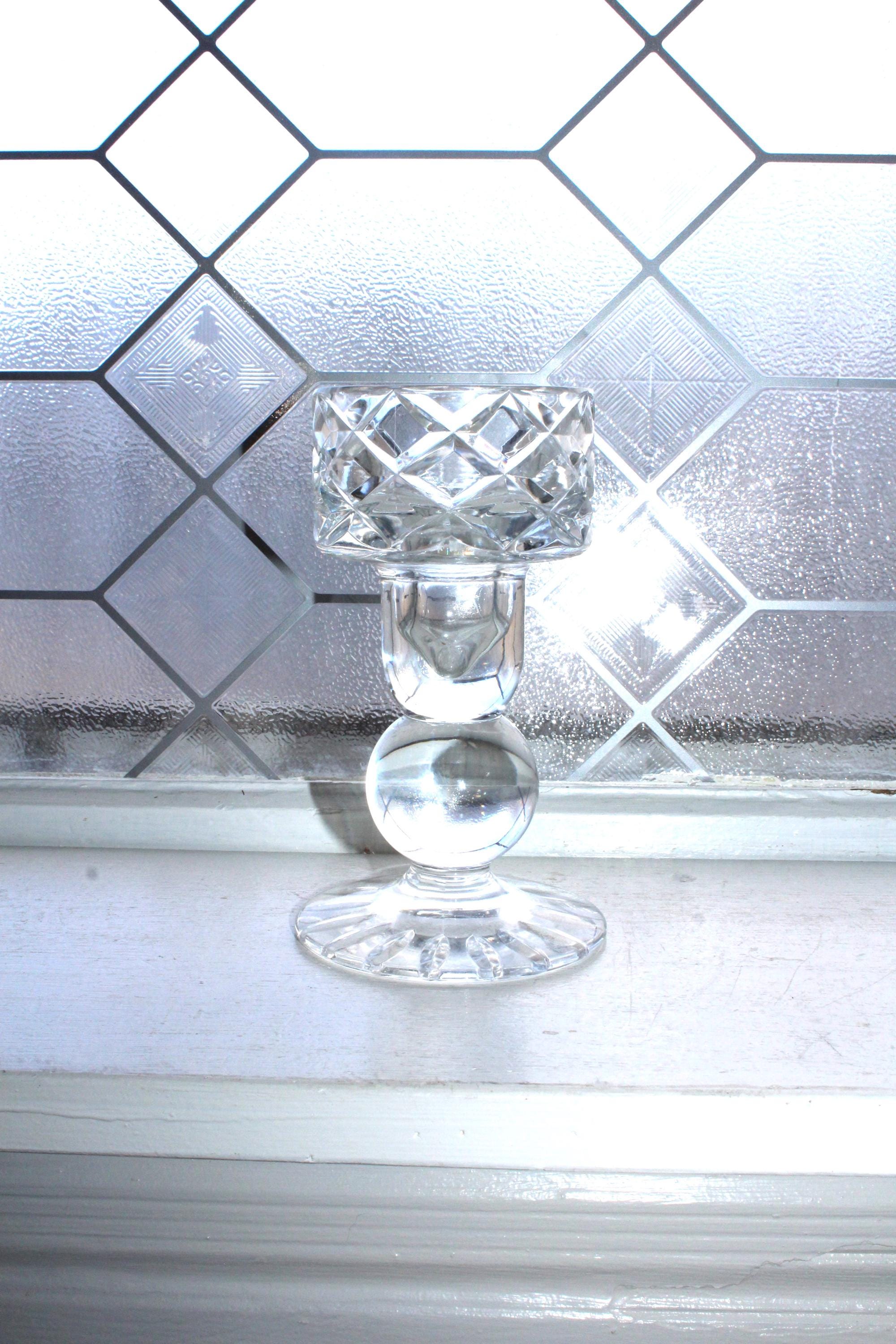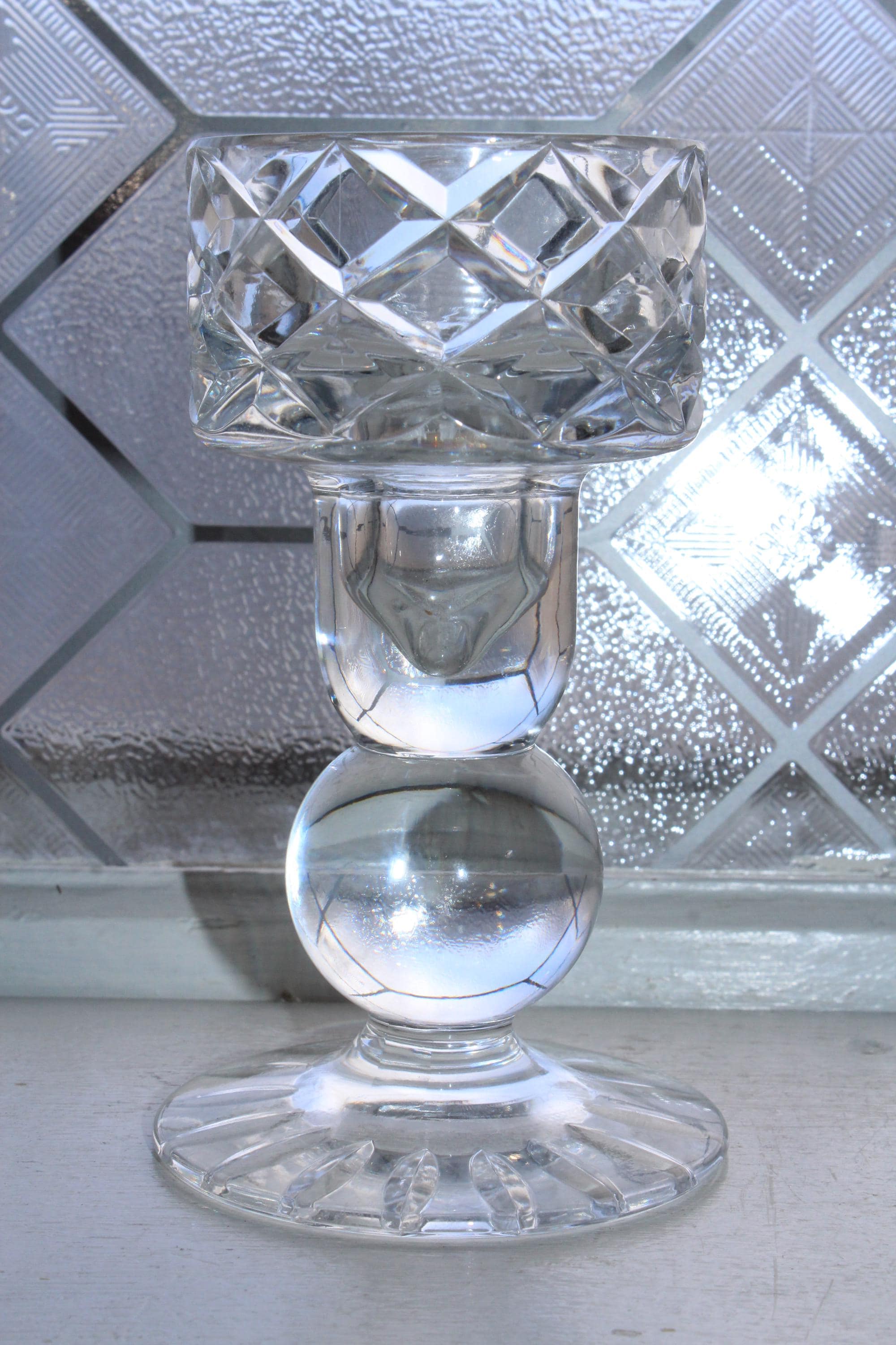Vintage BLOCK lead crystal Olympic dual use taper or pillar candle holder with ball stem and diamond cut bowl, in excellent condition. It measures 5 7/8" high and the top interior is 2 1/2" wide. No chips or cracks, weight is 1 1/2 lbs. Enjoy!