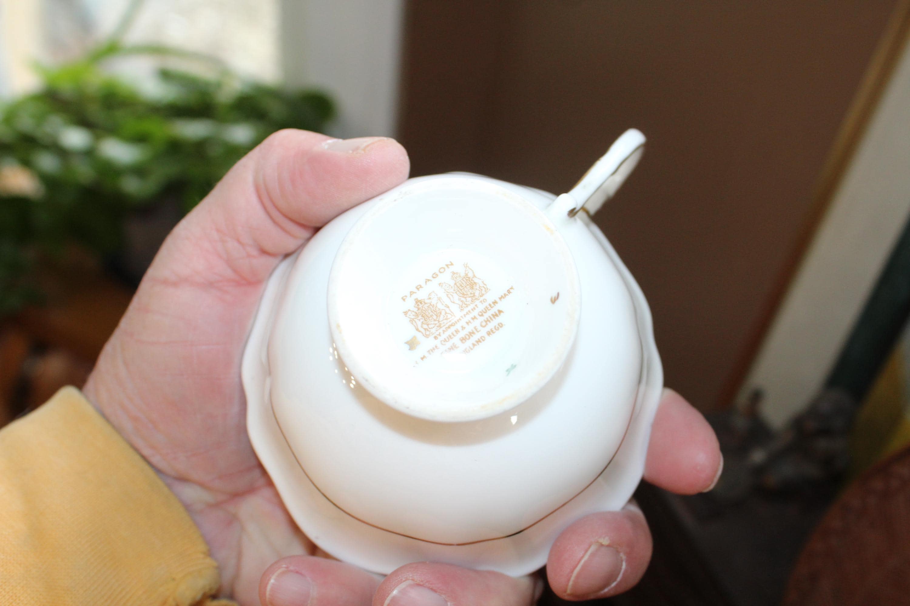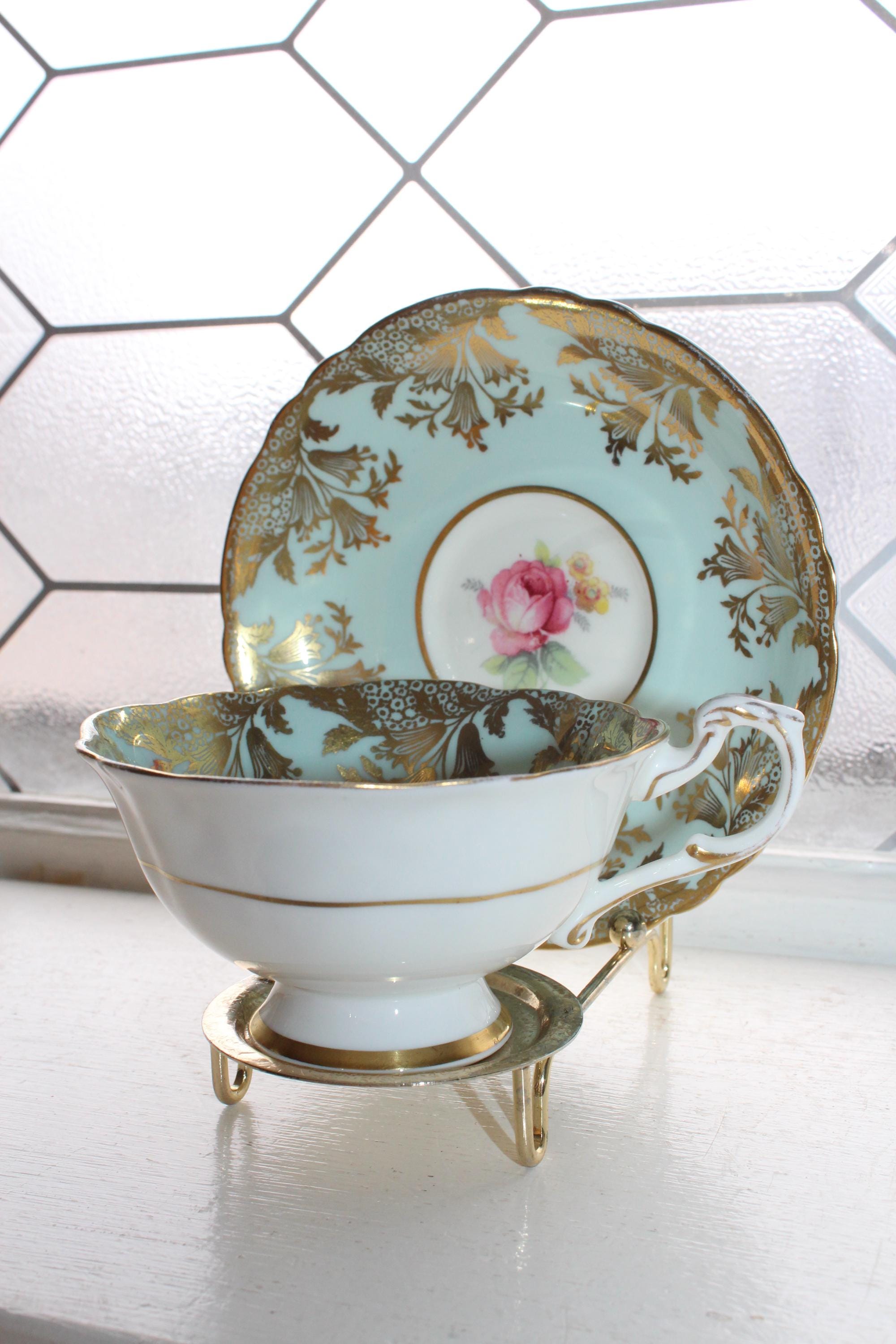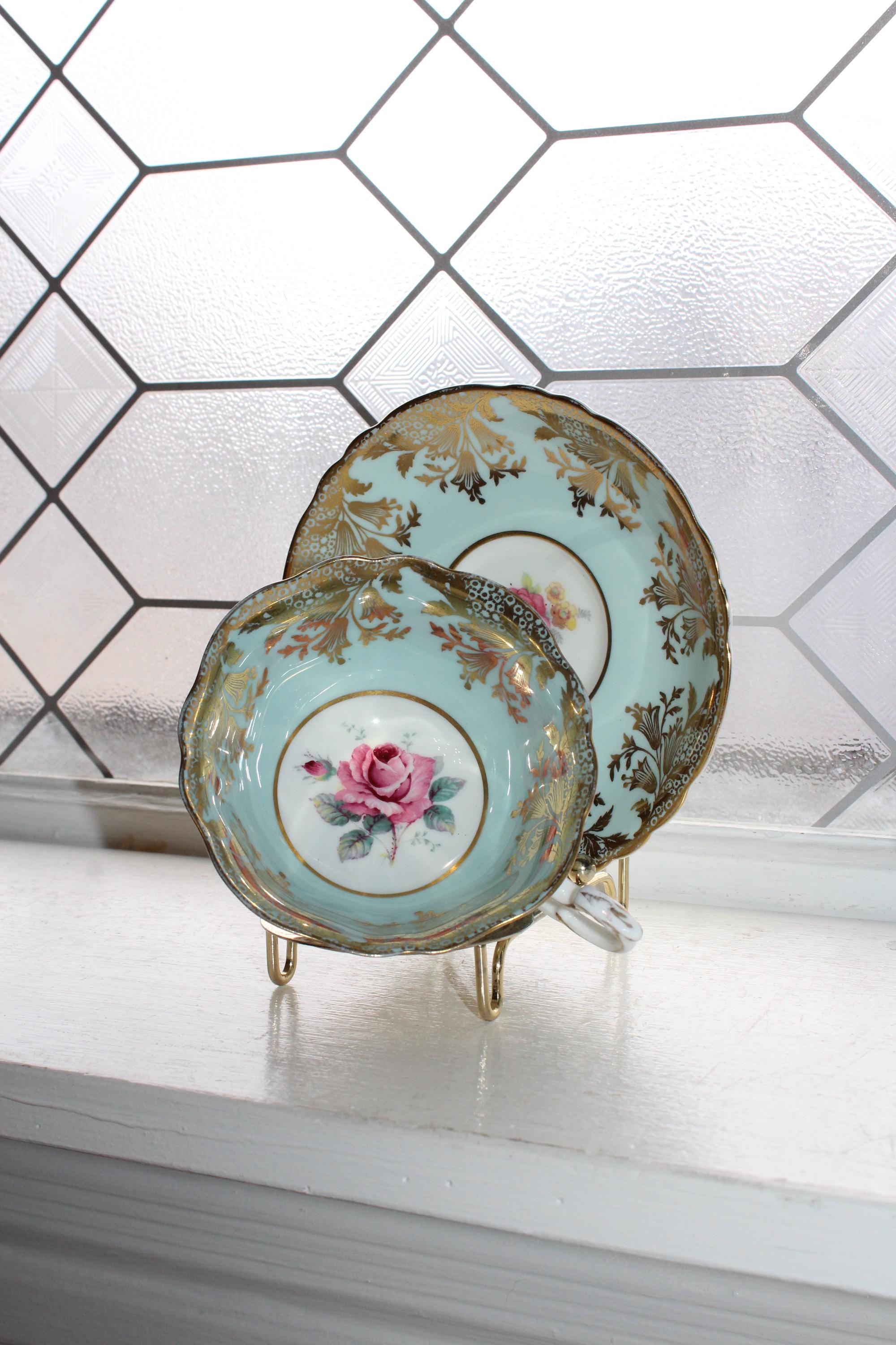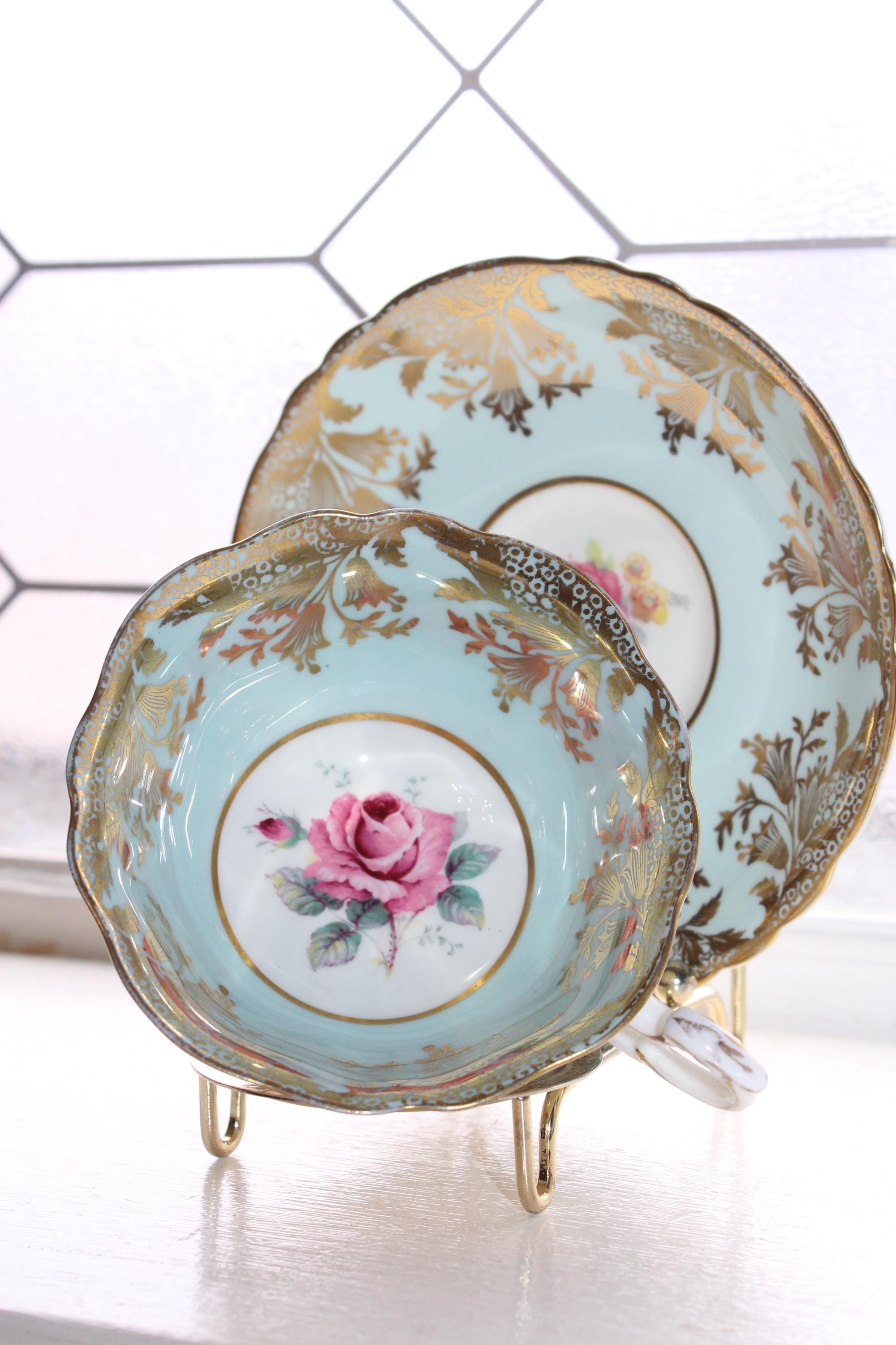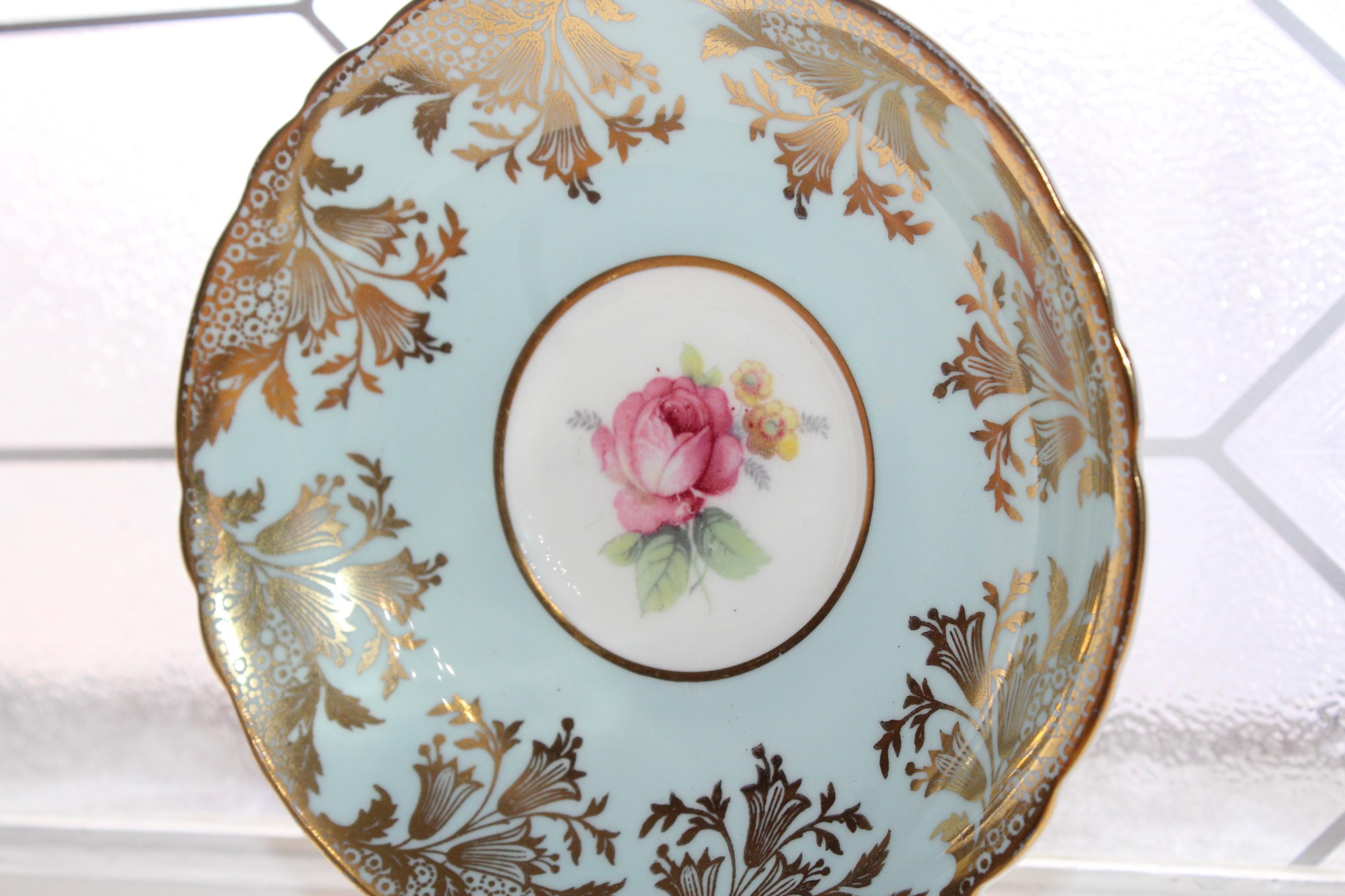 This vintage Paragon fine bone china tea cup and saucer set is just gorgeous! It is in excellent condition. It features beautiful pink roses and lots of gold lace trim on blue. The cup measures 2 1/8" high x 3 7/8" in diameter and the saucer measures 5 1/2" in diameter. No chips or cracks. Enjoy!