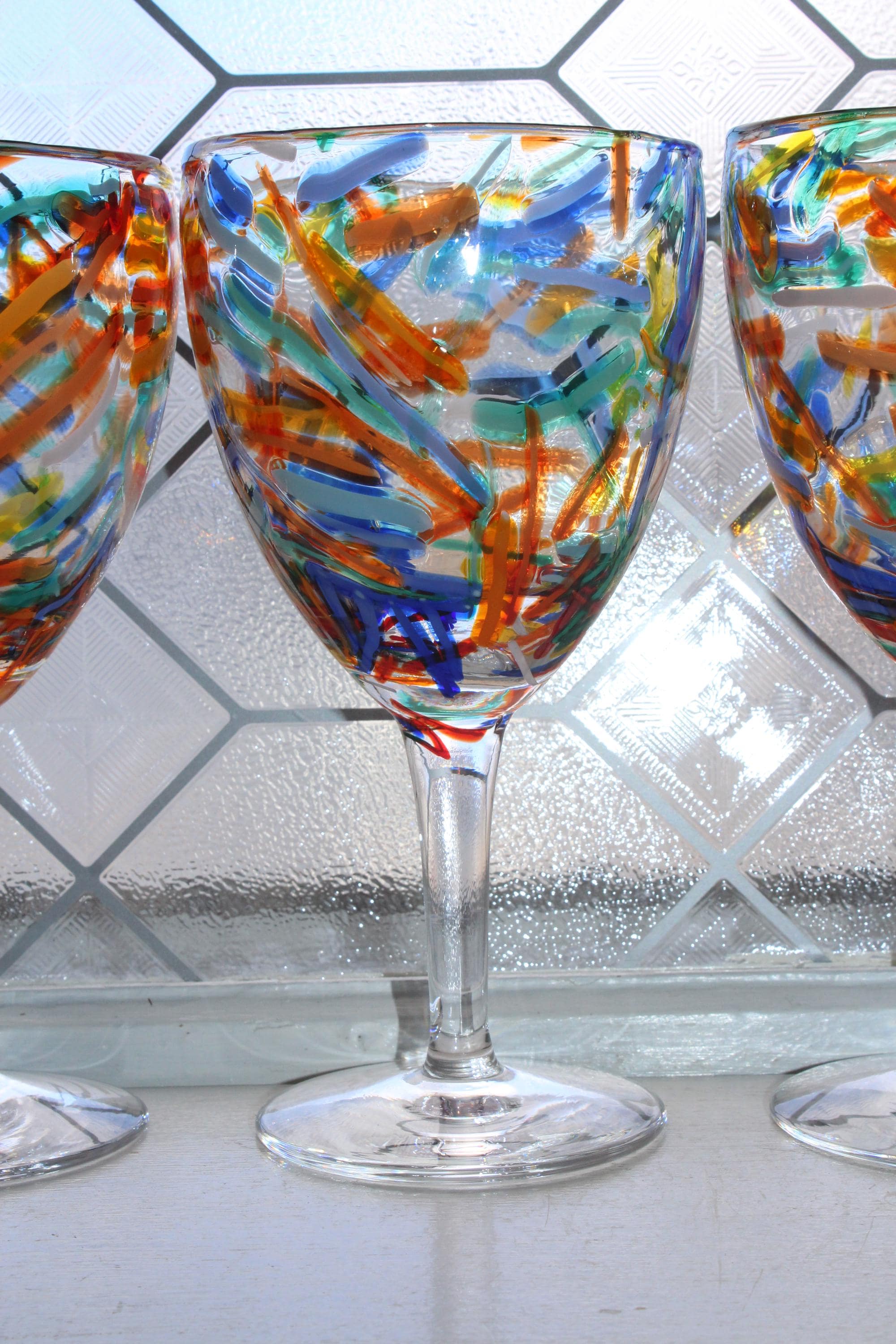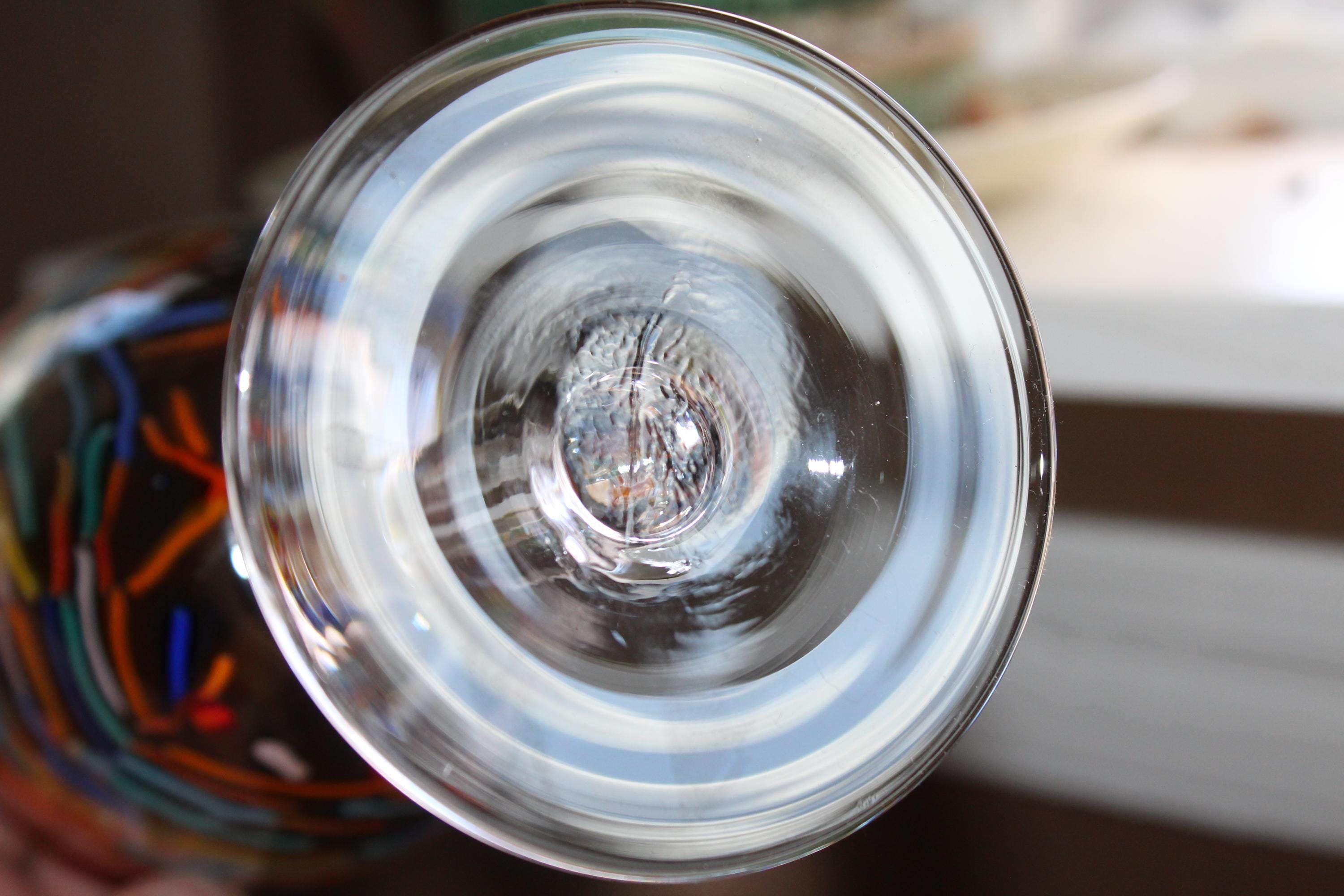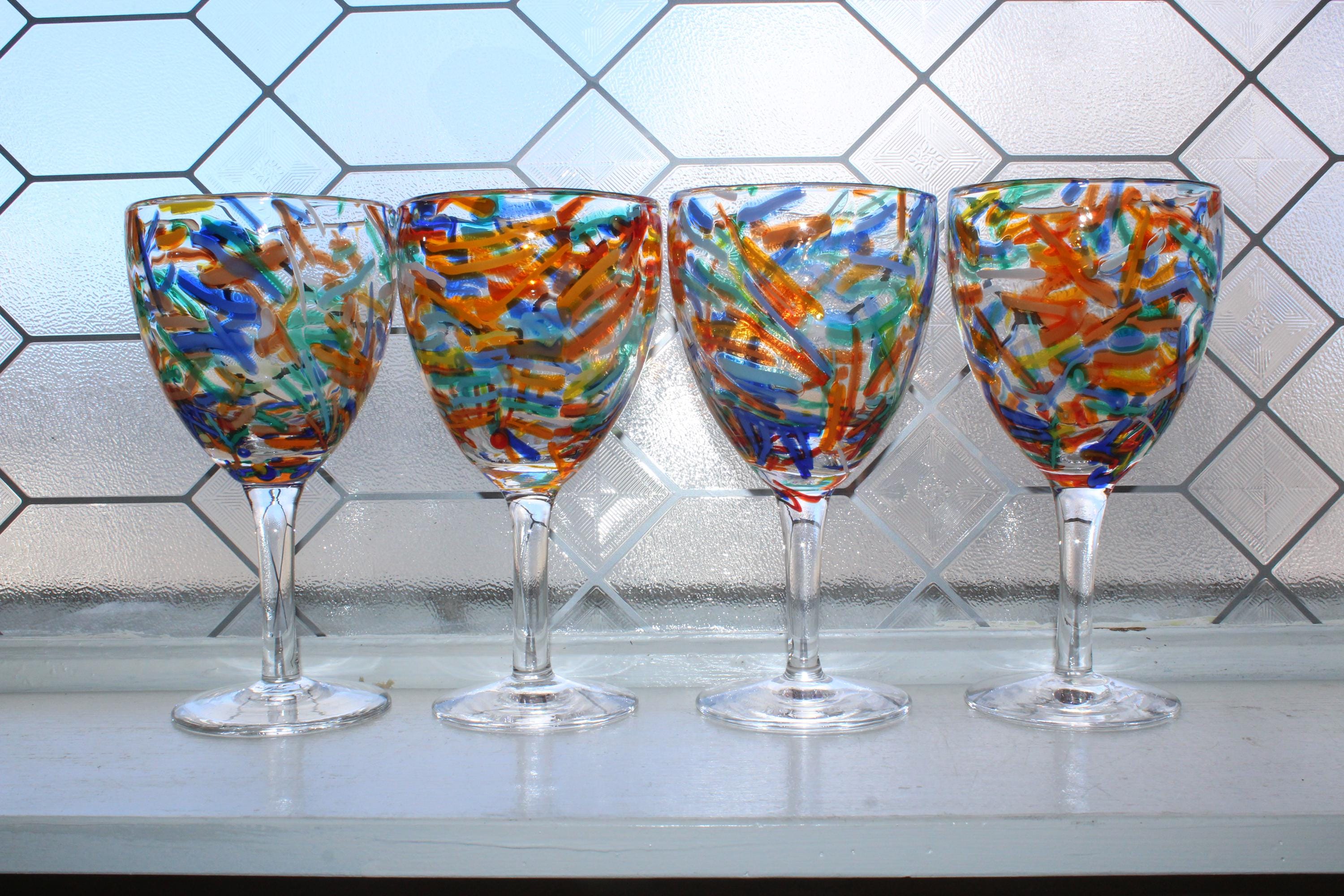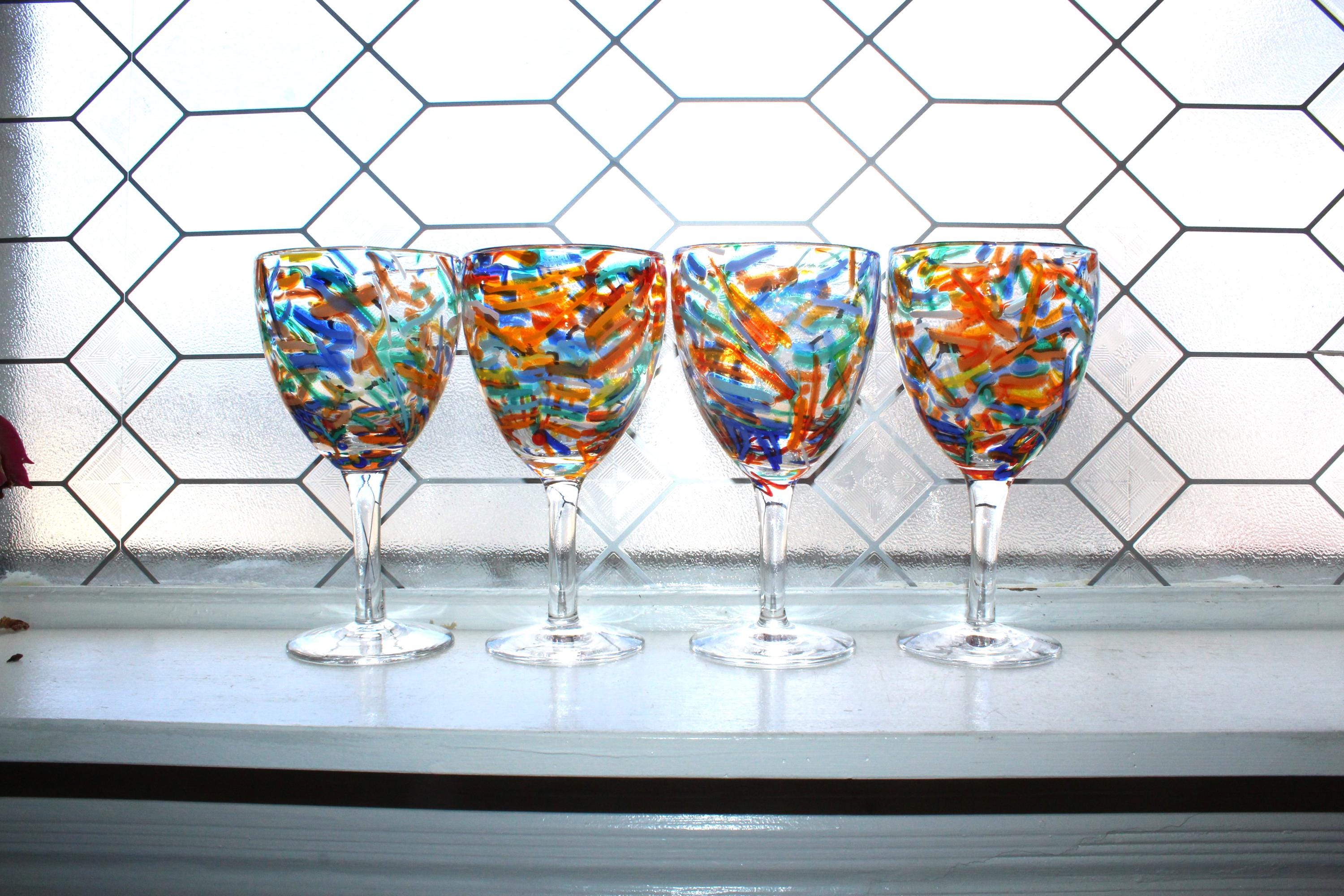 4 vintage Pier 1 Confetti glass goblets, in excellent condition. Each glass measures 8" high x 4 1/4" wide at the top. No chips or cracks, perfect for use or display. THERE ARE 2 SETS OF 4 AVAILABLE VIA THE DROP DOWN BOX. Enjoy!