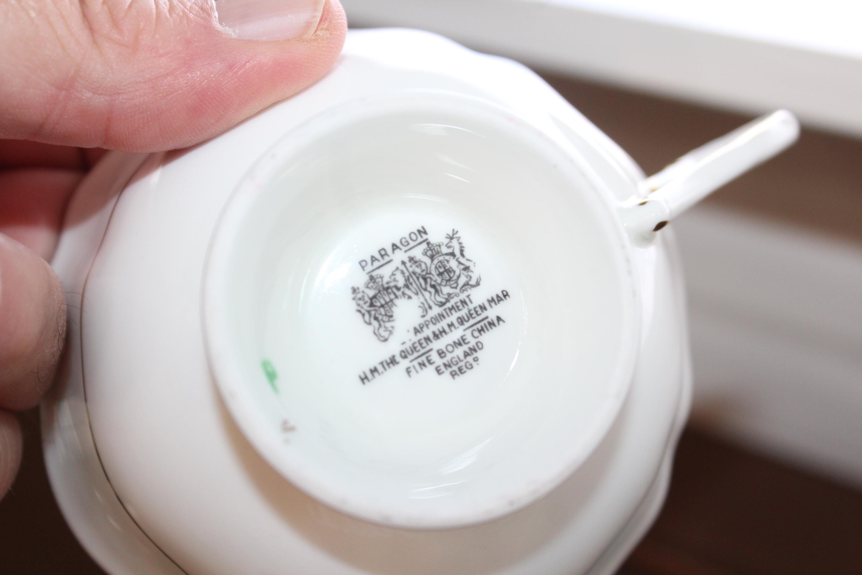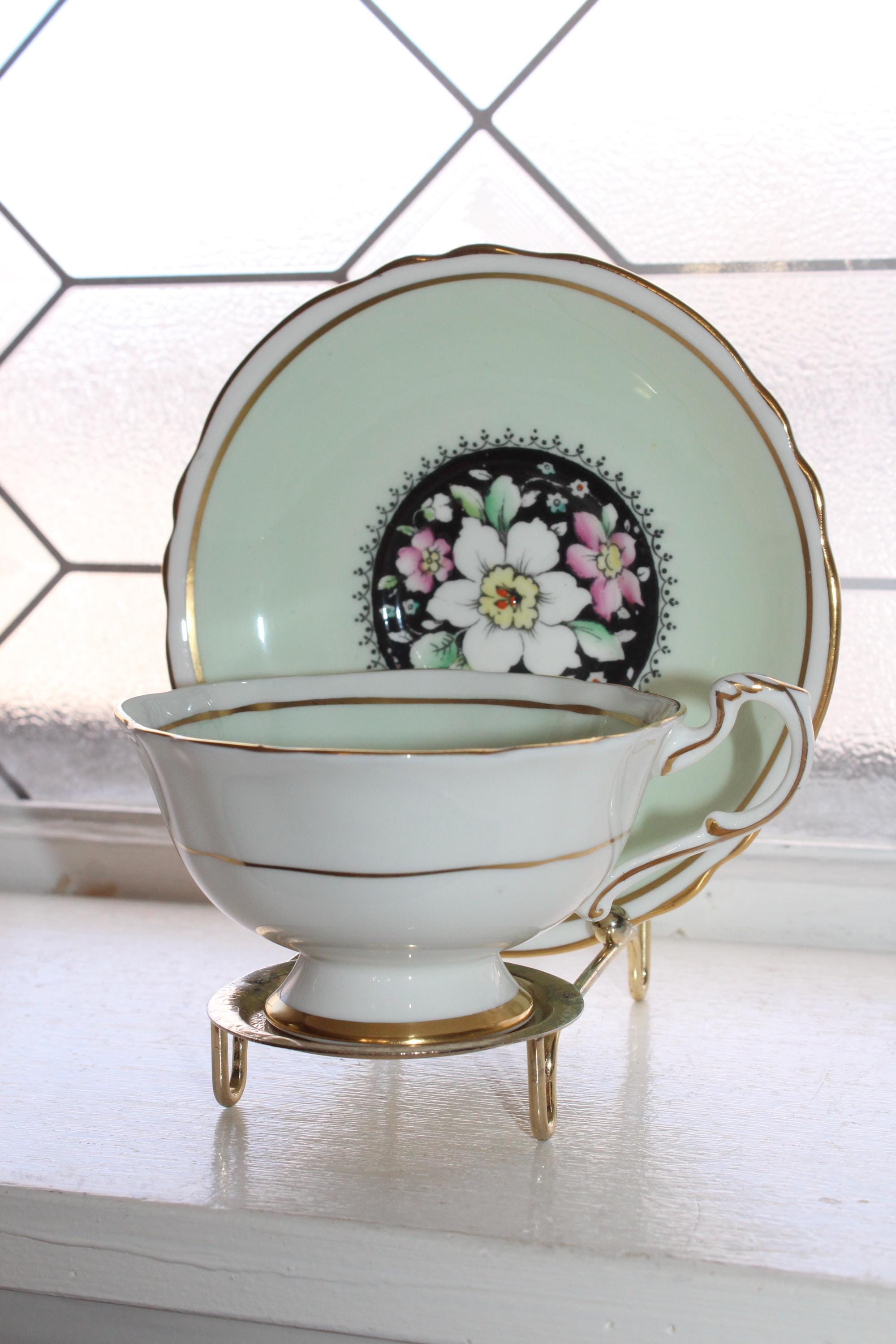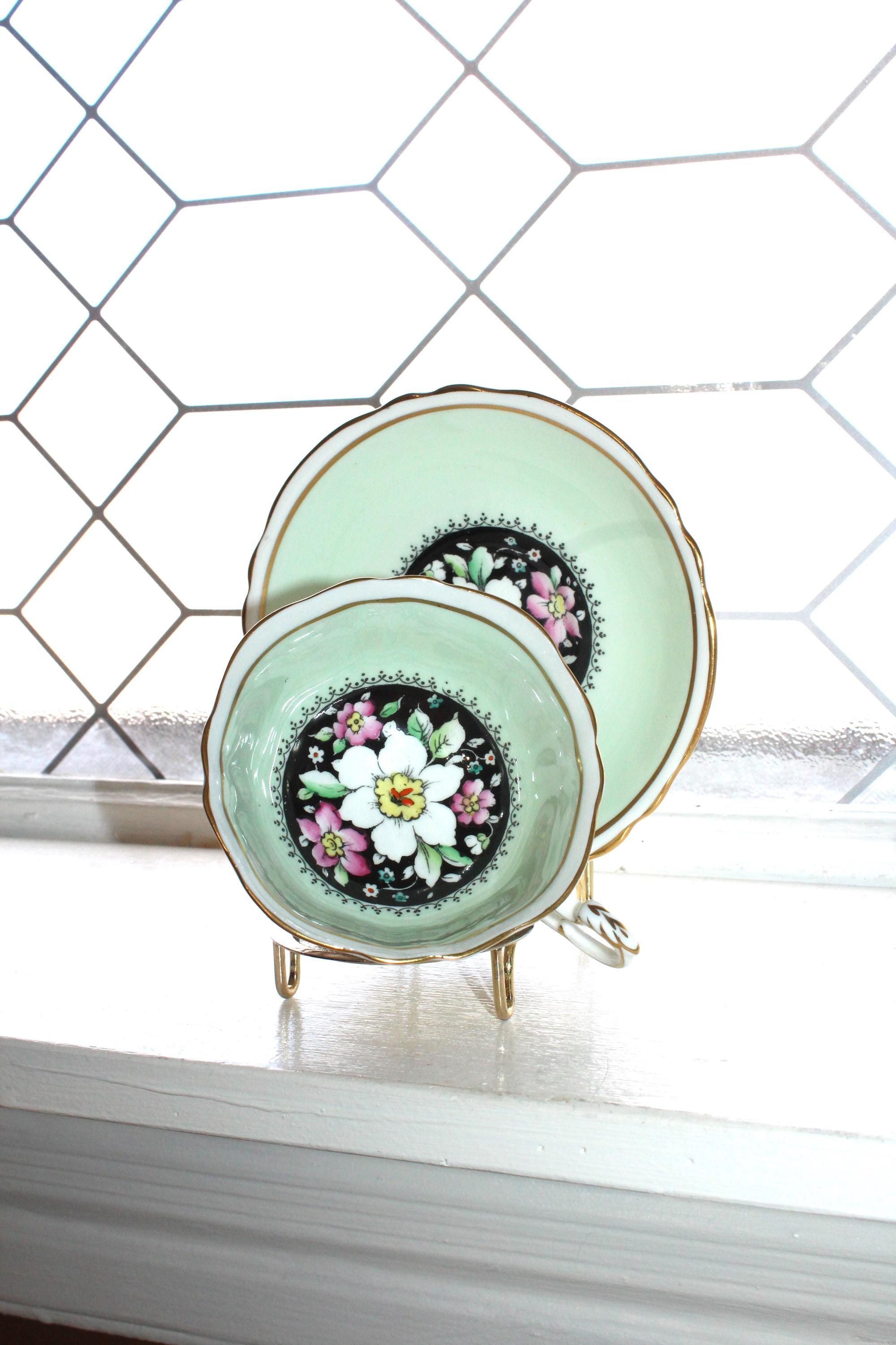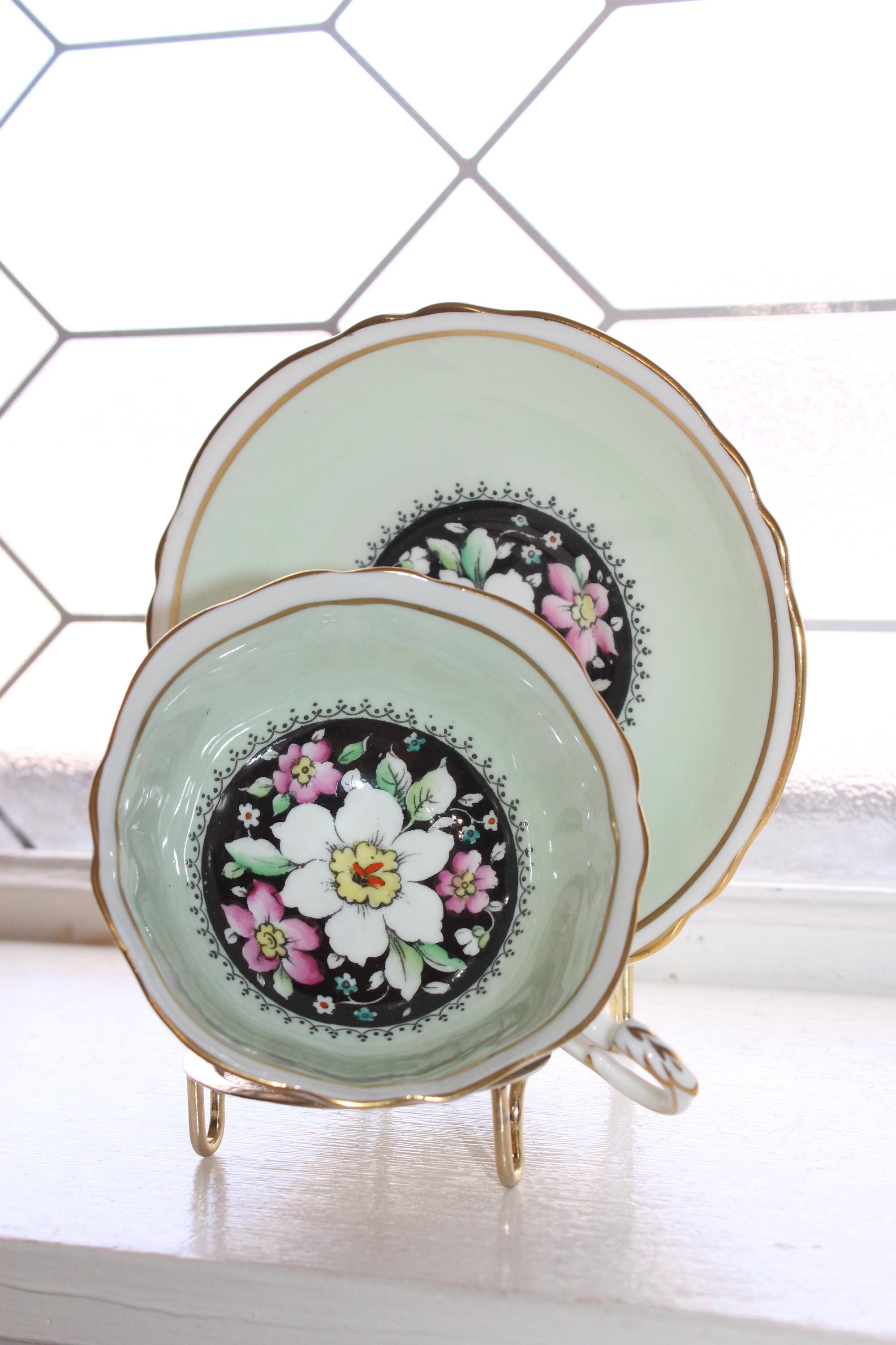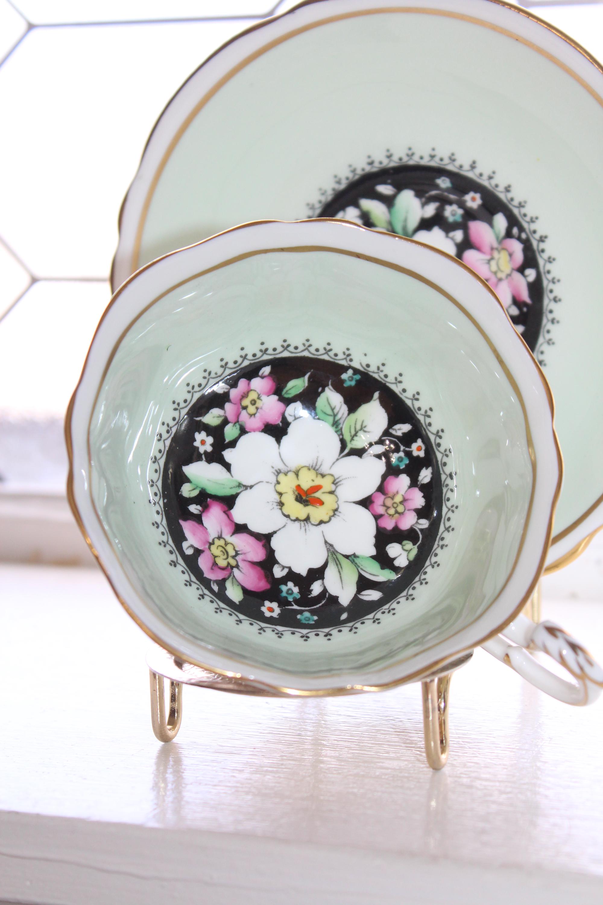 This vintage Paragon fine bone china tea cup and saucer set is just gorgeous! Made in England in the 1950s, it features flowers on black and mint green and is in excellent condition. The cup measures 2" high x 3 7/8" in diameter and the saucer measures 5 1/2" in diameter. There is no wear, no chips or cracks and it displays well. Enjoy!