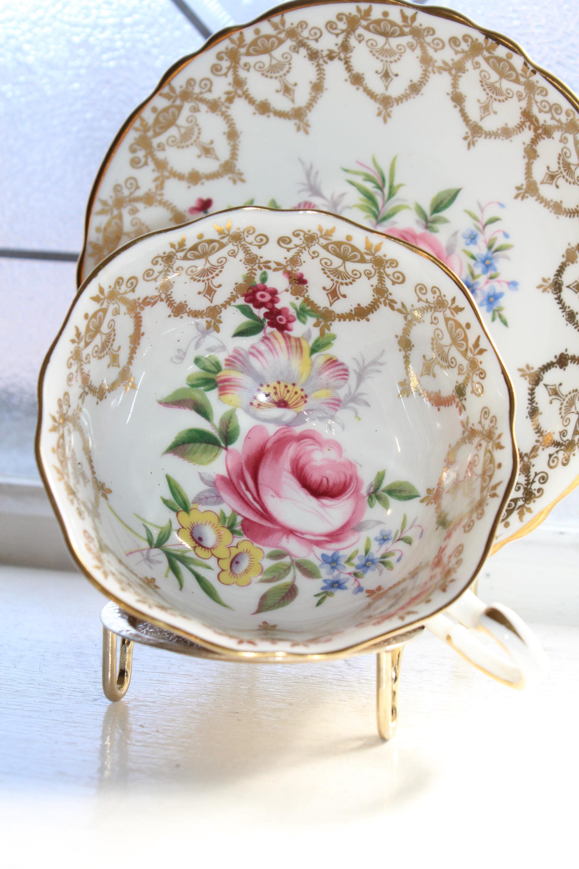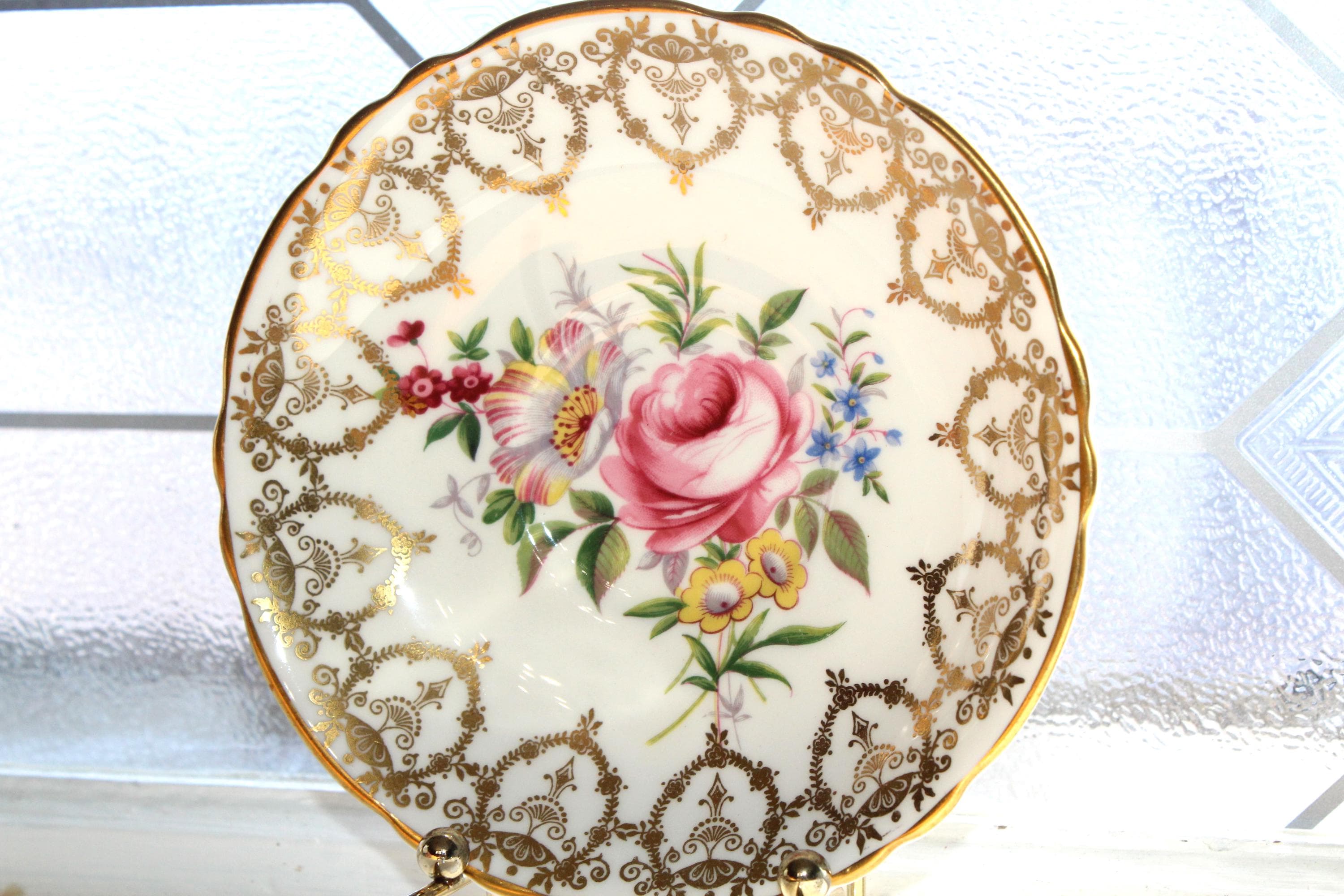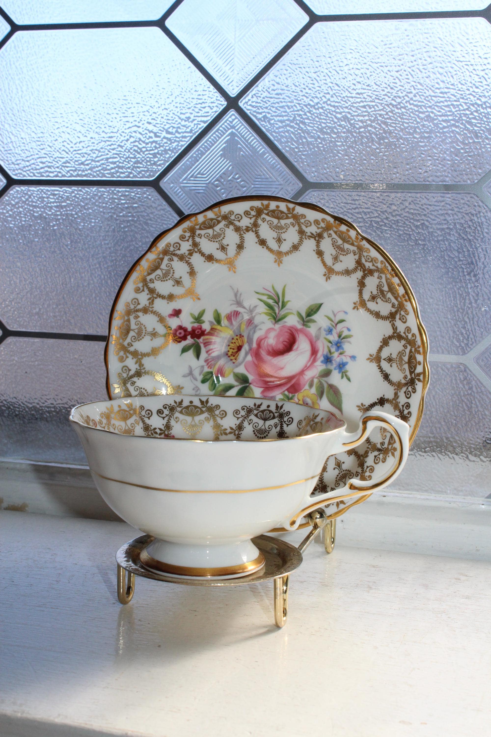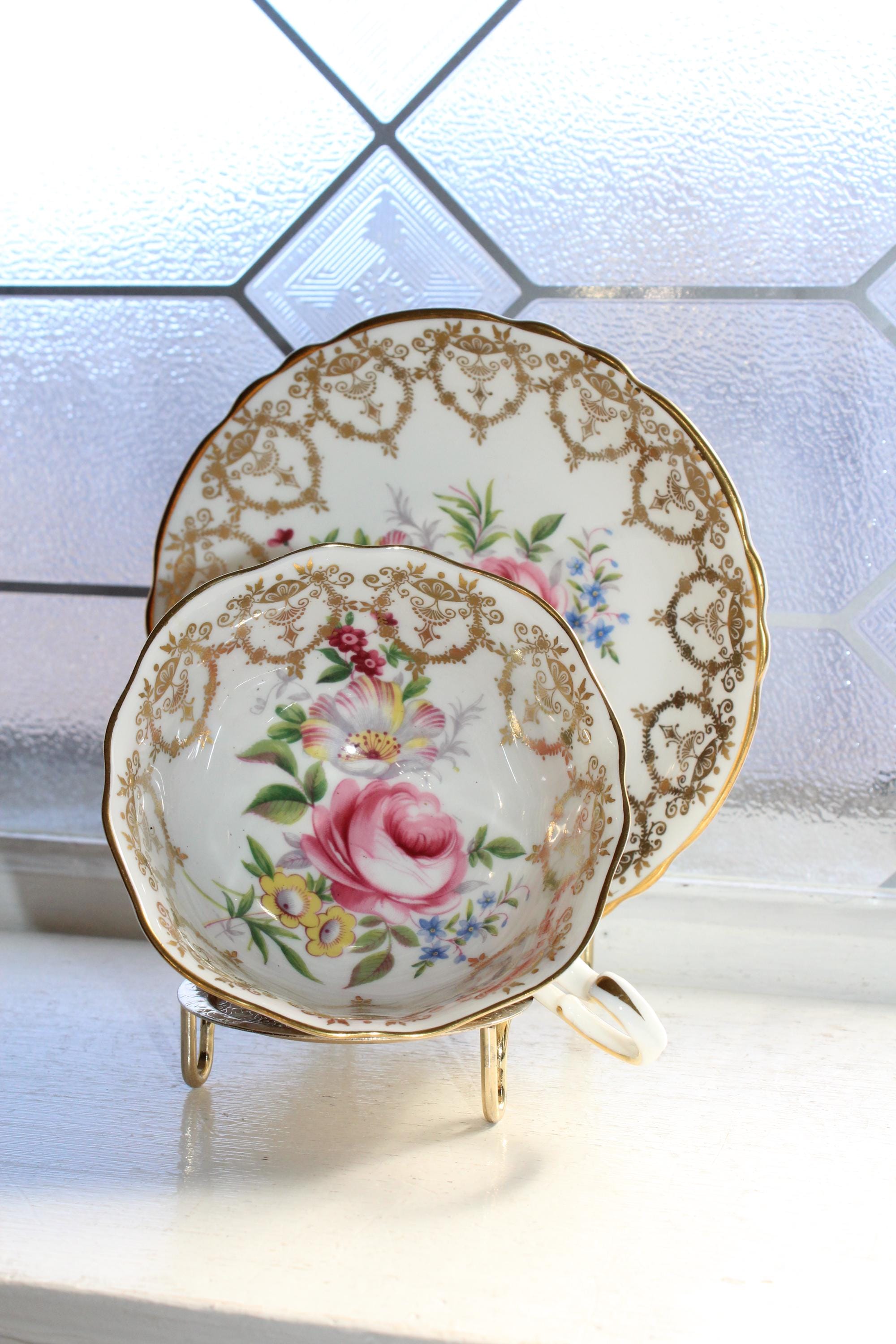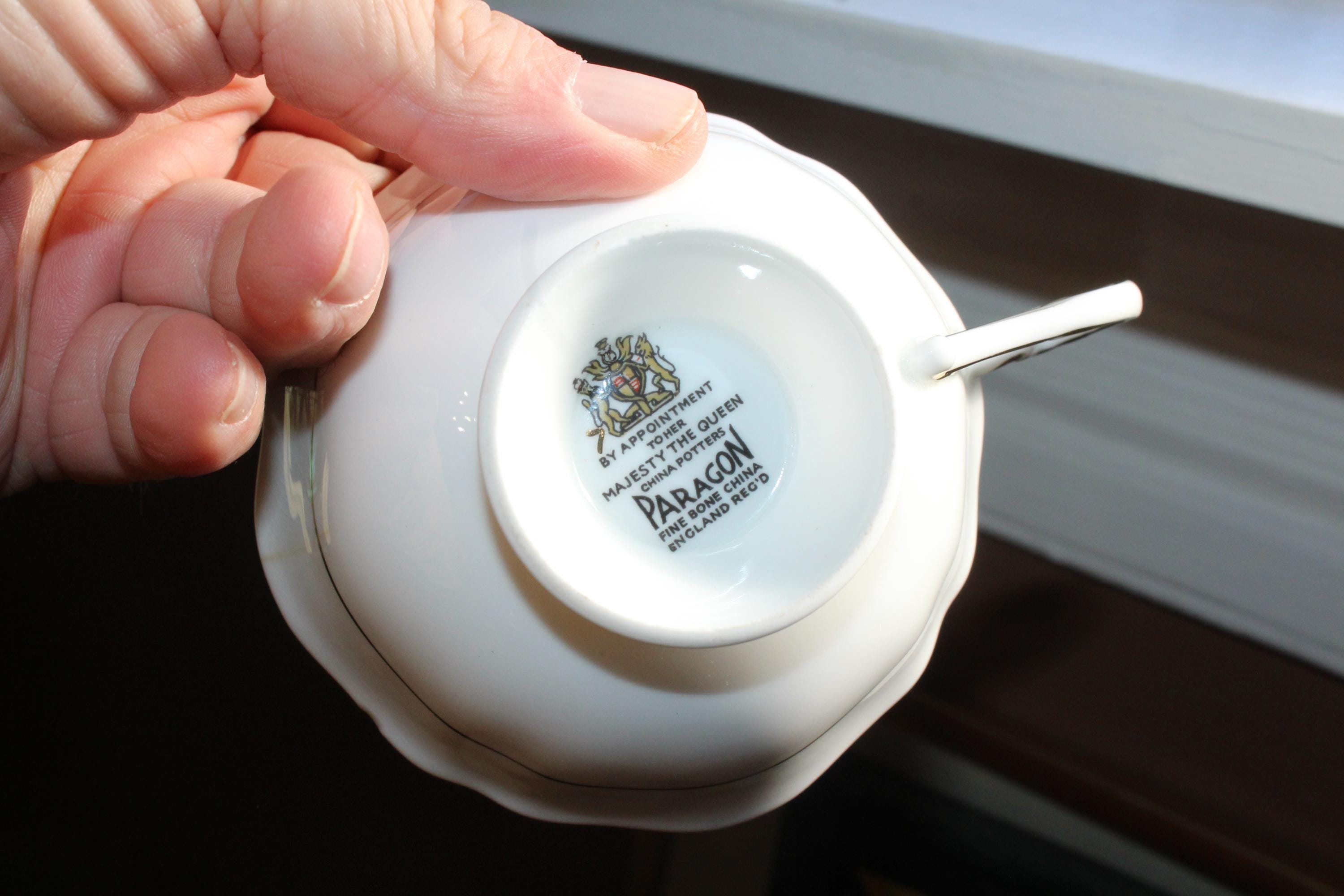 This vintage Paragon fine bone china tea cup and saucer set is just gorgeous! It is in excellent condition. It features beautiful pink cabbage roses and lots of gold trim. The cup measures 3" high x 3 3/4" in diameter and the saucer measures 5 1/2" in diameter. No chips or cracks. Enjoy!