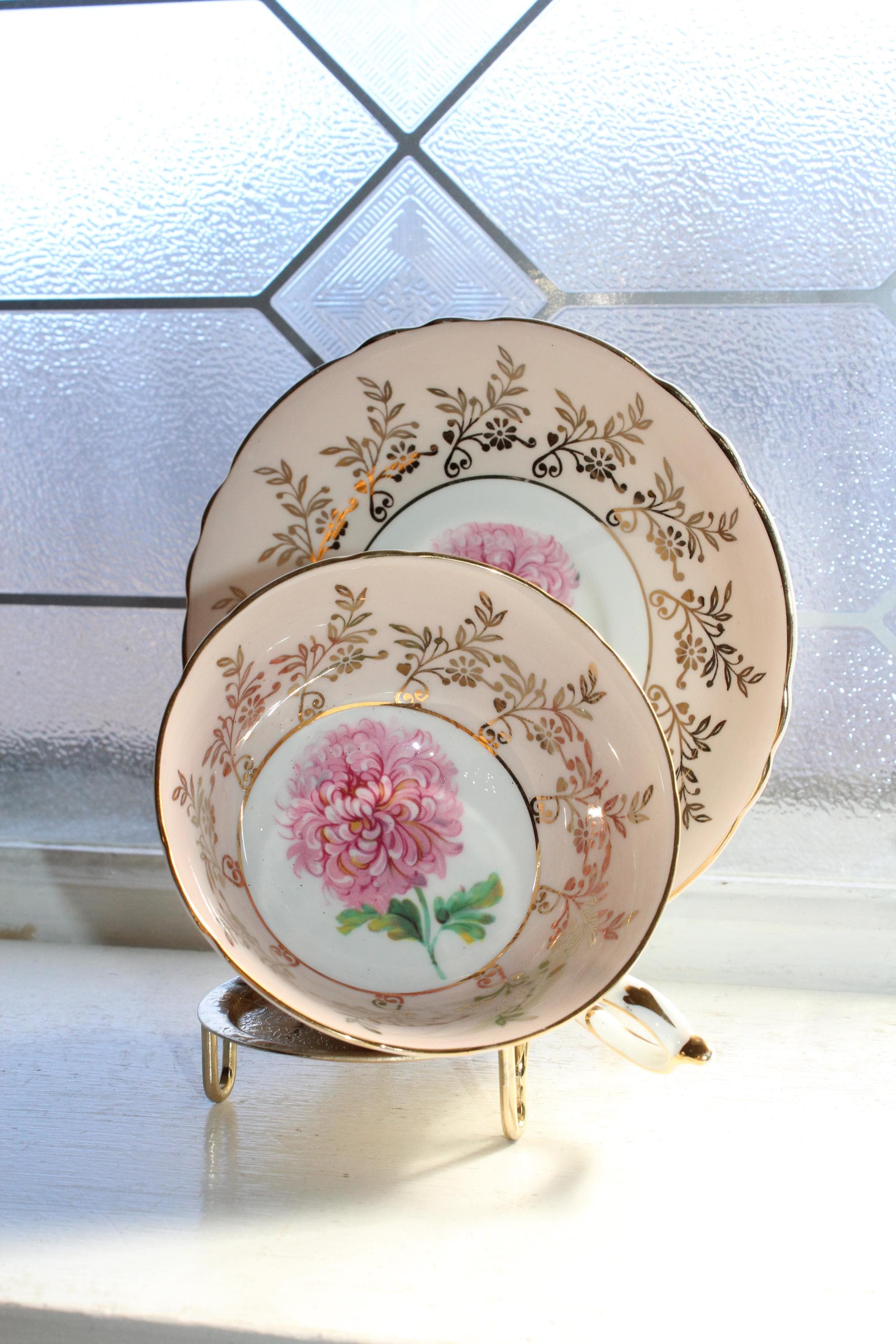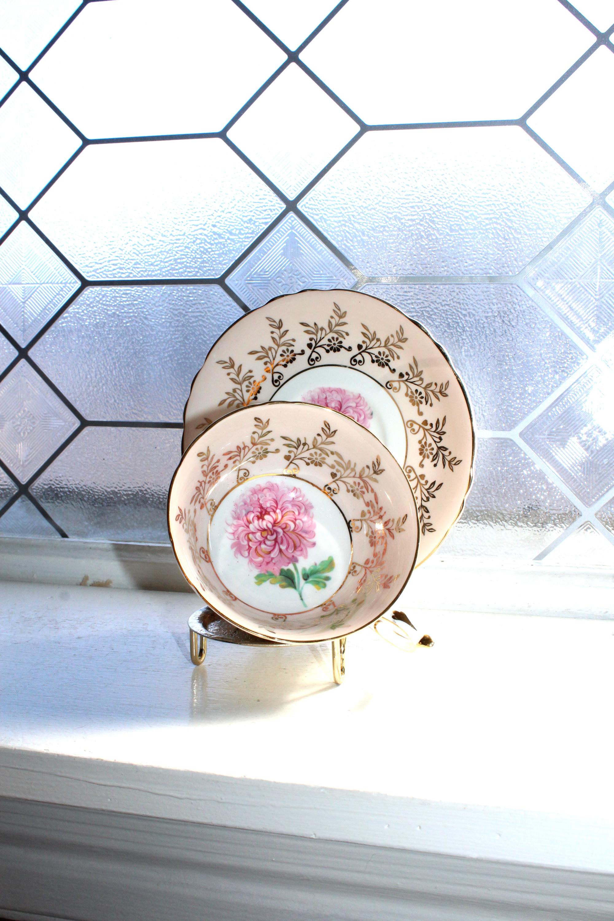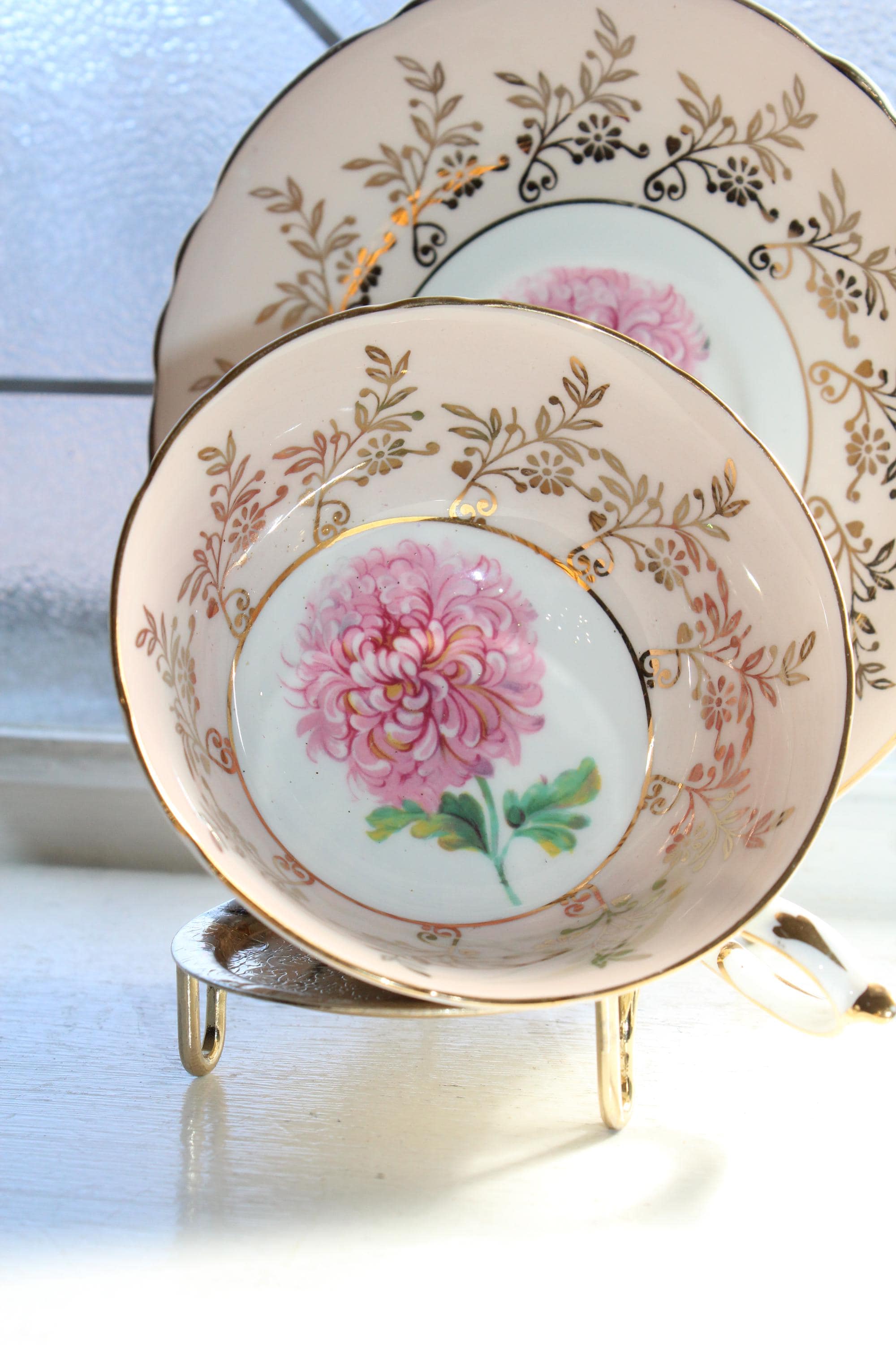 This vintage Paragon fine bone china tea cup and saucer set is just gorgeous! It is in excellent condition. It features beautiful pink Aster chrysanthemum and lots of gold trim. The cup measures 3" high x 3 3/4" in diameter and the saucer measures 5 1/2" in diameter. No chips or cracks. Enjoy!