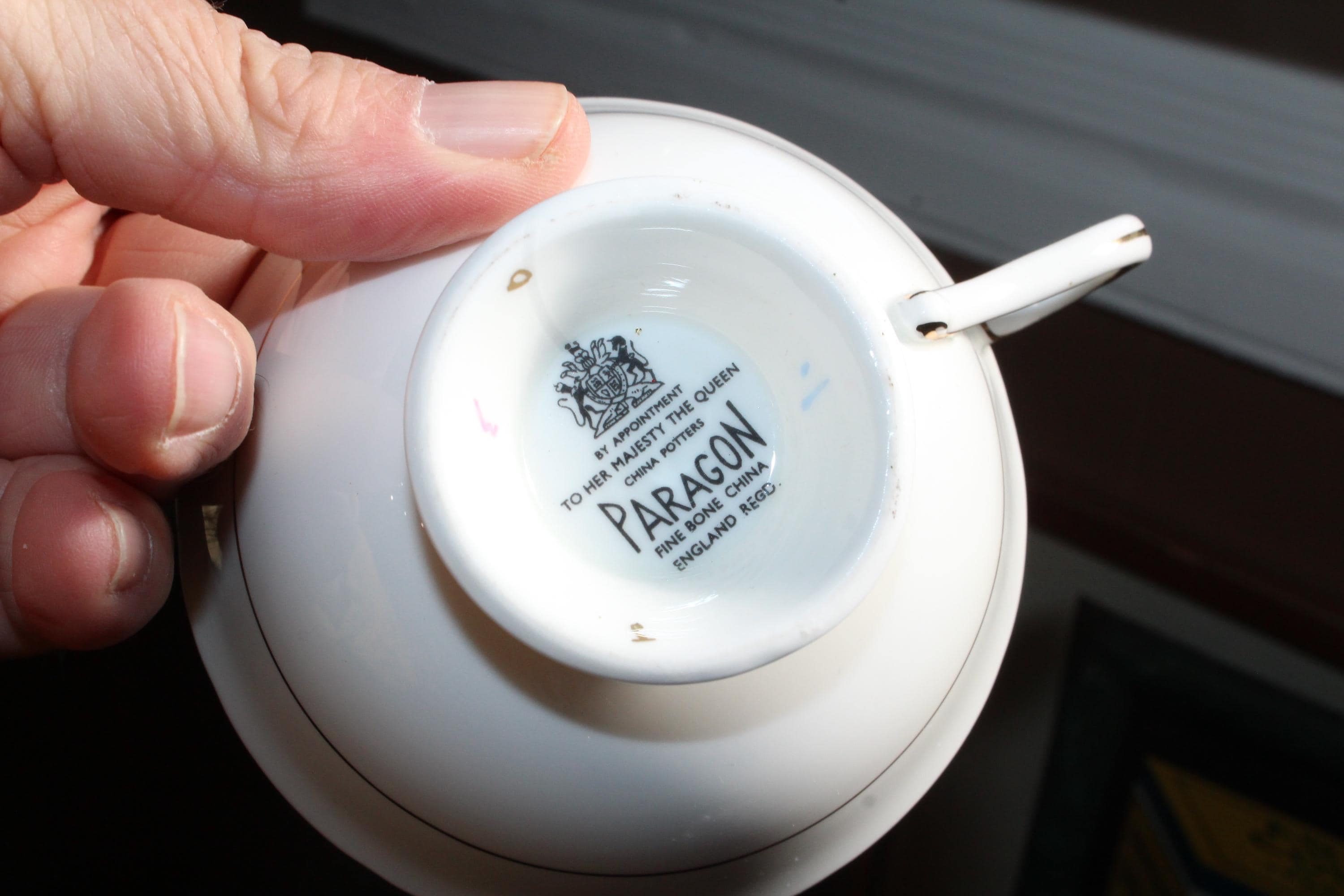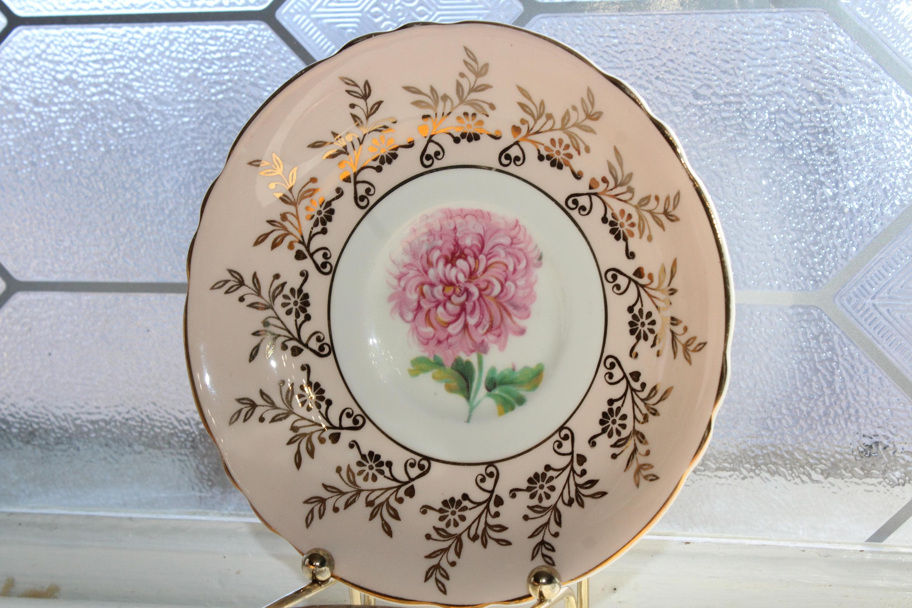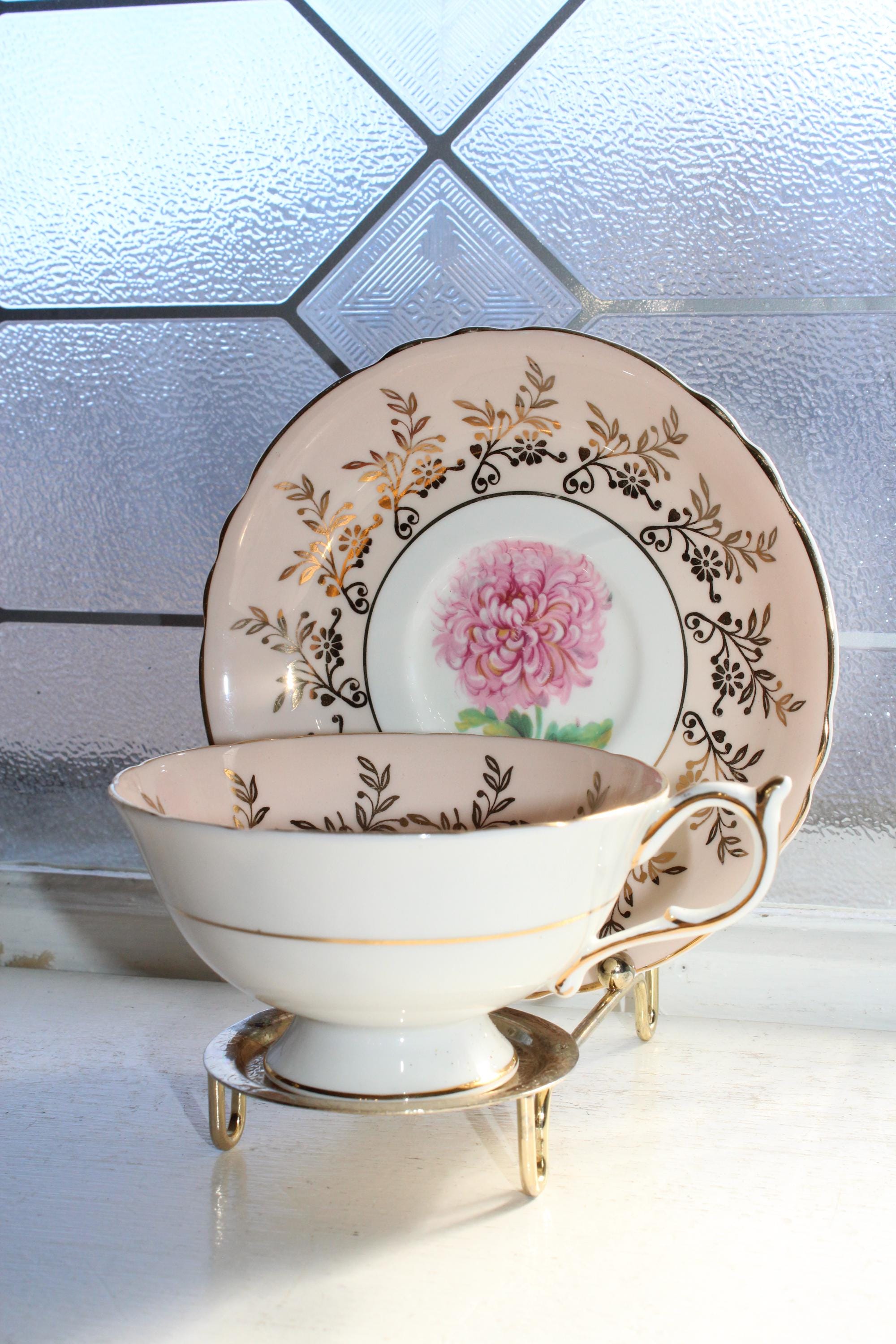 This vintage Paragon fine bone china tea cup and saucer set is just gorgeous! It is in excellent condition. It features beautiful pink Aster chrysanthemum and lots of gold trim. The cup measures 3" high x 3 3/4" in diameter and the saucer measures 5 1/2" in diameter. No chips or cracks. Enjoy!
