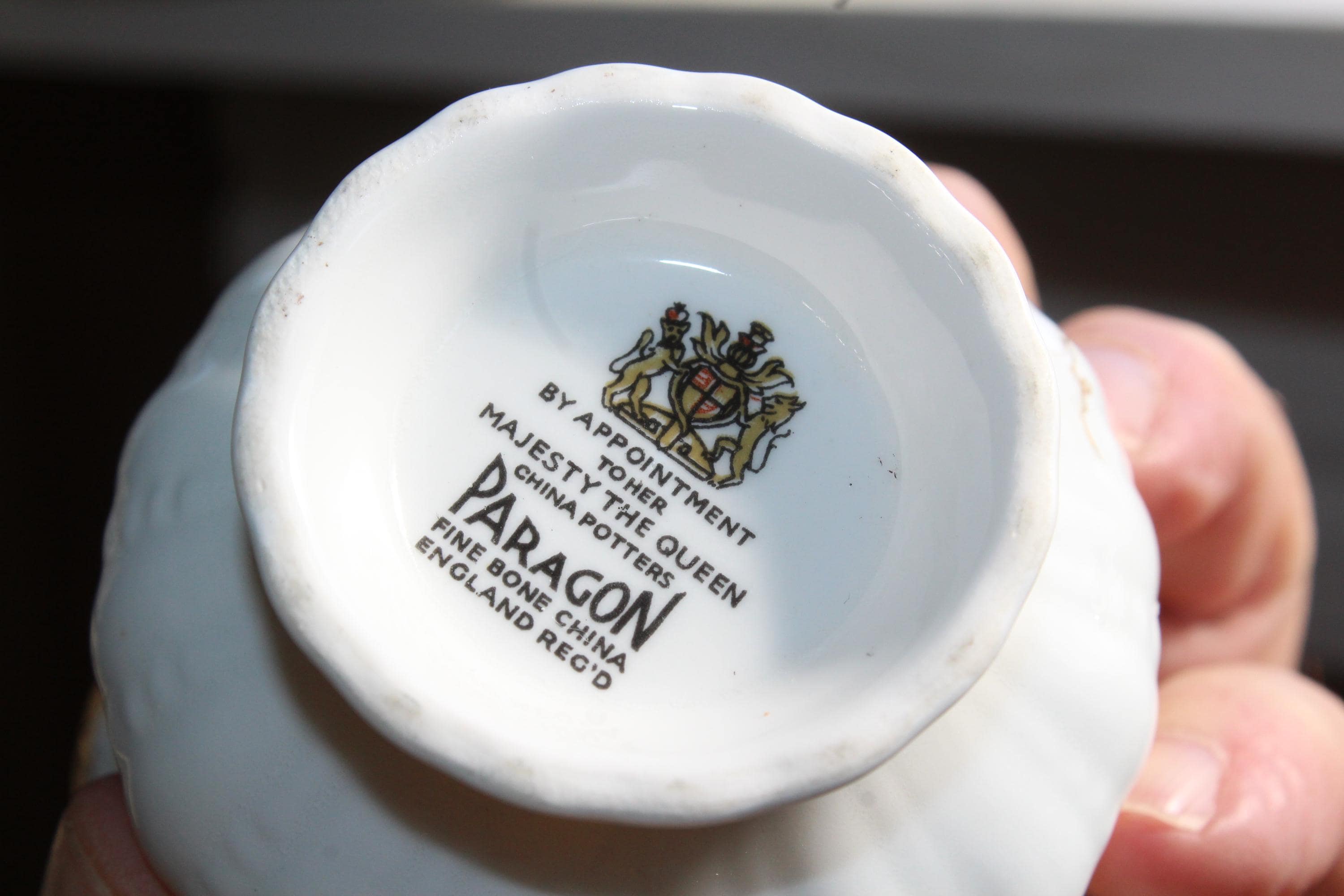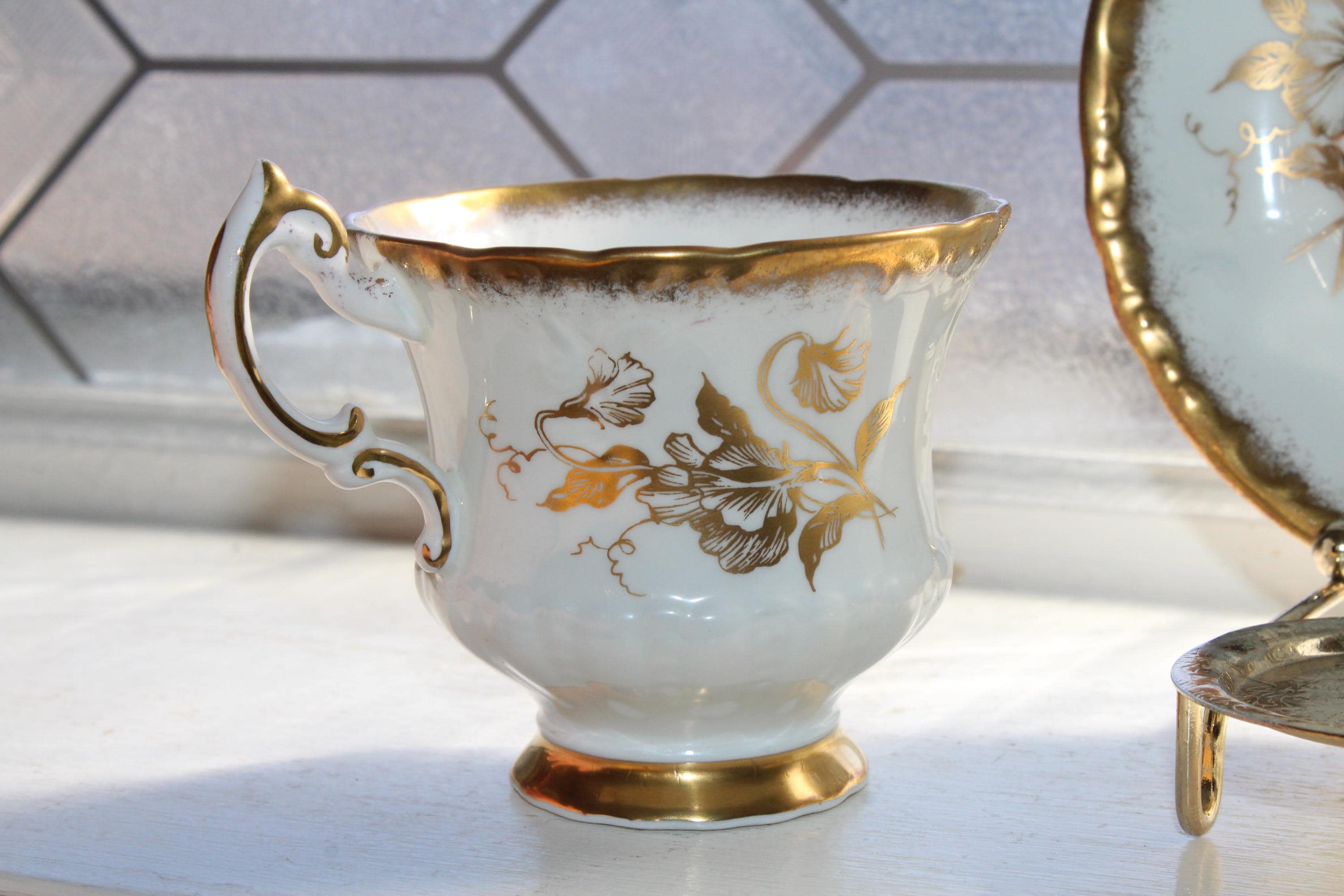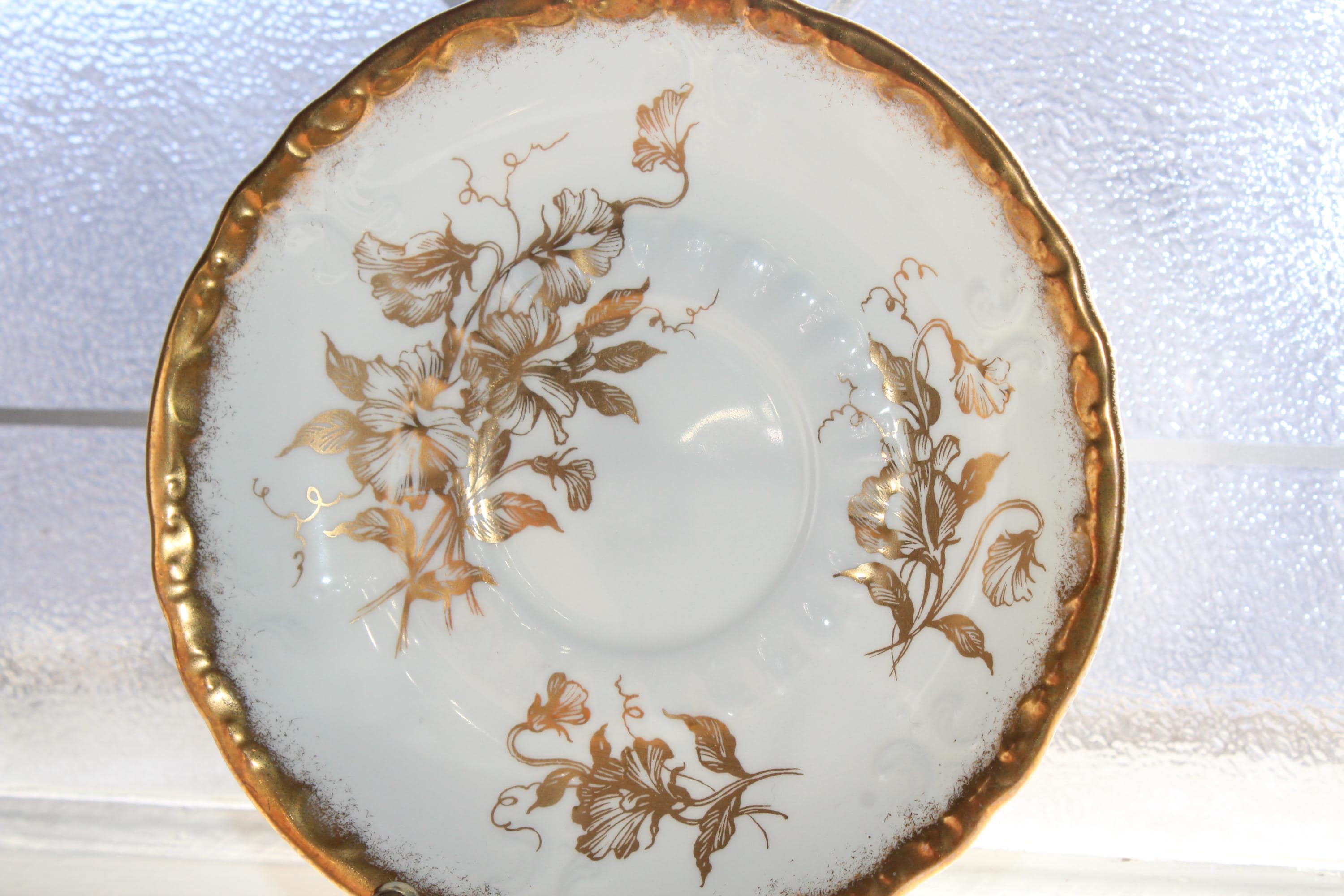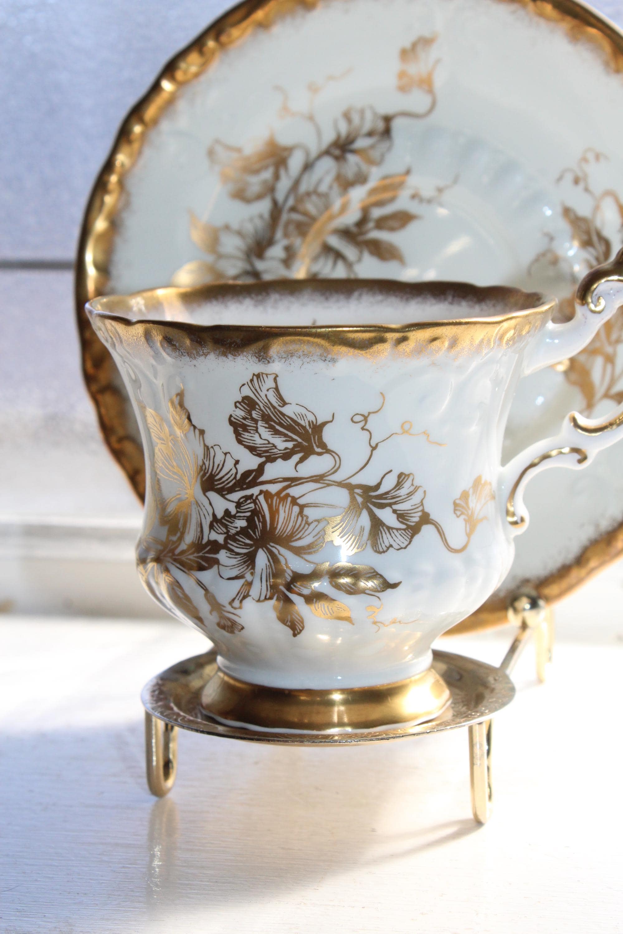 This vintage Paragon Golden Glory fine bone china tea cup and saucer set is just gorgeous! It is in excellent condition.The cup measures 2 7/8" high x 3 1/4" in diameter and the saucer measures 5 1/2" in diameter. No chips or cracks. Enjoy!