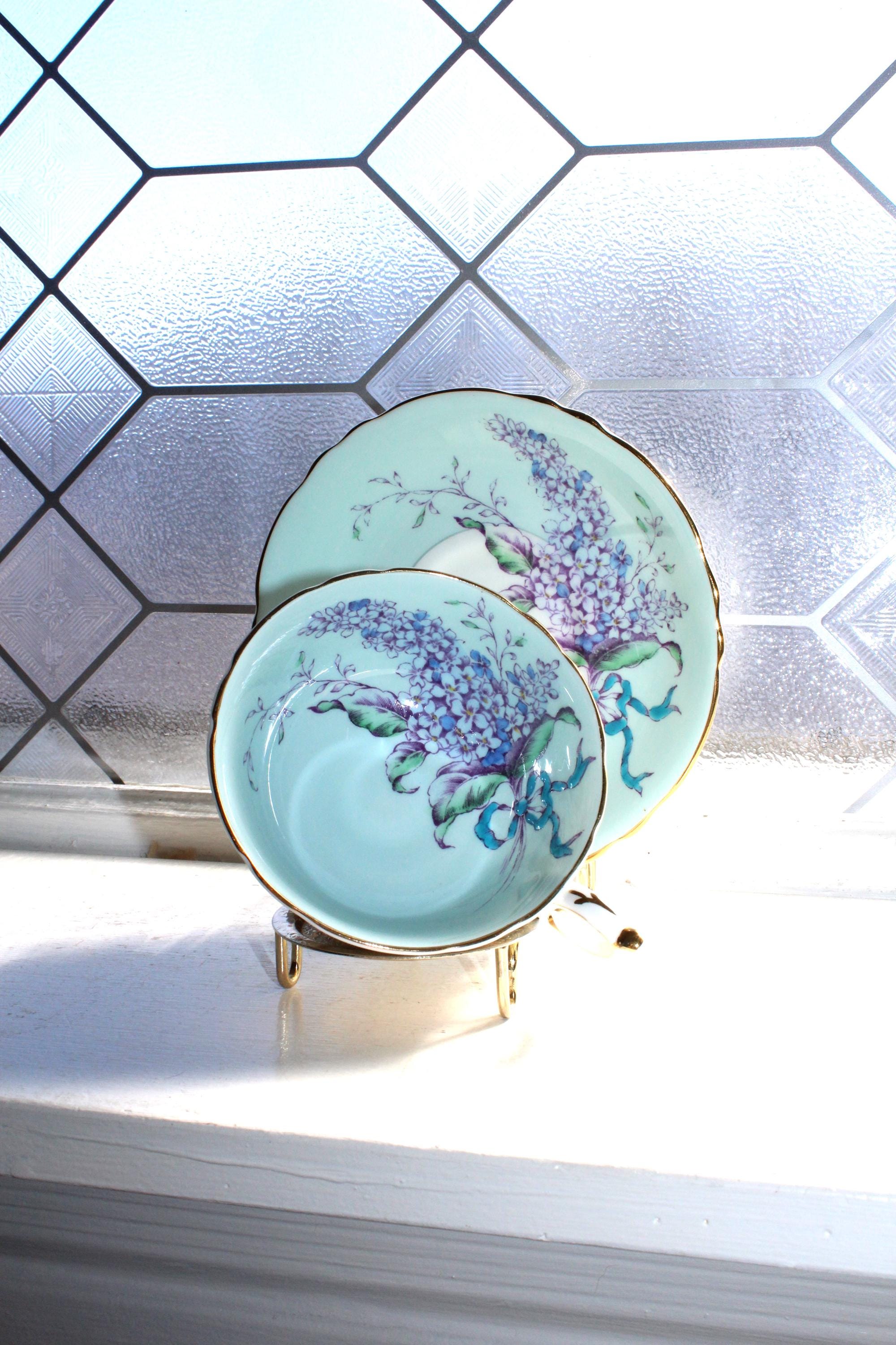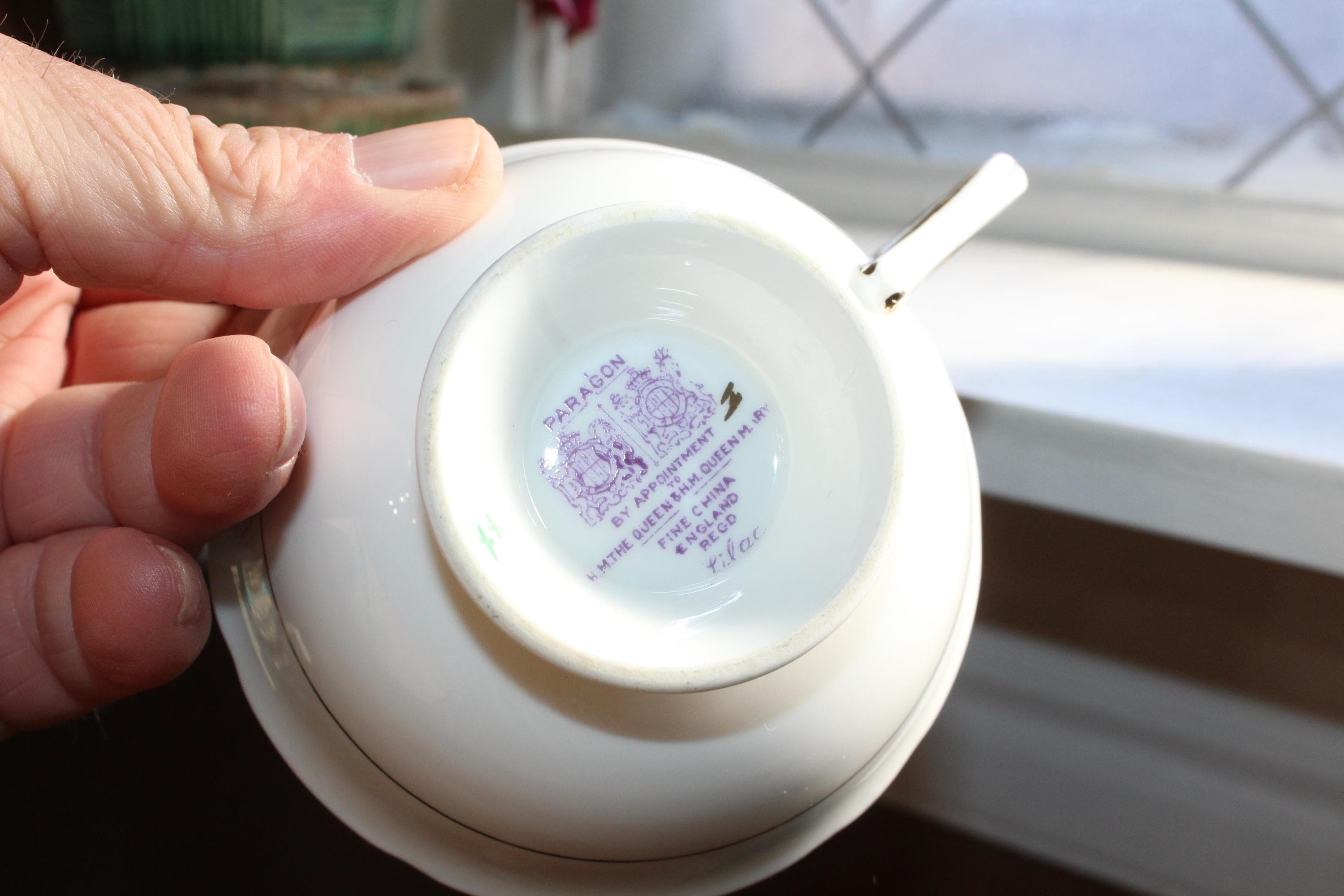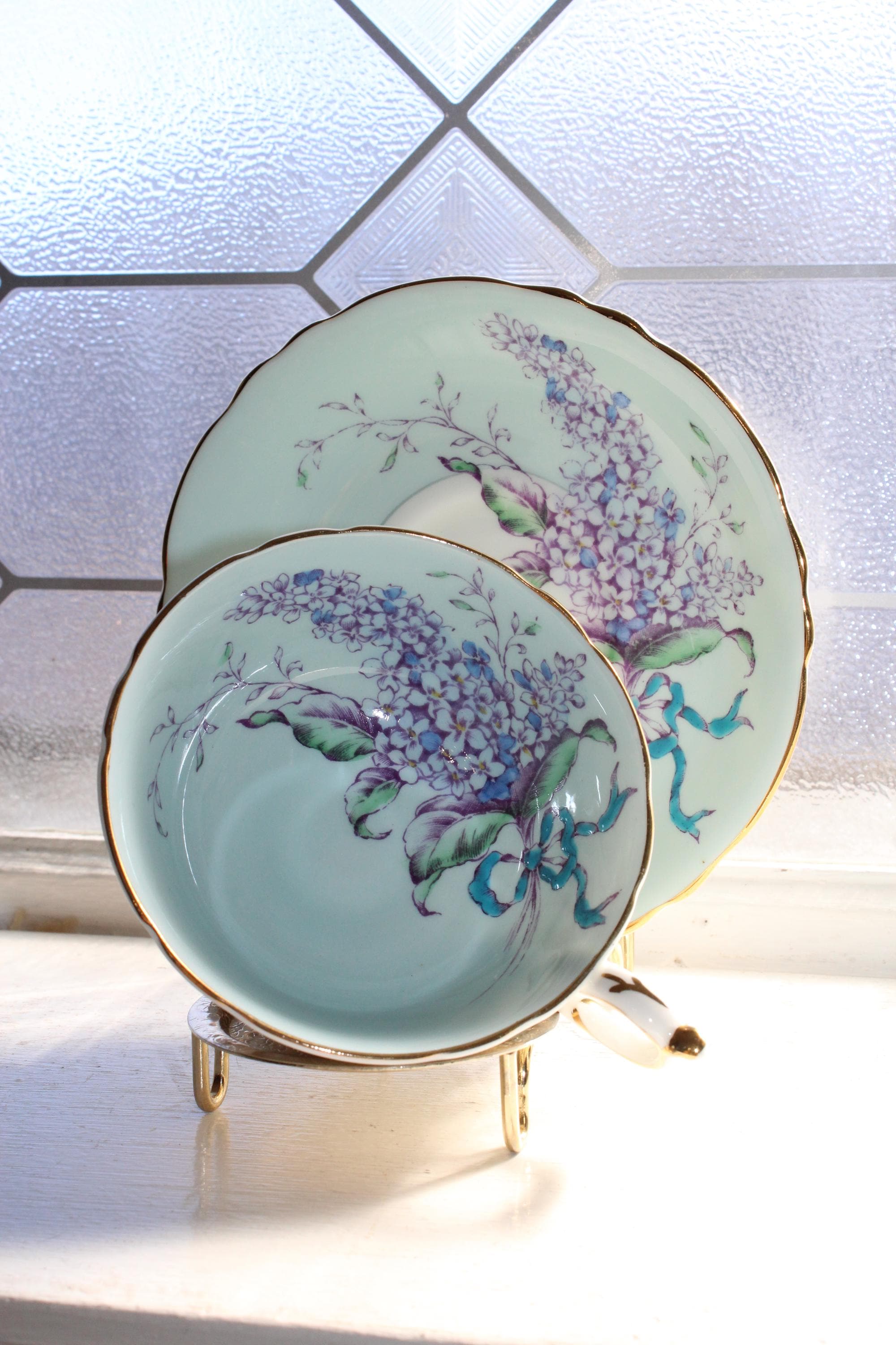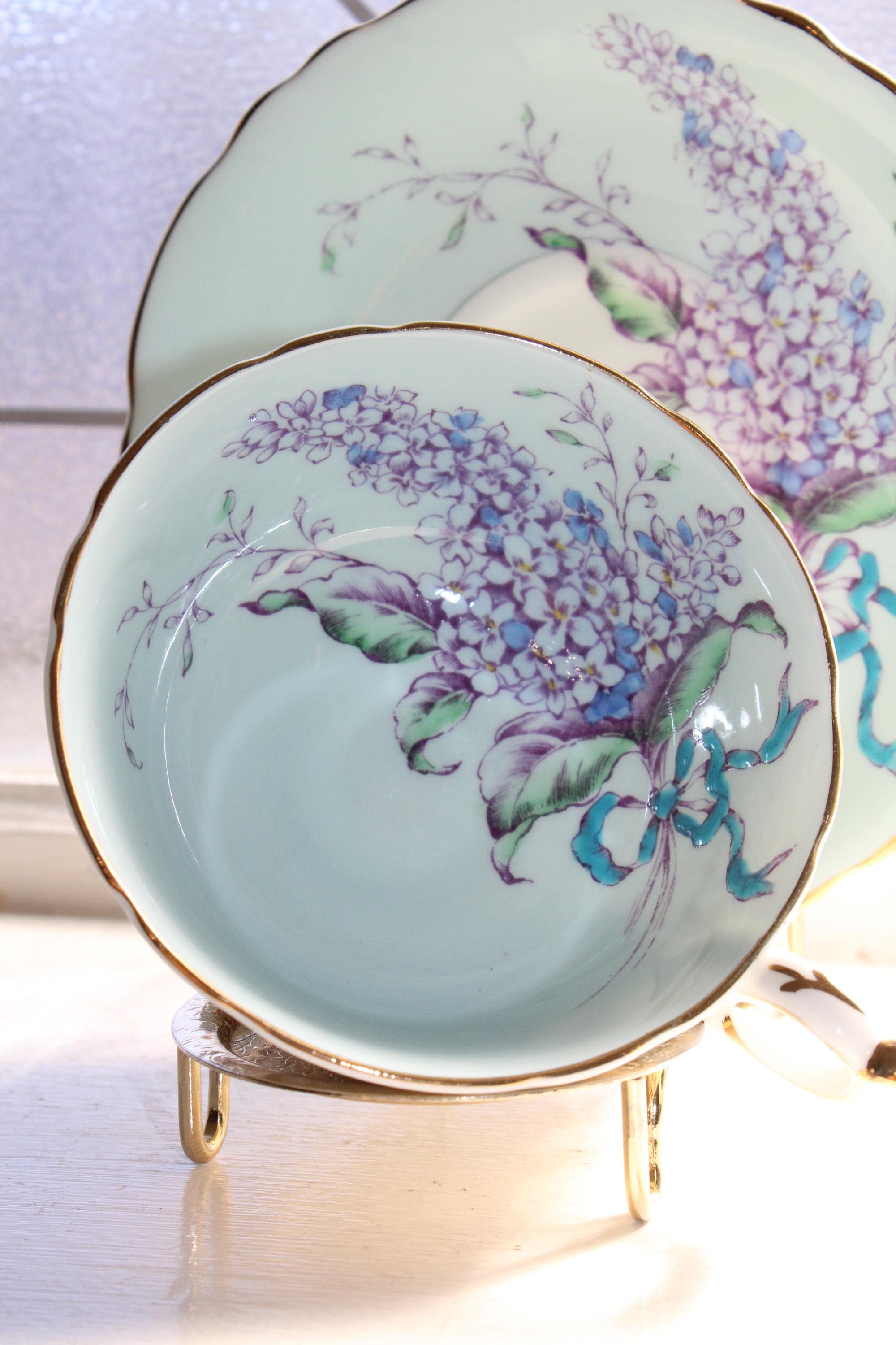 This vintage Paragon fine bone china tea cup and saucer set is just gorgeous! Made in England, it features lilacs on blue and is in excellent condition. The cup measures 2" high x 3 7/8" in diameter and the saucer measures 5 1/2" in diameter. There is no wear, no chips or cracks and it displays well. Enjoy!