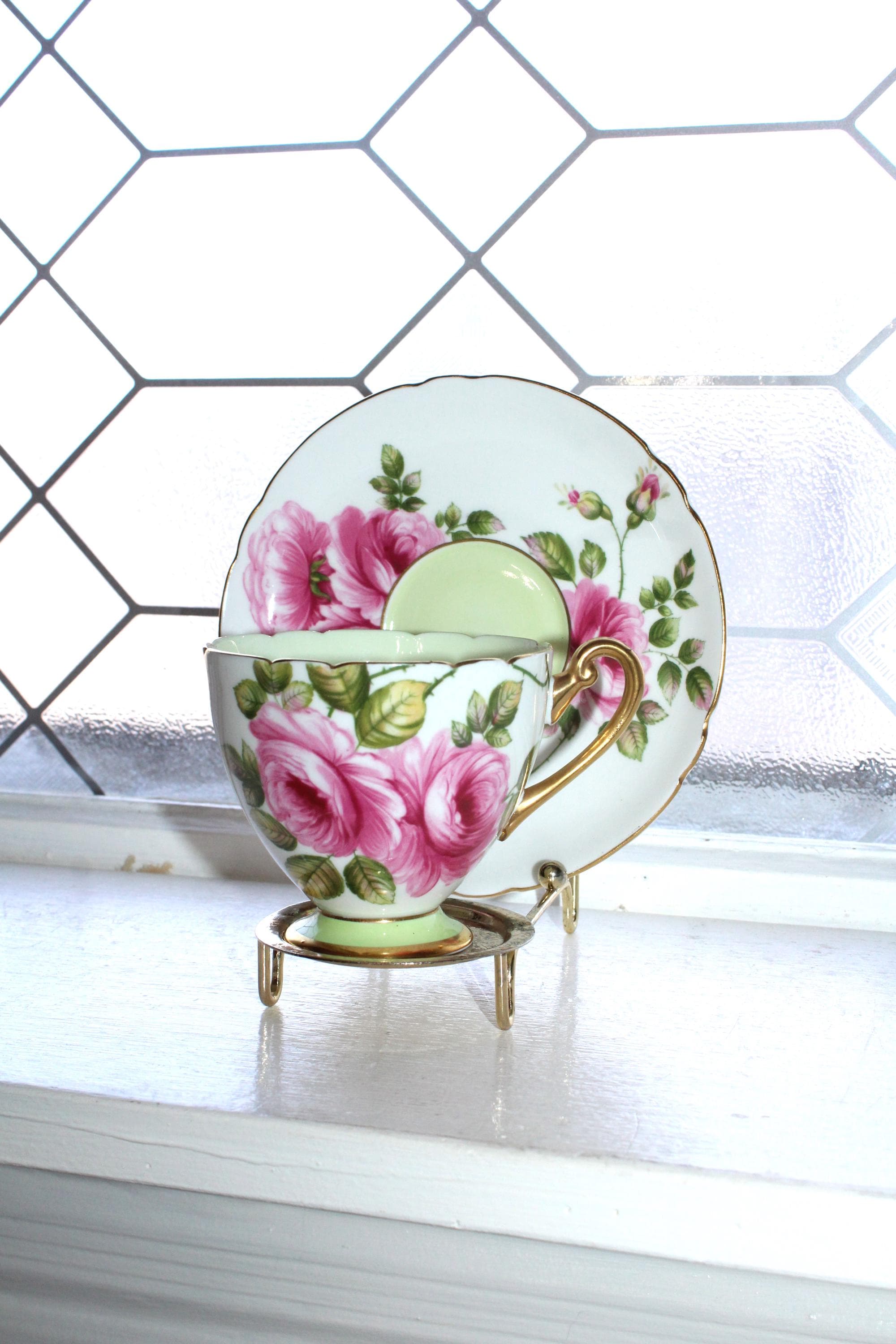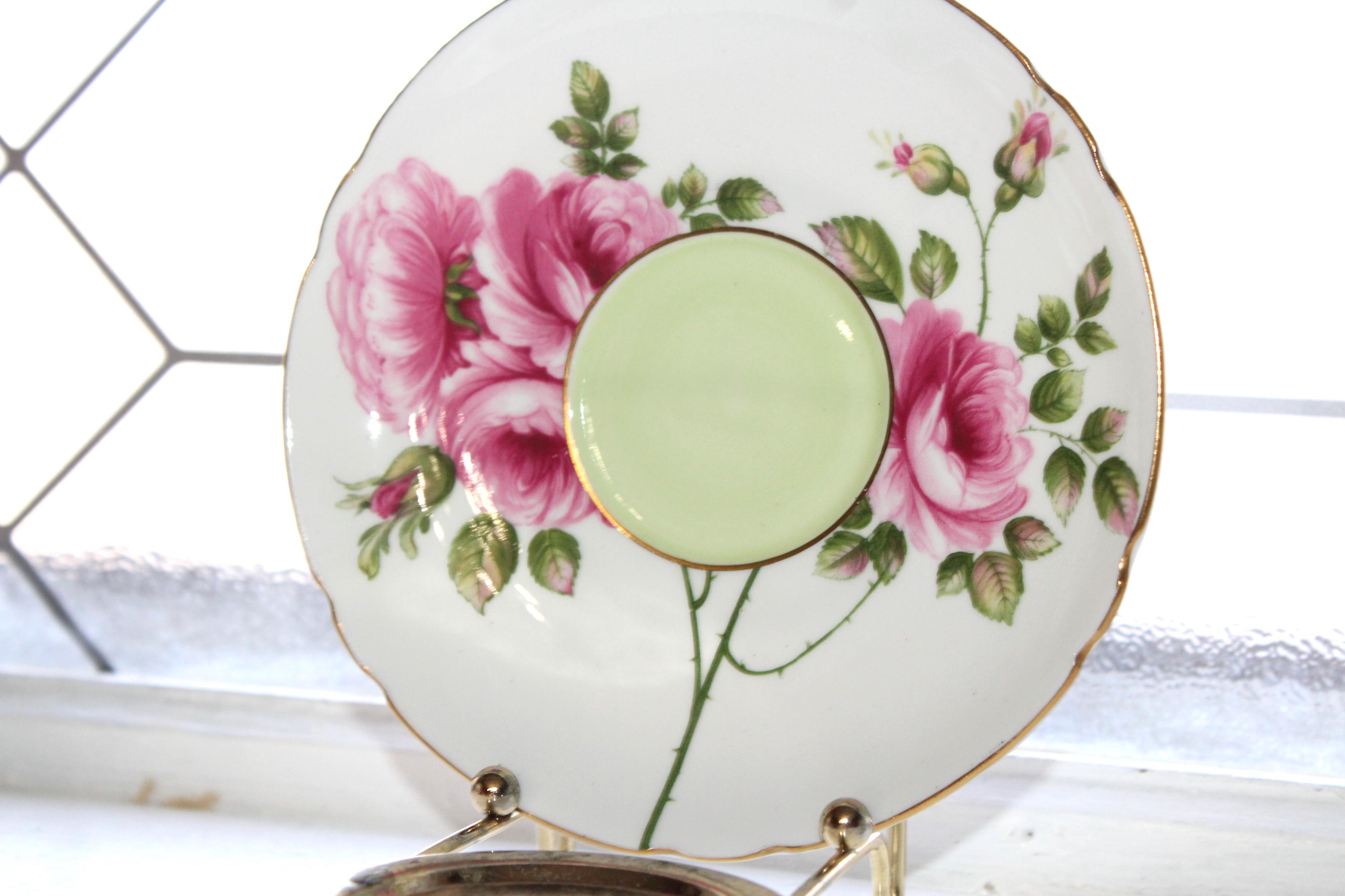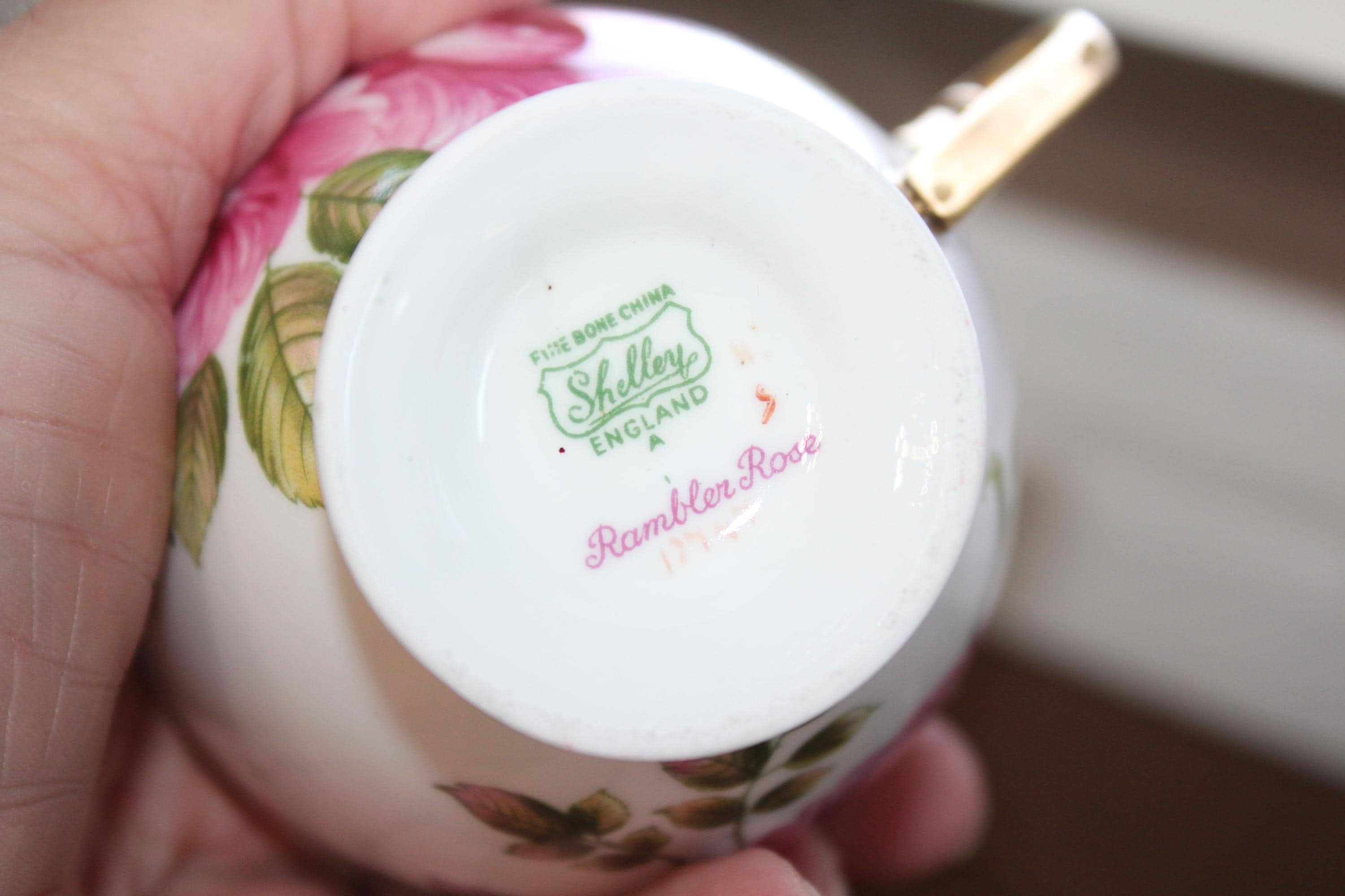 Vintage Shelley bone china teacup and saucer in the Rambler Rose pattern, in excellent condition. The cup measures 3 1/4" wide x 2 7/8" high and the saucer measures 5 5/8" wide. No chips or cracks, perfect for use or display. Enjoy!