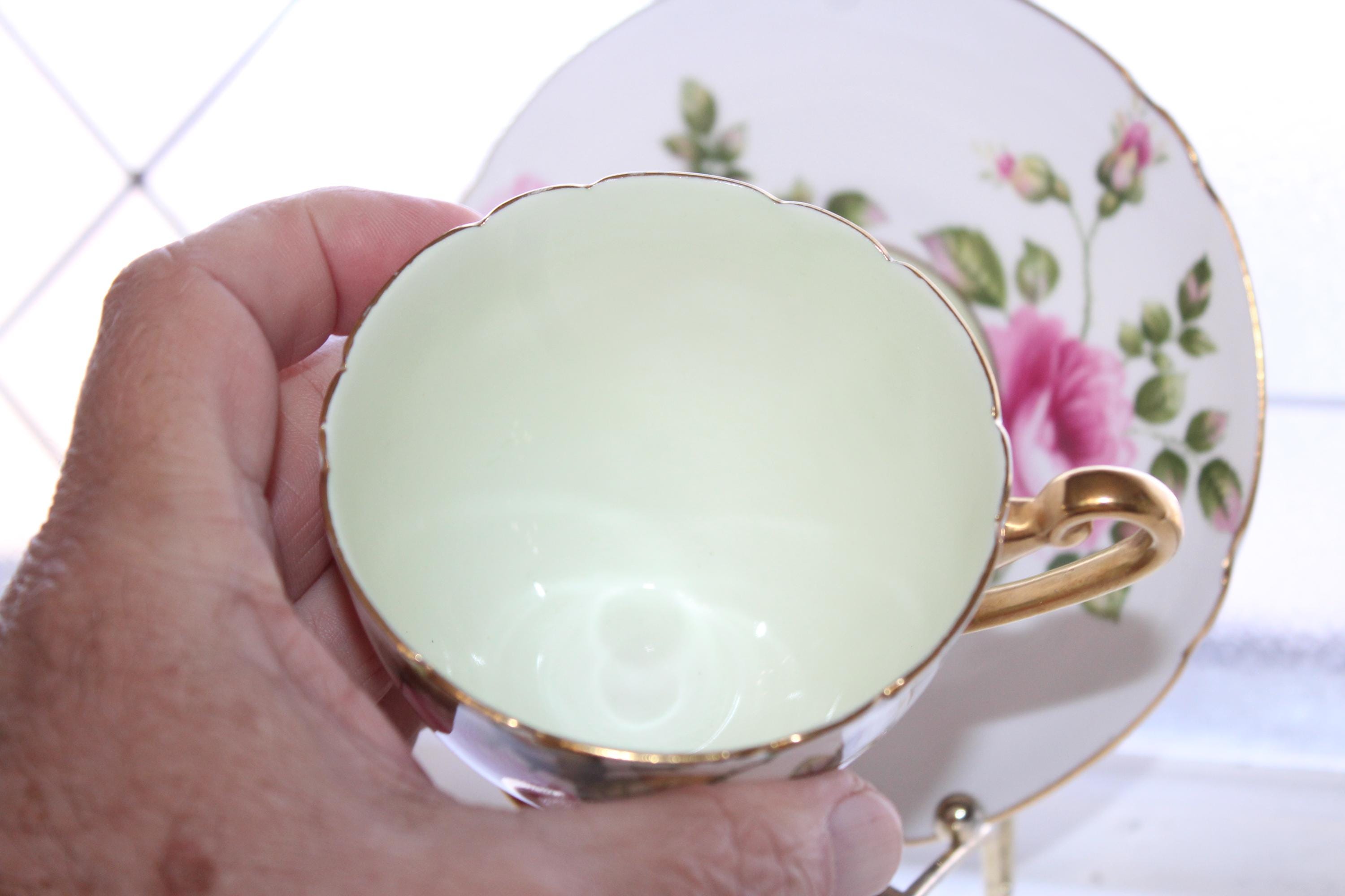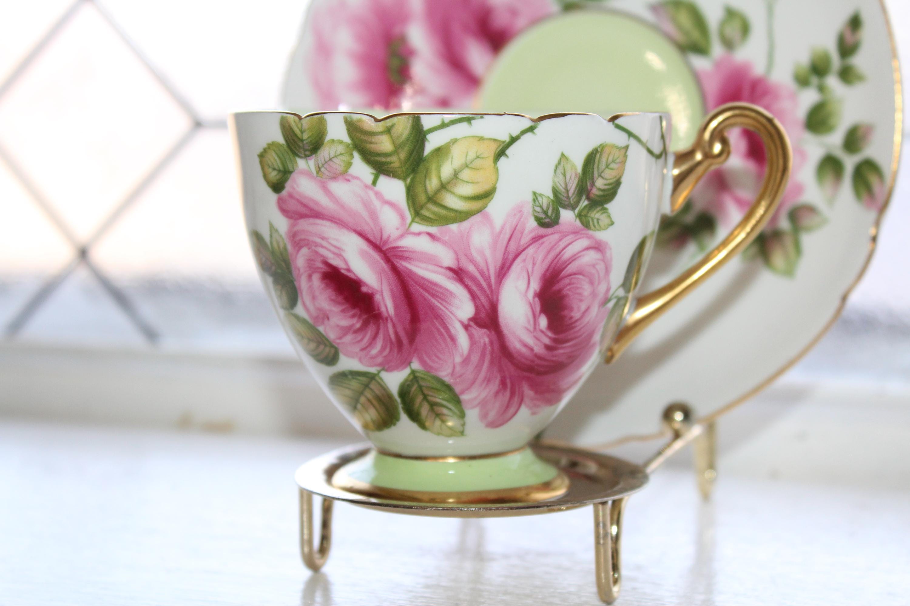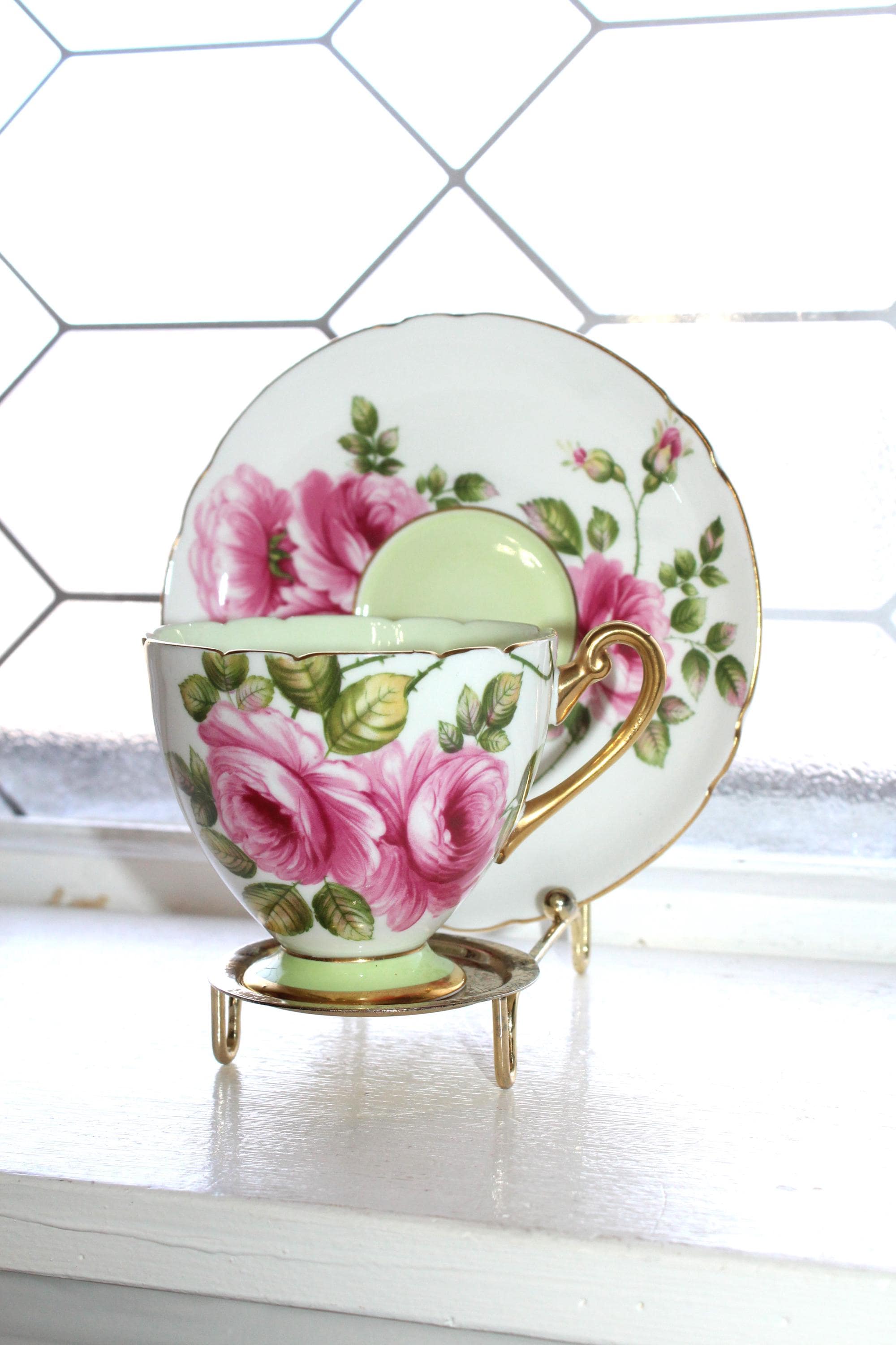 Vintage Shelley bone china teacup and saucer in the Rambler Rose pattern, in excellent condition. The cup measures 3 1/4" wide x 2 7/8" high and the saucer measures 5 5/8" wide. No chips or cracks, perfect for use or display. Enjoy!
