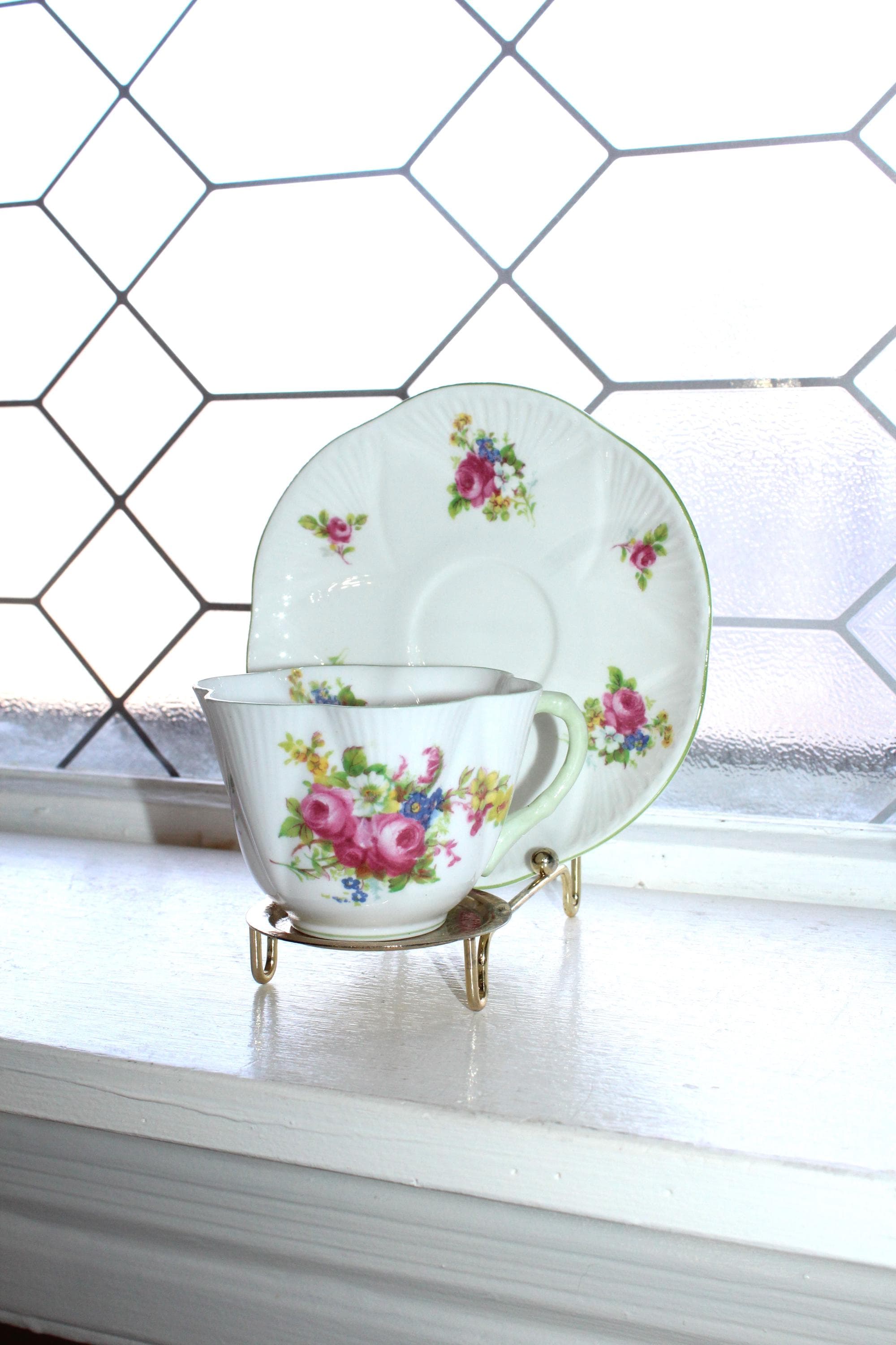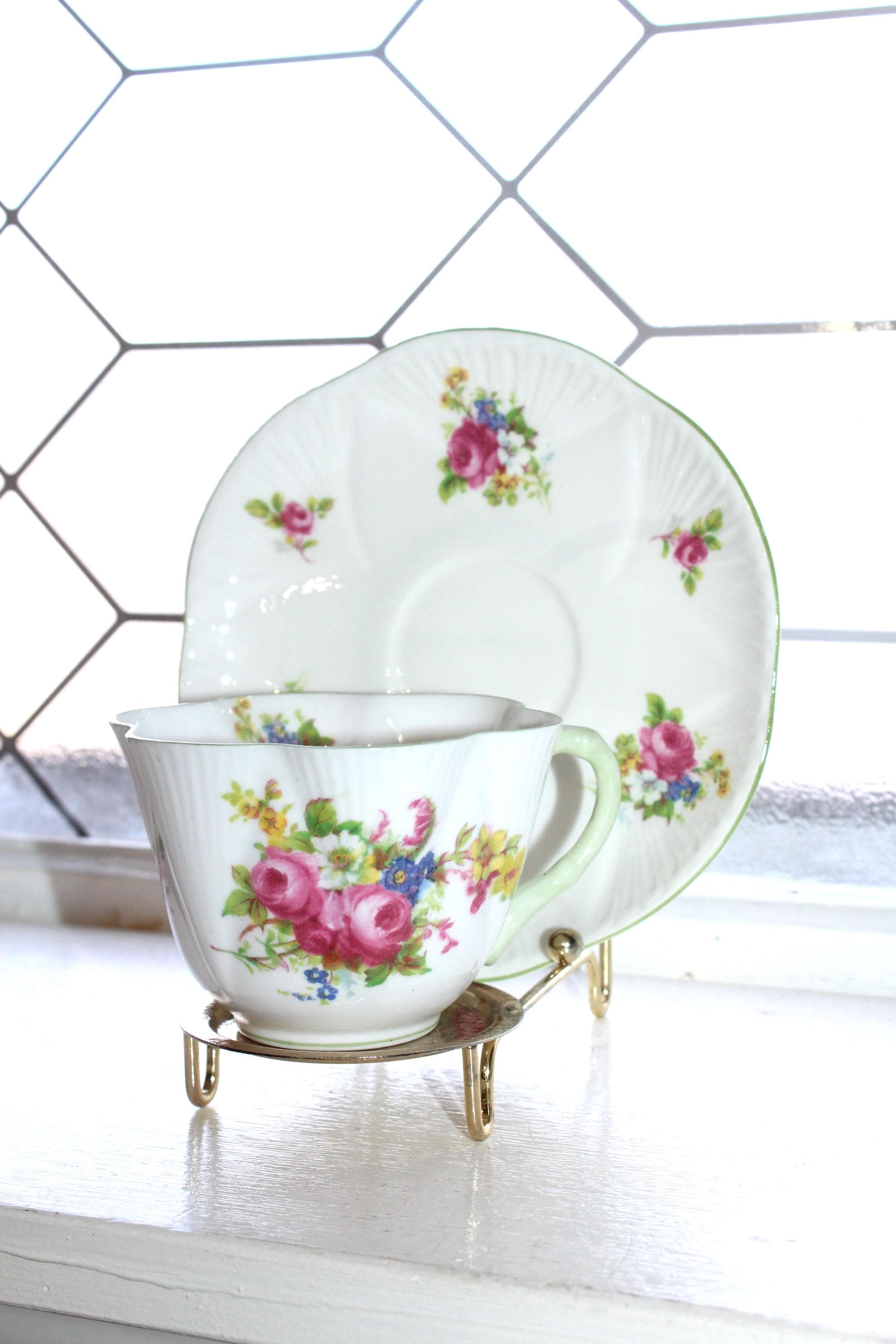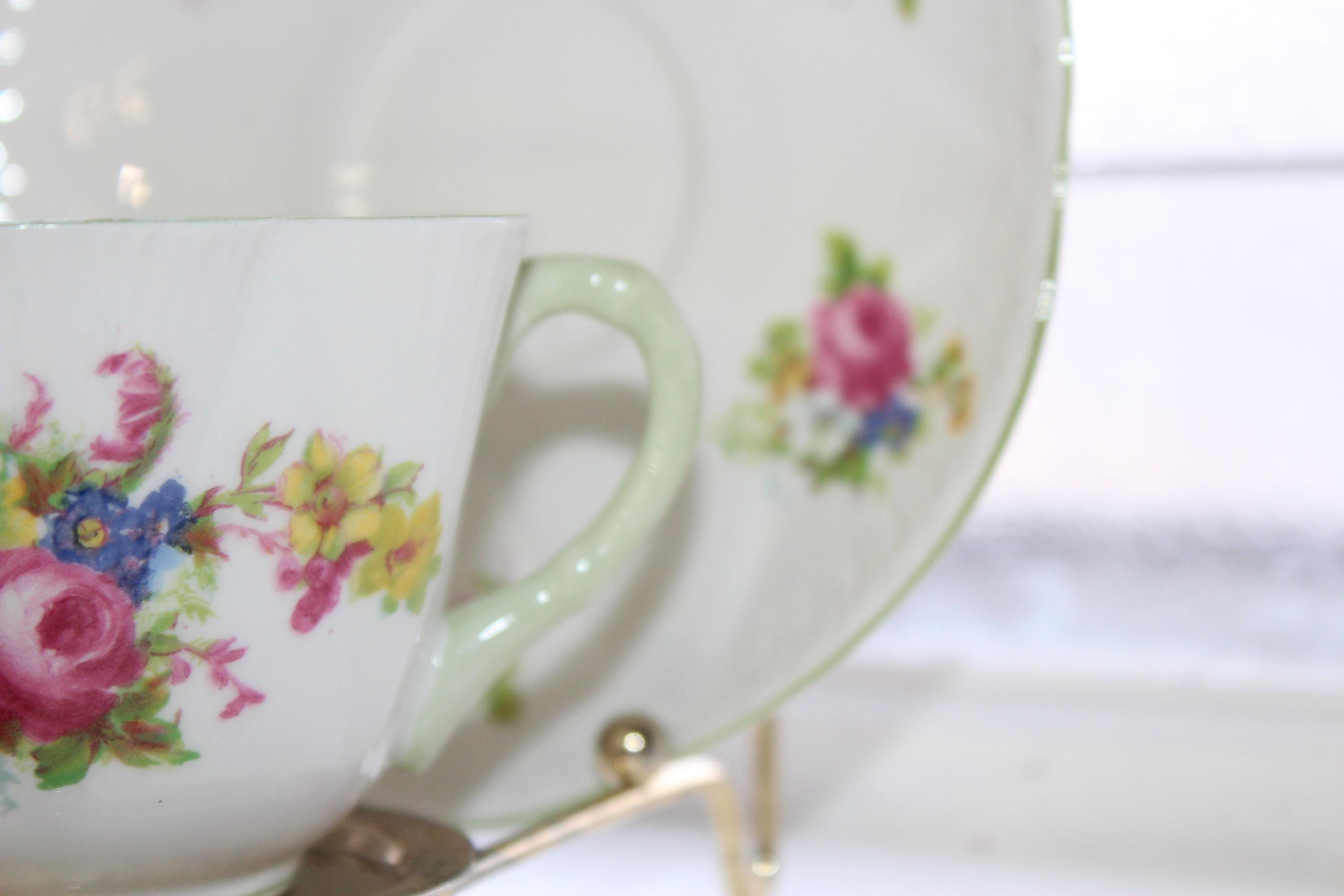 This is a vintage Shelley dainty Hulmes Rose cup and saucer with pastel green trim. Made in England, the cup measures 2 1/2" high x 3 1/2" wide and the saucer measures 5 3/4" wide. It is in excellent condition with no chips or cracks. Enjoy!