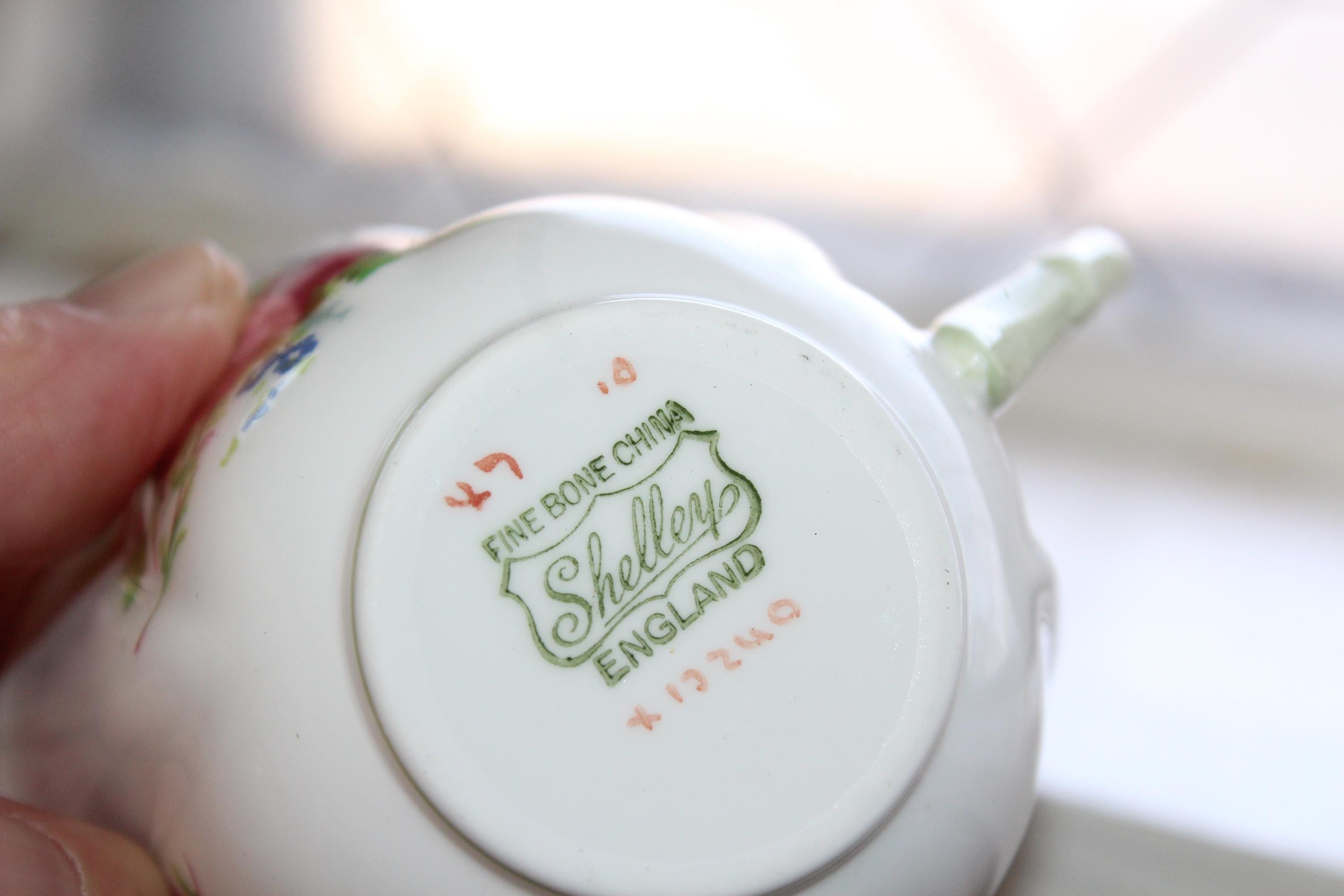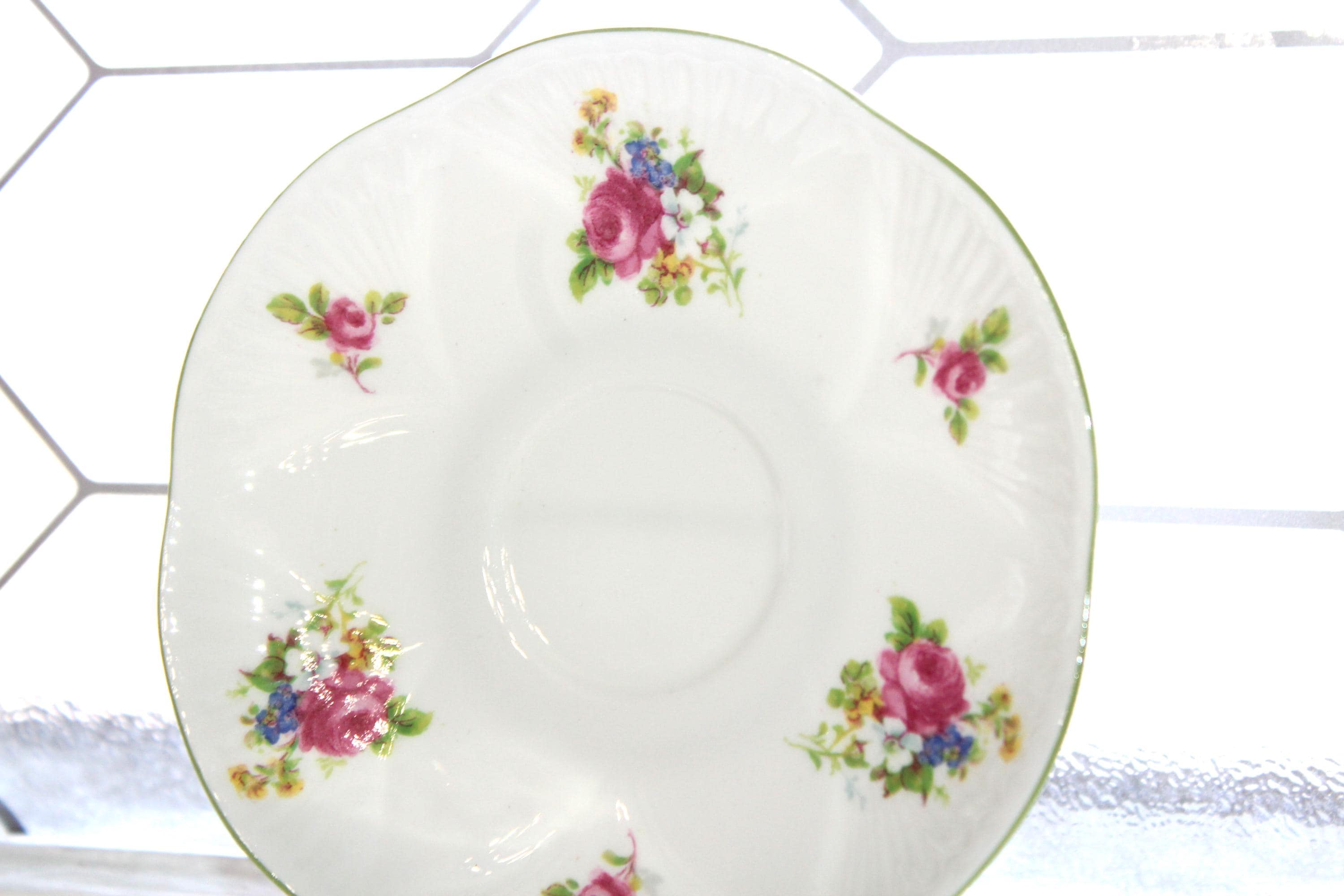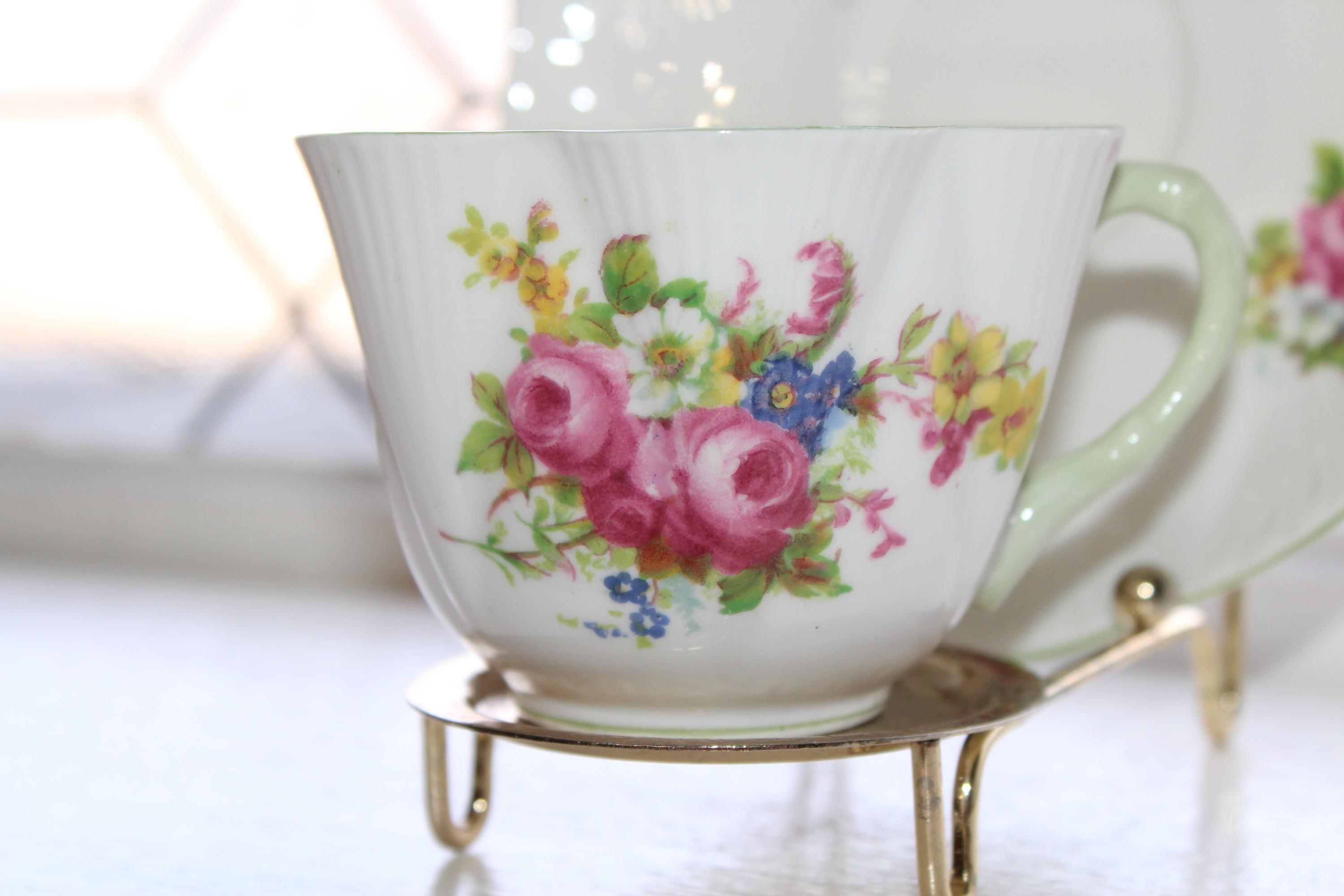 This is a vintage Shelley dainty Hulmes Rose cup and saucer with pastel green trim. Made in England, the cup measures 2 1/2" high x 3 1/2" wide and the saucer measures 5 3/4" wide. It is in excellent condition with no chips or cracks. Enjoy!