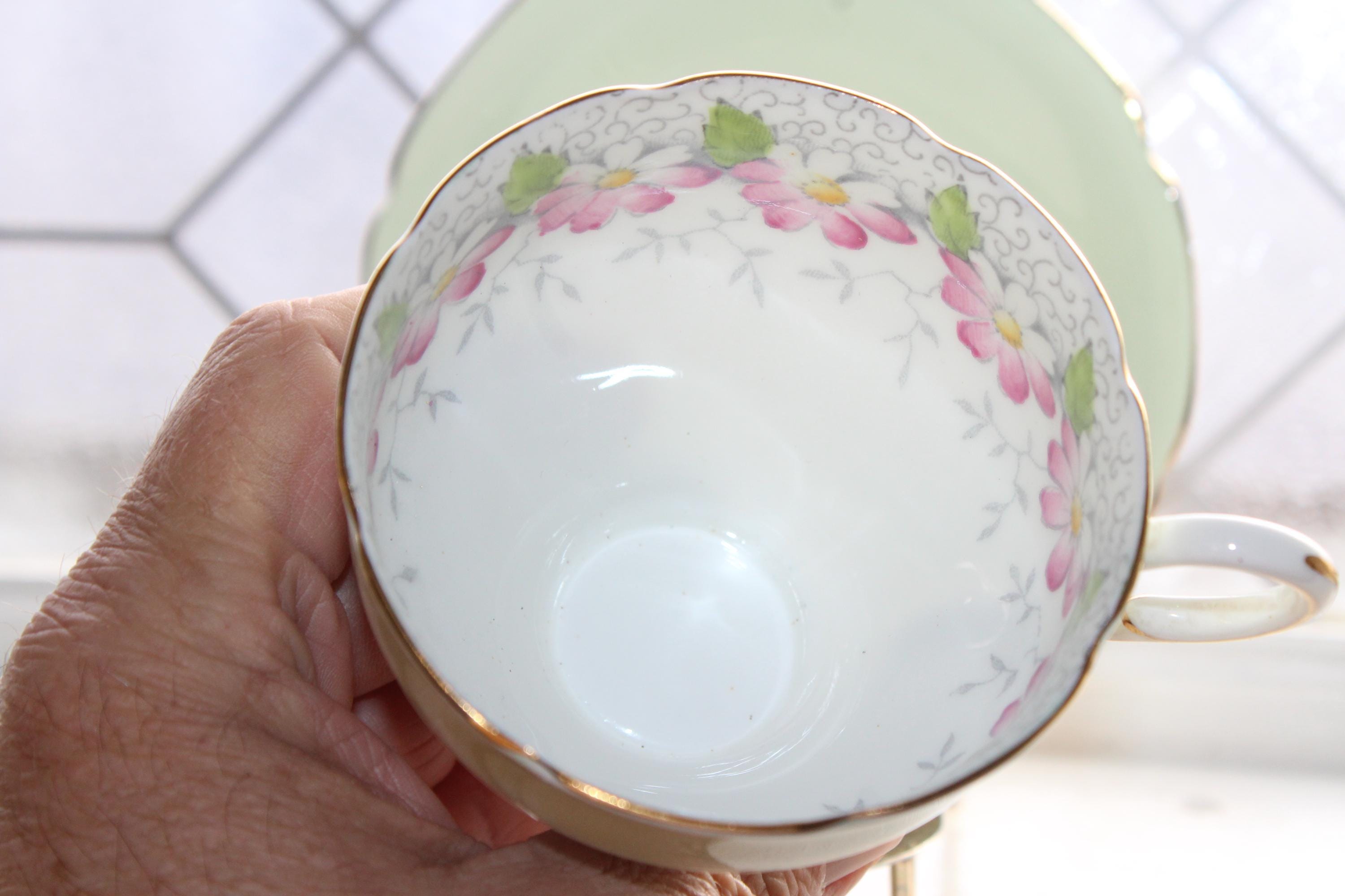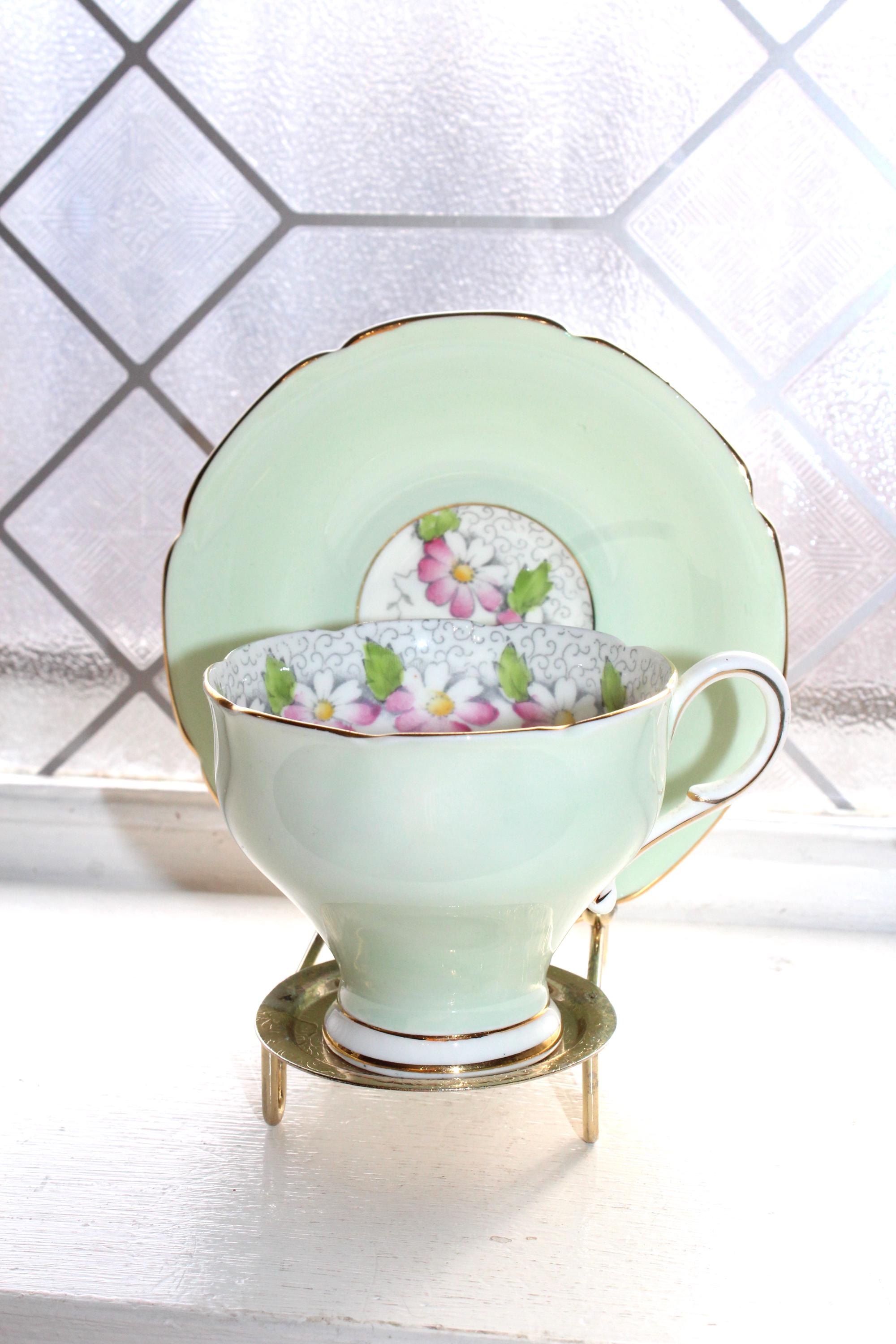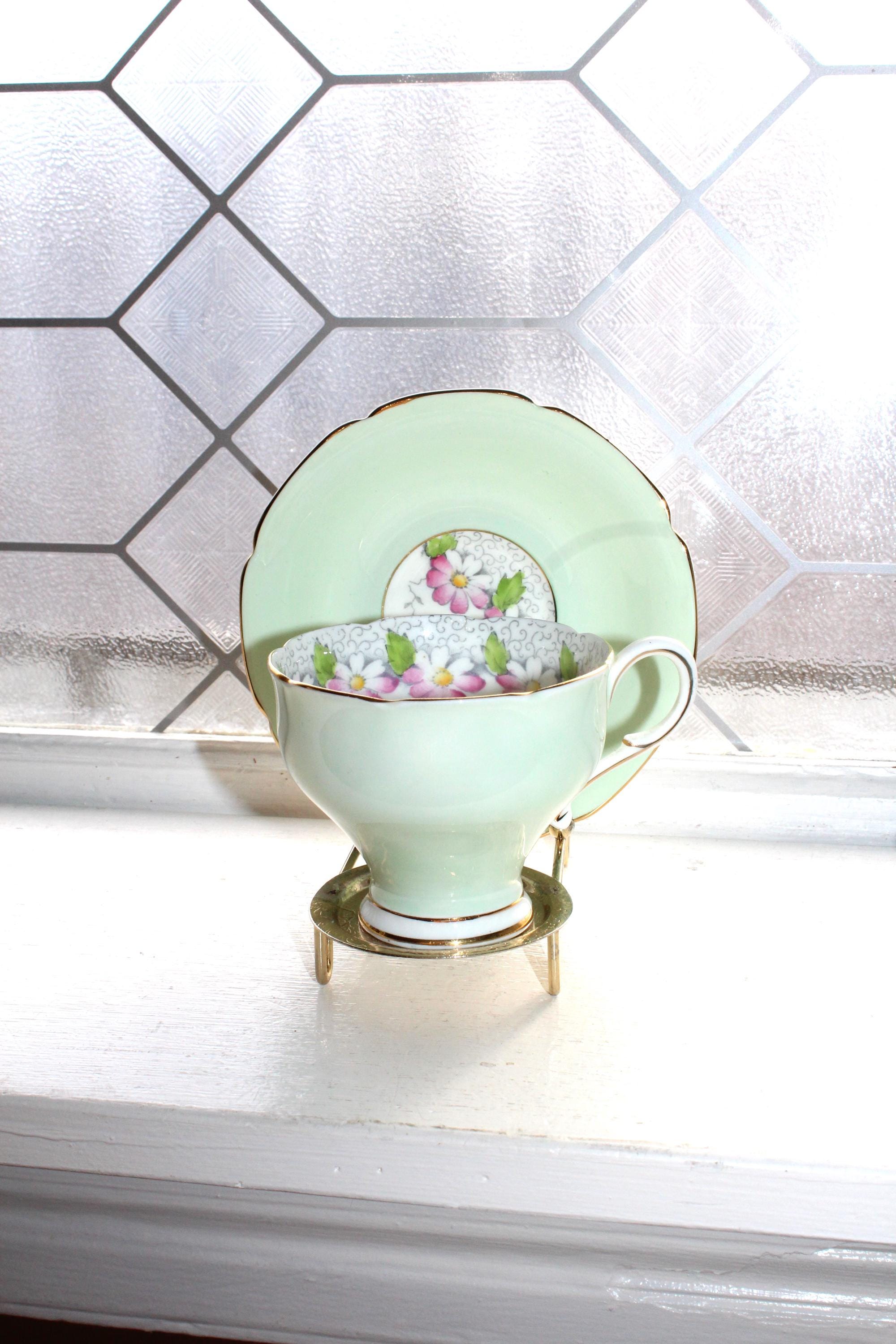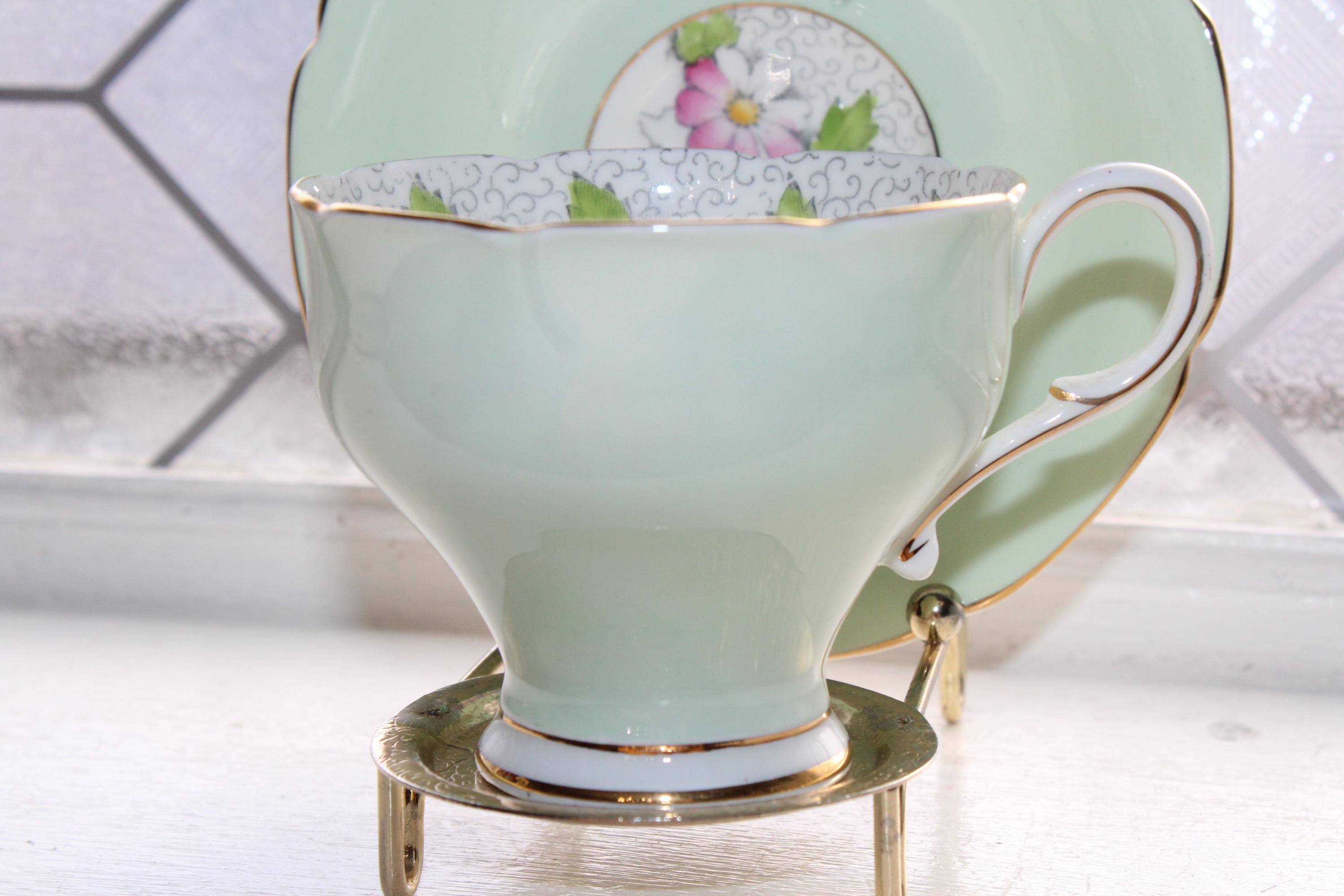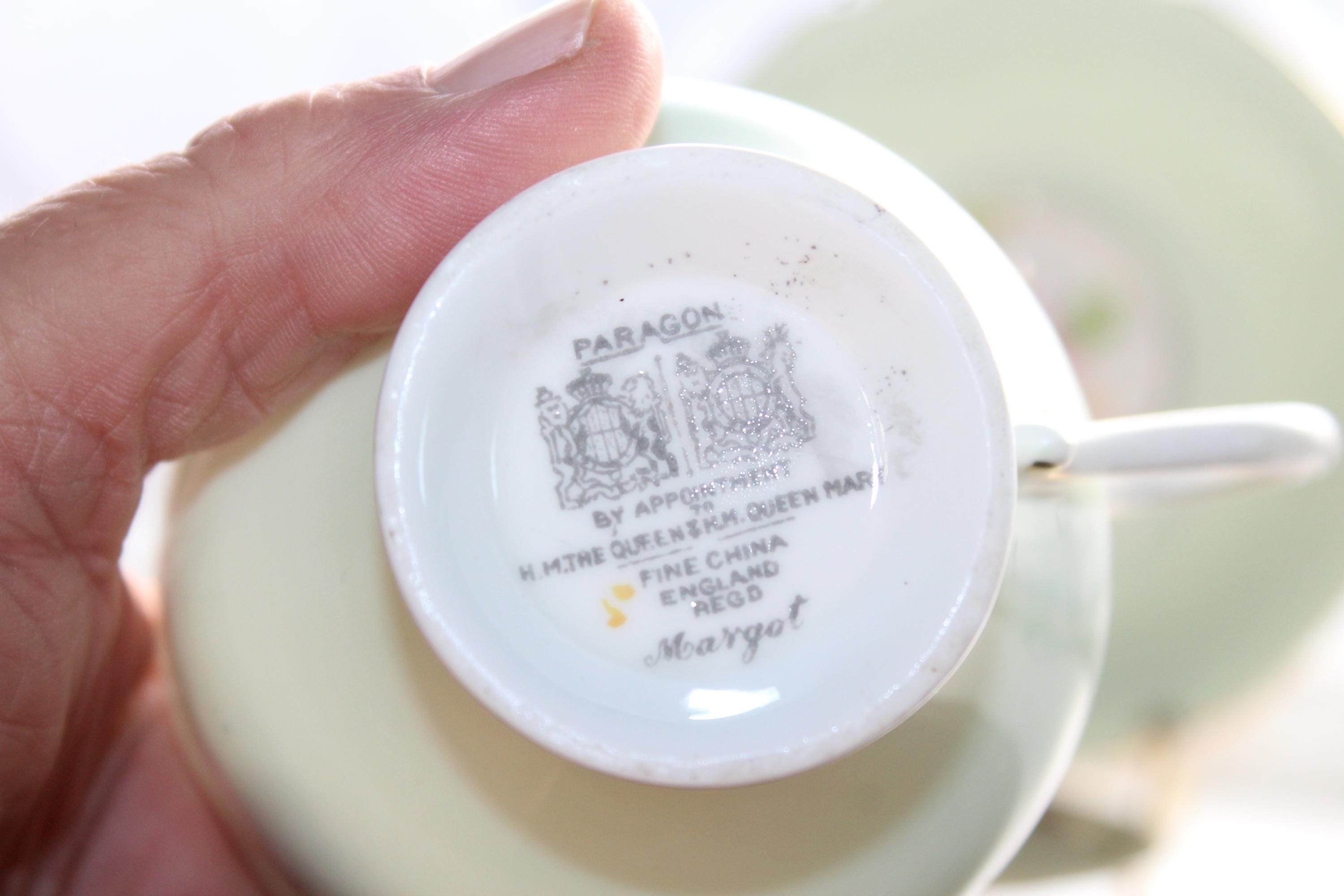 This vintage Paragon mint green Margot pattern fine bone china tea cup and saucer set is just gorgeous! Made in England, it is in excellent condition. The cup measures 2 3/4" high x 3 3/8" in diameter and the saucer measures 5 1/8" in diameter. There is minimal wear, no chips or cracks and it displays well. Enjoy!