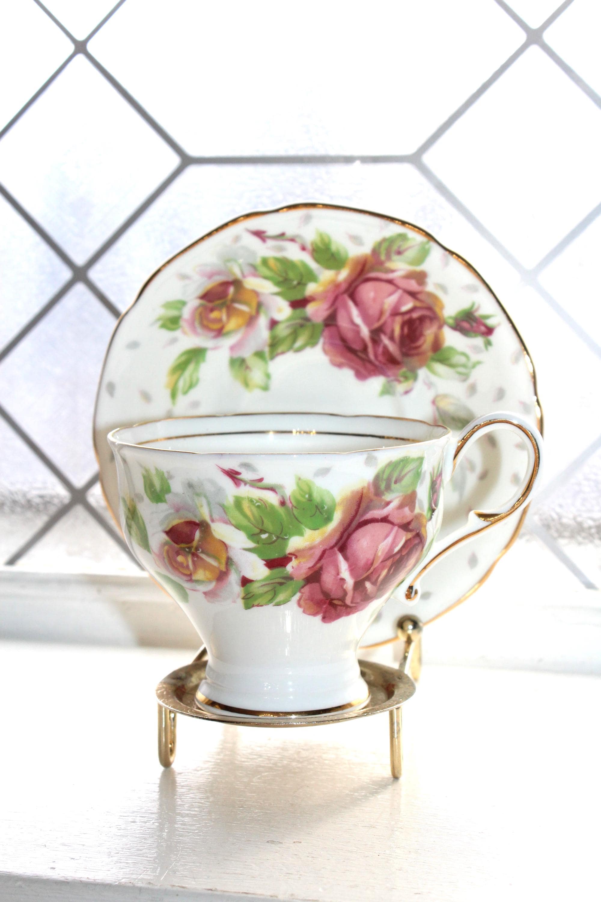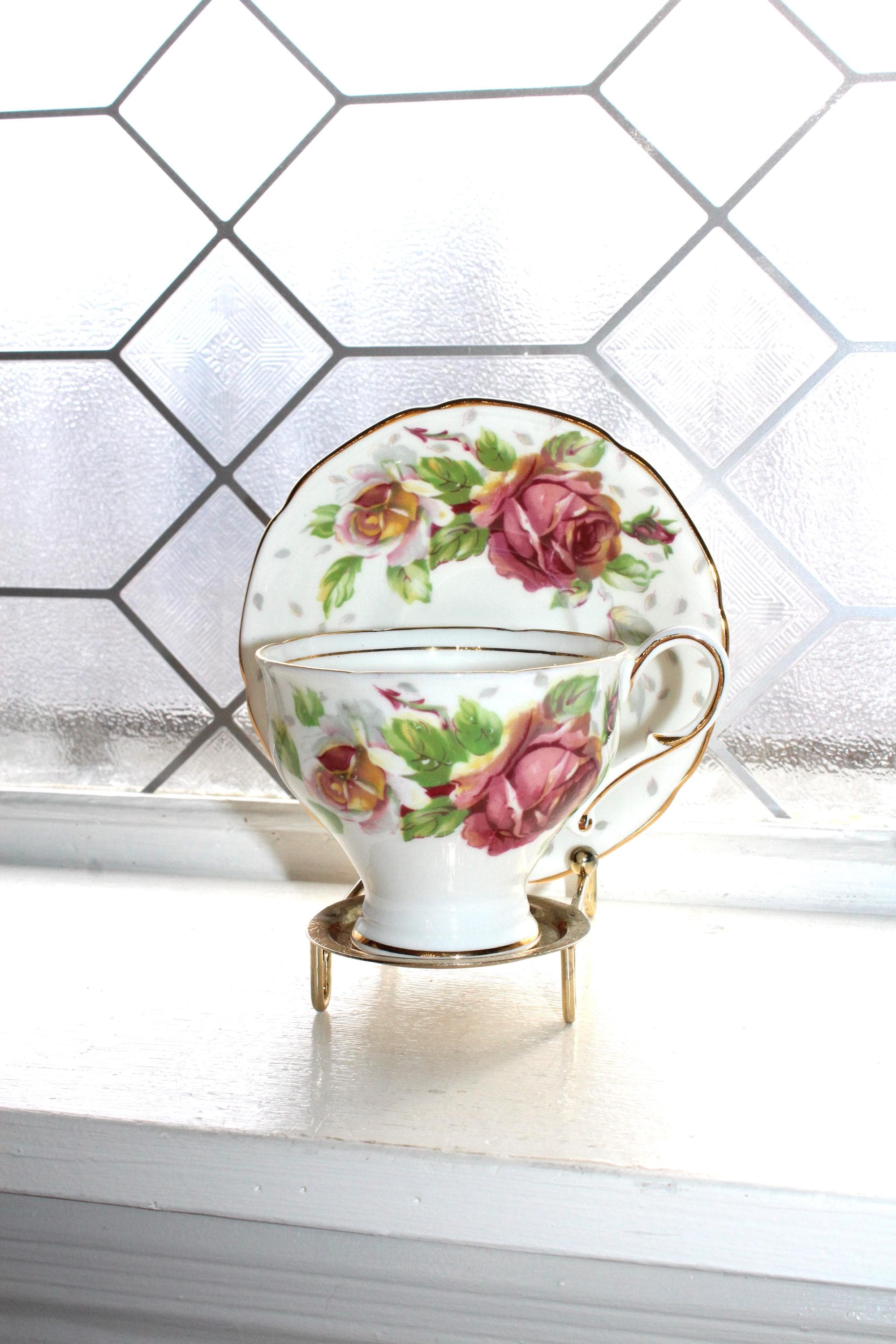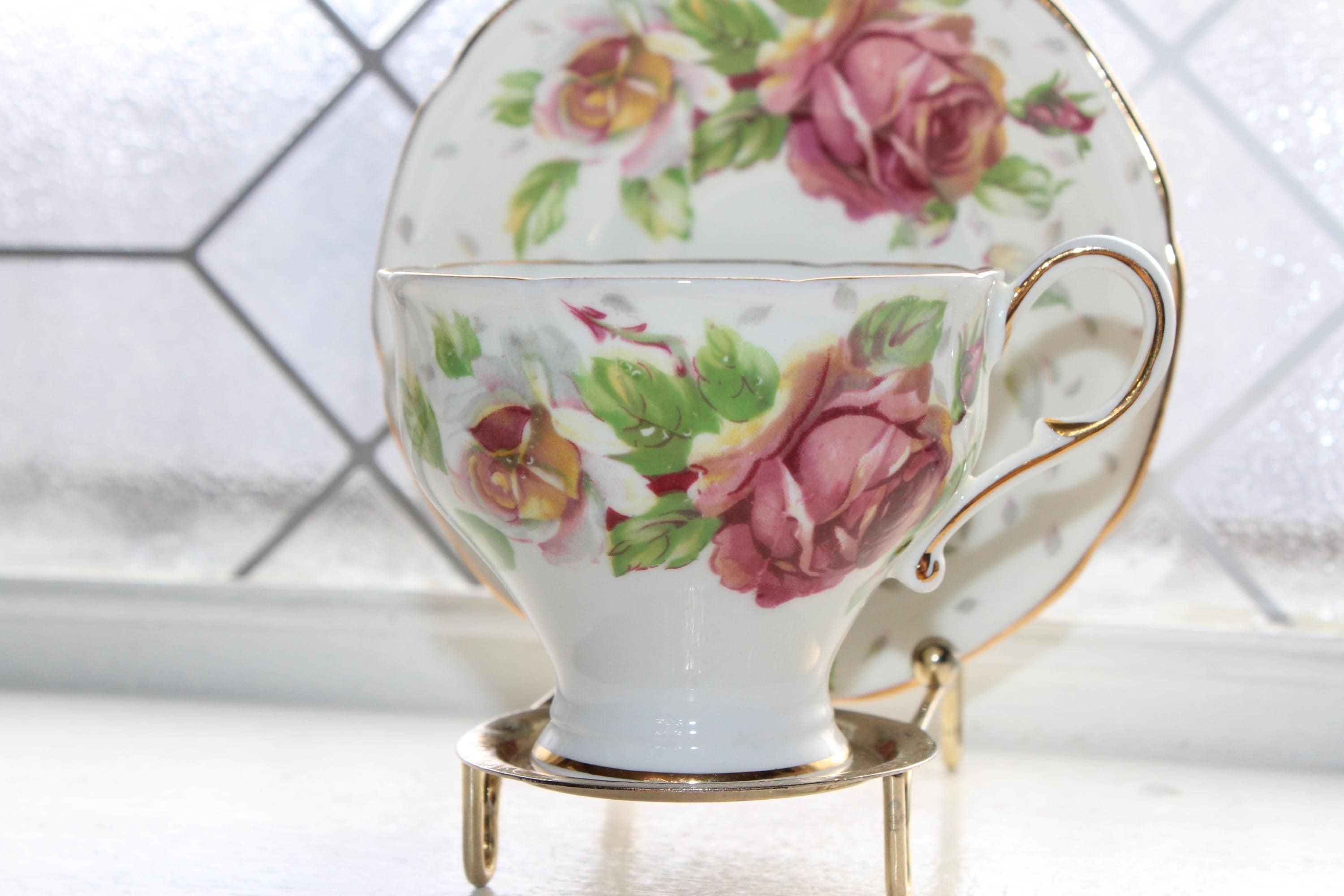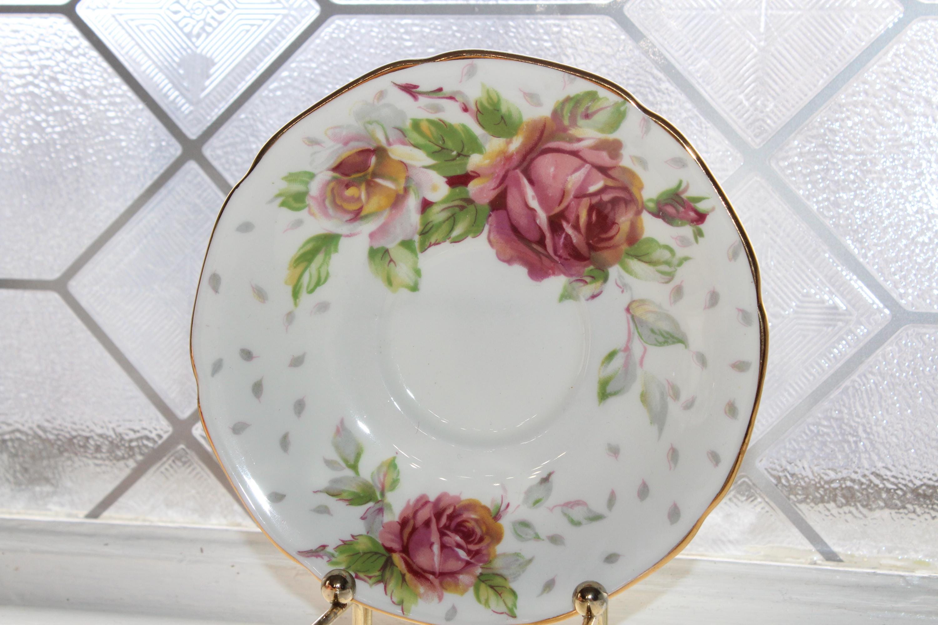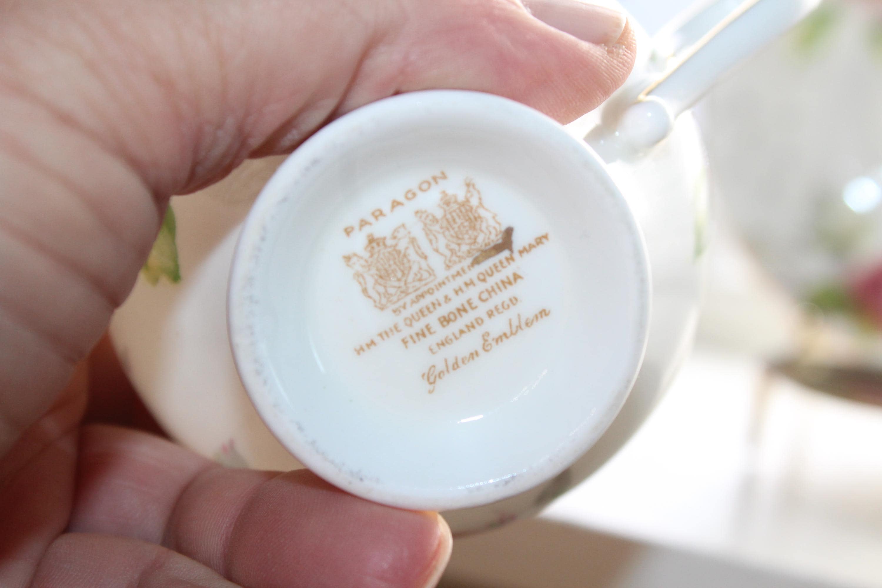 This vintage Paragon fine bone china Golden Emblem tea cup and saucer set is just gorgeous! It is in excellent condition. It features beautiful pink roses and gold trim. The cup measures 2 3/4" high x 3 3/8" in diameter and the saucer measures 5 1/8" in diameter. No chips or cracks. Enjoy!