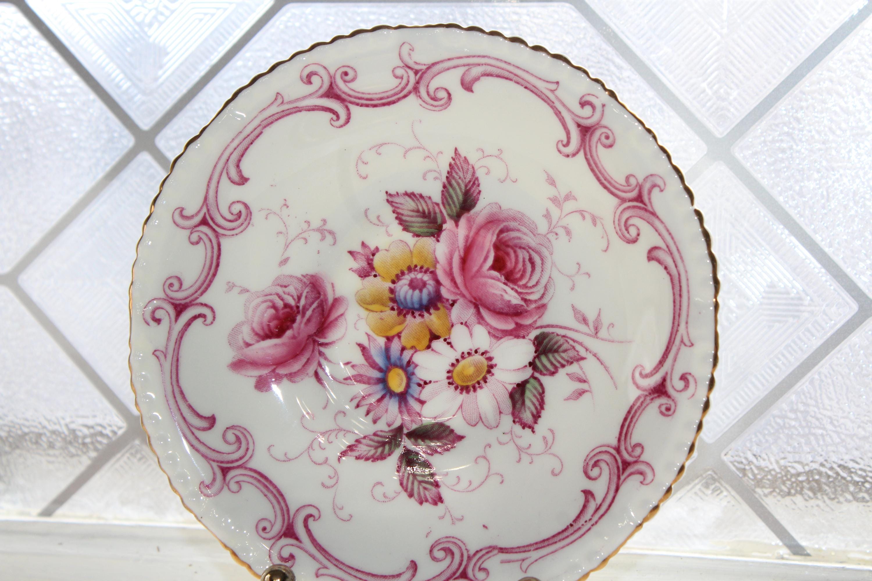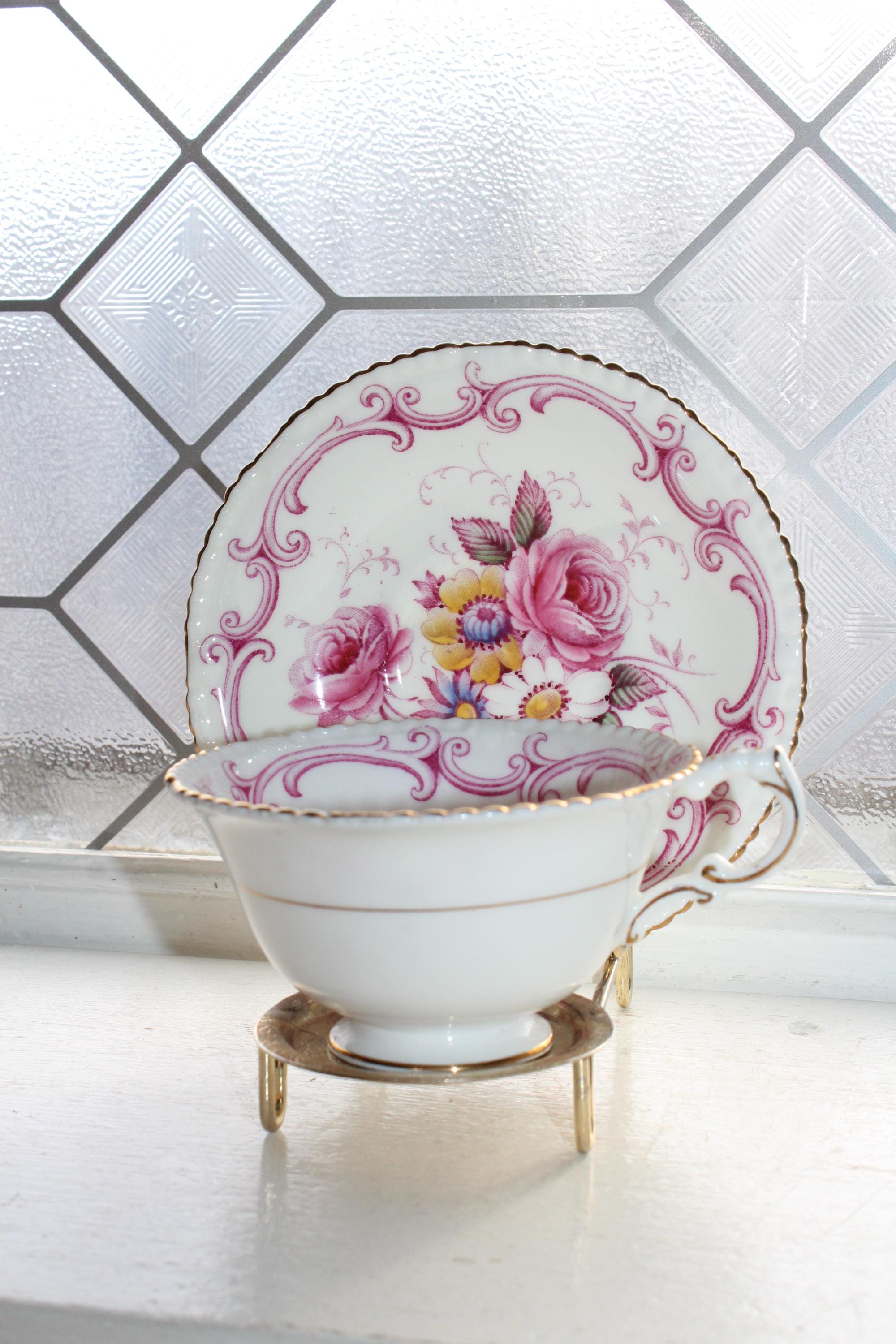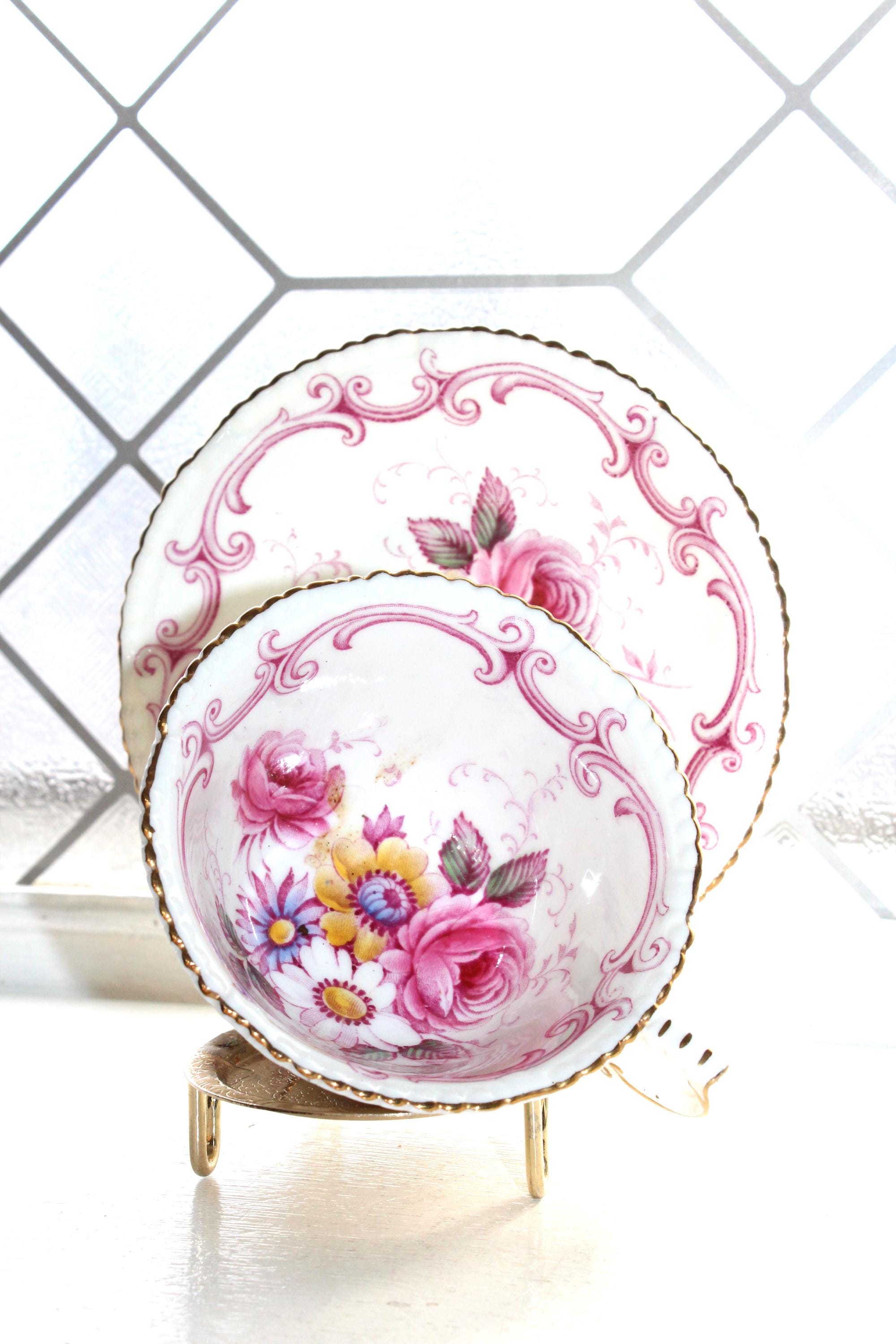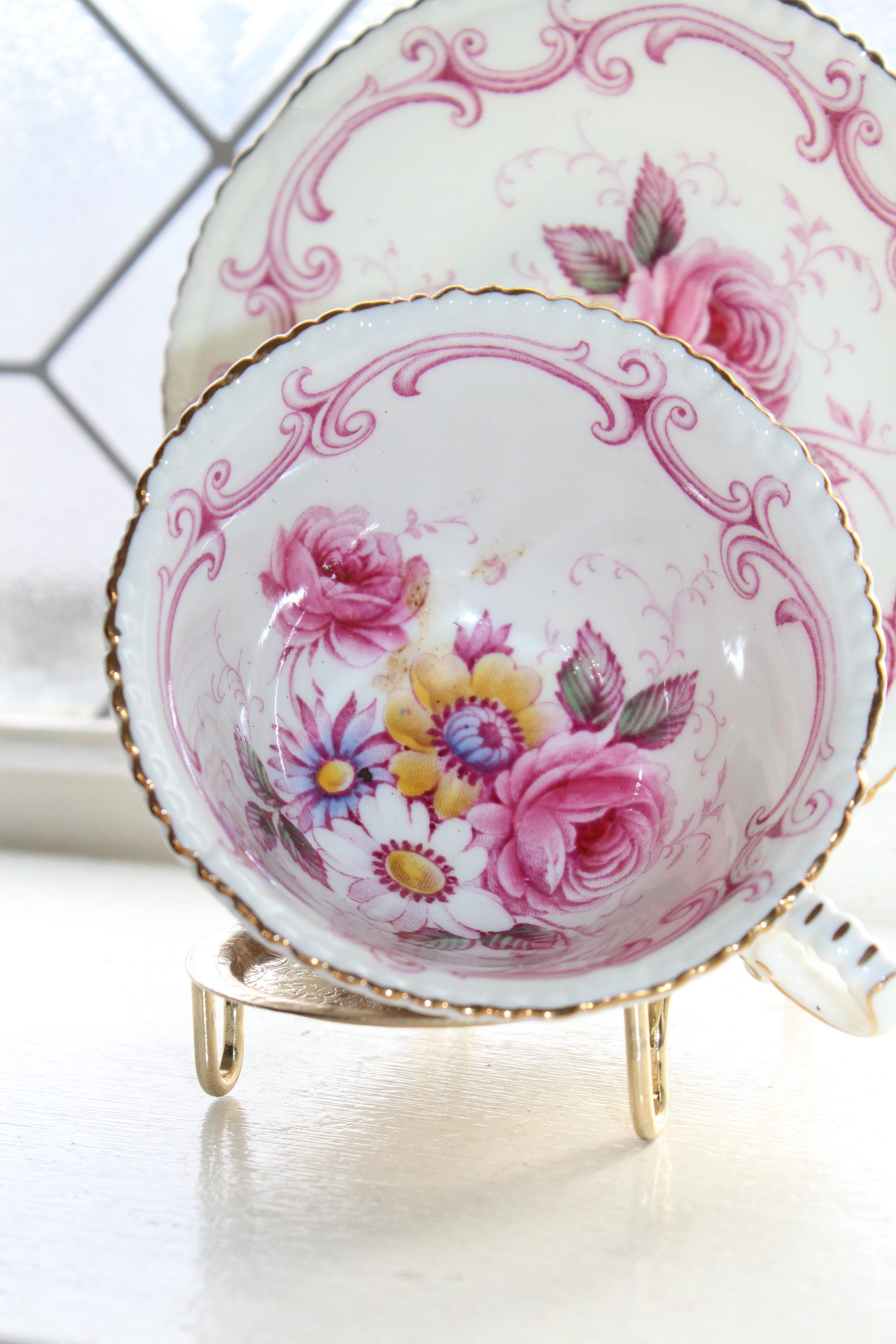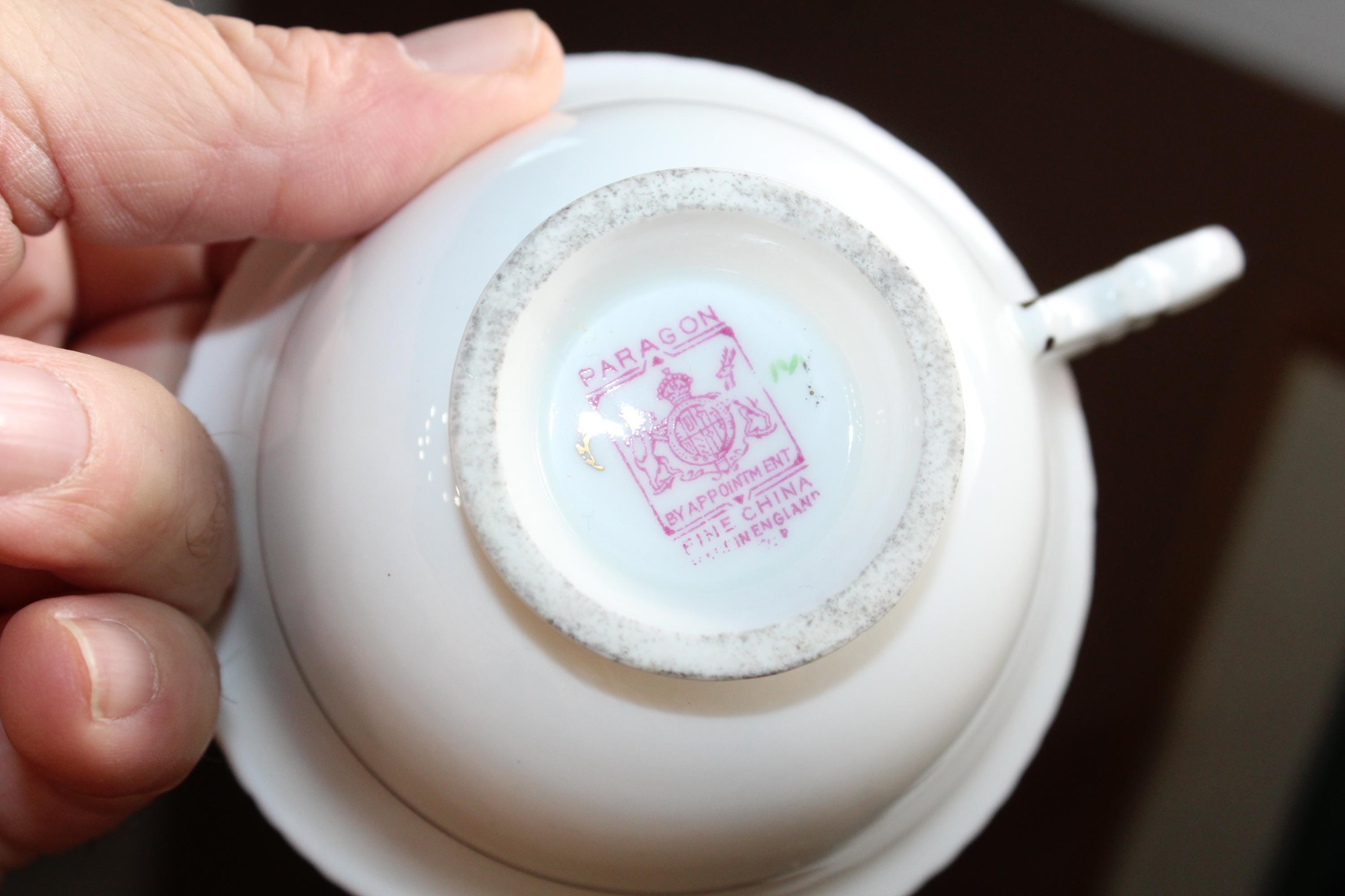 This elegant Paragon pink and yellow floral with gold trim fine bone china tea cup and saucer set is just gorgeous! Made in England, it is in excellent condition. The cup measures 2 1/8" high x 3 7/8" in diameter and the saucer measures 5 1/4" in diameter. There is minimal wear, no chips or cracks and it displays well. Enjoy!