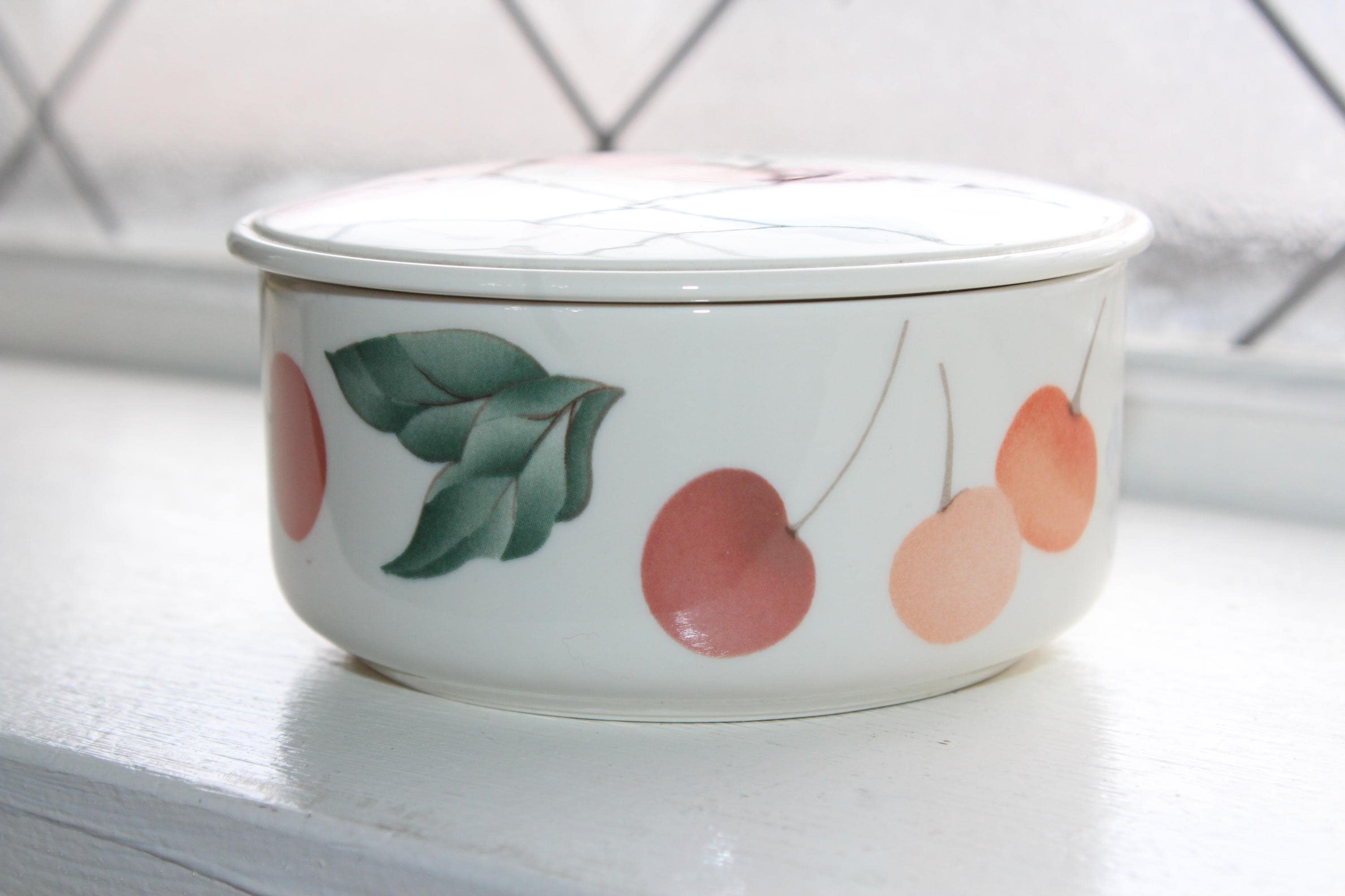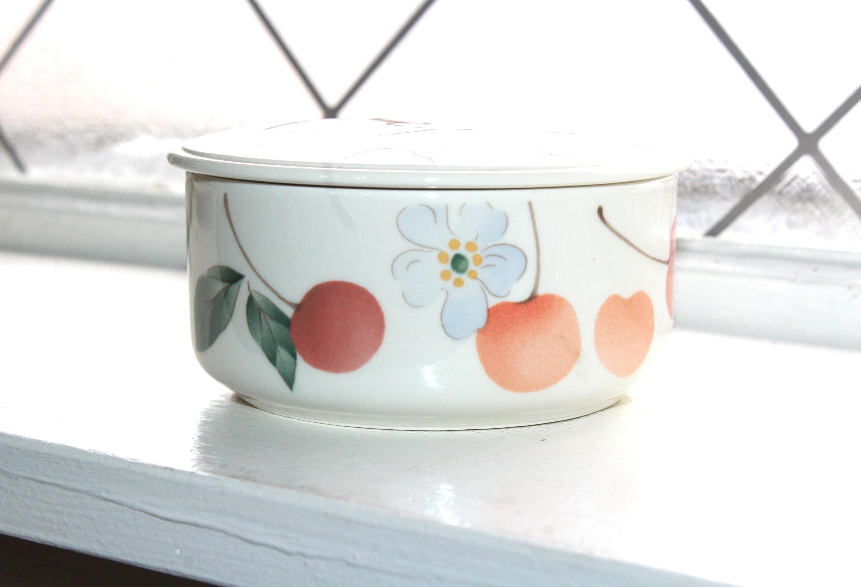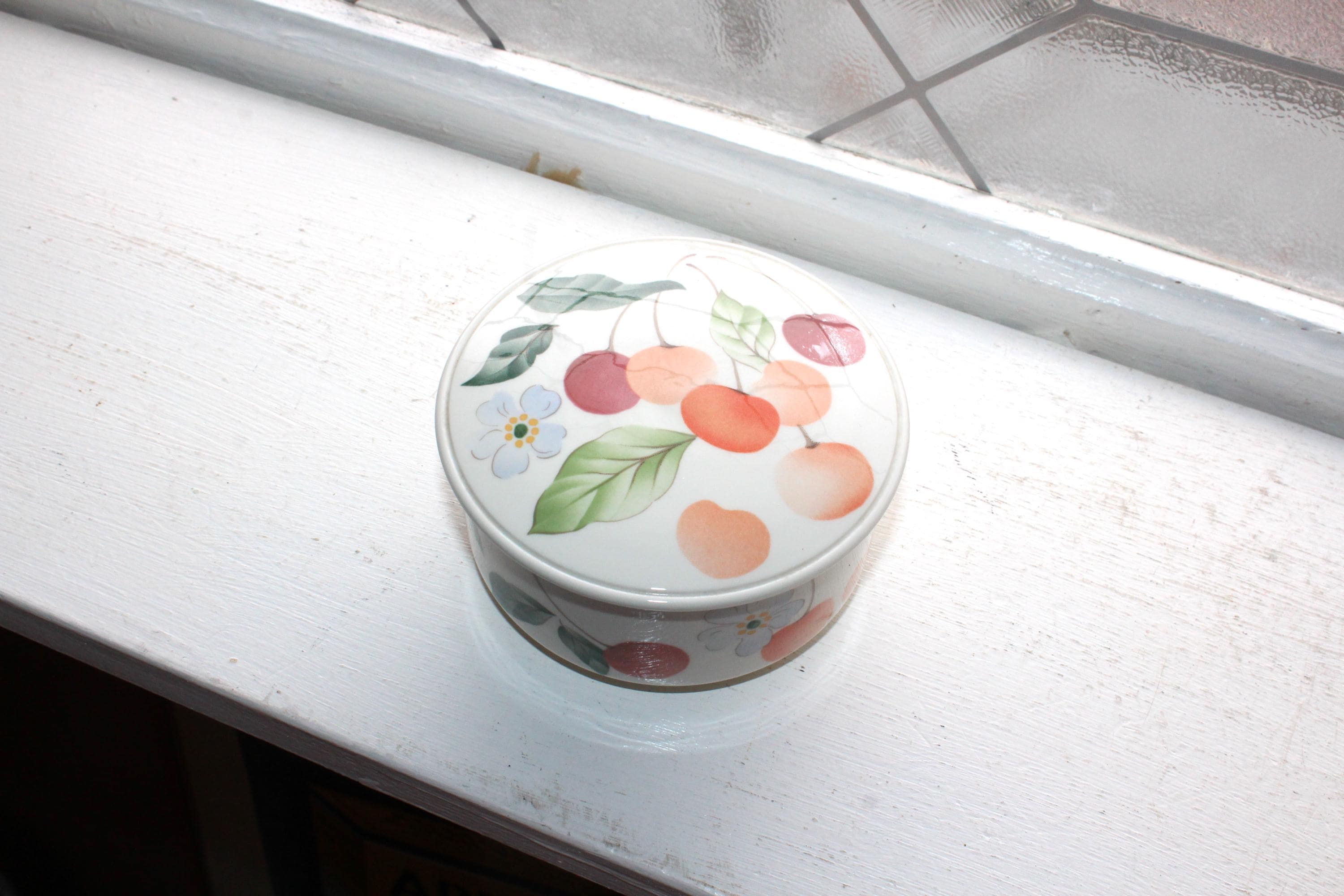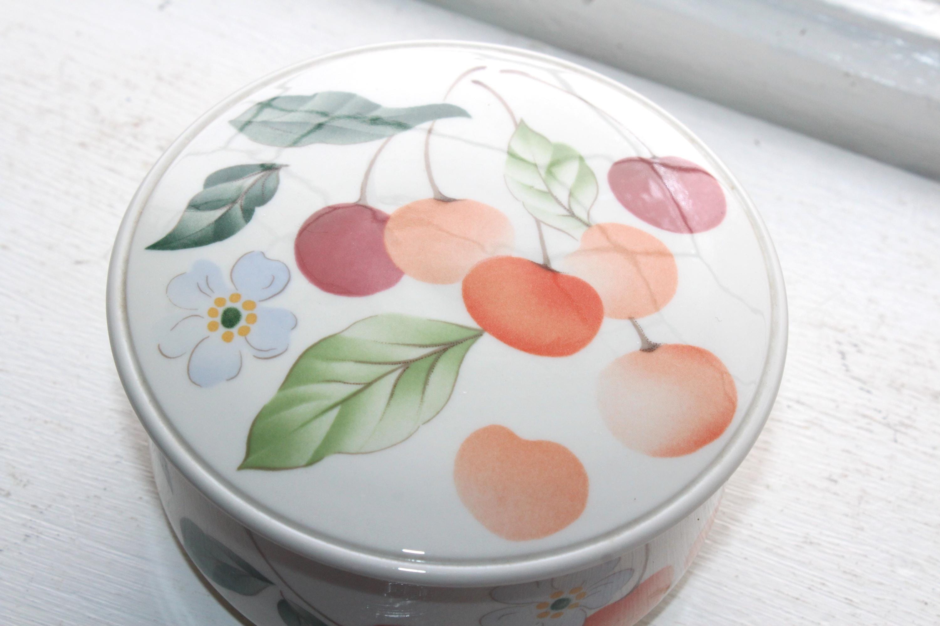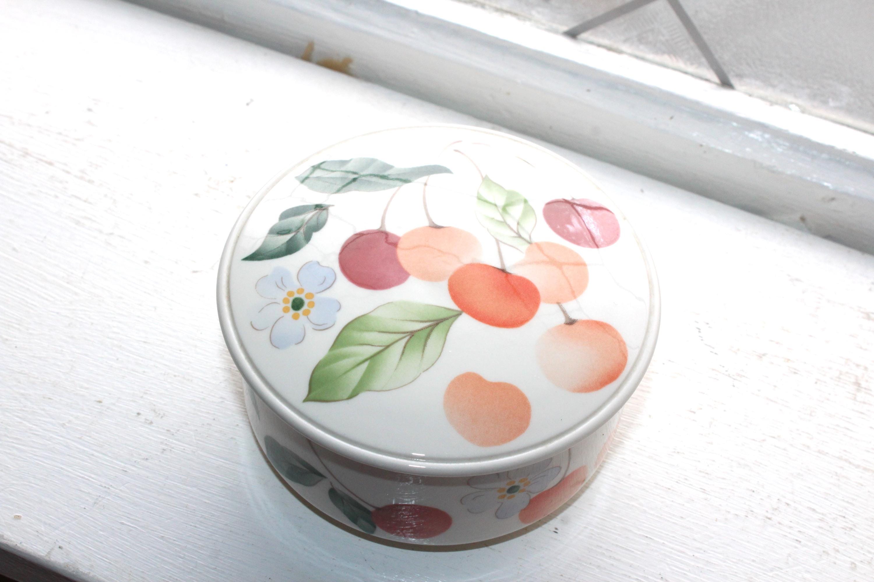 Vintage Villeroy and Boch Amigo porcelain trinket box featuring cherries, peaches and flowers, in excellent condition. It measures 2 1/8" high x 4 1/8" wide. No chips, cracks or wear, perfect for use or display. Enjoy!