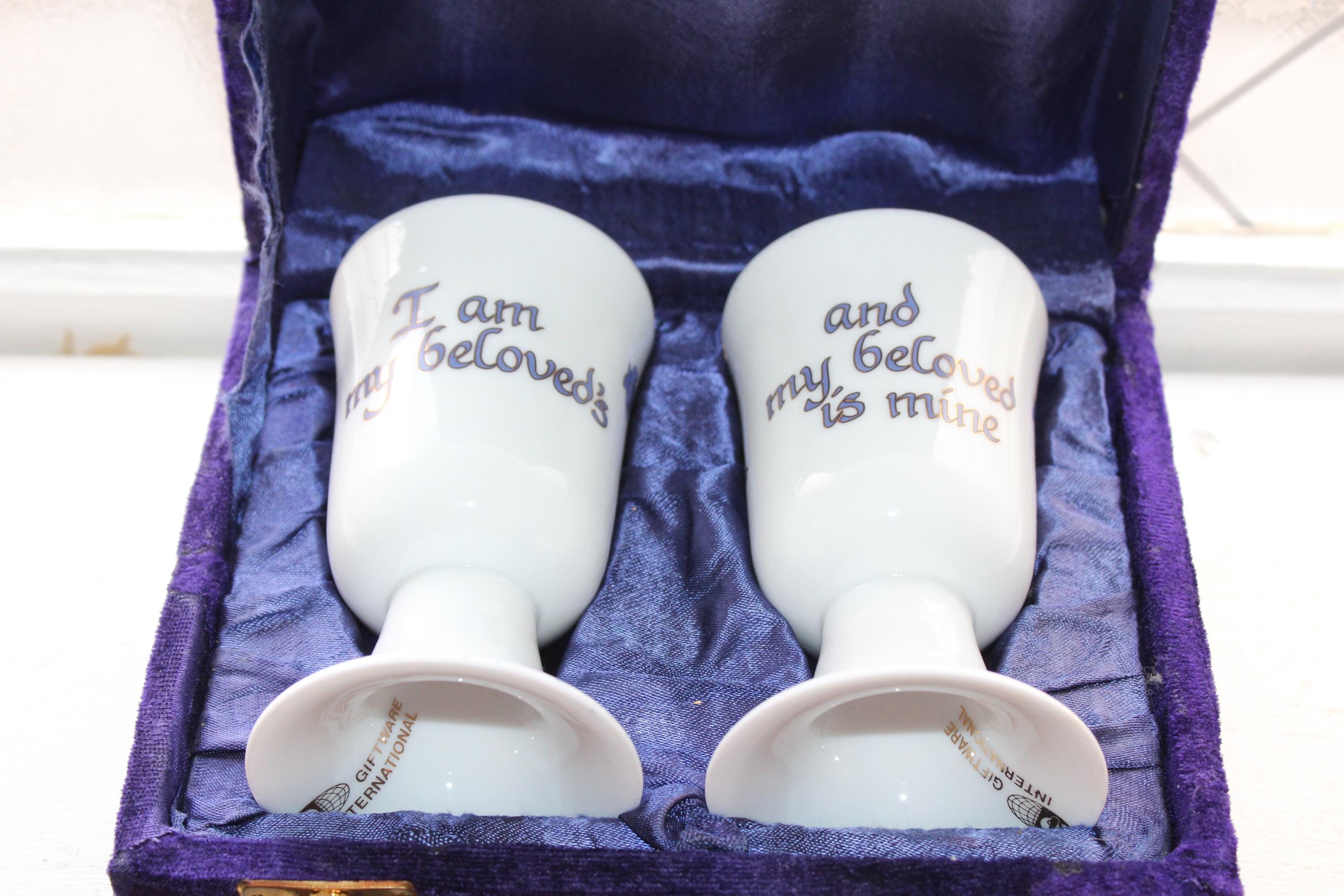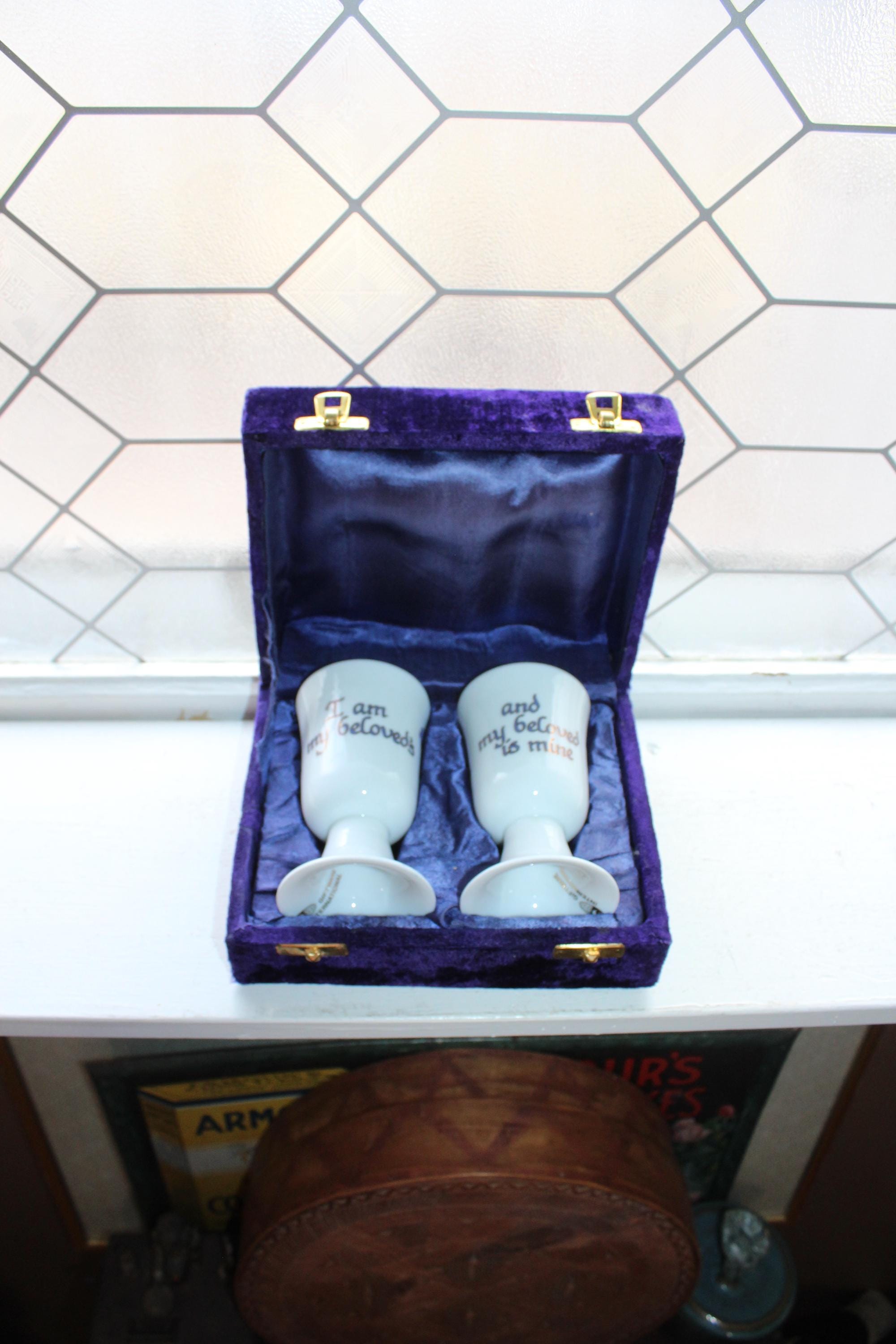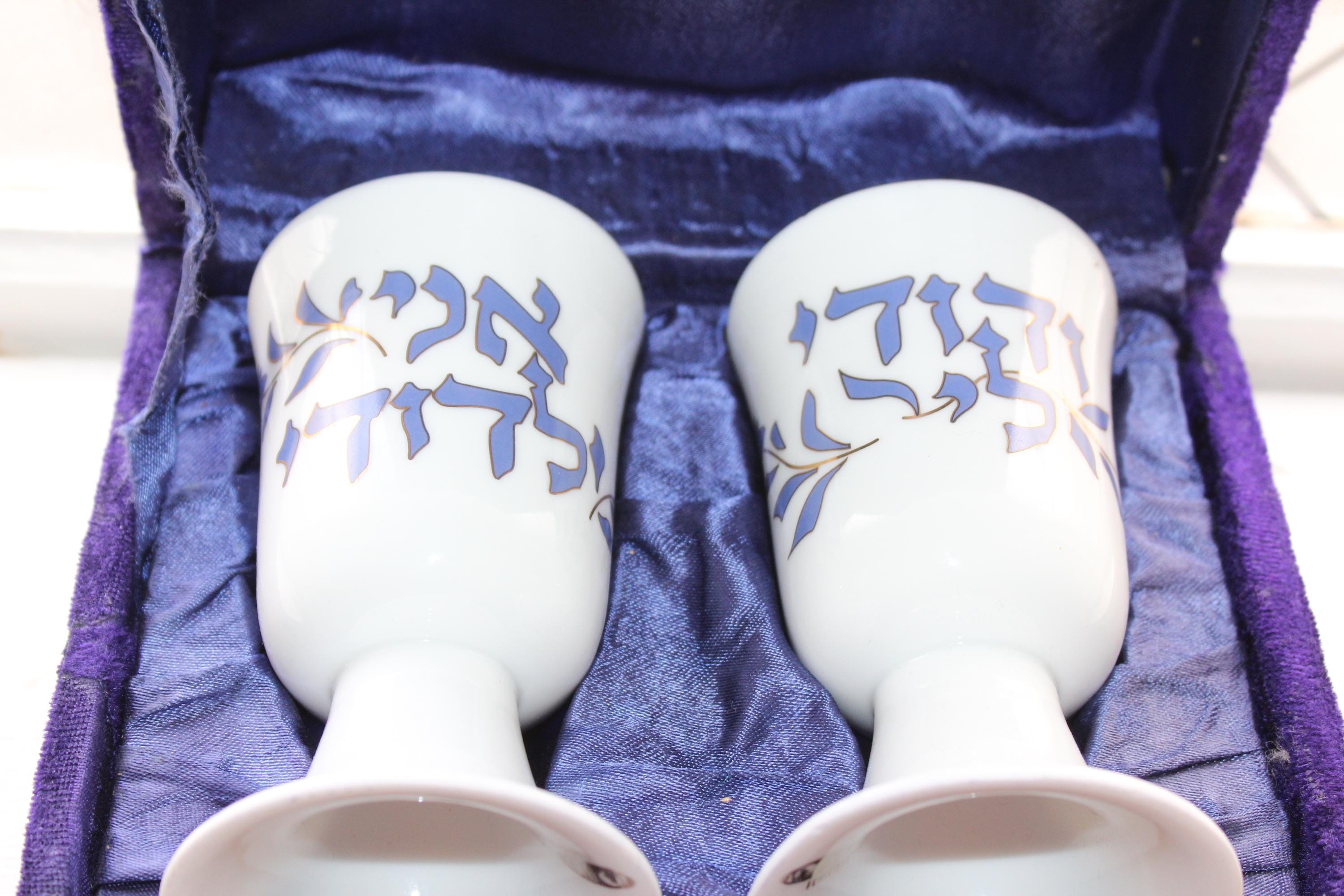 Vintage Jewish porcelain Kiddush cups pair in purple velvet presentation box, in excellent condition. They are decorated with Hebrew script, featuring the phrase "Ani L'dodi V'dodi Li," which translates to "I am my beloved's and my beloved is mine". The cups are presented in a velvet-lined purple case. Each cup measures 4 3/4" high. L'chaim!